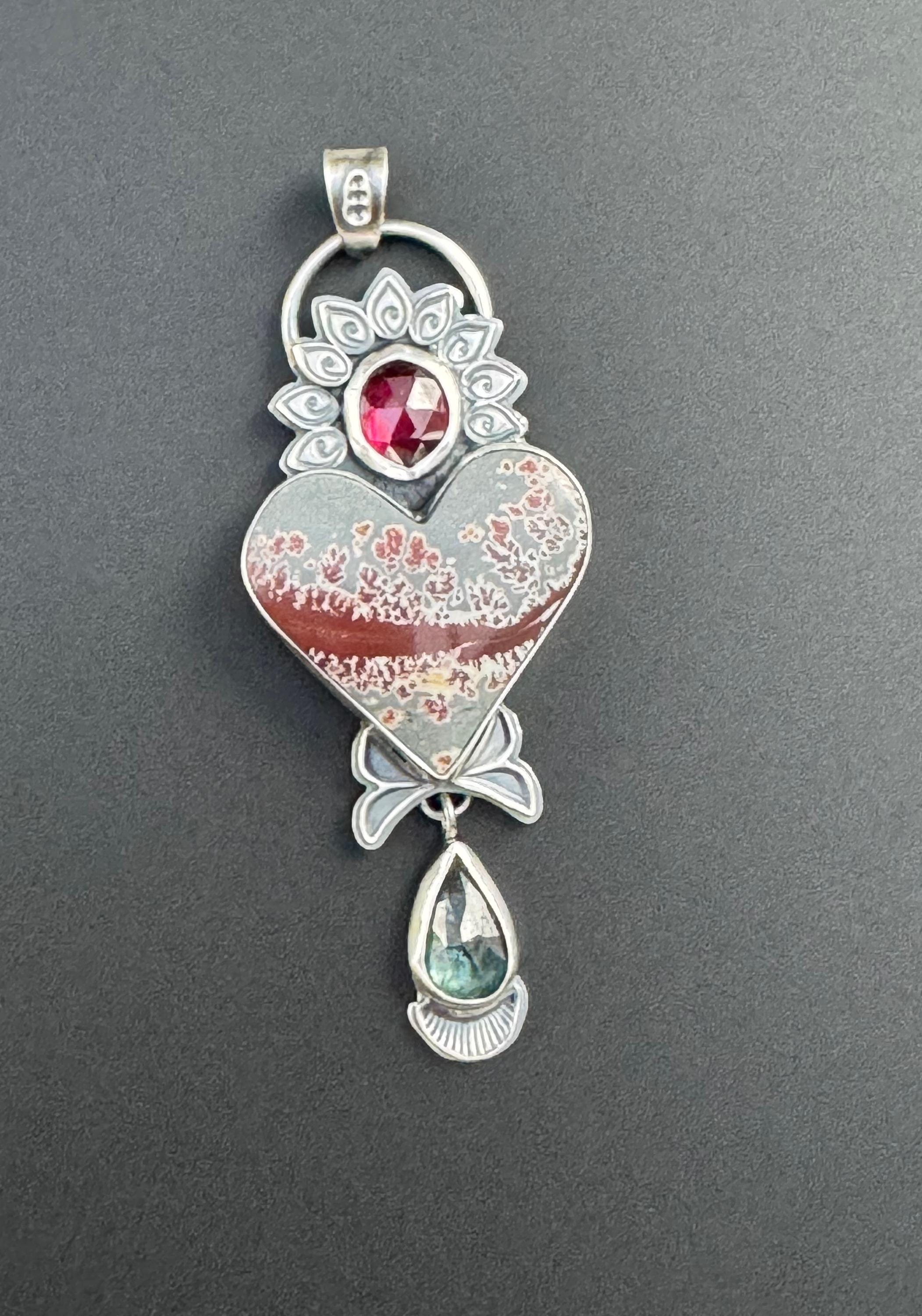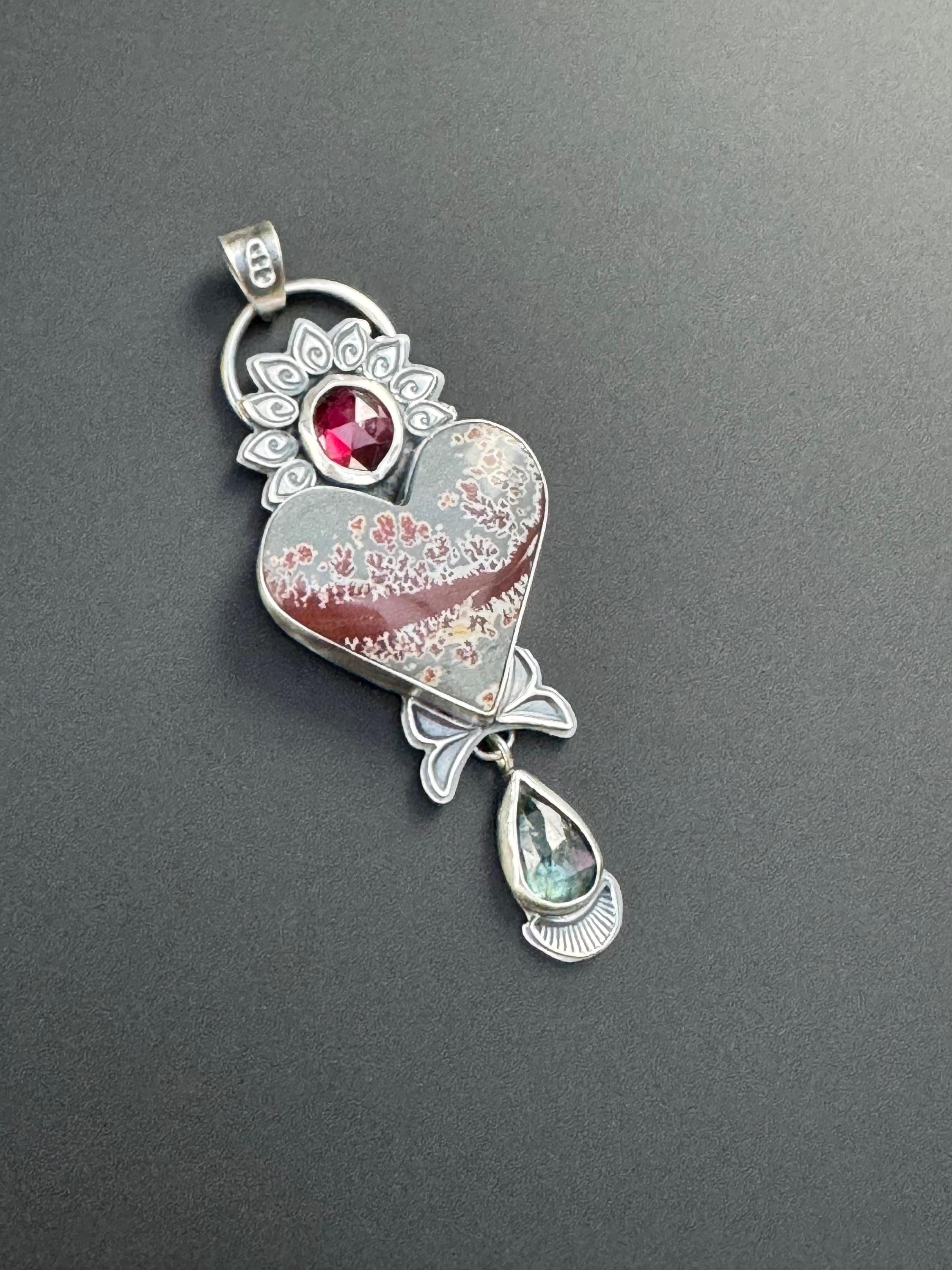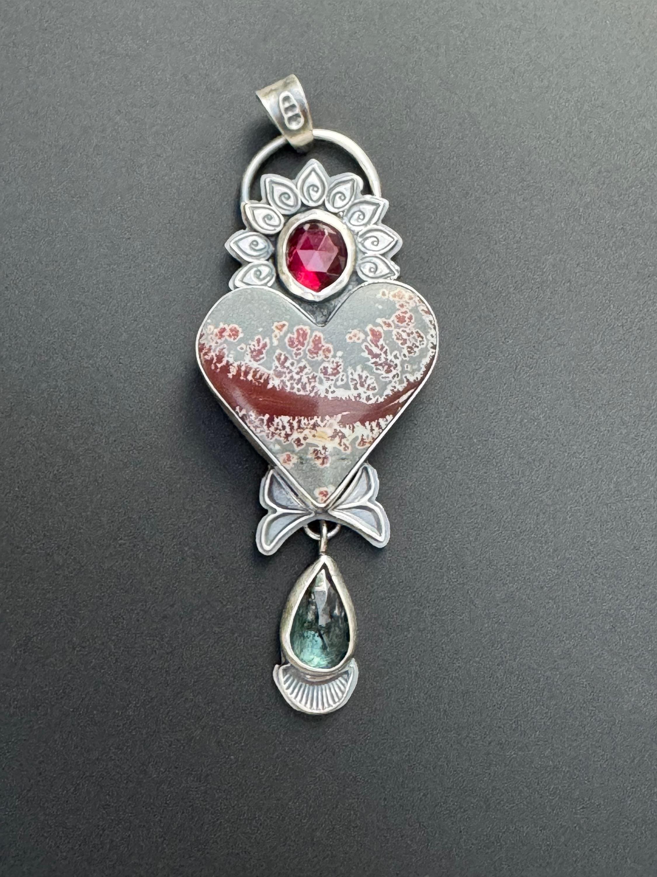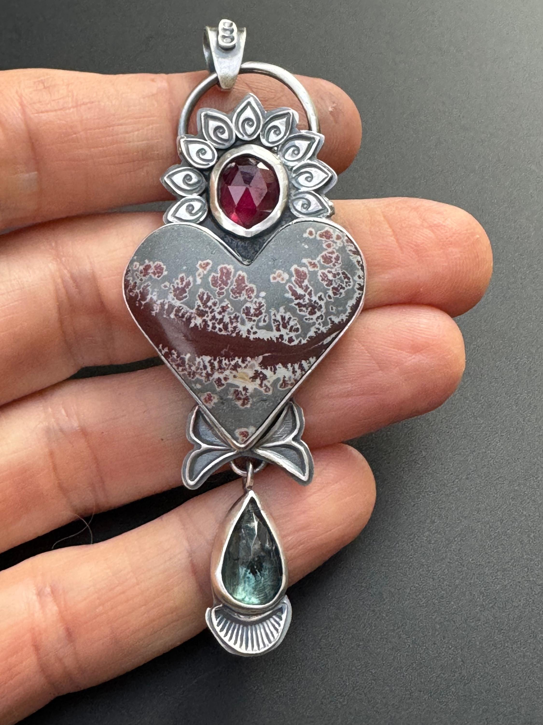 This gorgeous stone is Sonoran dendritic rhyolite, it's got beautiful patterns and colors and makes a lovely healing heart necklace. I paired it with a beautiful red/pink garnet and a teal moss kyanite. There are stamped accents creating a lovely pattern, each is handcrafted and soldered in place. It is made with sterling silver and completely handmade. This is a one of a kind piece.