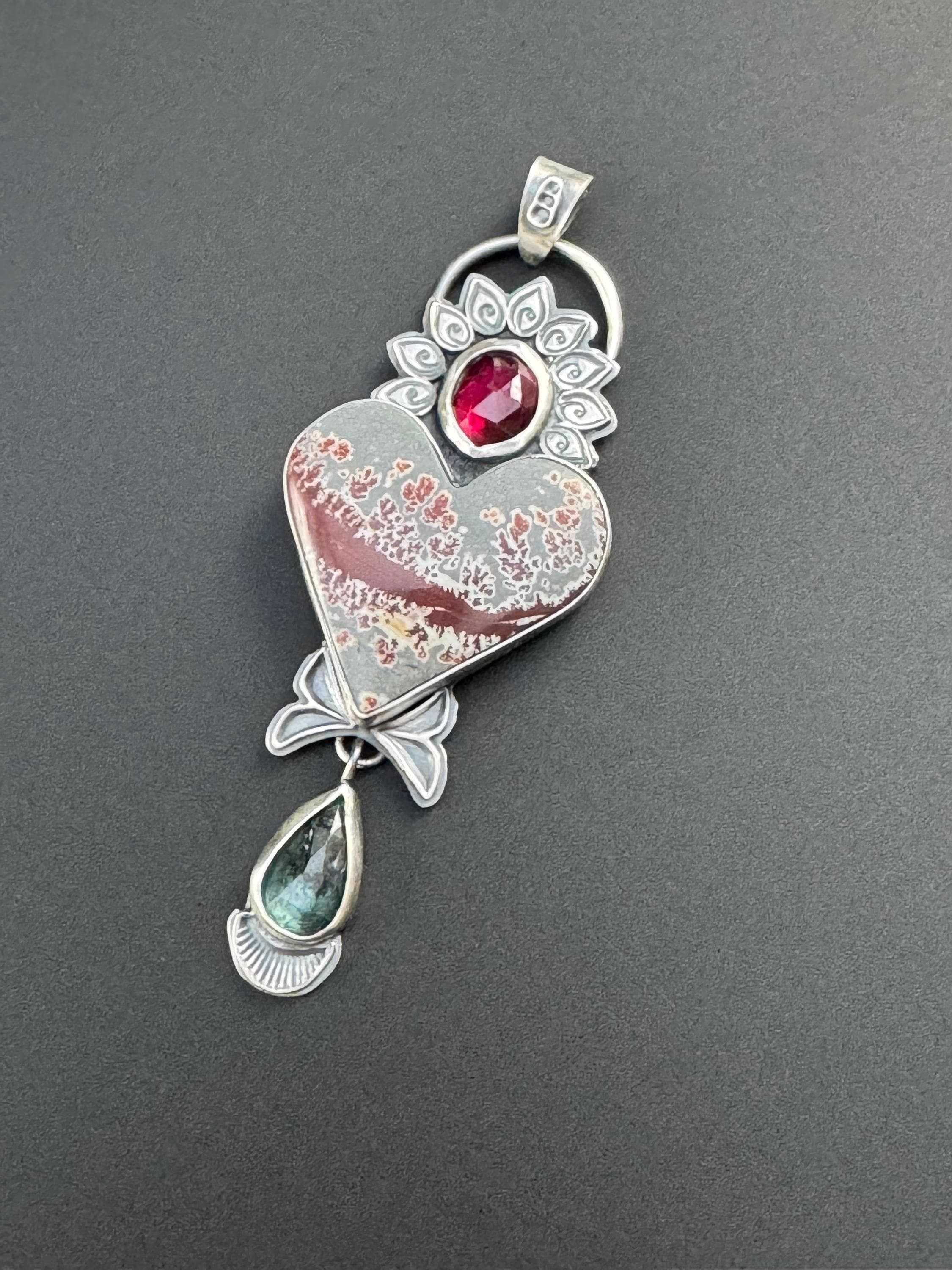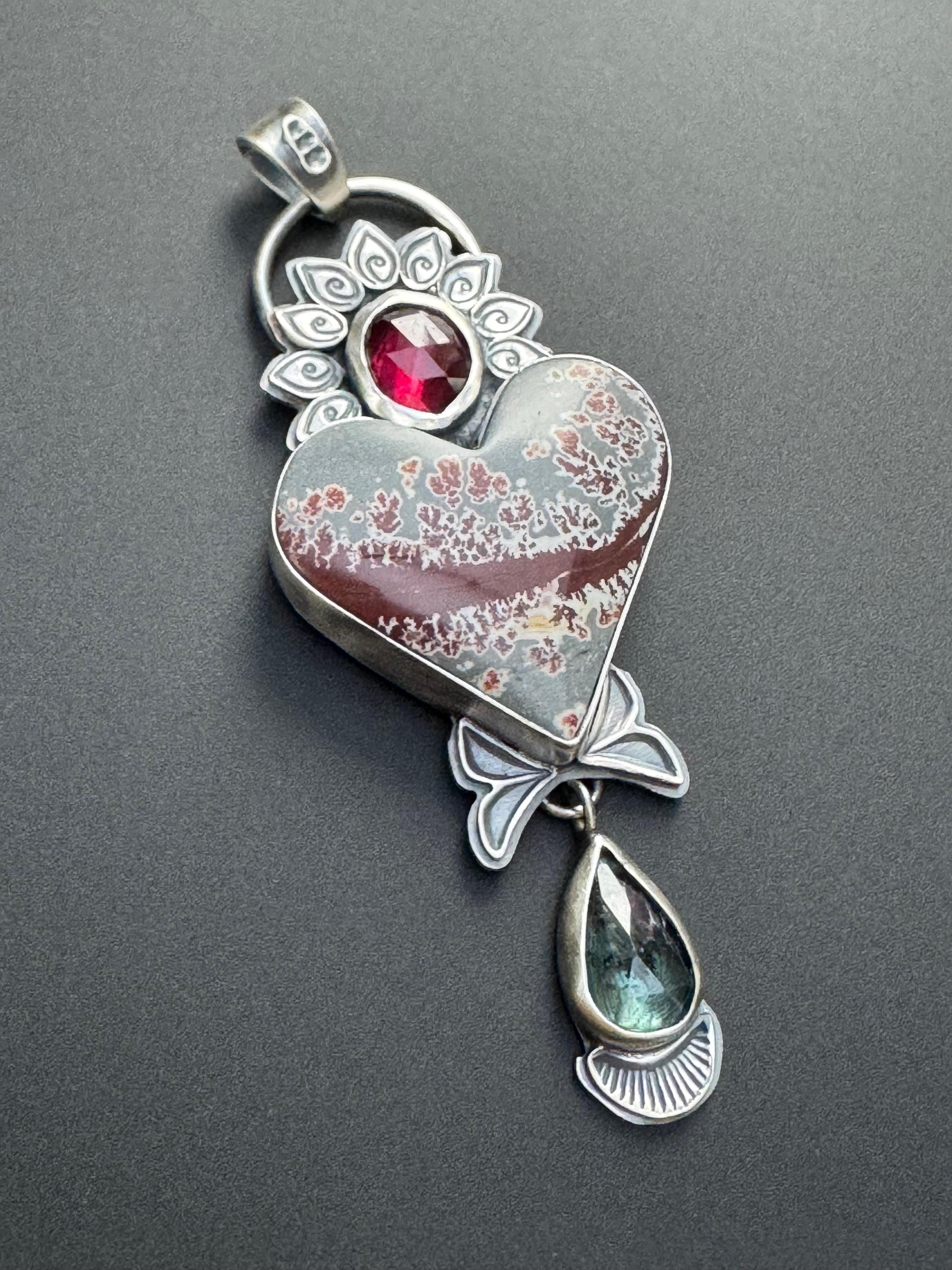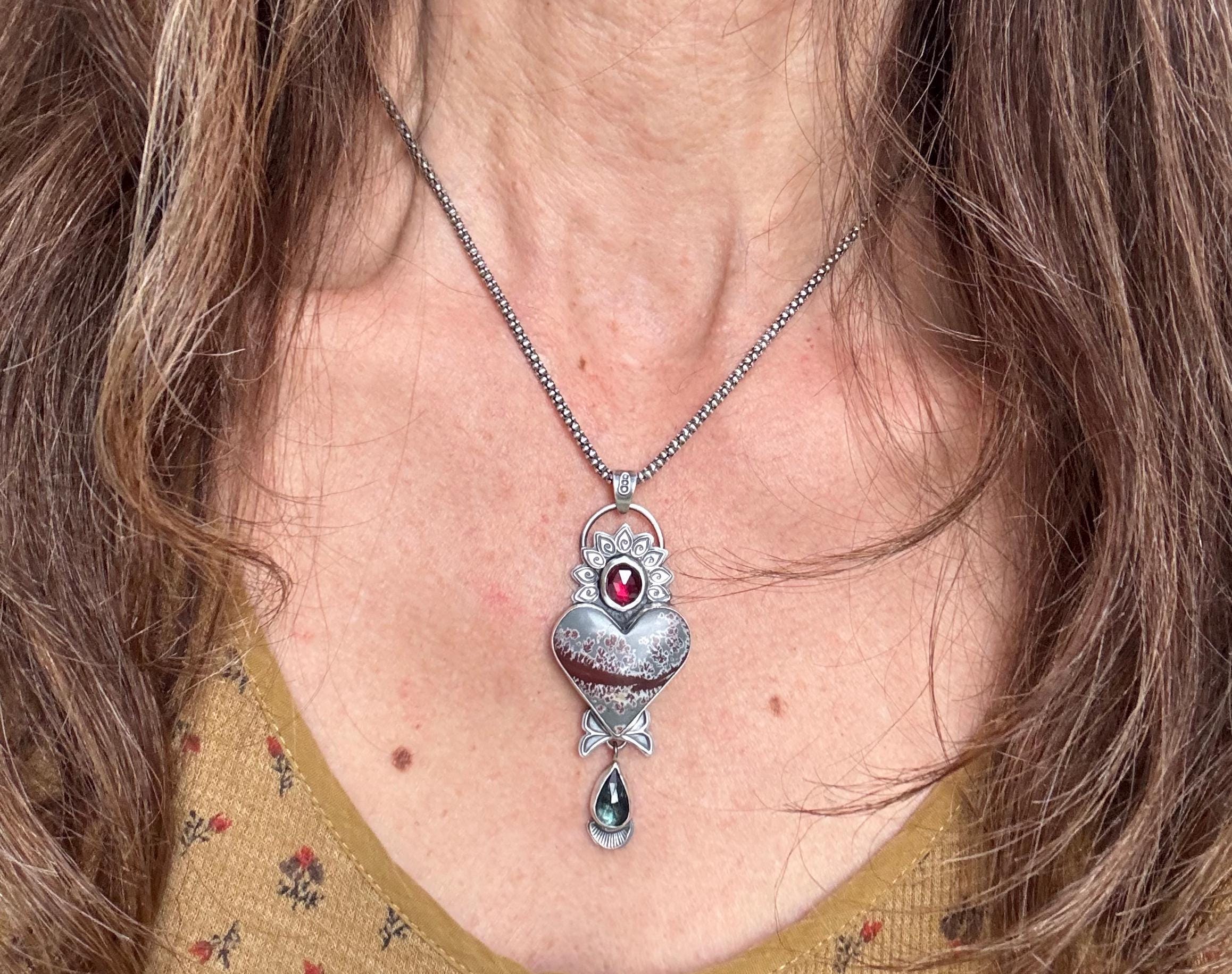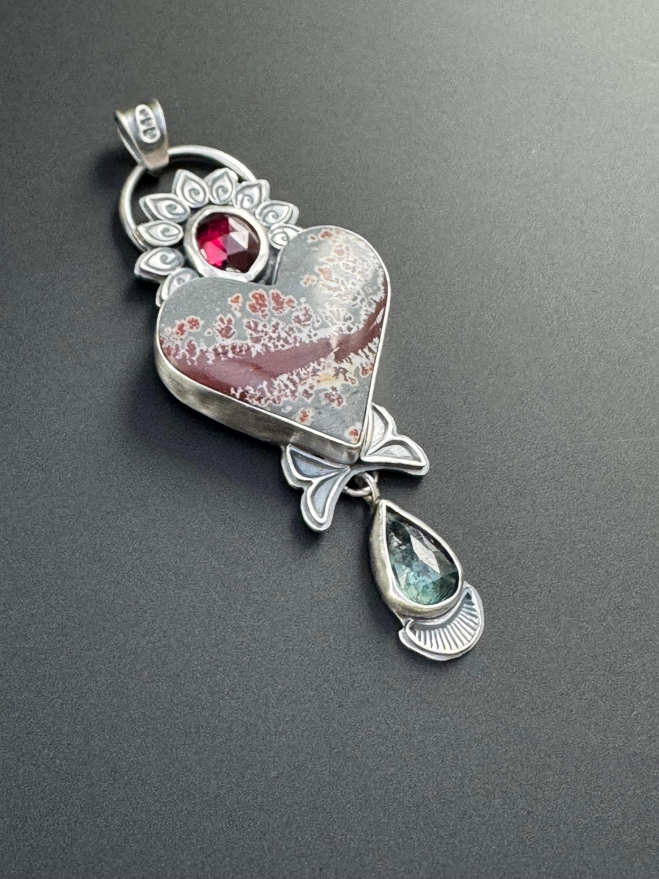 This gorgeous stone is Sonoran dendritic rhyolite, it's got beautiful patterns and colors and makes a lovely healing heart necklace. I paired it with a beautiful red/pink garnet and a teal moss kyanite. There are stamped accents creating a lovely pattern, each is handcrafted and soldered in place. It is made with sterling silver and completely handmade. This is a one of a kind piece.