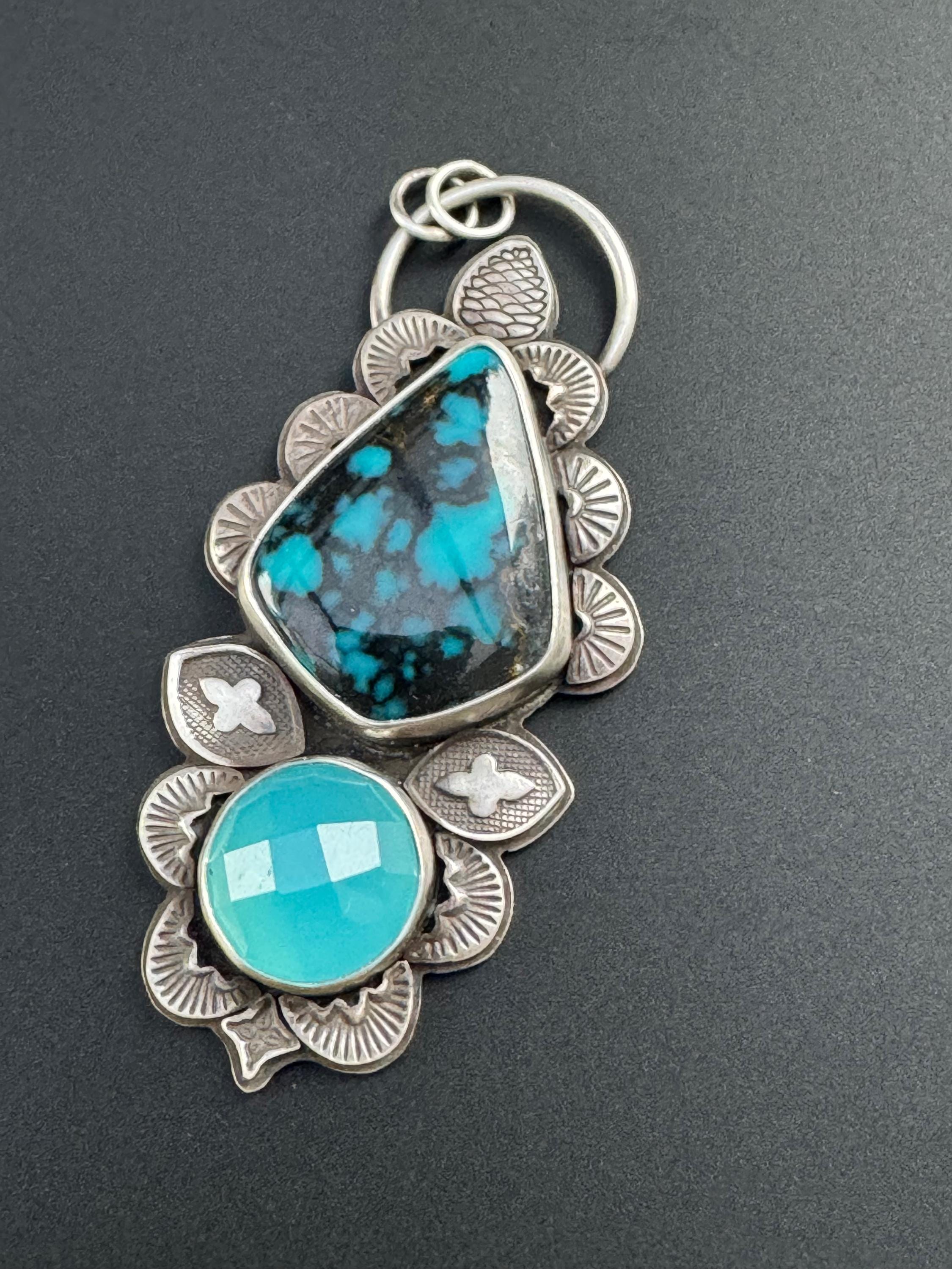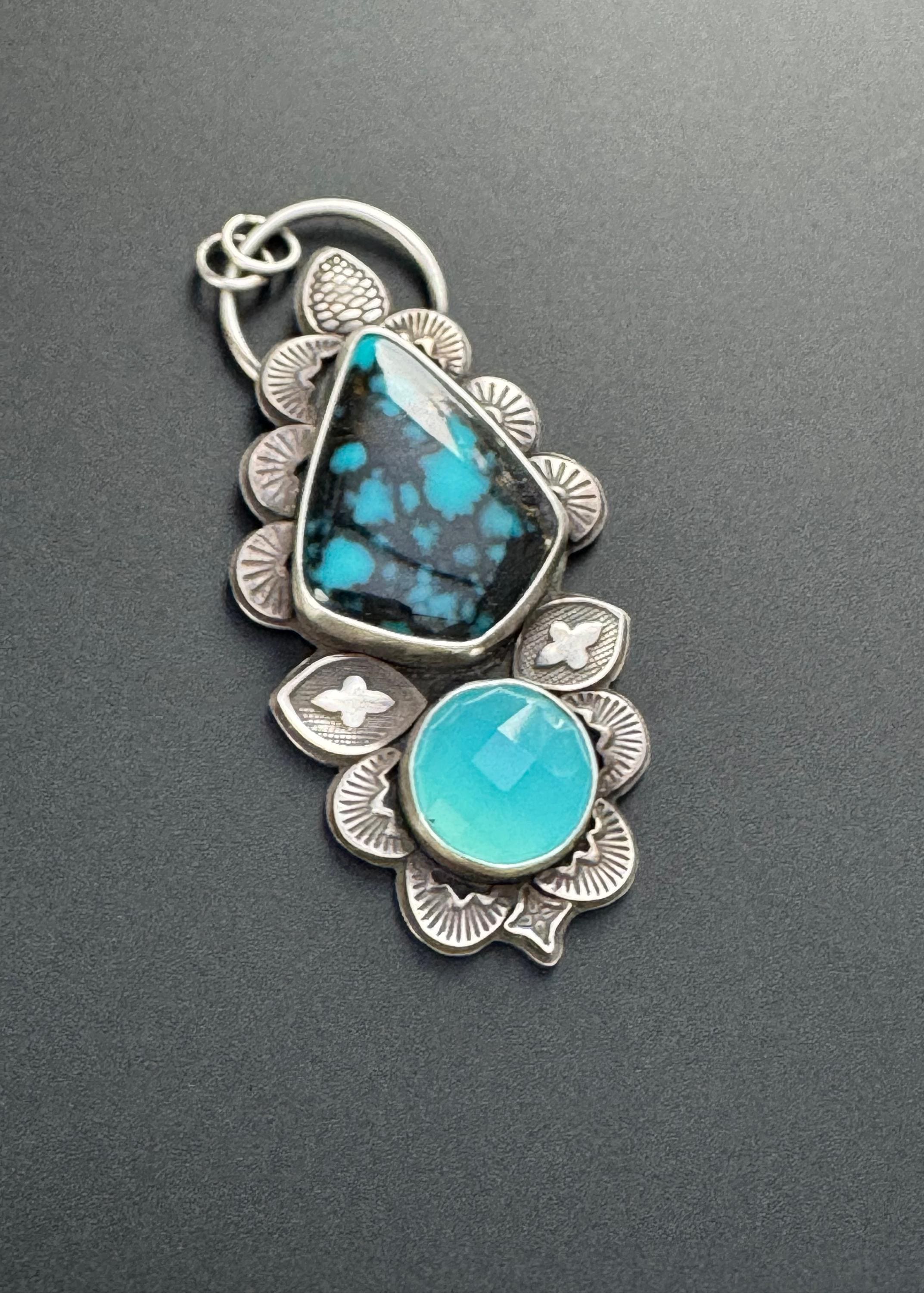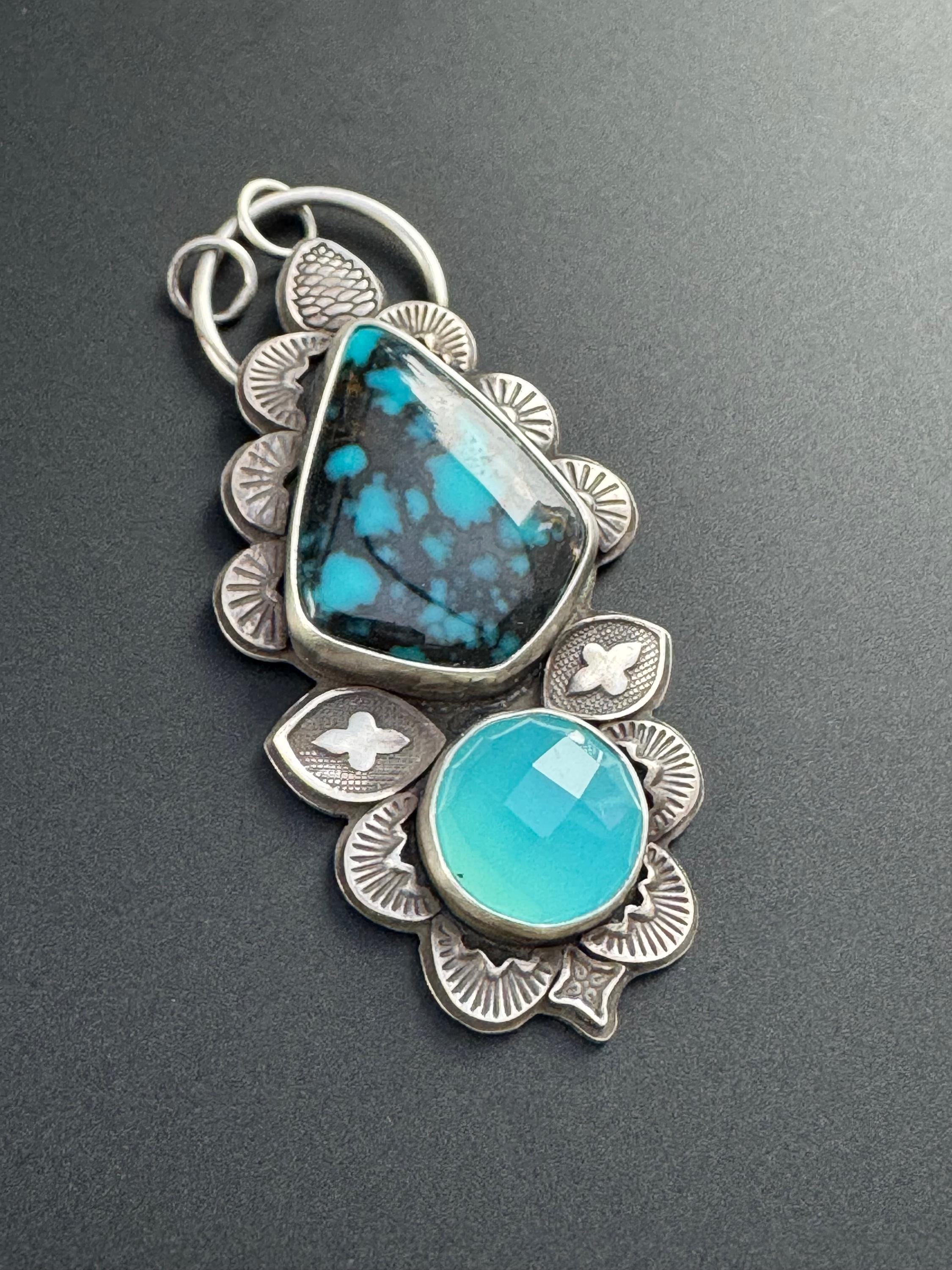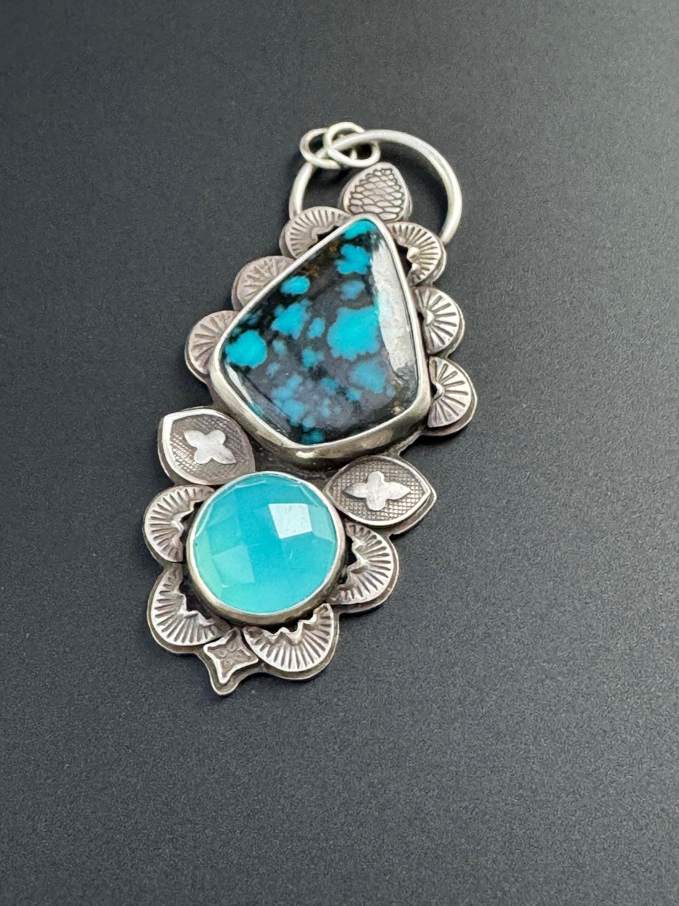 This is a lovely pairing of turquoise with a vibrant blue chalcedony. It's made with sterling silver and features many hand stamped accents to create a beautiful design around the stones. Each is stamped and cut then shaped and smoothed, and soldered into place to create the design. This gives texture, depth and brings meaning and design to the piece. It is completely handmade by me and is one of a kind.