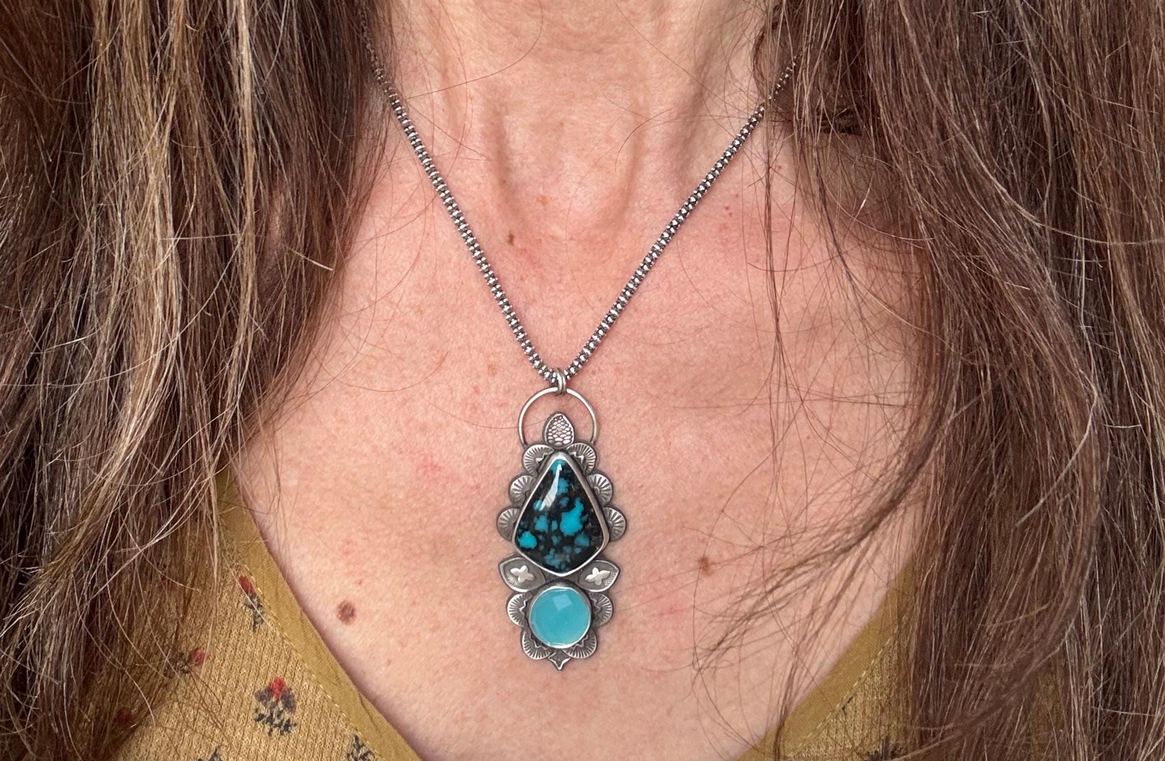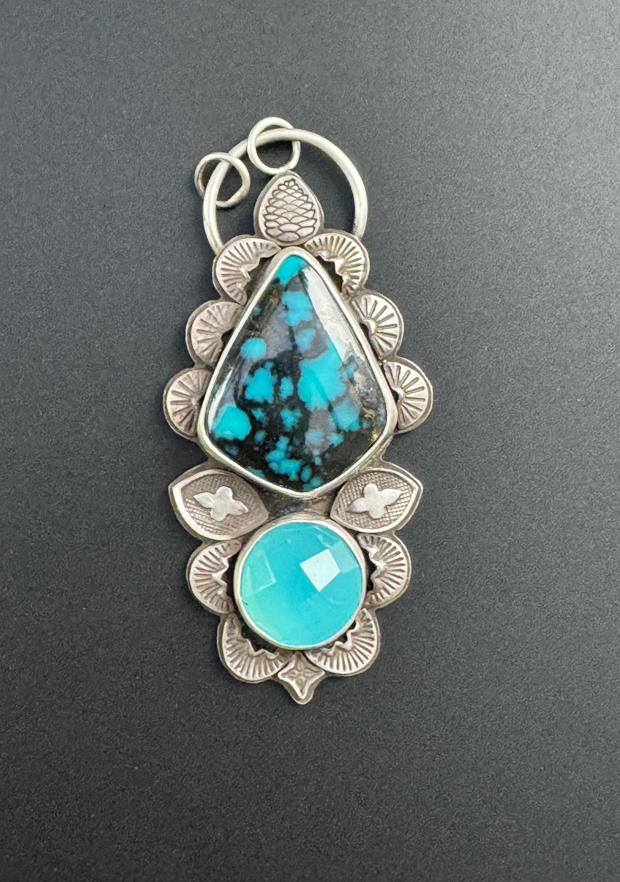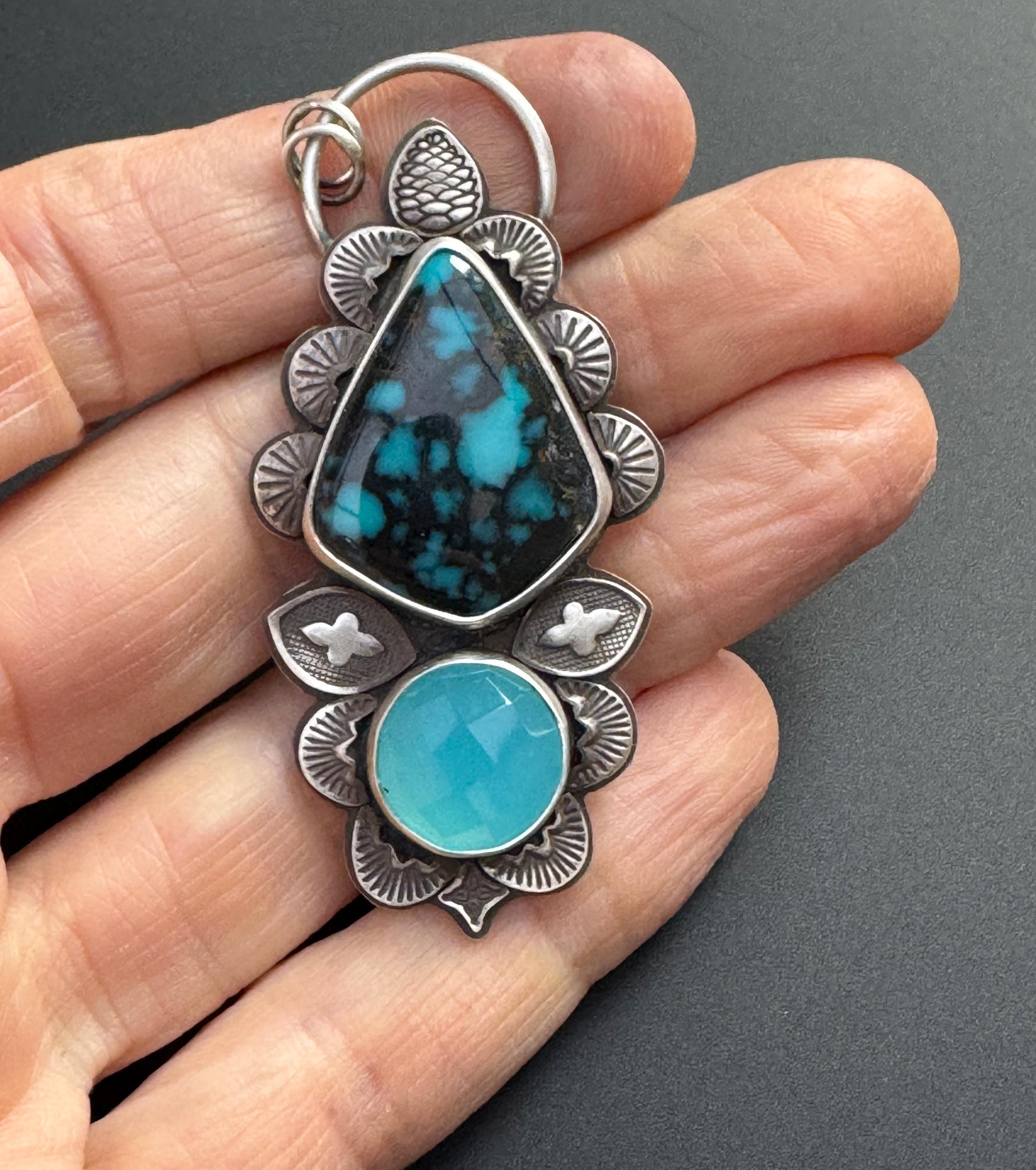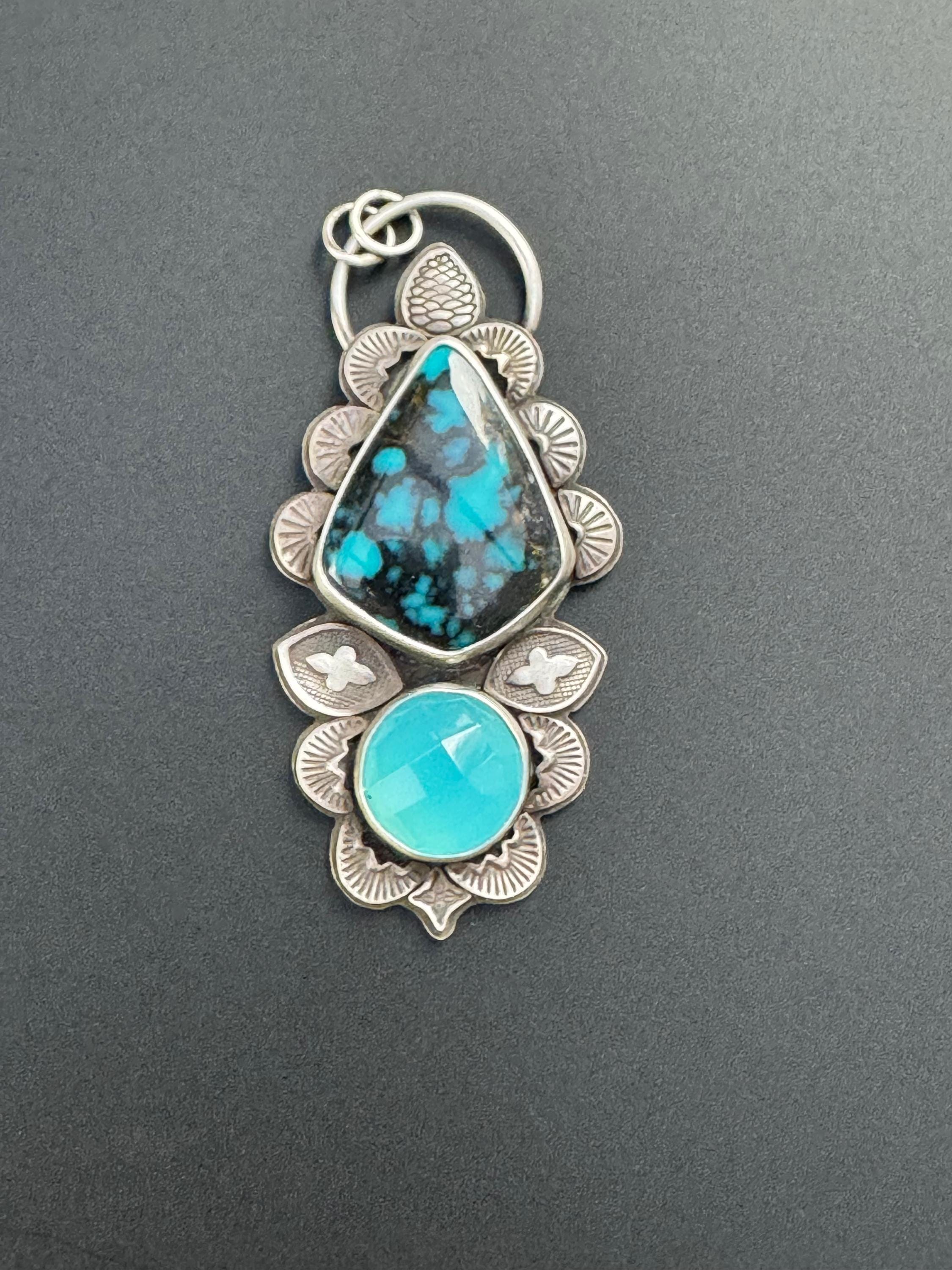 This is a lovely pairing of turquoise with a vibrant blue chalcedony. It's made with sterling silver and features many hand stamped accents to create a beautiful design around the stones. Each is stamped and cut then shaped and smoothed, and soldered into place to create the design. This gives texture, depth and brings meaning and design to the piece. It is completely handmade by me and is one of a kind.
