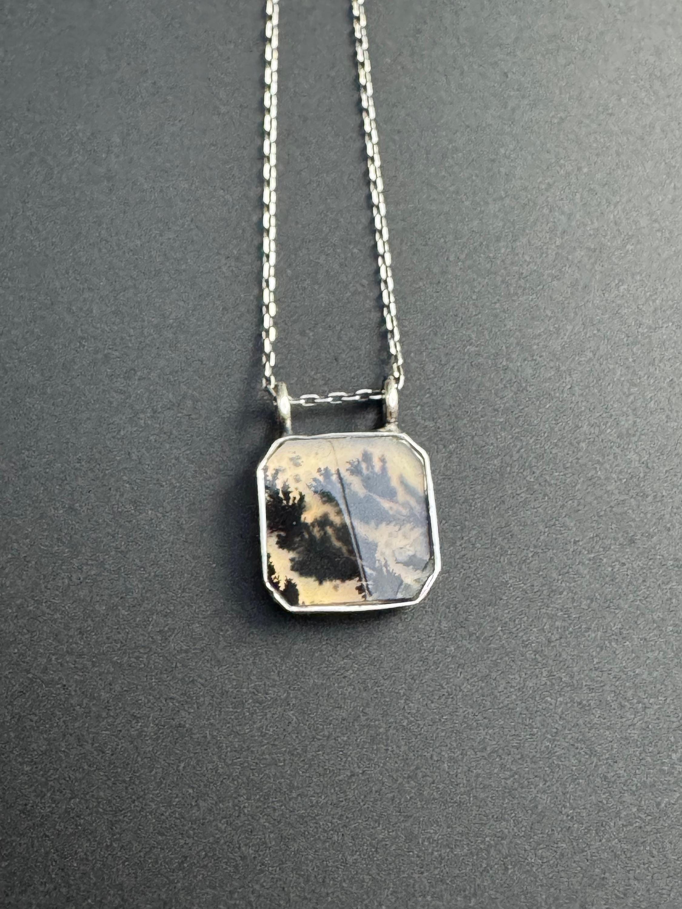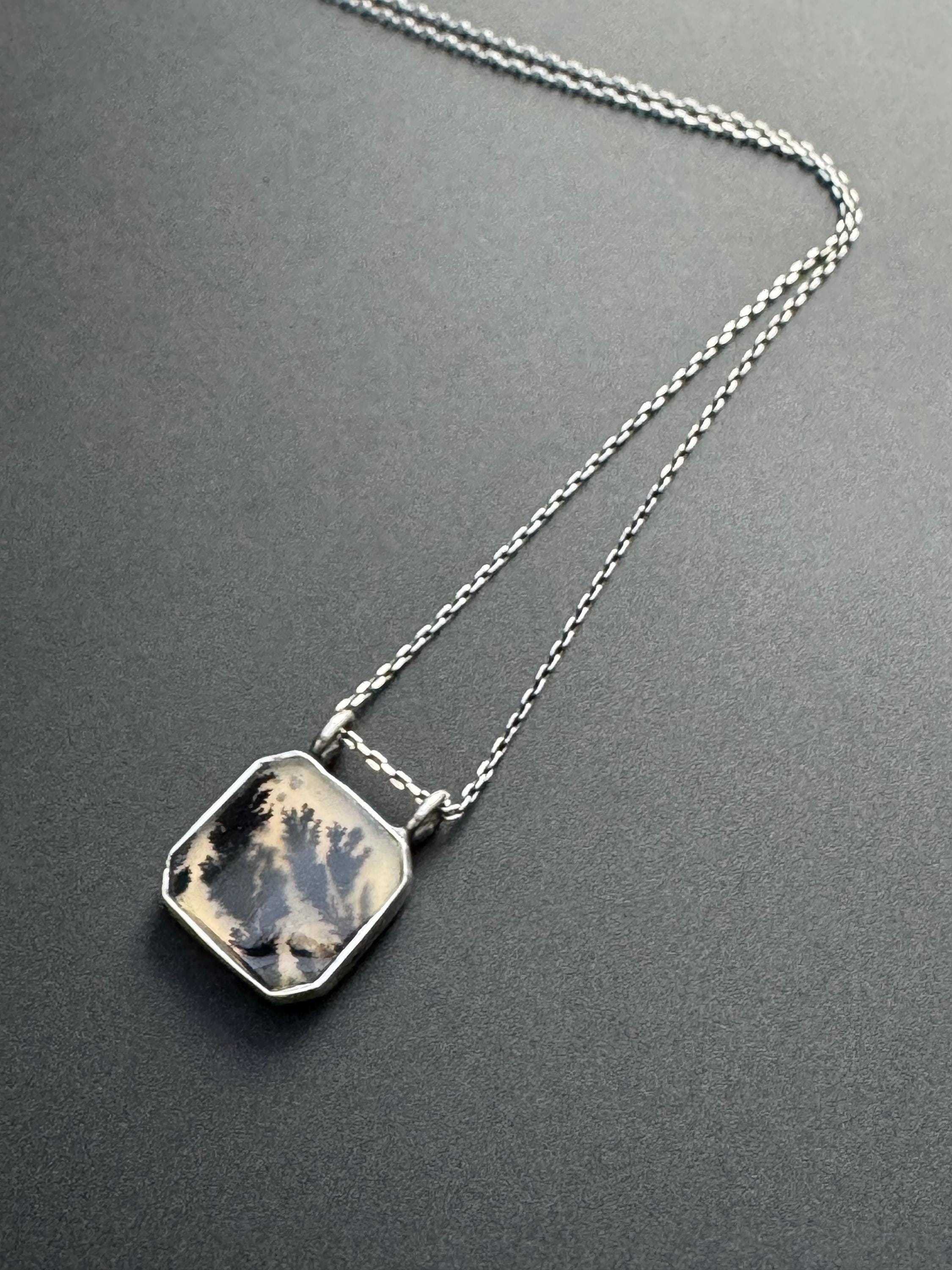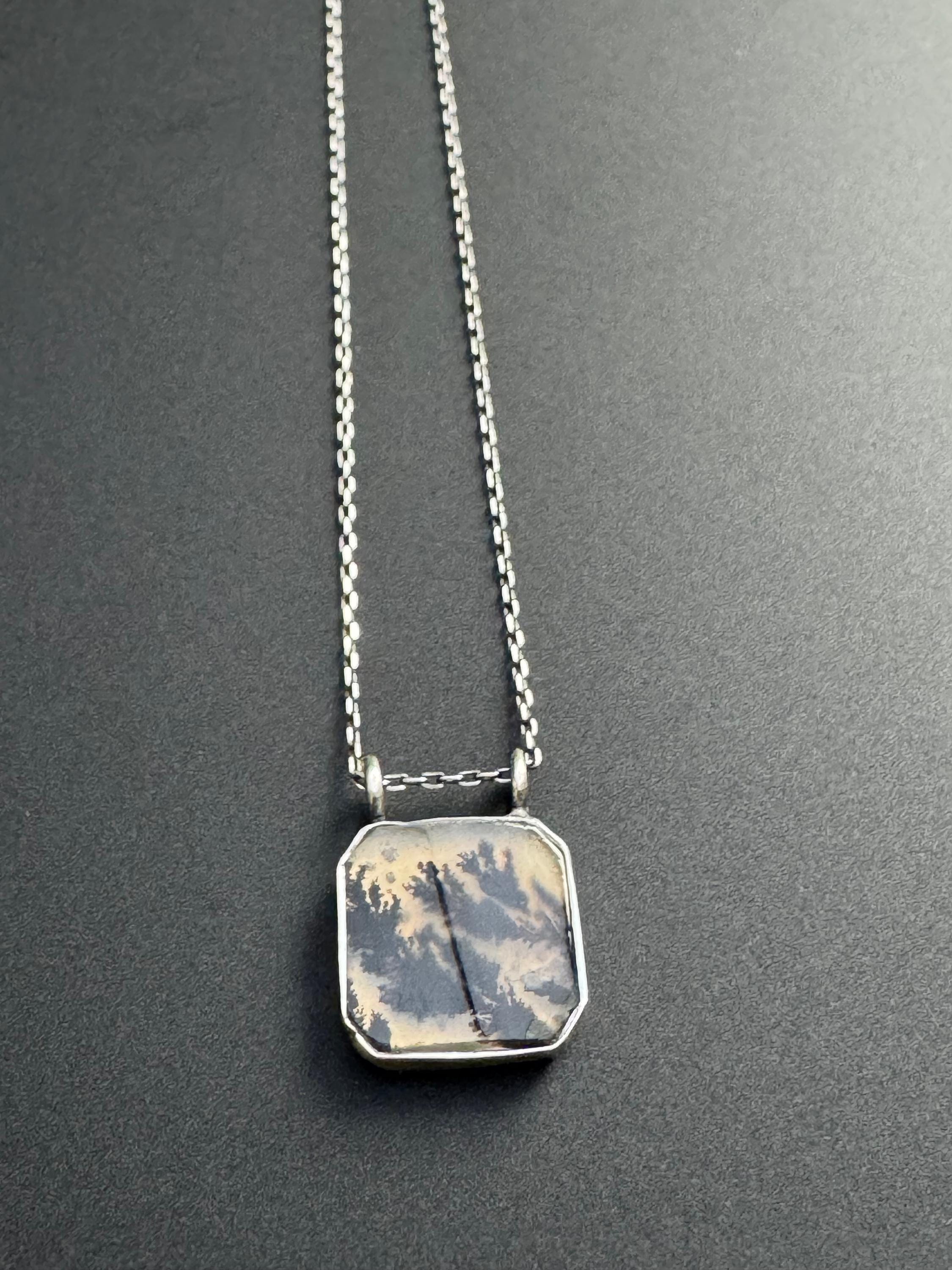 A sweet, simple, elegant necklace made from sterling silver and features a small lovely dendritic agate. It is the kind of necklace you can wear with anything. It's lightweight and unique. It's a one of a kind, handmade piece as always.