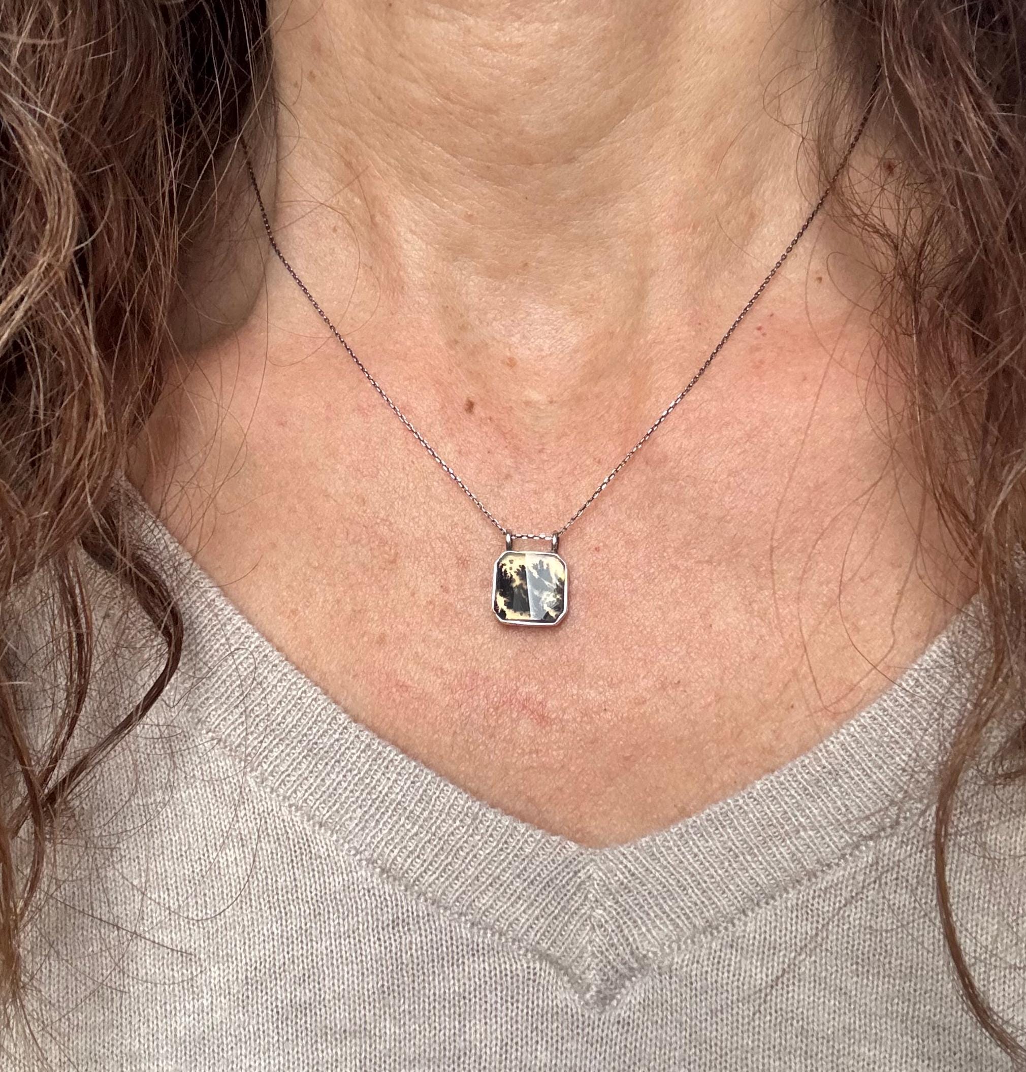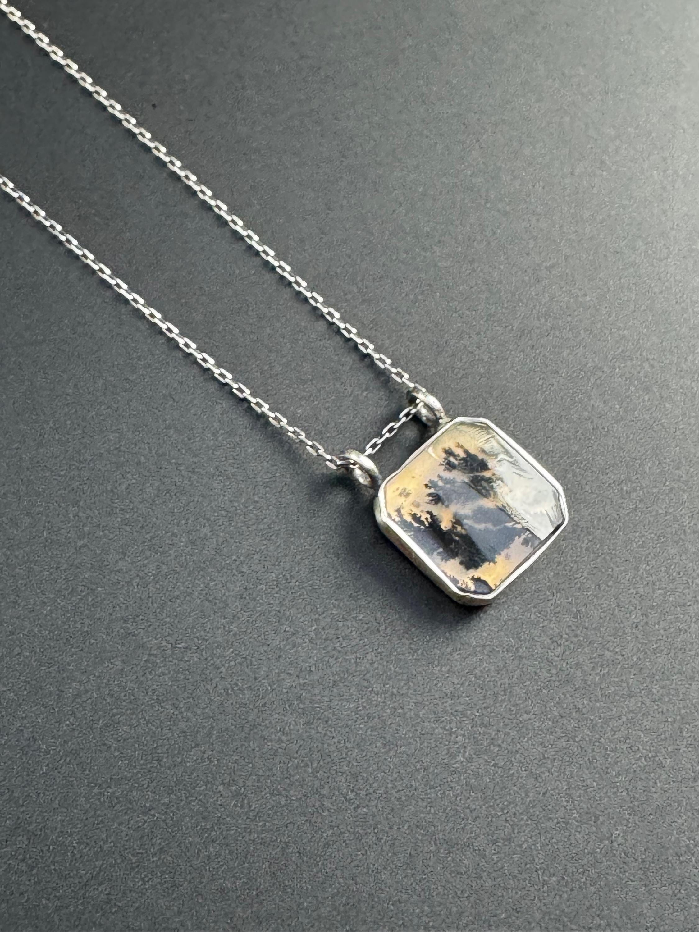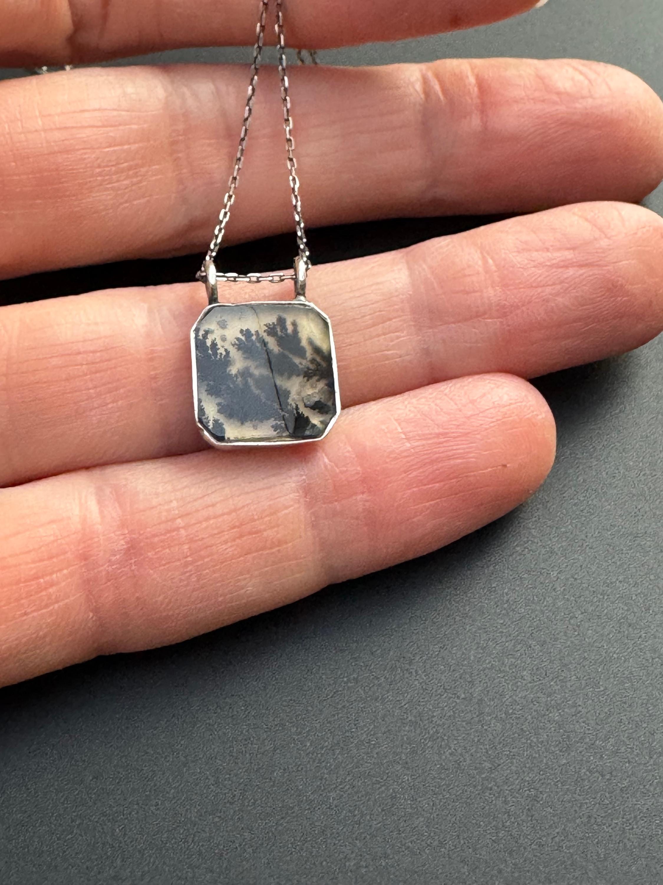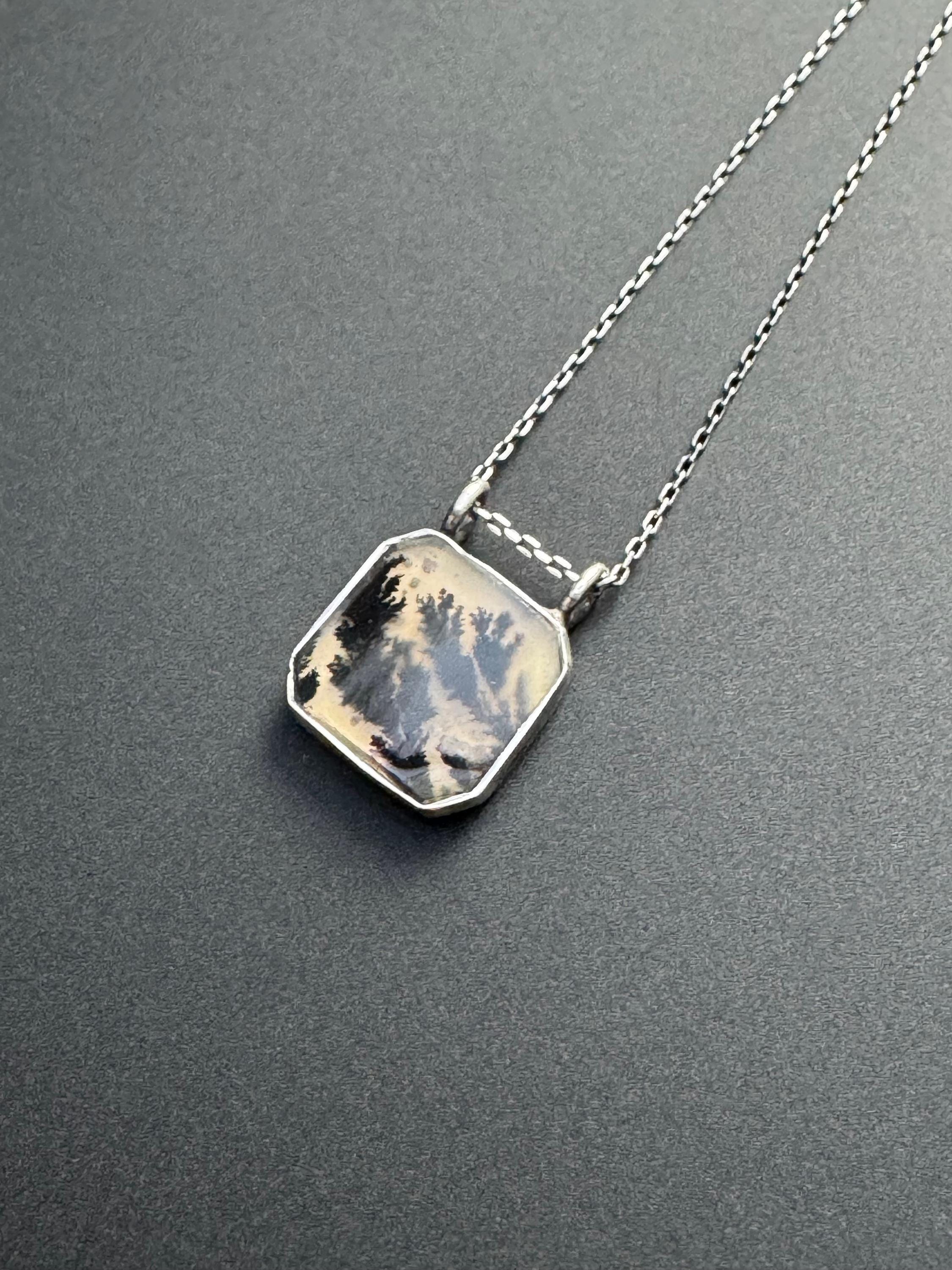 A sweet, simple, elegant necklace made from sterling silver and features a small lovely dendritic agate. It is the kind of necklace you can wear with anything. It's lightweight and unique. It's a one of a kind, handmade piece as always.