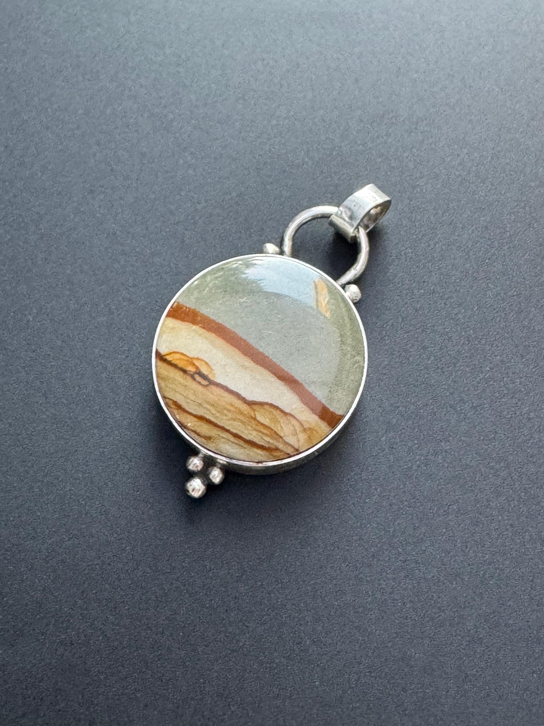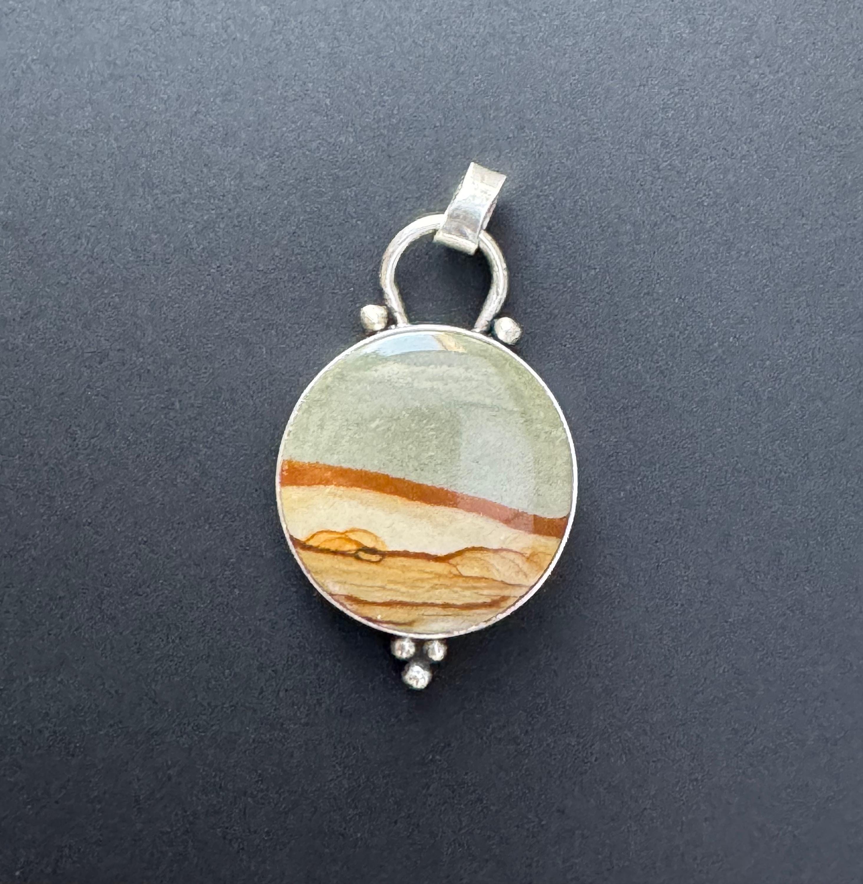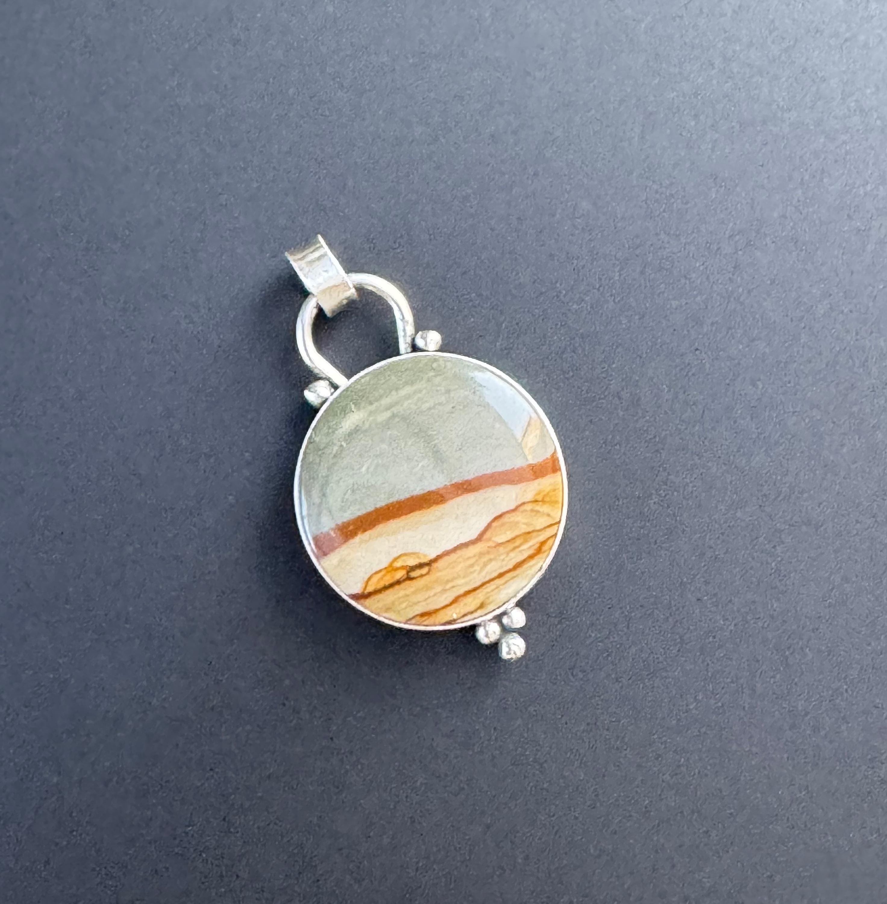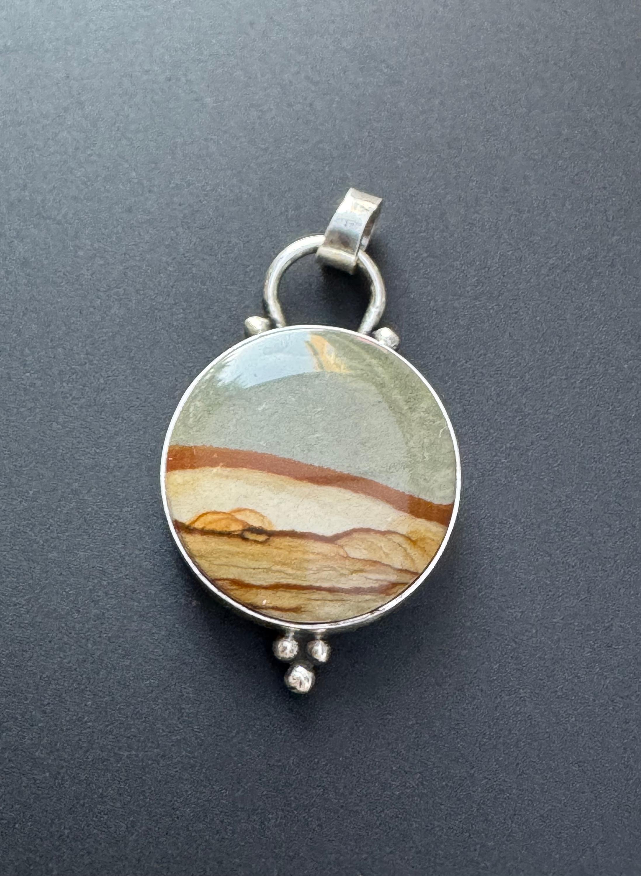 This pendant is made from sterling silver and a lovely cripple creek picture jasper stone with beautiful earth tones of green, reds and browns. This is a simple piece, meant to frame the small window into nature. This type of jasper always reminds me of landscapes that surround us every day. But we see it here in this stone that nature made, repeating it's beauty in miniature. So amazing. It's handmade, one of a kind.