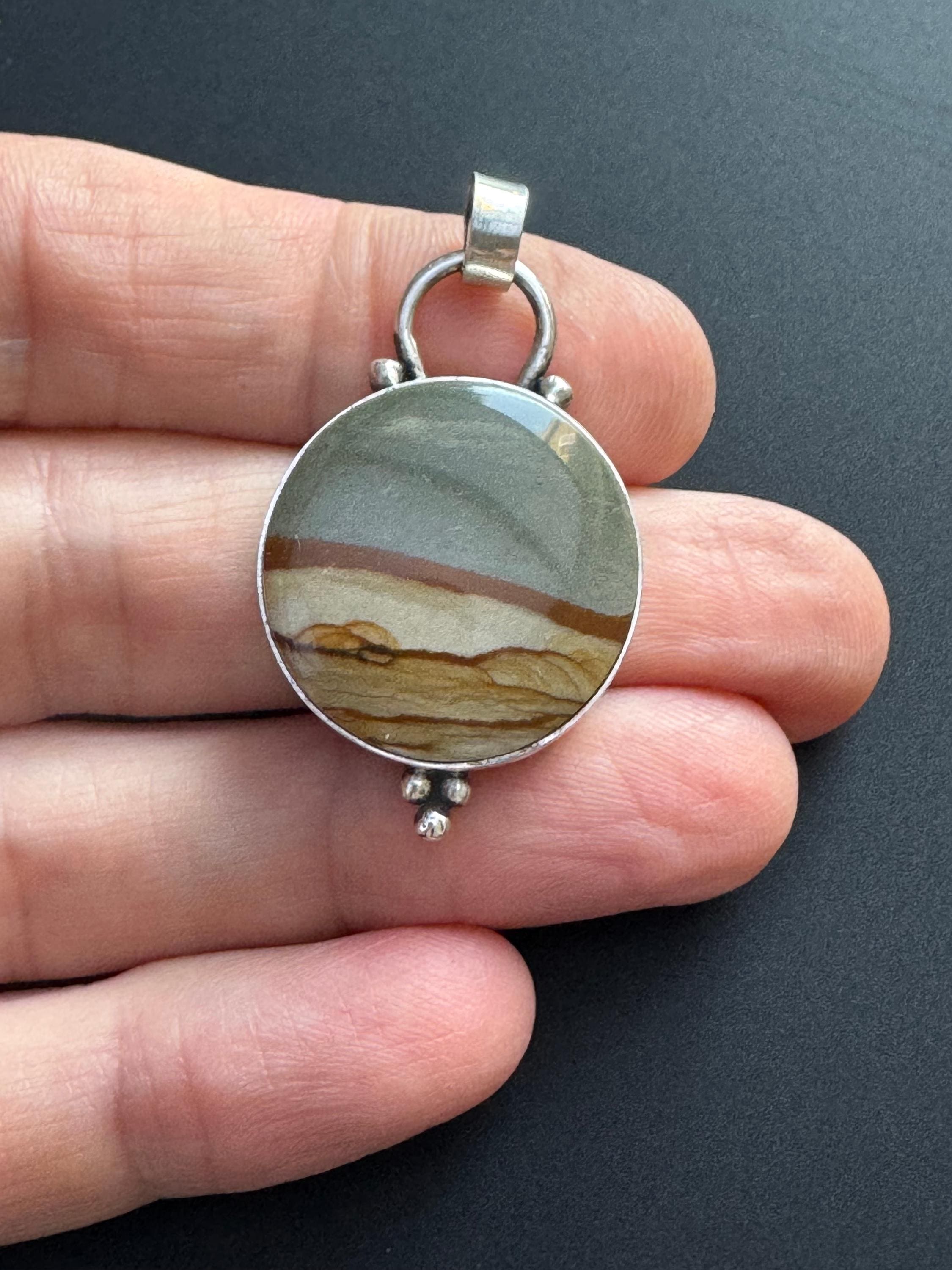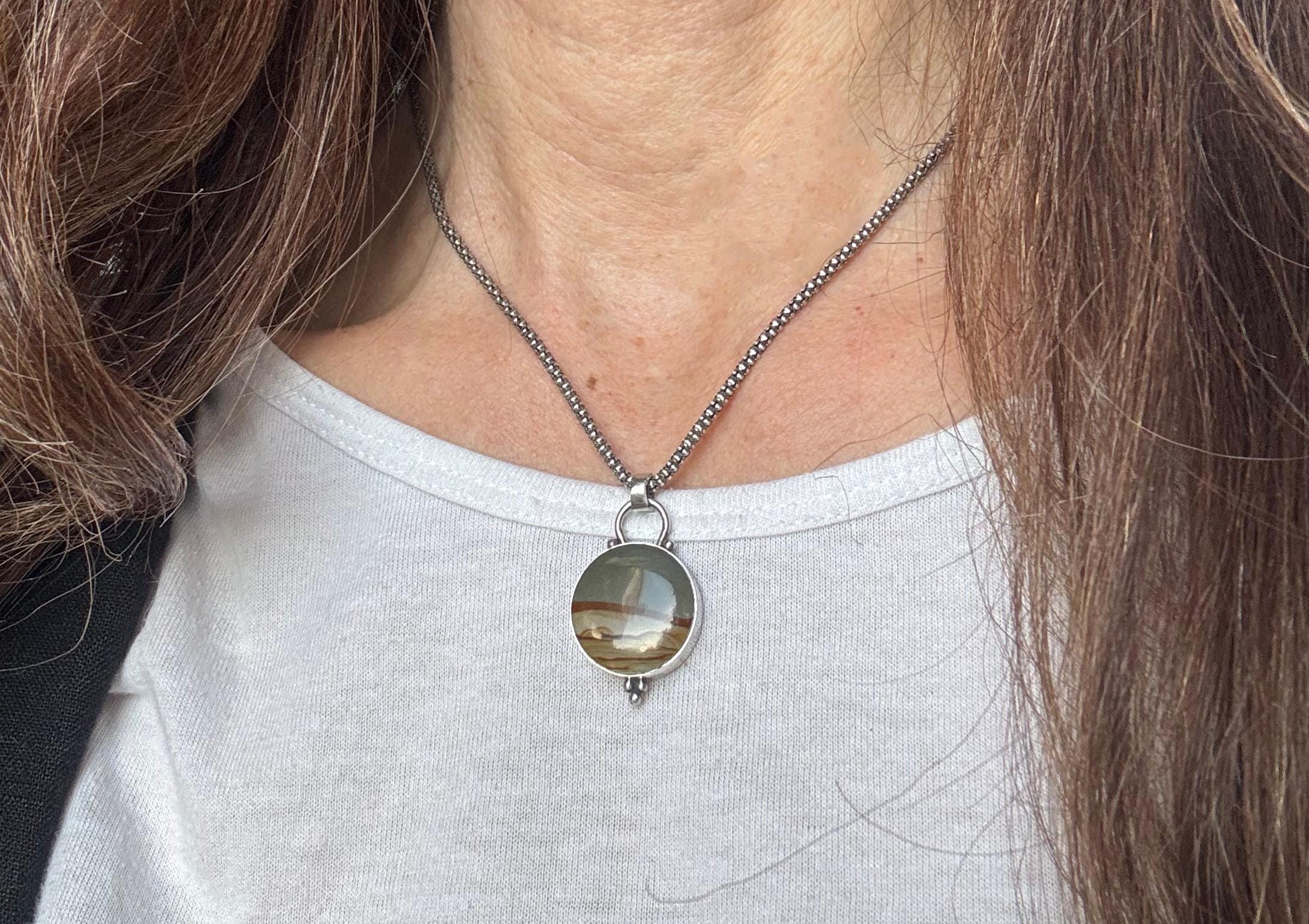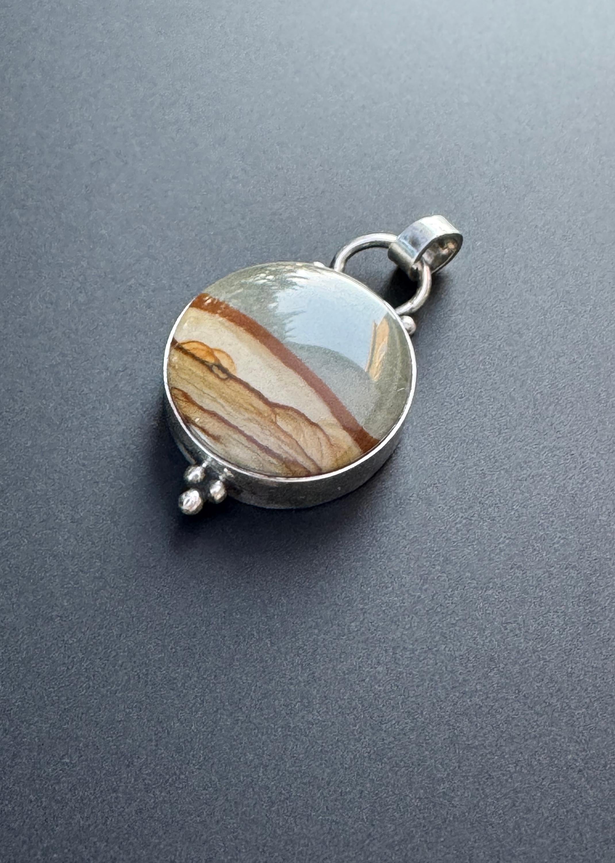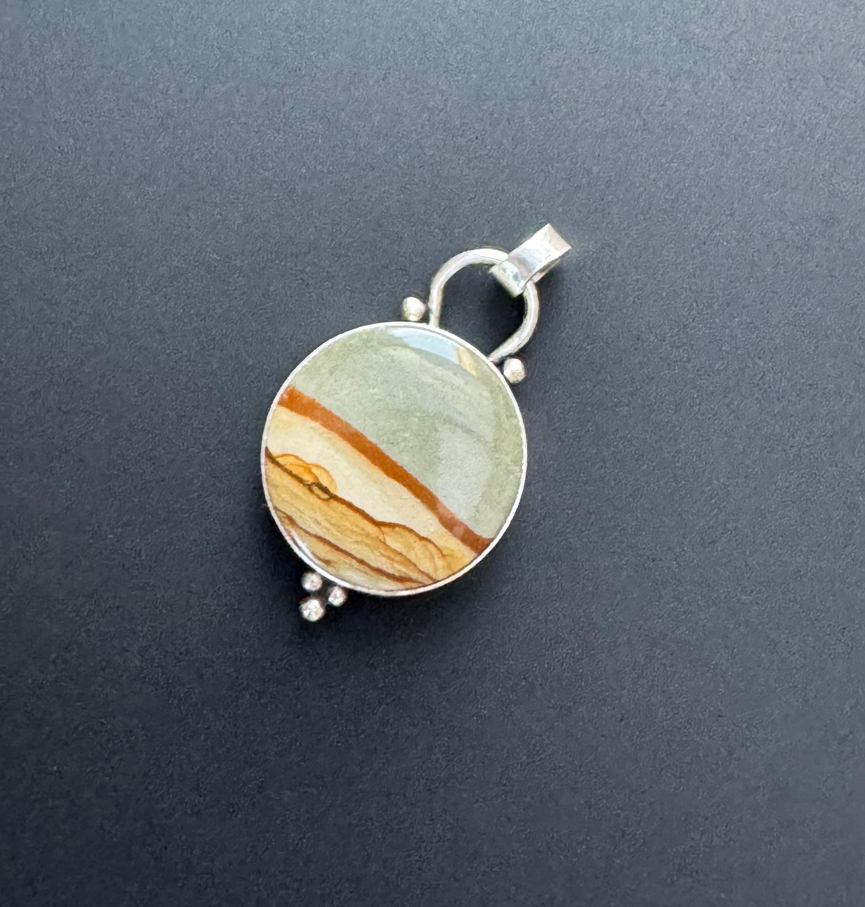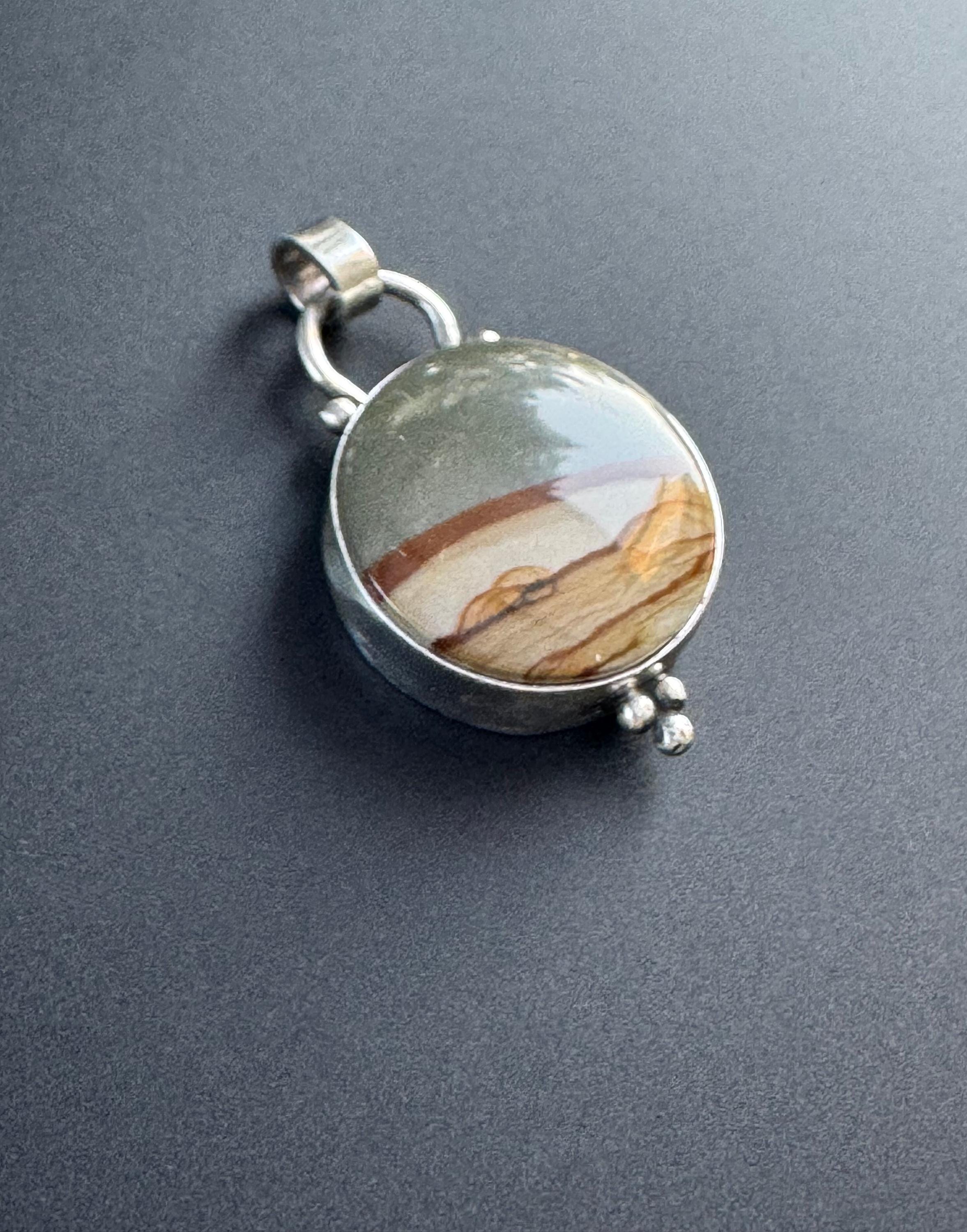 This pendant is made from sterling silver and a lovely cripple creek picture jasper stone with beautiful earth tones of green, reds and browns. This is a simple piece, meant to frame the small window into nature. This type of jasper always reminds me of landscapes that surround us every day. But we see it here in this stone that nature made, repeating it's beauty in miniature. So amazing. It's handmade, one of a kind.