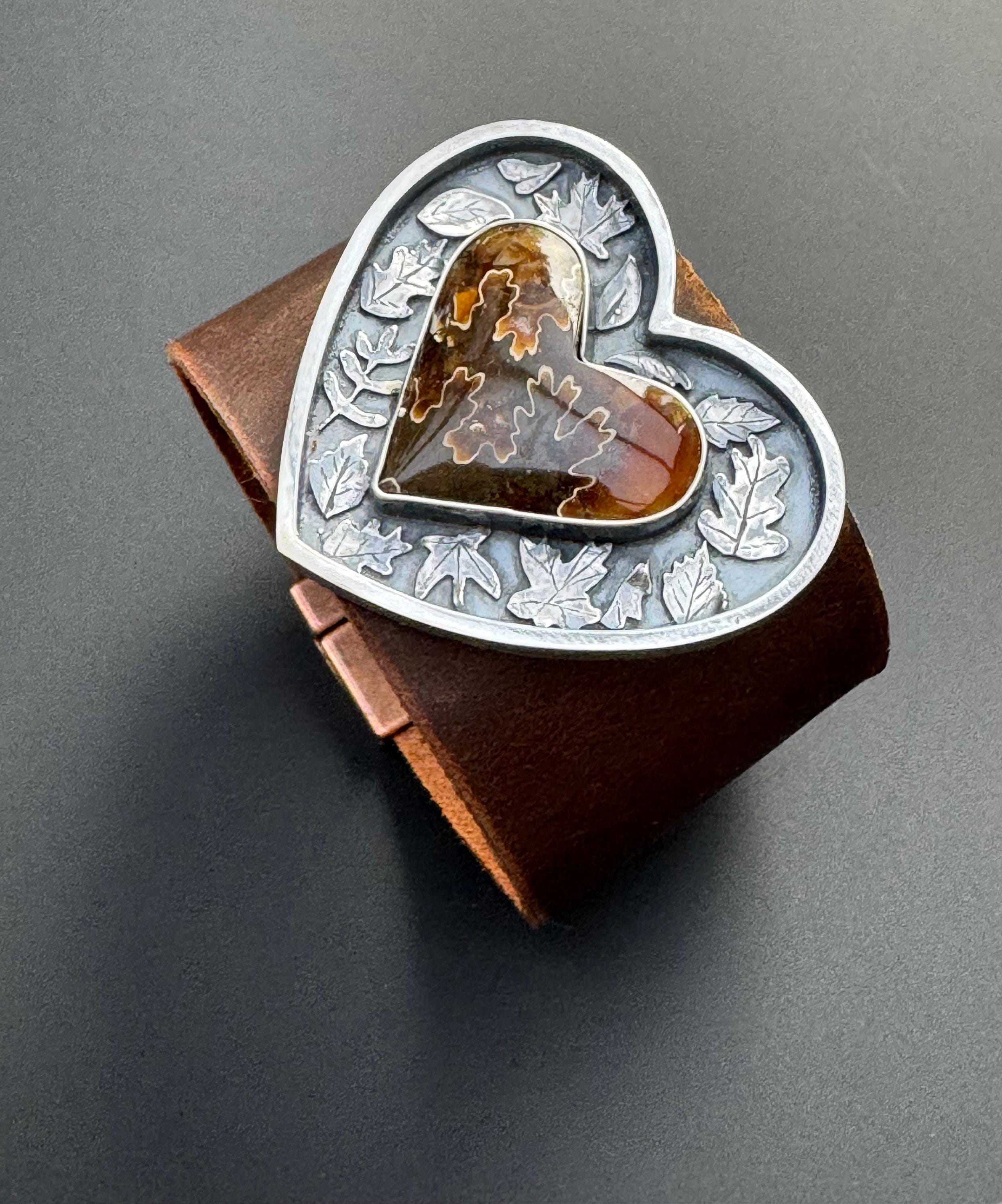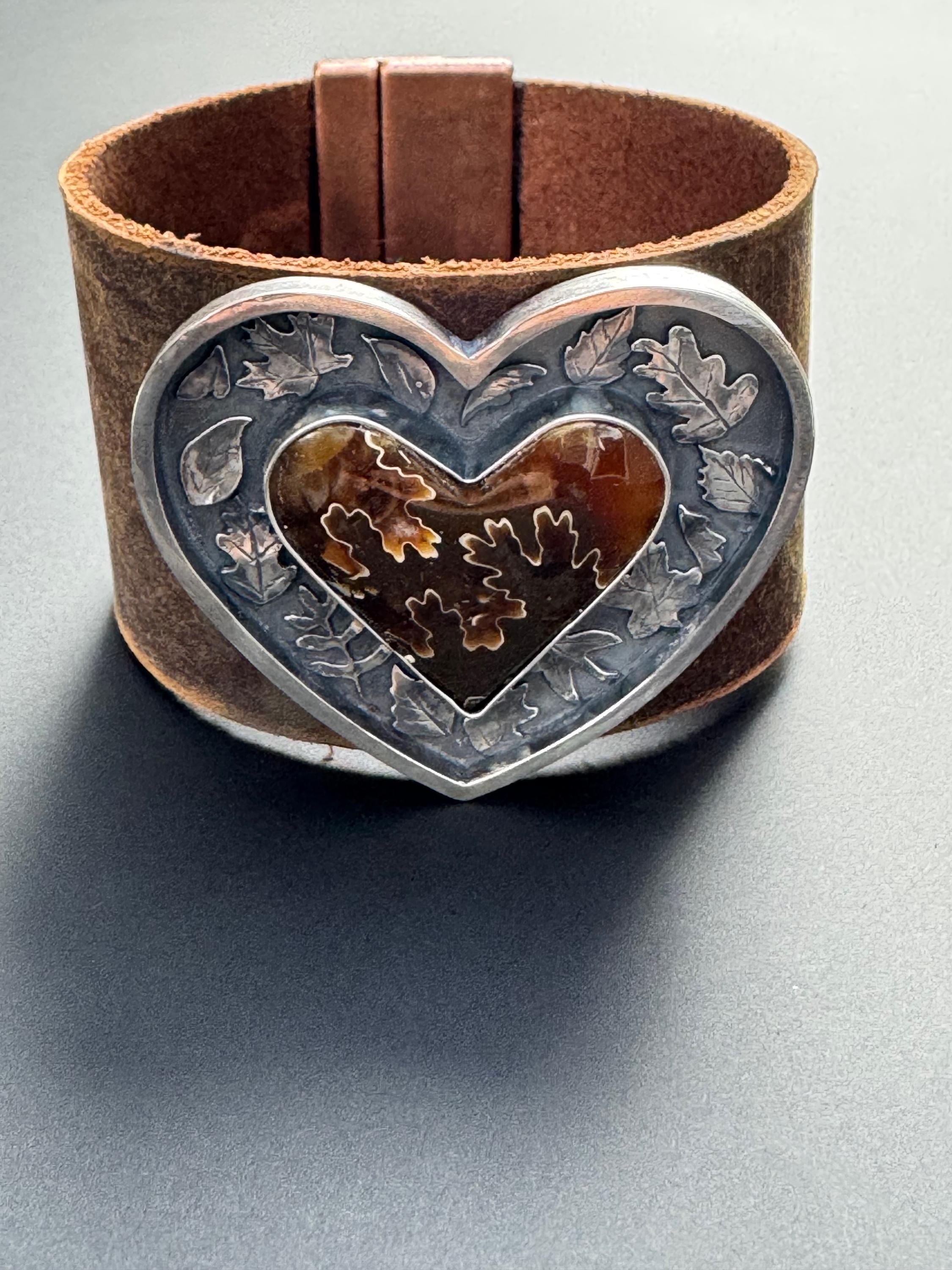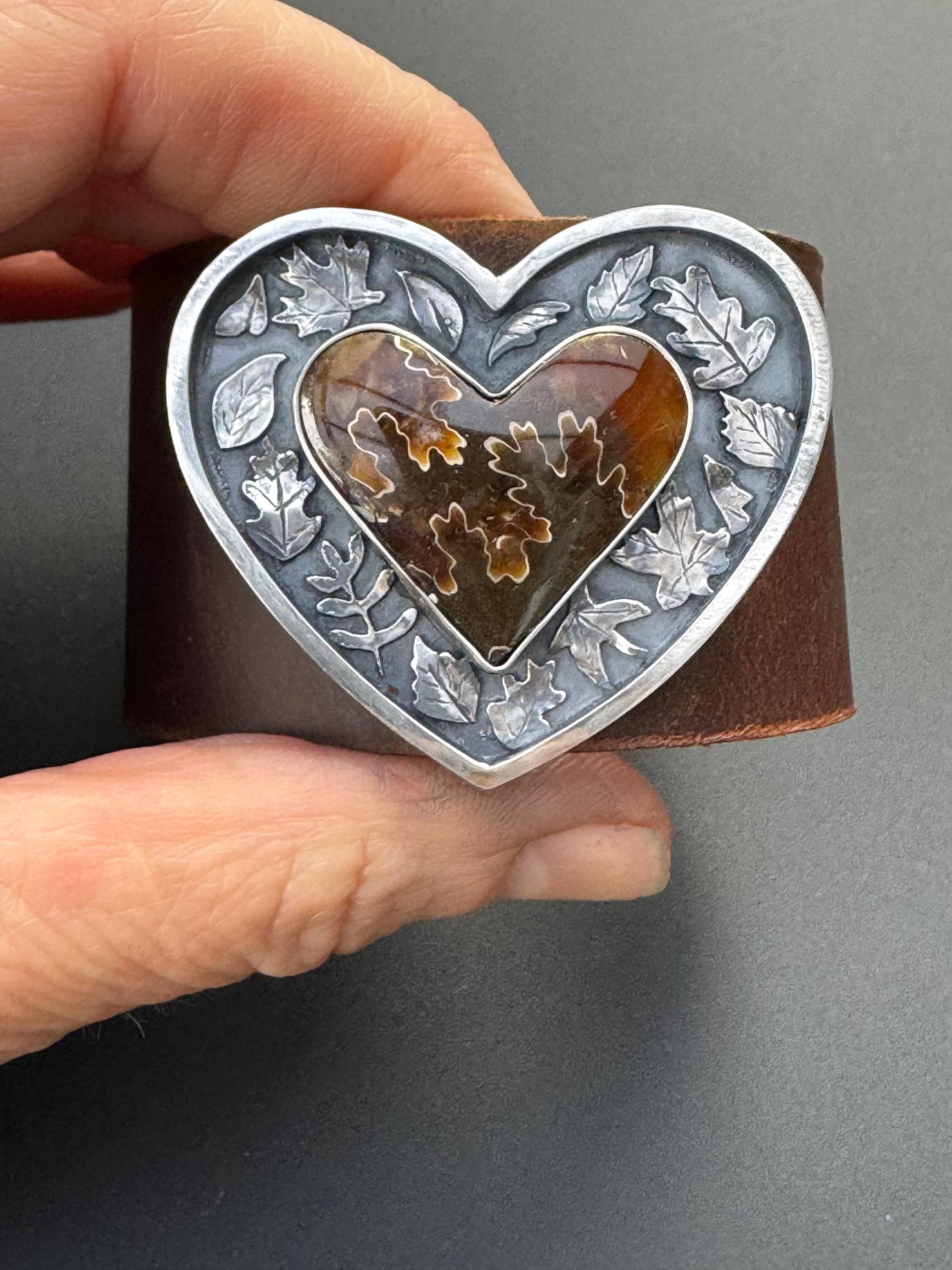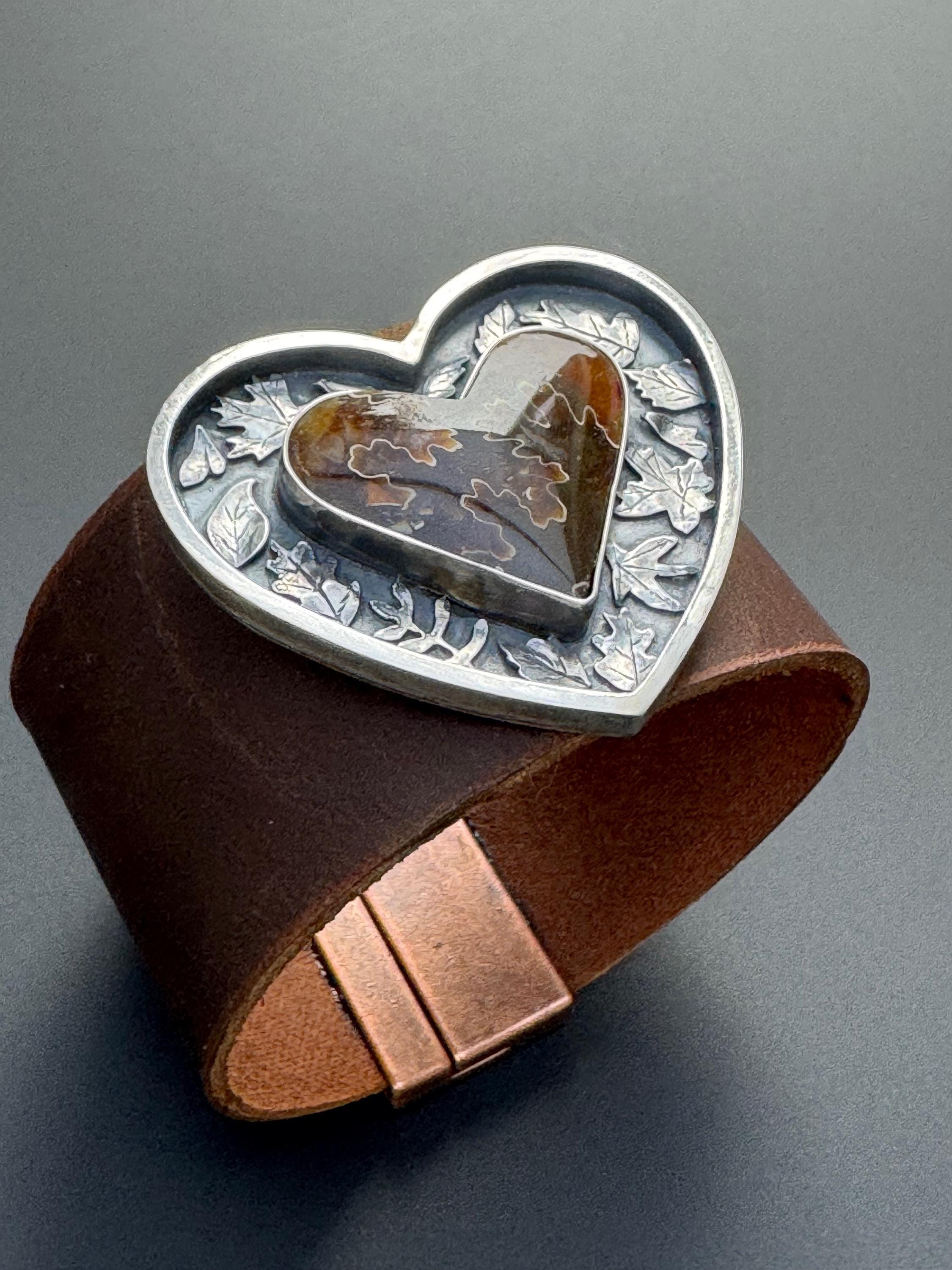 This is a statement piece featuring a 3/4 oz heart made from sterling silver. In it's center is a gorgeous suture ammonite fossil heart. Surrounding the heart is a variety of small handmade leaves, to give the fall feeling of all the beautiful leaves we see on the ground now. I love the textures and colors of this piece. It's heavy autumn vibes. :) The leather cuff matches the colors perfectly too. It has a very strong magnetic clasp (a rustic copper color) that helps it feel very secure while on. Any nature lover would love this piece. It is completely handmade and is one of a kind.