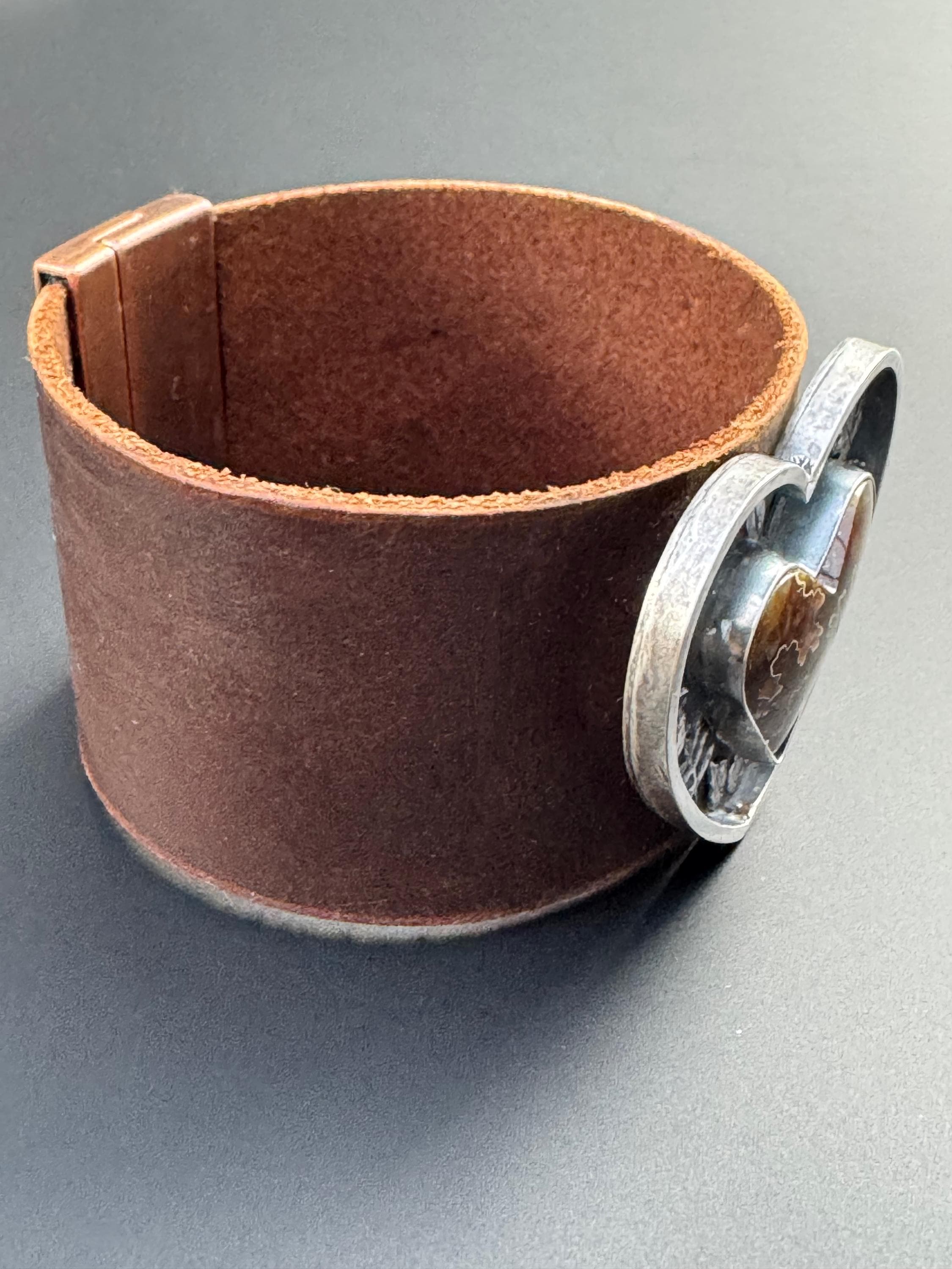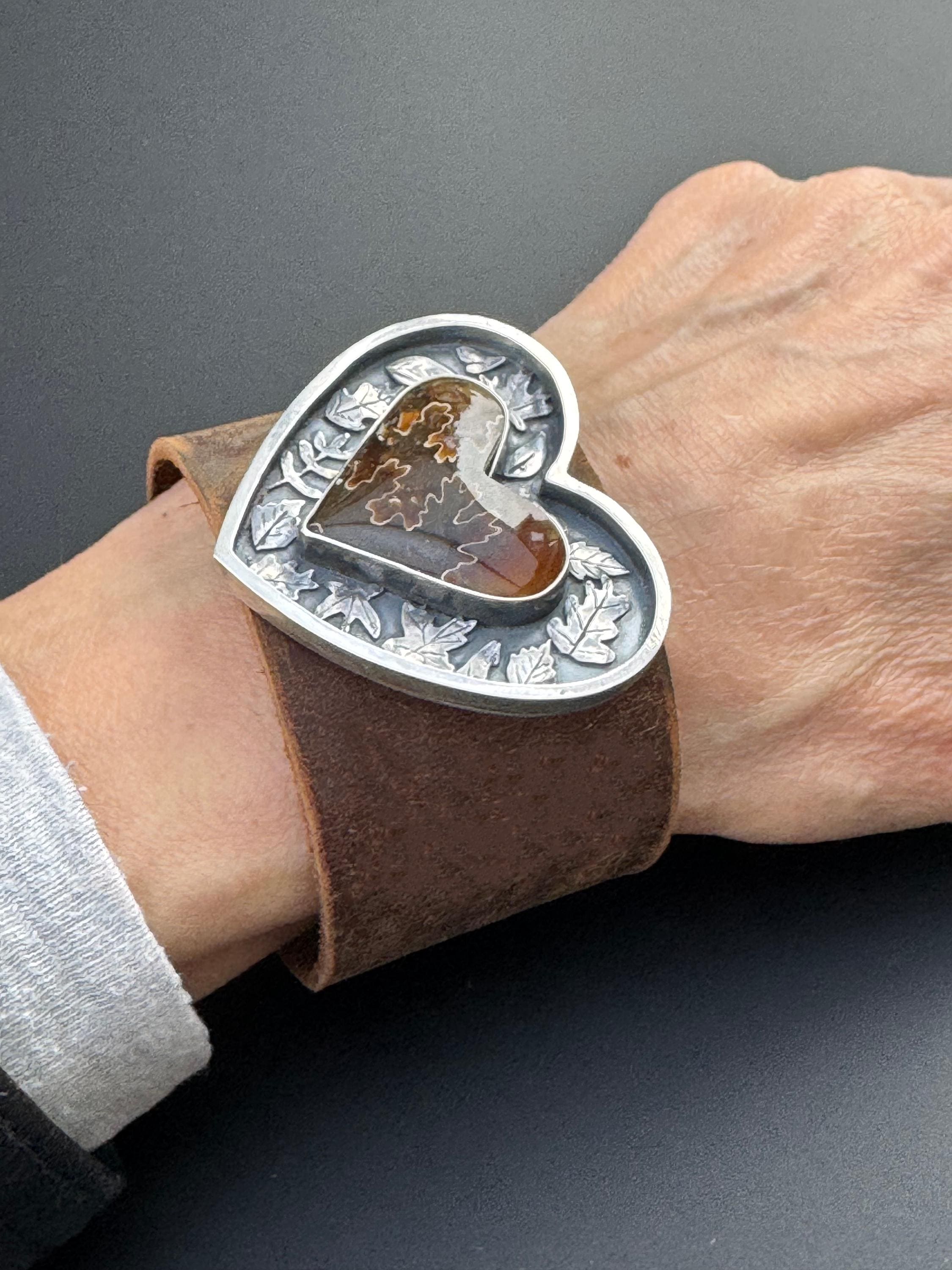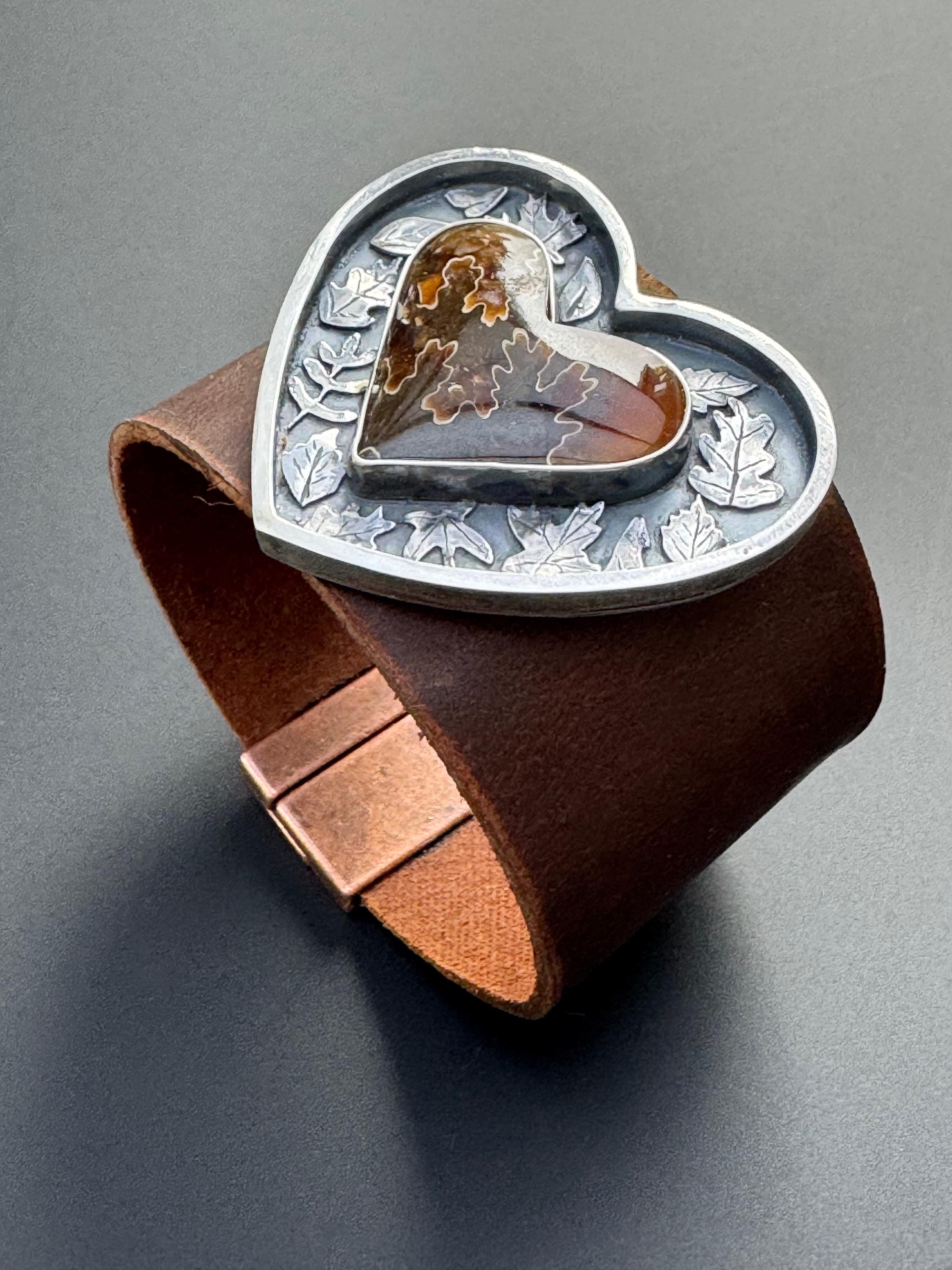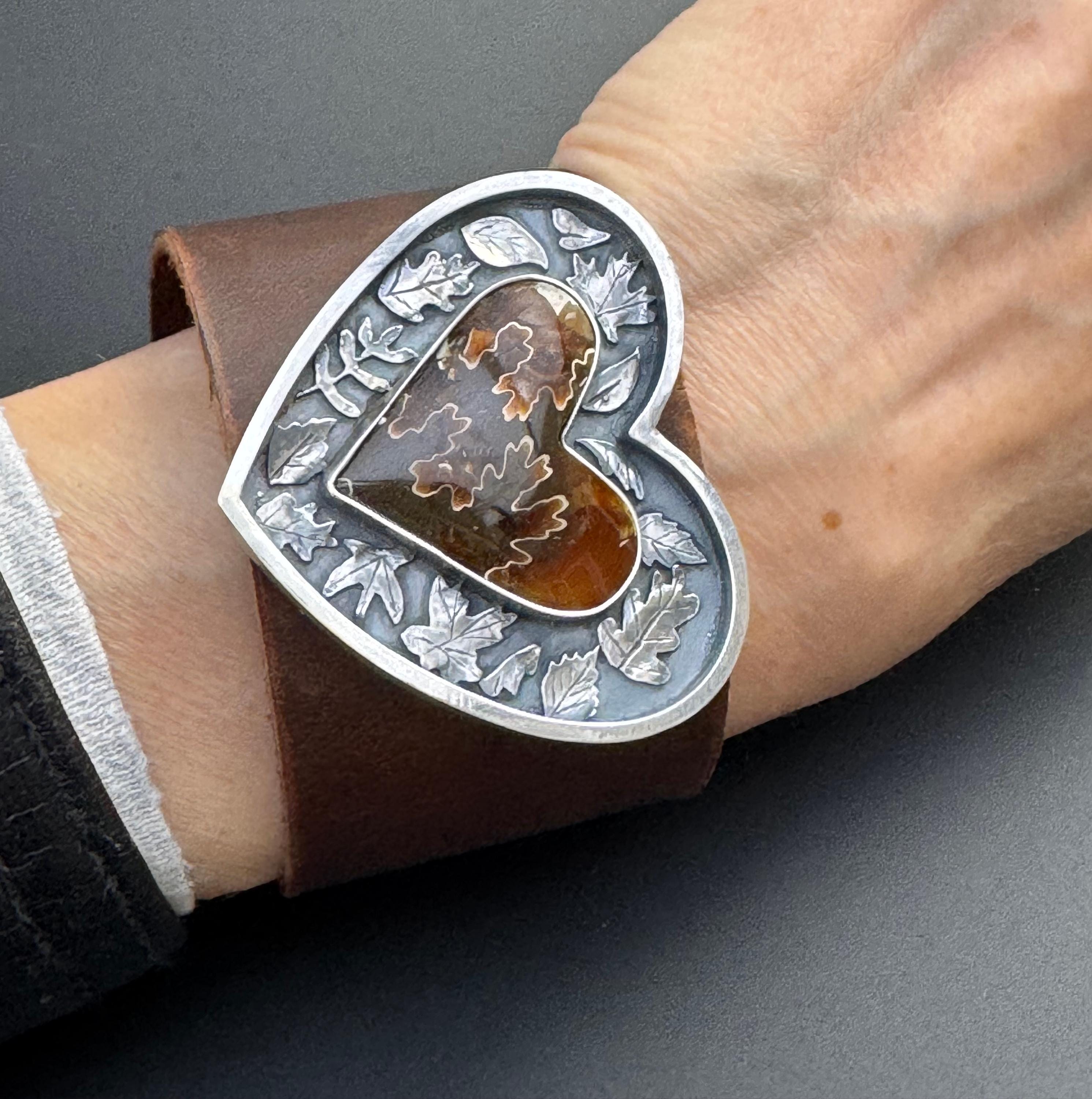 This is a statement piece featuring a 3/4 oz heart made from sterling silver. In it's center is a gorgeous suture ammonite fossil heart. Surrounding the heart is a variety of small handmade leaves, to give the fall feeling of all the beautiful leaves we see on the ground now. I love the textures and colors of this piece. It's heavy autumn vibes. :) The leather cuff matches the colors perfectly too. It has a very strong magnetic clasp (a rustic copper color) that helps it feel very secure while on. Any nature lover would love this piece. It is completely handmade and is one of a kind.