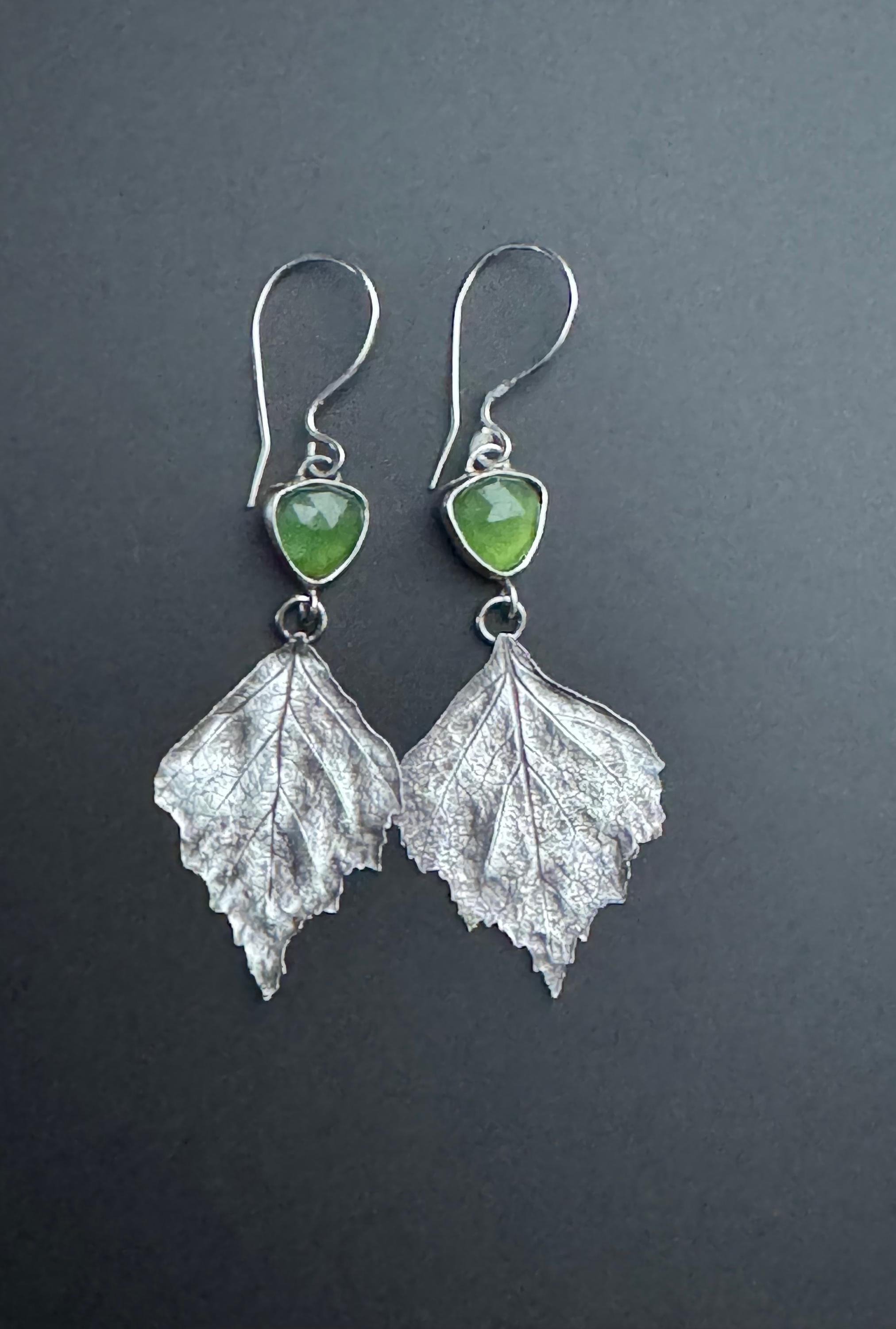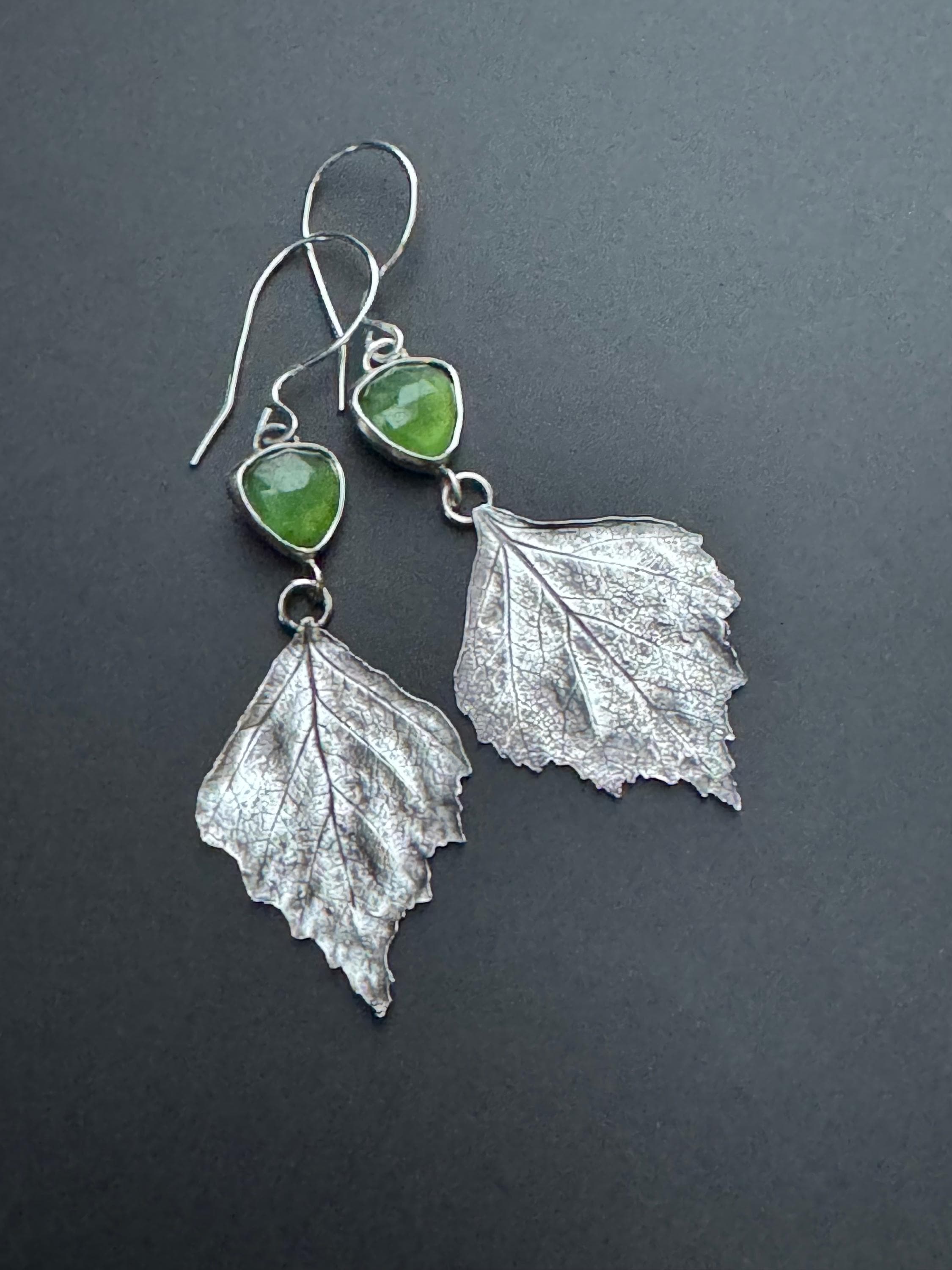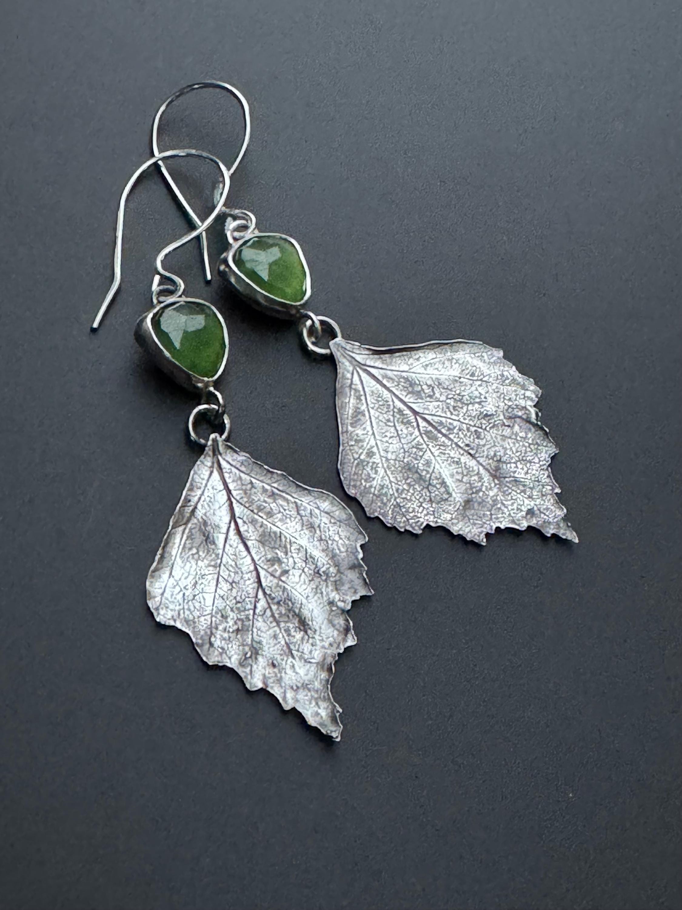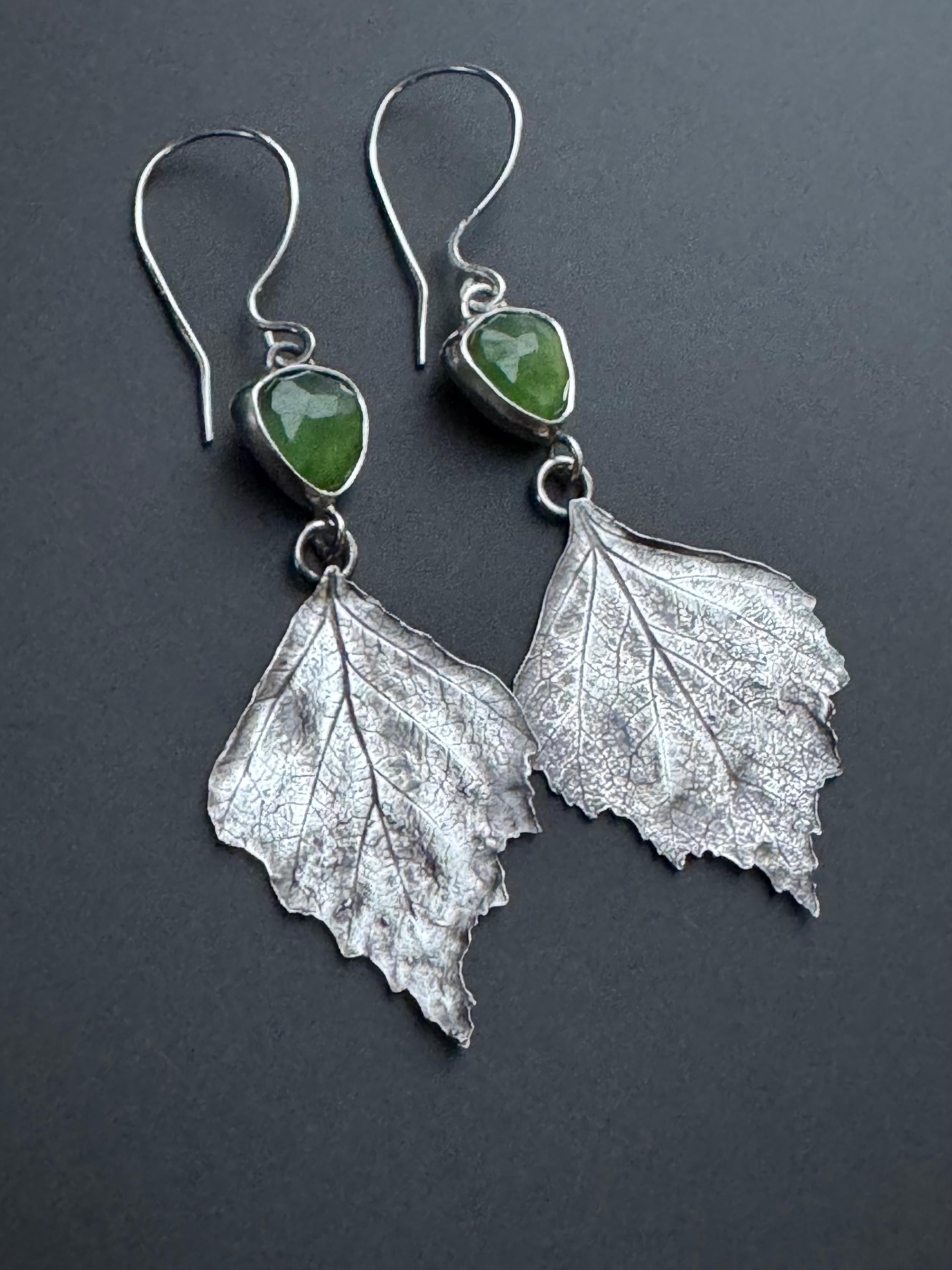 These earrings are made from sterling silver and are birch leaves - right from nature. Paired with beautiful faceted serpentine. These are super lightweight and have all the texture of leaves These are handmade and one of a kind earrings.