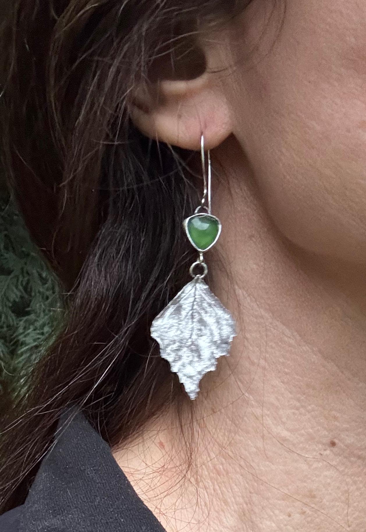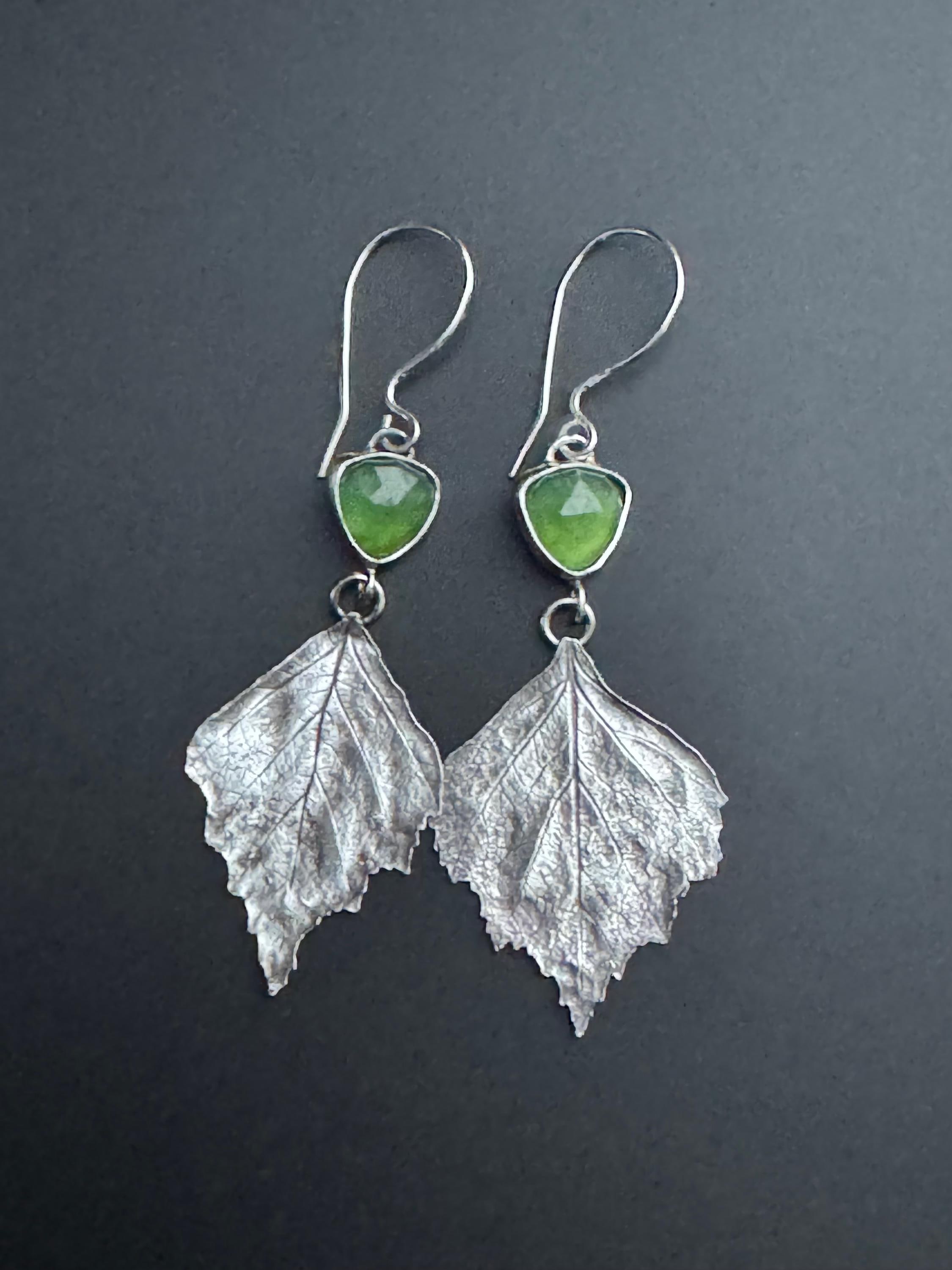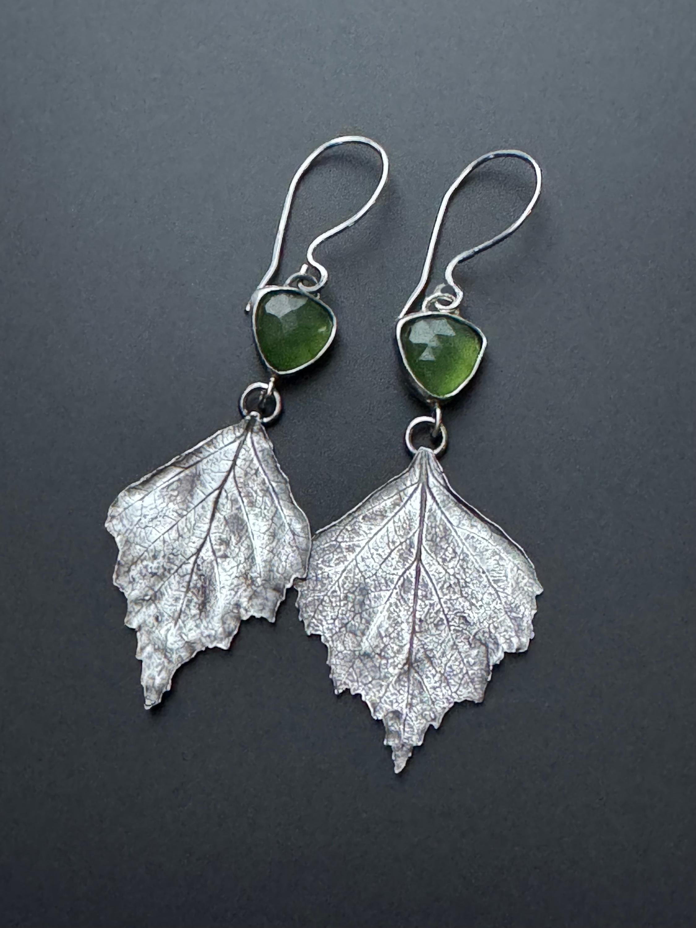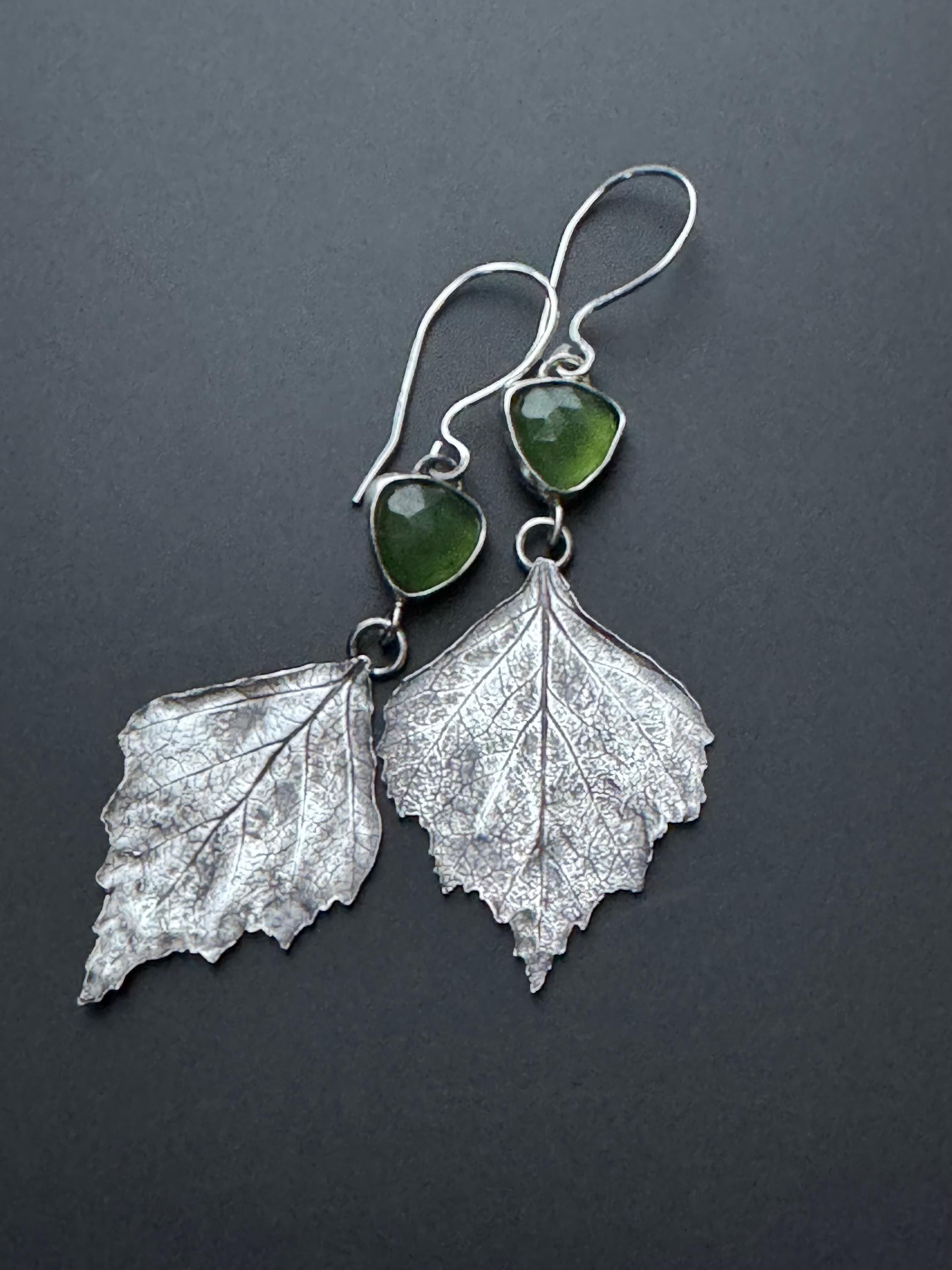 These earrings are made from sterling silver and are birch leaves - right from nature. Paired with beautiful faceted serpentine. These are super lightweight and have all the texture of leaves These are handmade and one of a kind earrings.