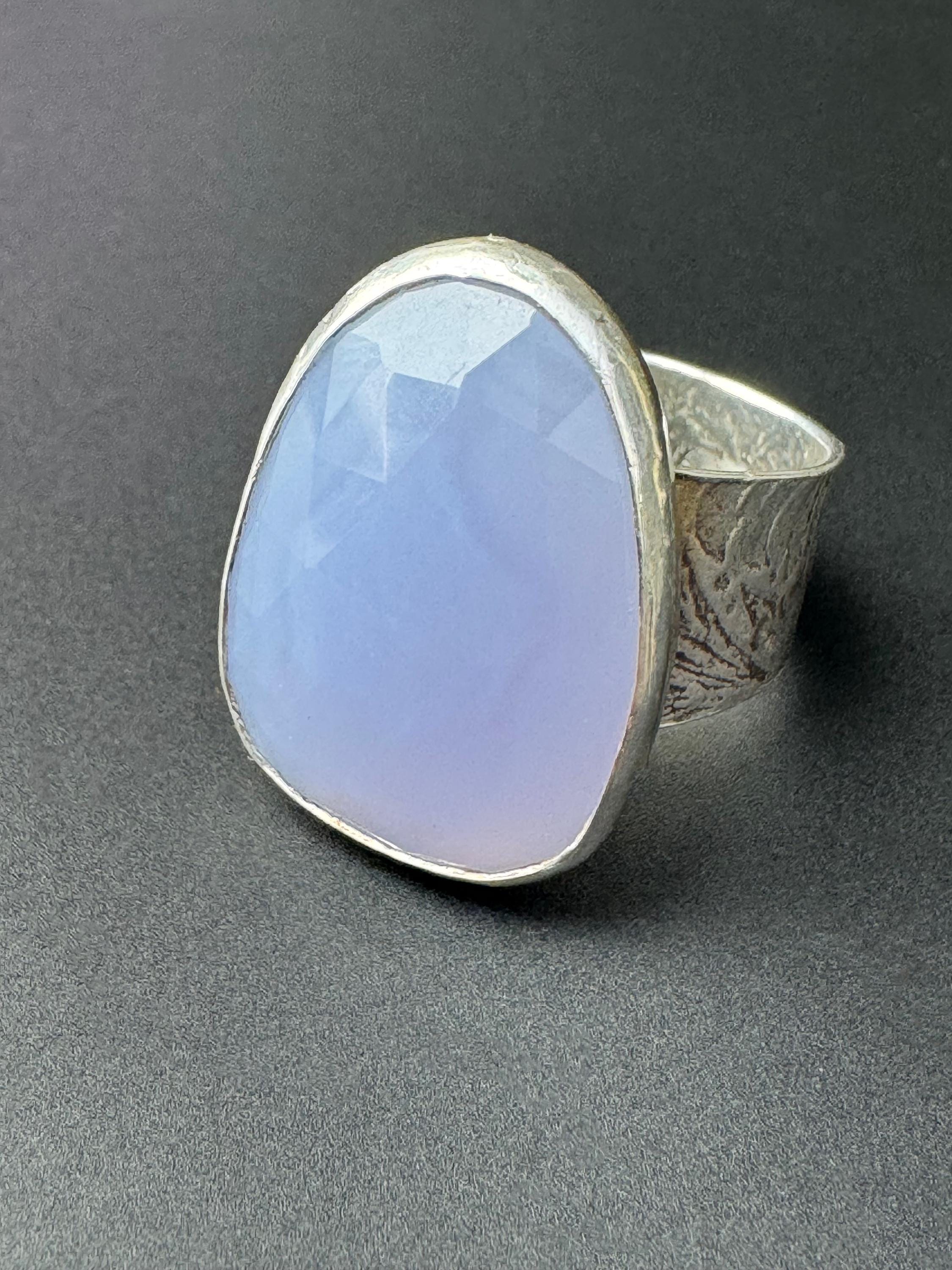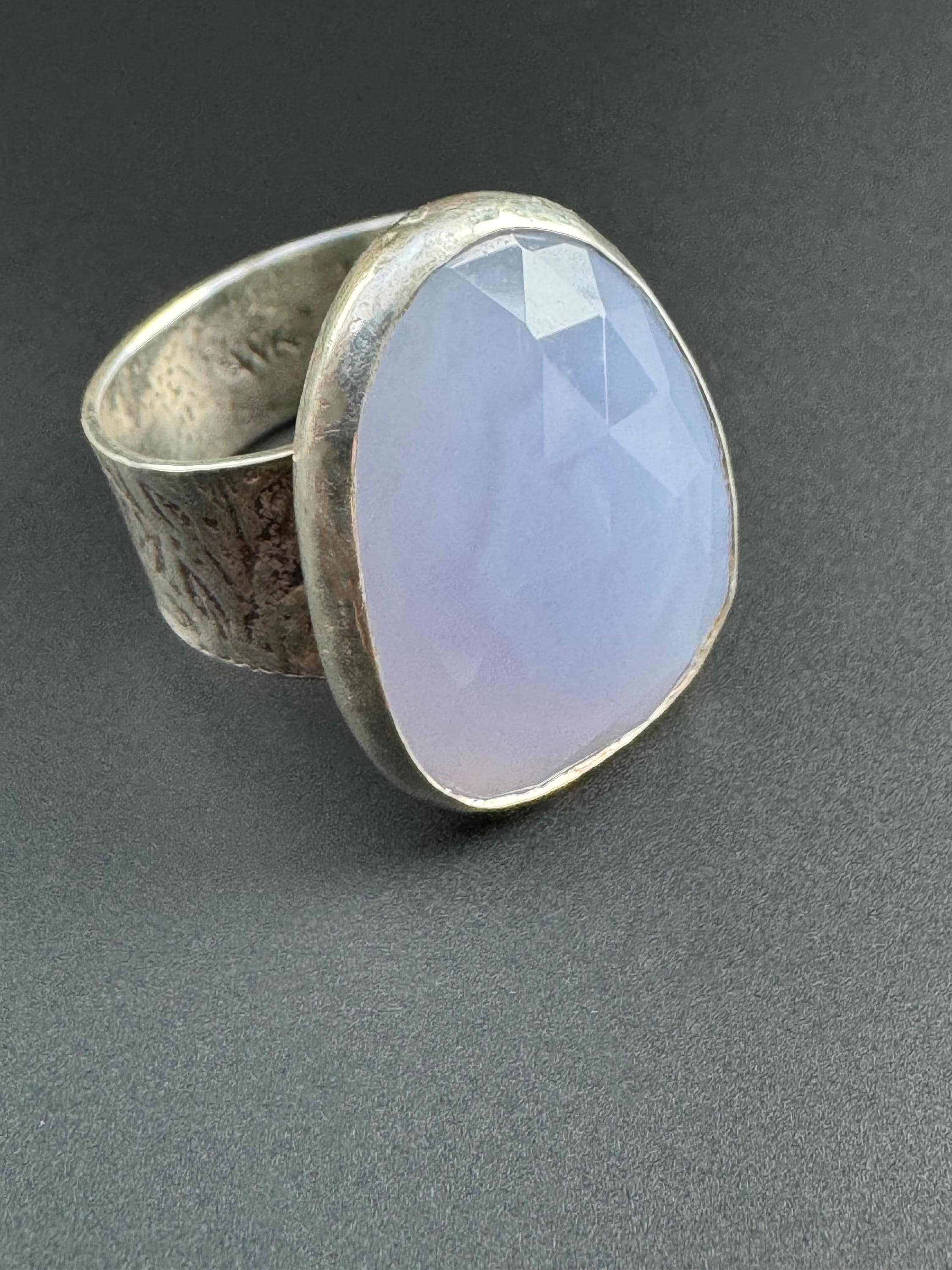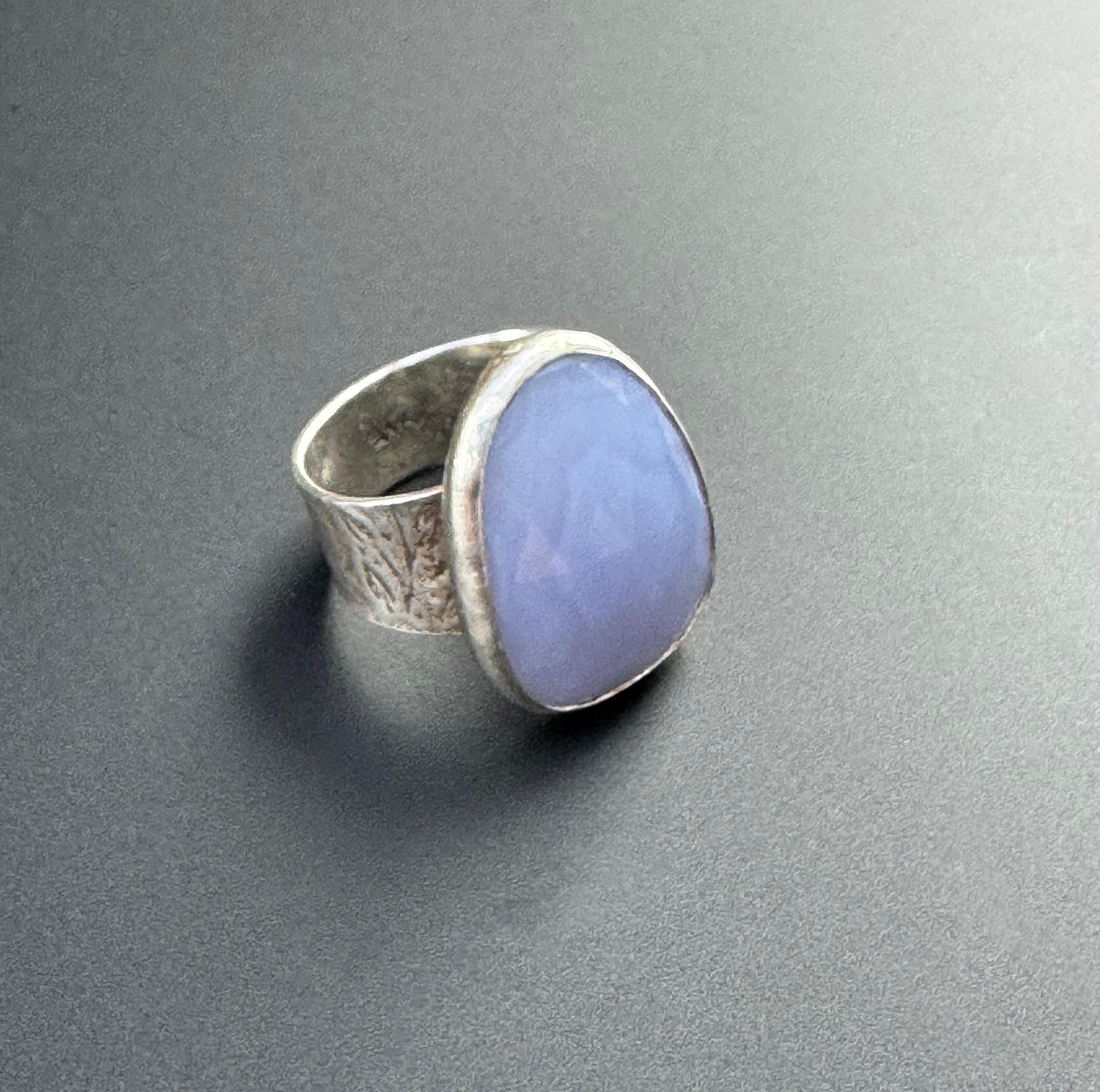 This handmade ring is made from sterling silver and is a simple solitaire of beautiful glowing lavender chalcedony. It's such a beautiful stone, it goes well with jeans and dress up. It's a simple ring meant to showcase the stone, as it needs no fluff :) It is completely handmade and one of a kind.