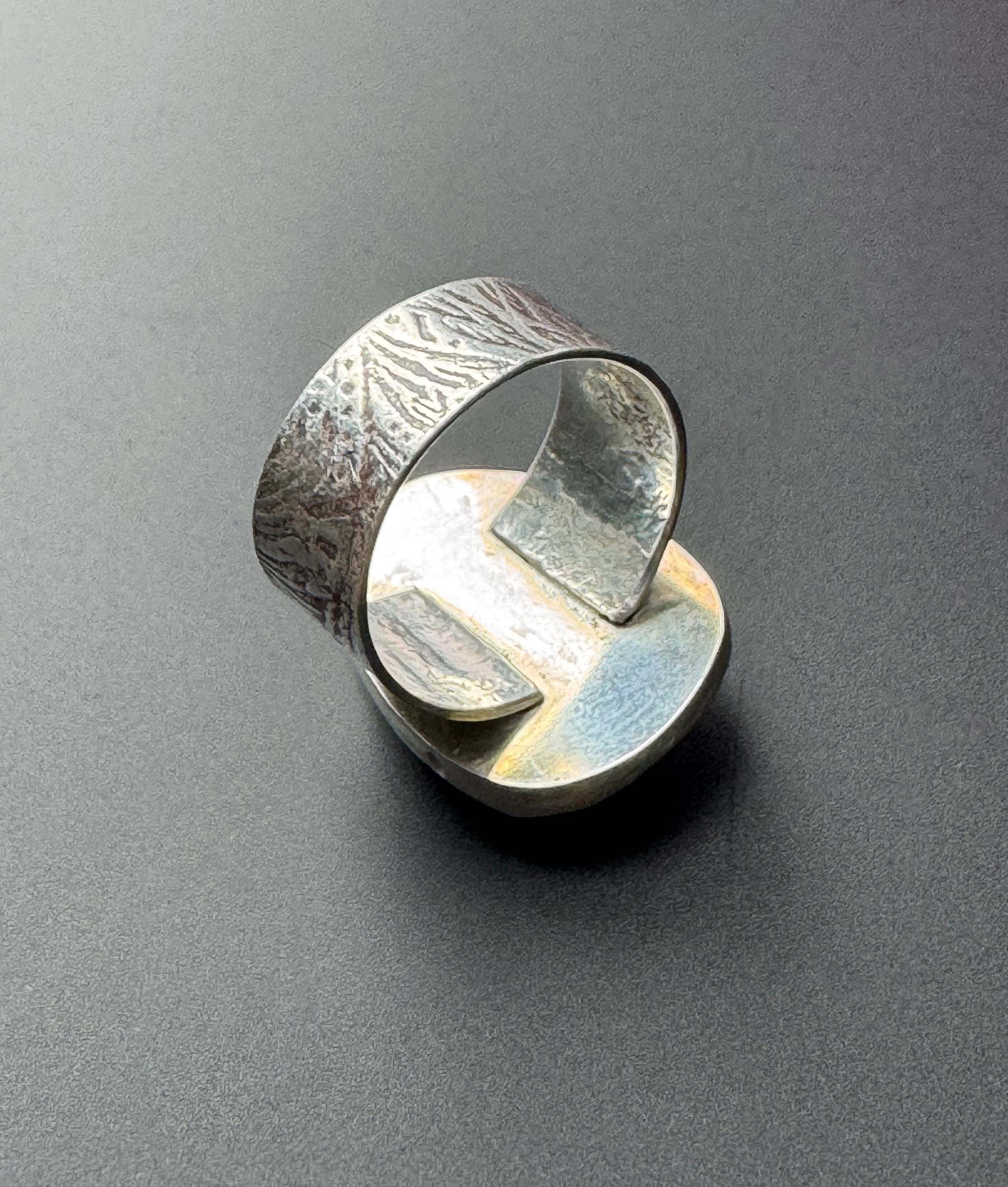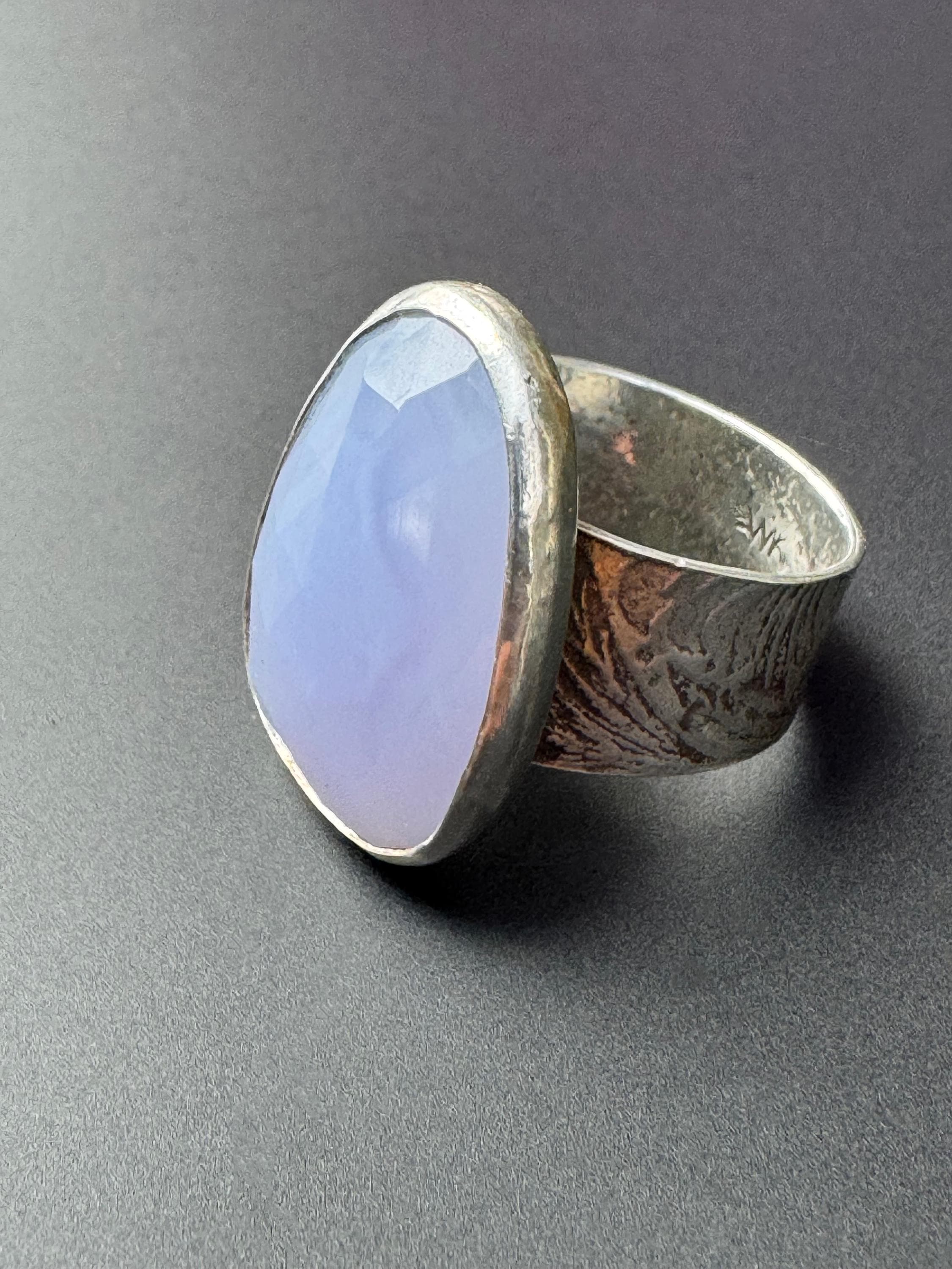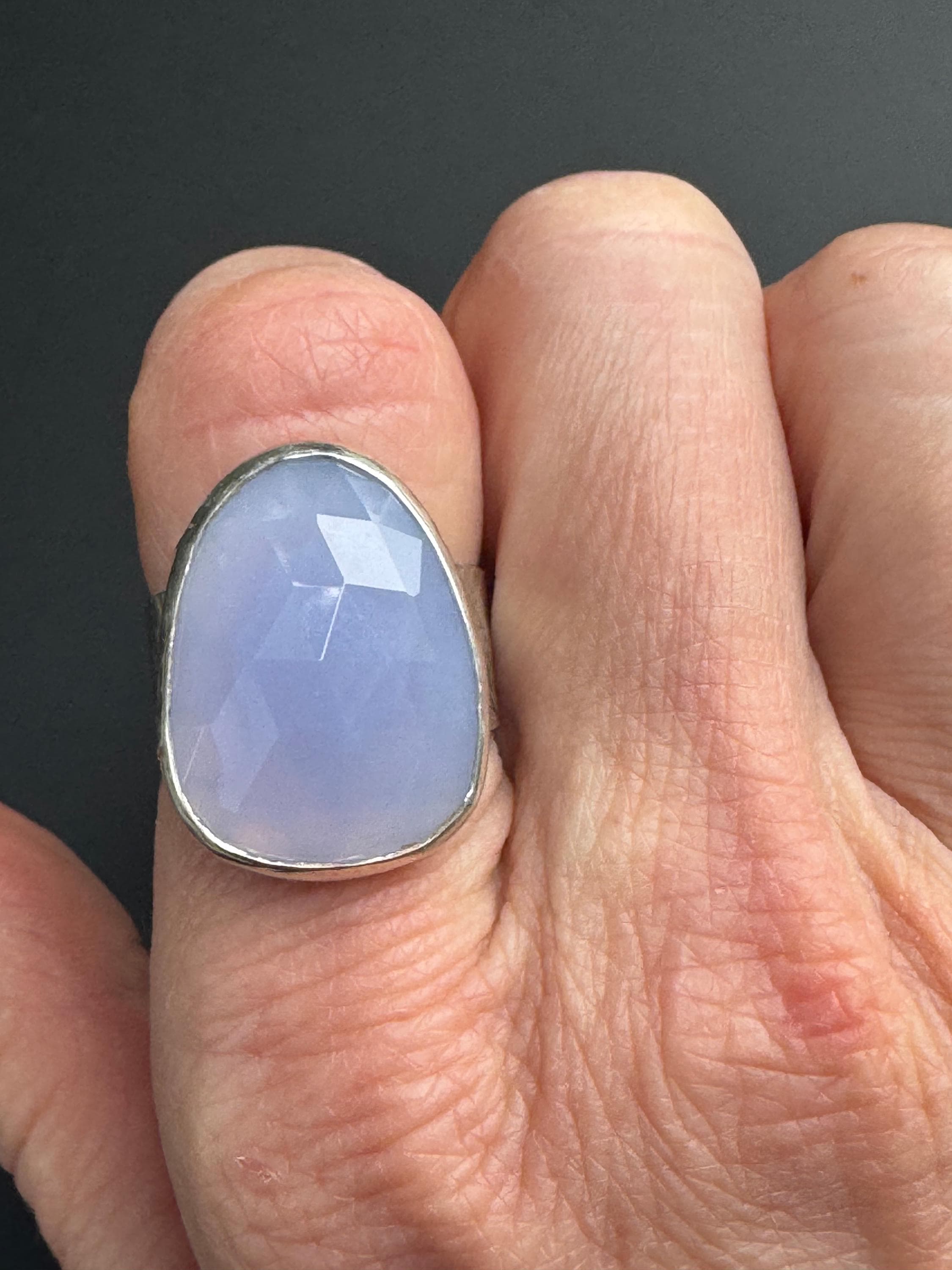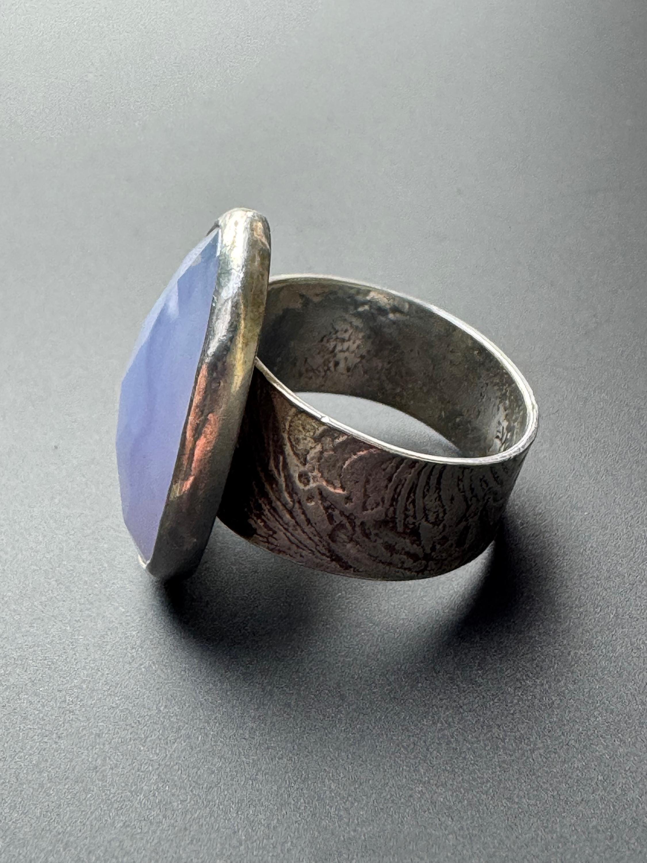 This handmade ring is made from sterling silver and is a simple solitaire of beautiful glowing lavender chalcedony. It's such a beautiful stone, it goes well with jeans and dress up. It's a simple ring meant to showcase the stone, as it needs no fluff :) It is completely handmade and one of a kind.