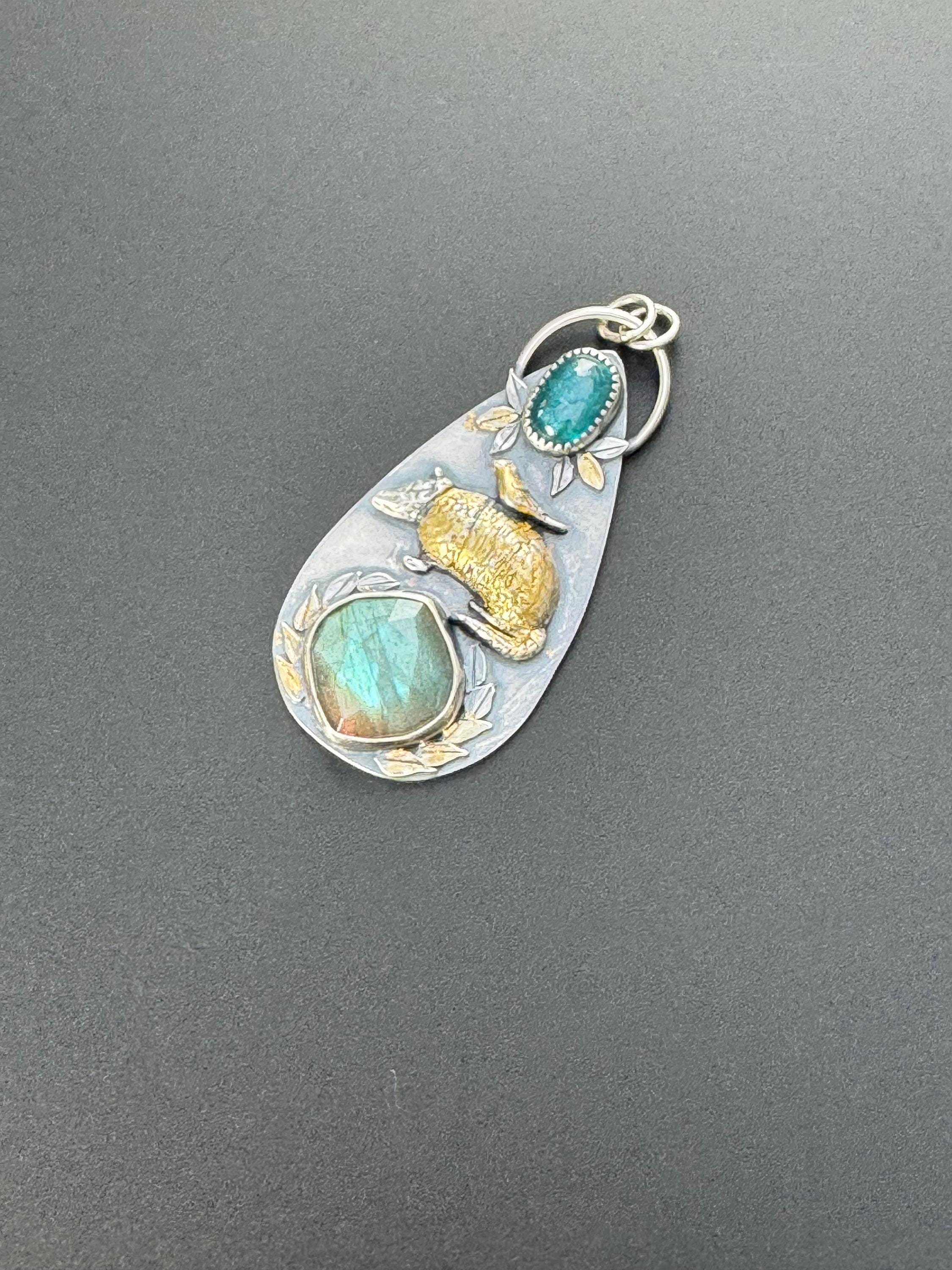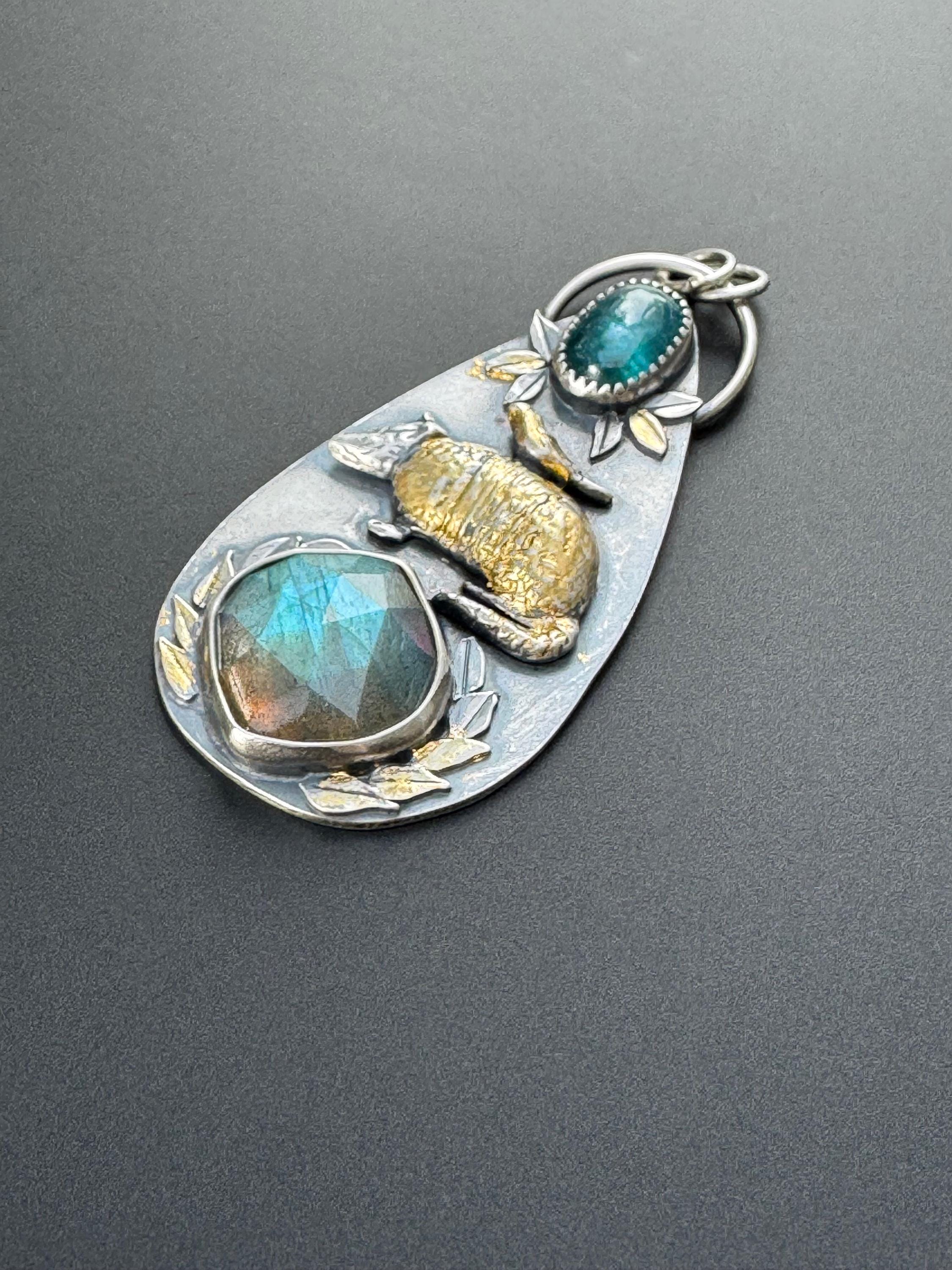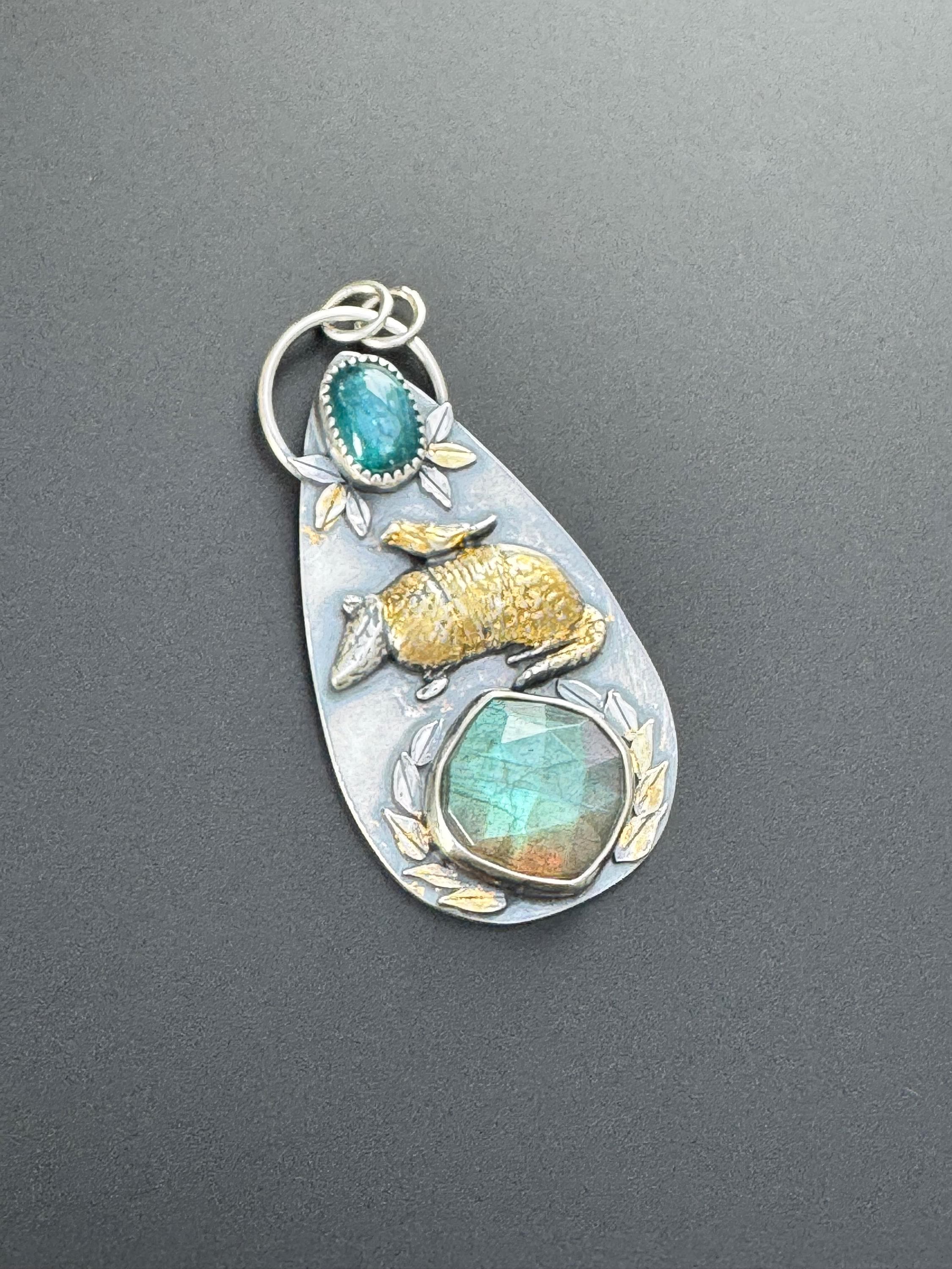 This piece tells a story of Annabelle and the armadillo. They met in the forest one day and became fast friends. Sometimes armadillo lets Annabelle ride on his back while they walk and talk. The sun shines down on them through the trees, creating a lovely scene. This piece features two beautiful stones, kyanite and labradorite. Both reflecting the colors of the sky, the sun, the animals. Surrounding the stones are small handmade leaves. These are hand cut and textured, then soldered into place to create the design. This piece also has 24k gold leaf applied to both Annabelle and the armadillo as well as some leaves. This is done with heat through an ancient process called Keum boo where the gold is melded to the silver through heat and pressure. This is a delightful piece that tells a story of friendship and beauty. This is a one of a kind piece.