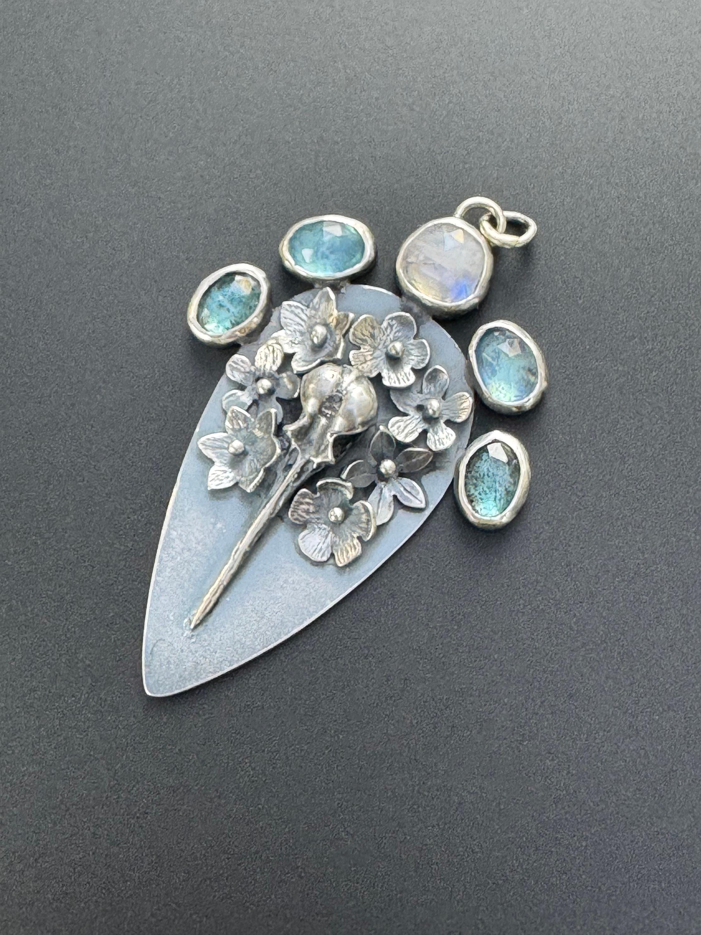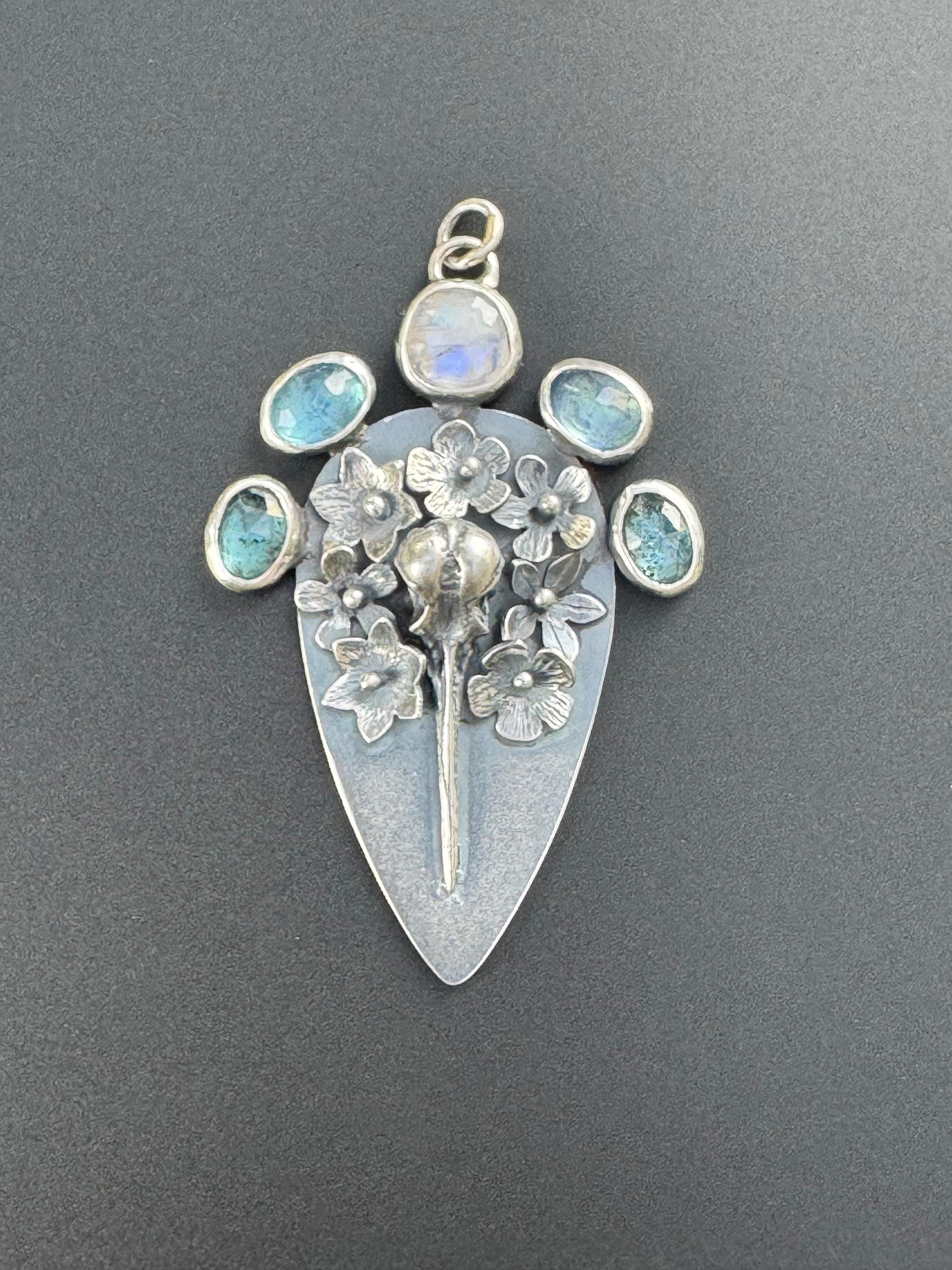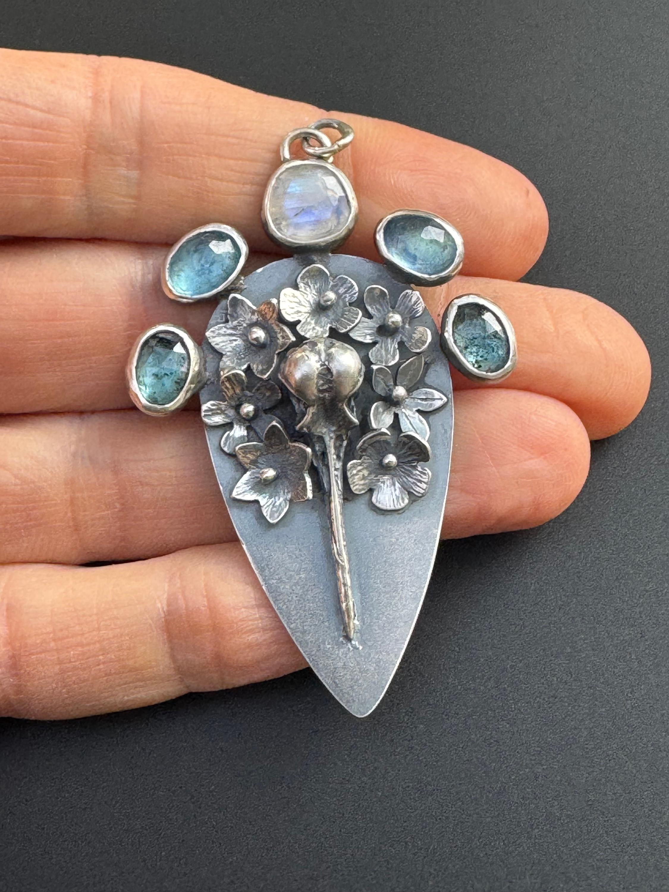 This is a pendant reflecting the cycle of life; it shows a hummingbird skull surrounded by beautiful flowers and 3 different types of beautiful gemstones. The piece is made from sterling silver. The flowers are each handmade, textured and soldered into place. The skull is solid silver, and the gemstones are set in sterling. At the top center is a moonstone, on either side are two aquamarines and next to those are two teal moss kyanite stones. There are two bail rings that will accommodate most chains. This is a one of a kind piece and would please any nature lover.