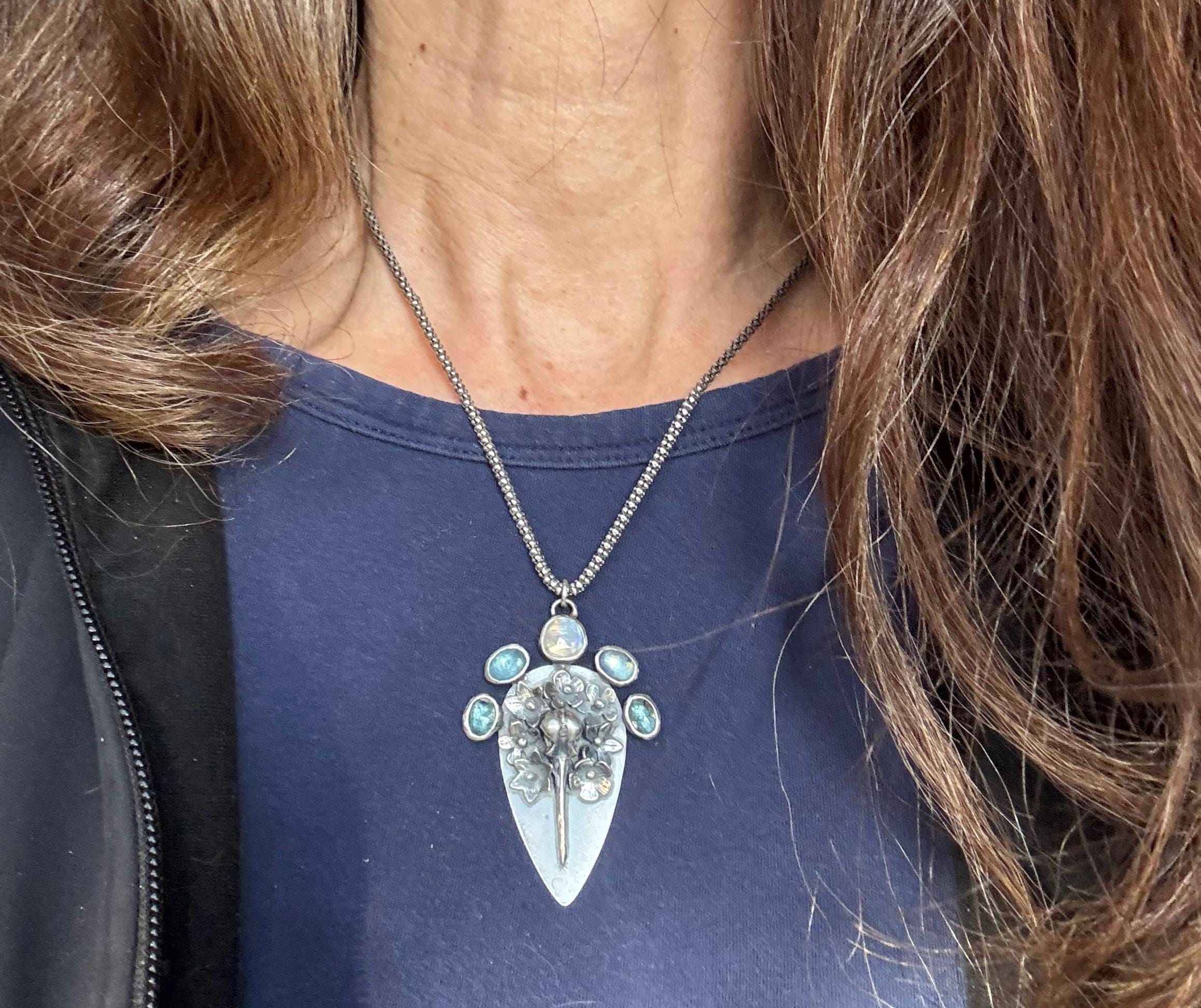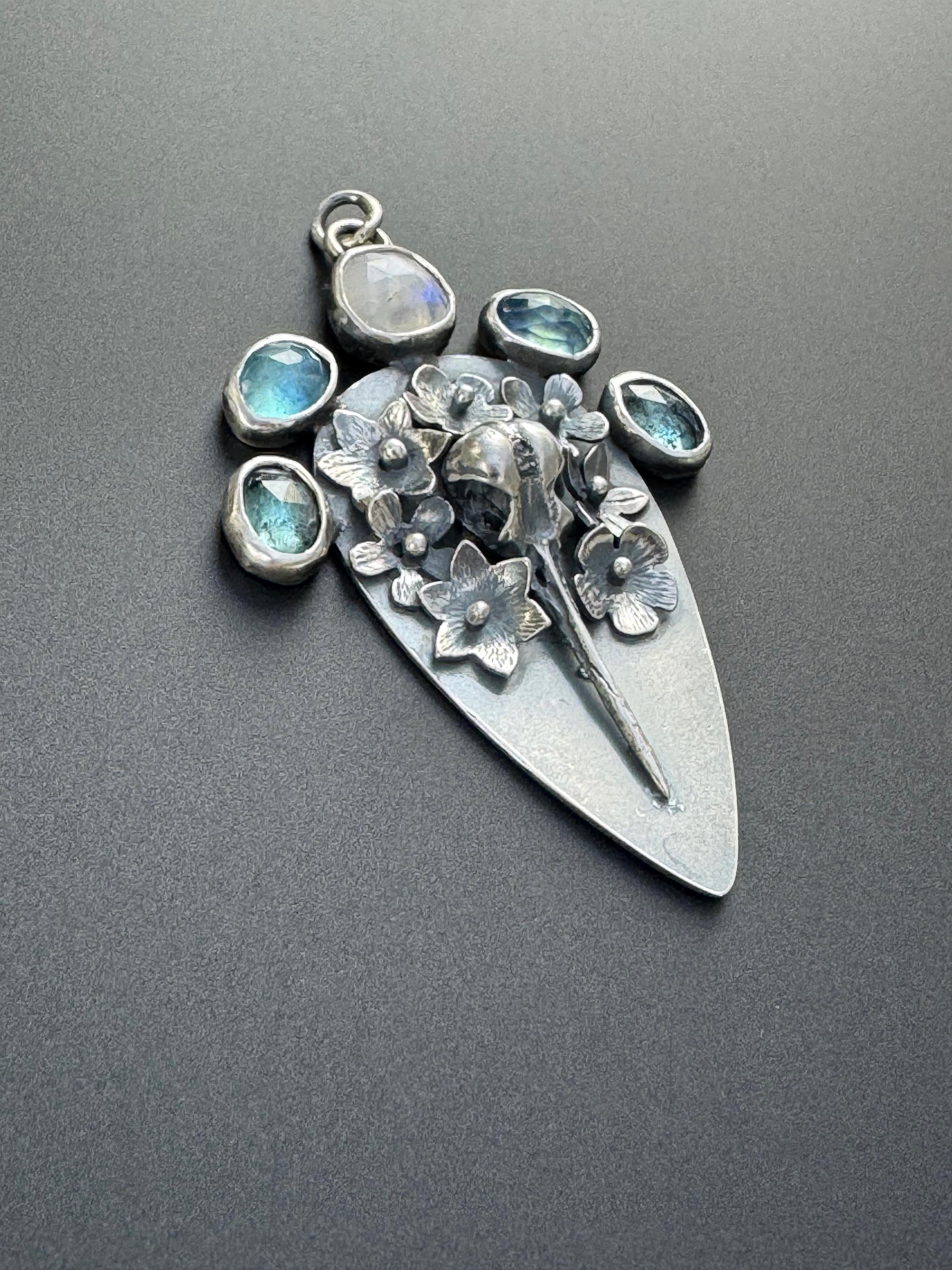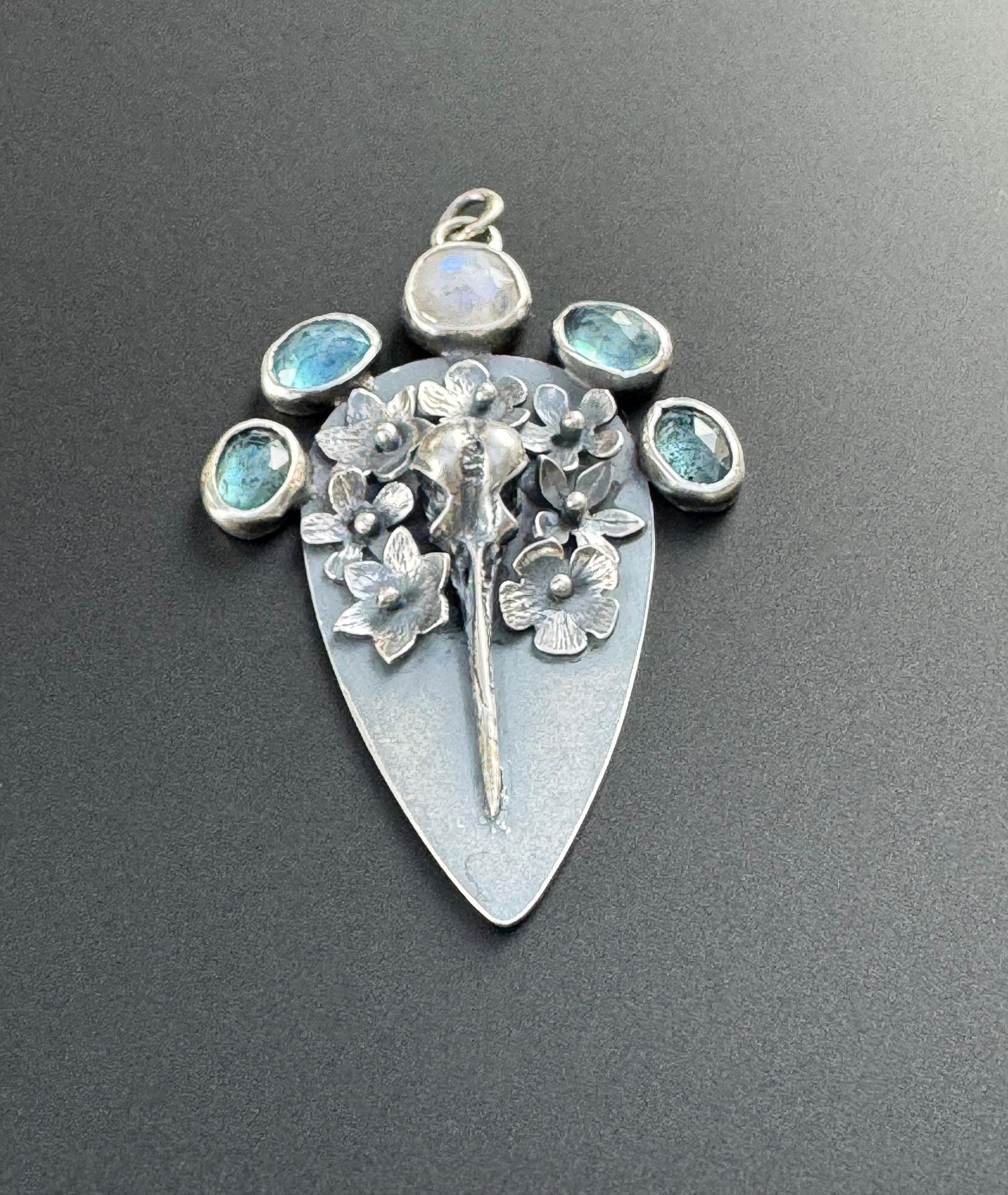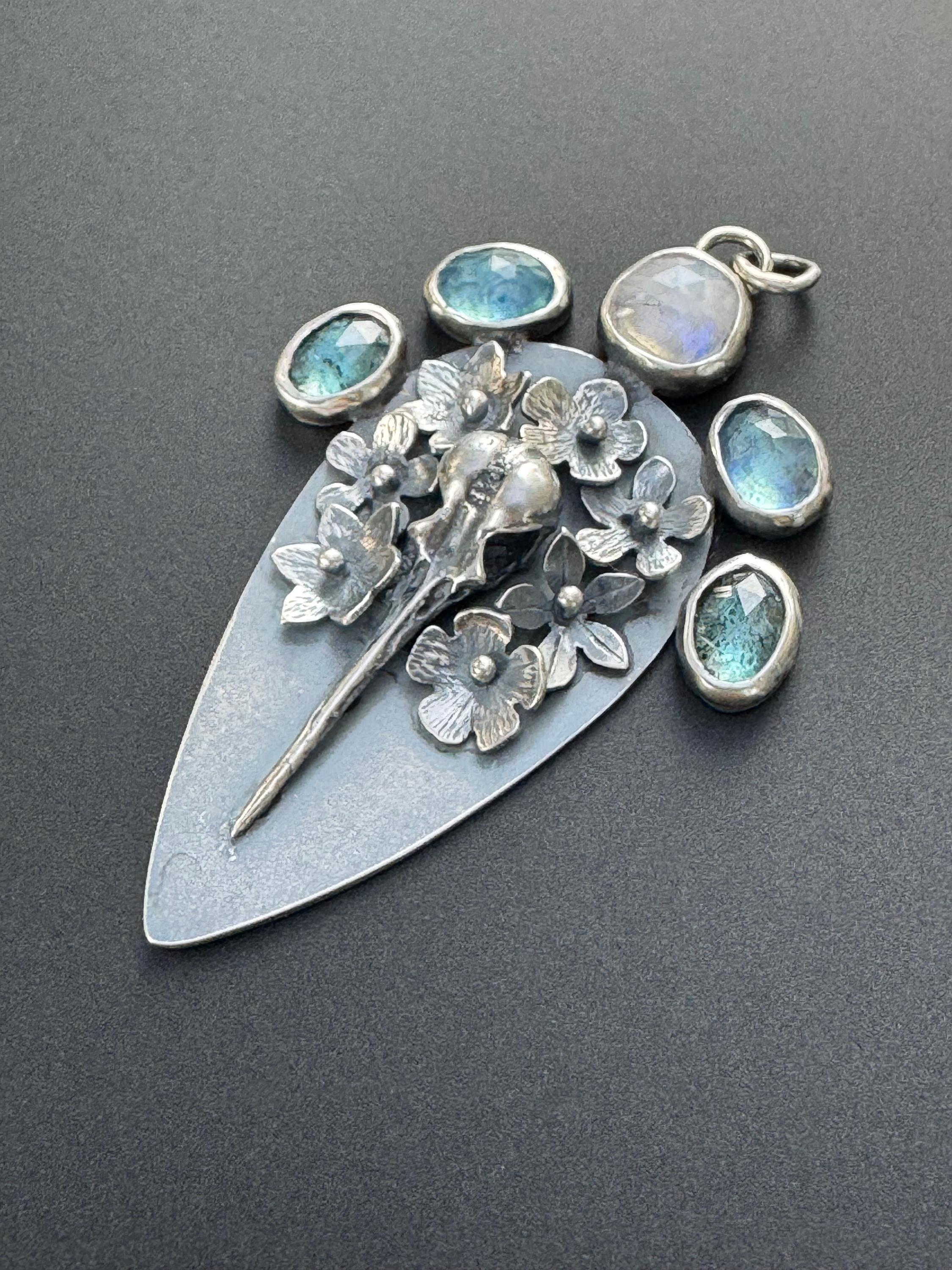 This is a pendant reflecting the cycle of life; it shows a hummingbird skull surrounded by beautiful flowers and 3 different types of beautiful gemstones. The piece is made from sterling silver. The flowers are each handmade, textured and soldered into place. The skull is solid silver, and the gemstones are set in sterling. At the top center is a moonstone, on either side are two aquamarines and next to those are two teal moss kyanite stones. There are two bail rings that will accommodate most chains. This is a one of a kind piece and would please any nature lover.