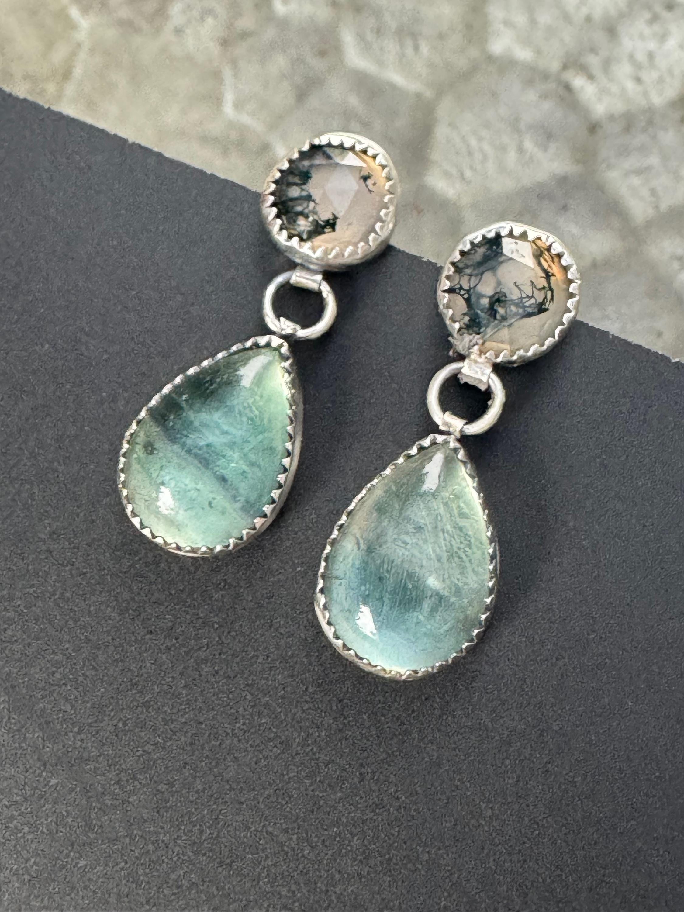 These are simple, yet beautiful earrings featuring two gemstones. Up top are two gorgeous moss agates. They are glowing and have accents of moss in the stone. Hanging below are beautiful clear high grade fluorite gemstone teardrops. Both of the stones are set in sterling silver. They are lightweight but have a nice color and sparkle to them. These have sterling silver posts. The earrings are handmade and one of a kind.