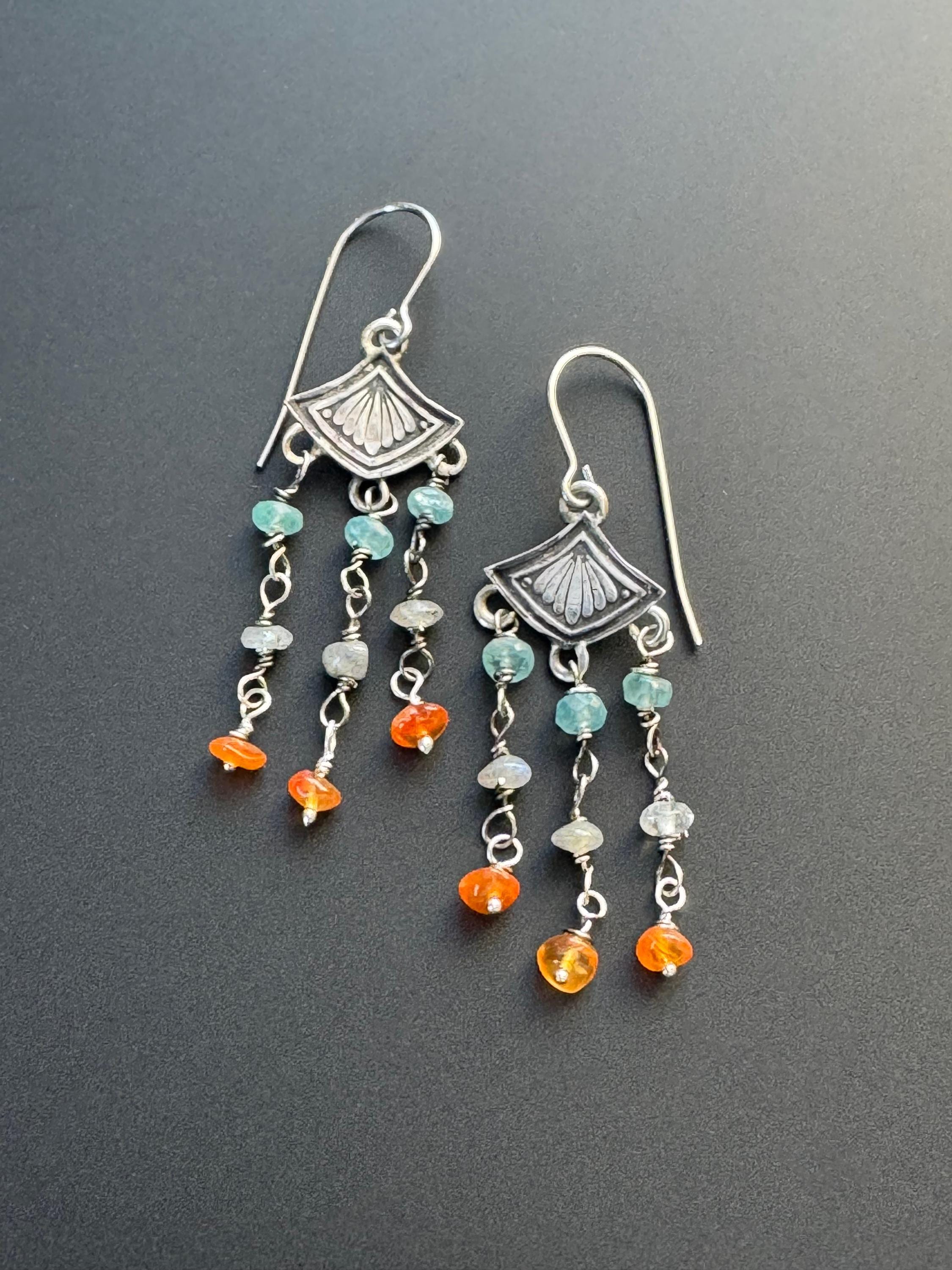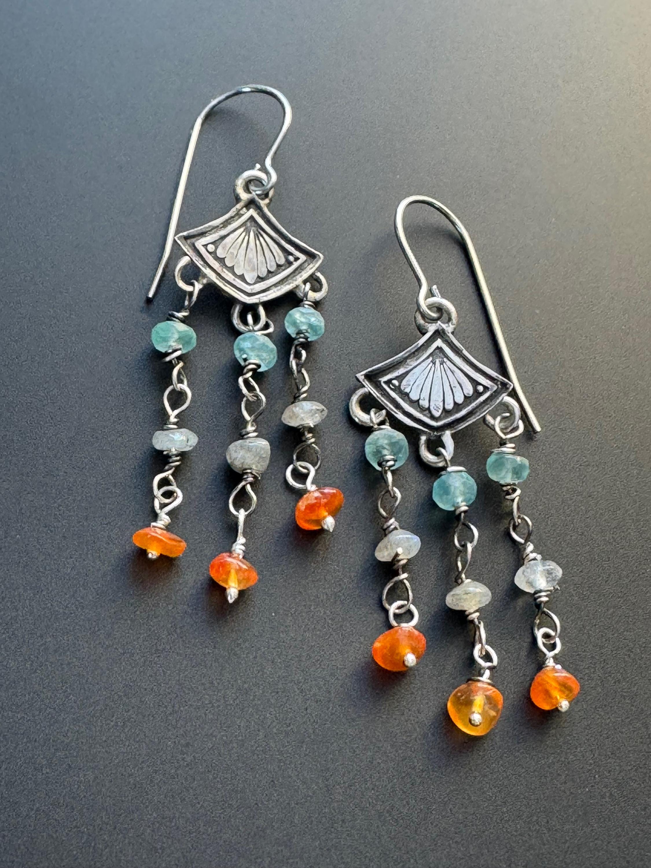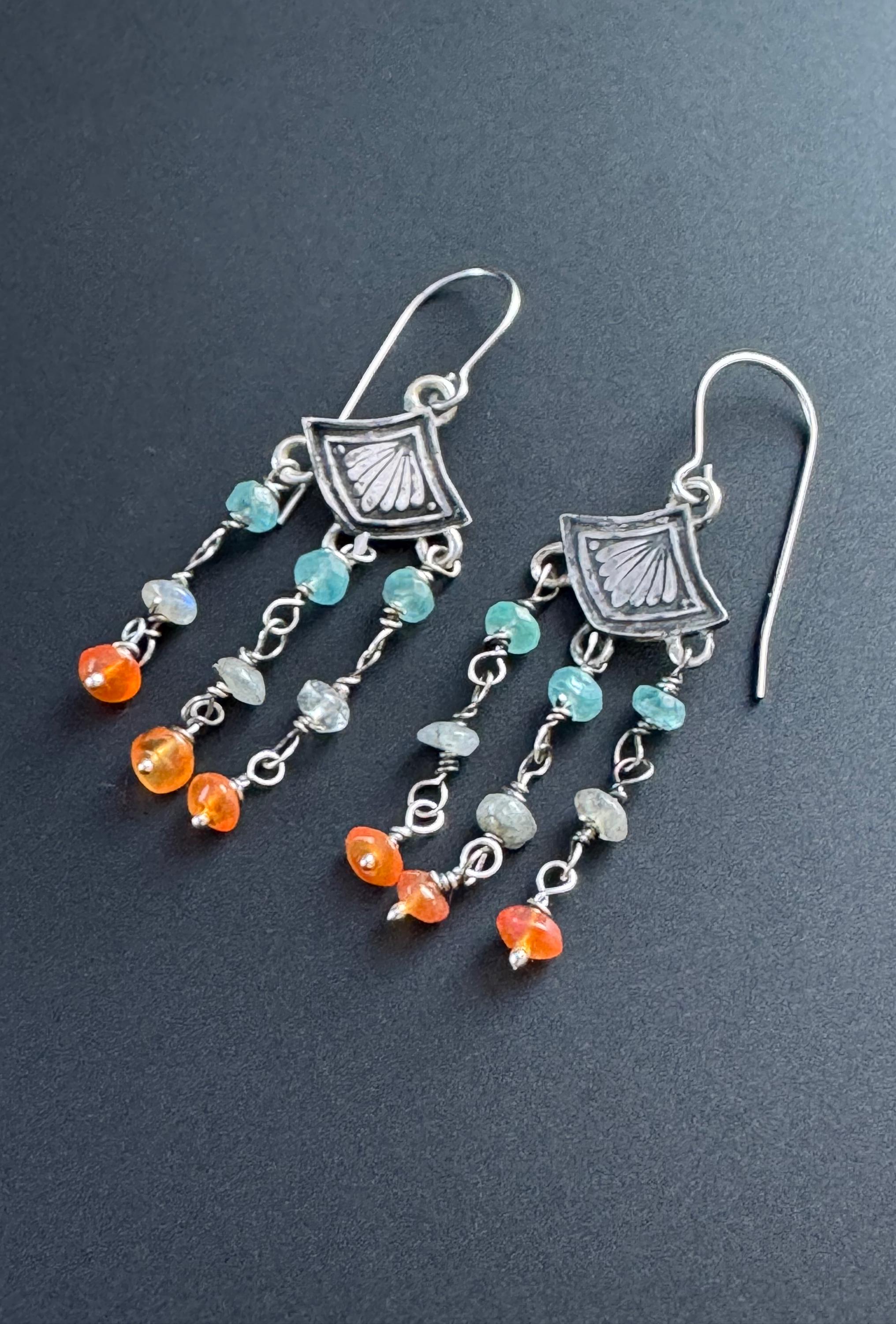 Made from sterling silver, these earrings are made from a cool art deco stamp at the top. Then I created colorful beaded dangles for them and hung 3 from each earring. The stones are blue apatite, labradorite and carnelian. They make a nice color combination and the earrings are very cute and lightweight. They move nicely and look great on. They can be worn with anything too! Handmade and one of a kind.