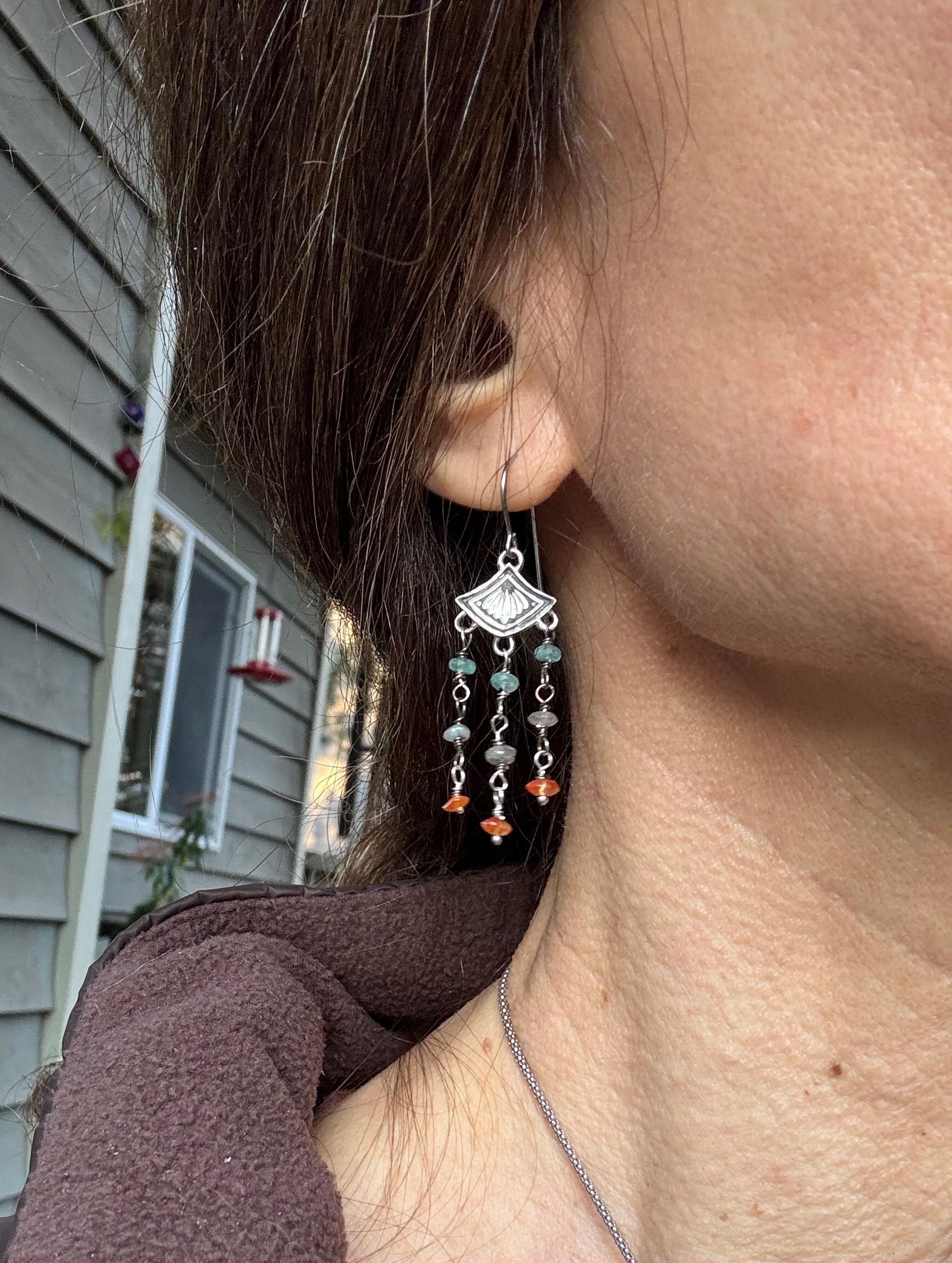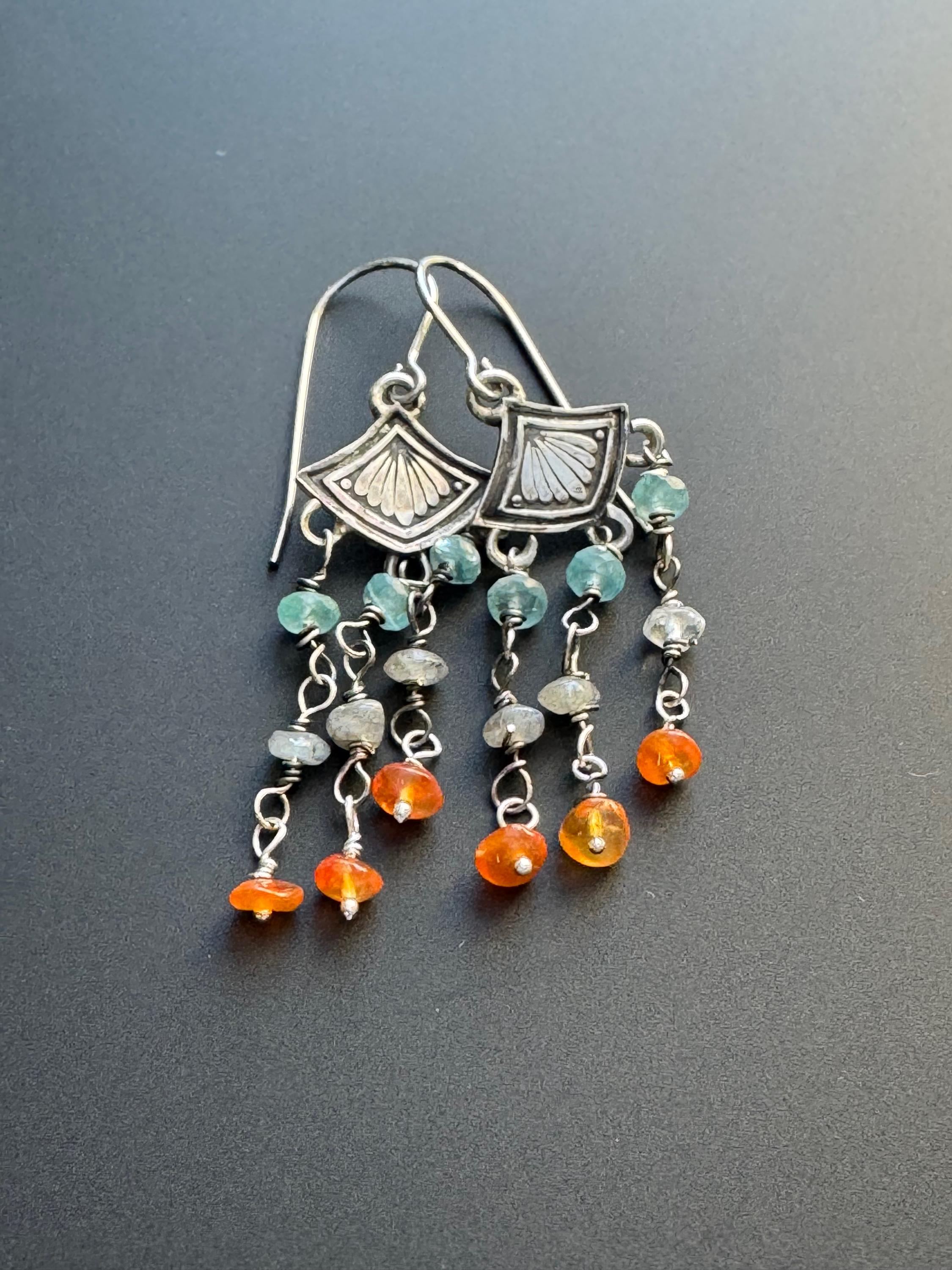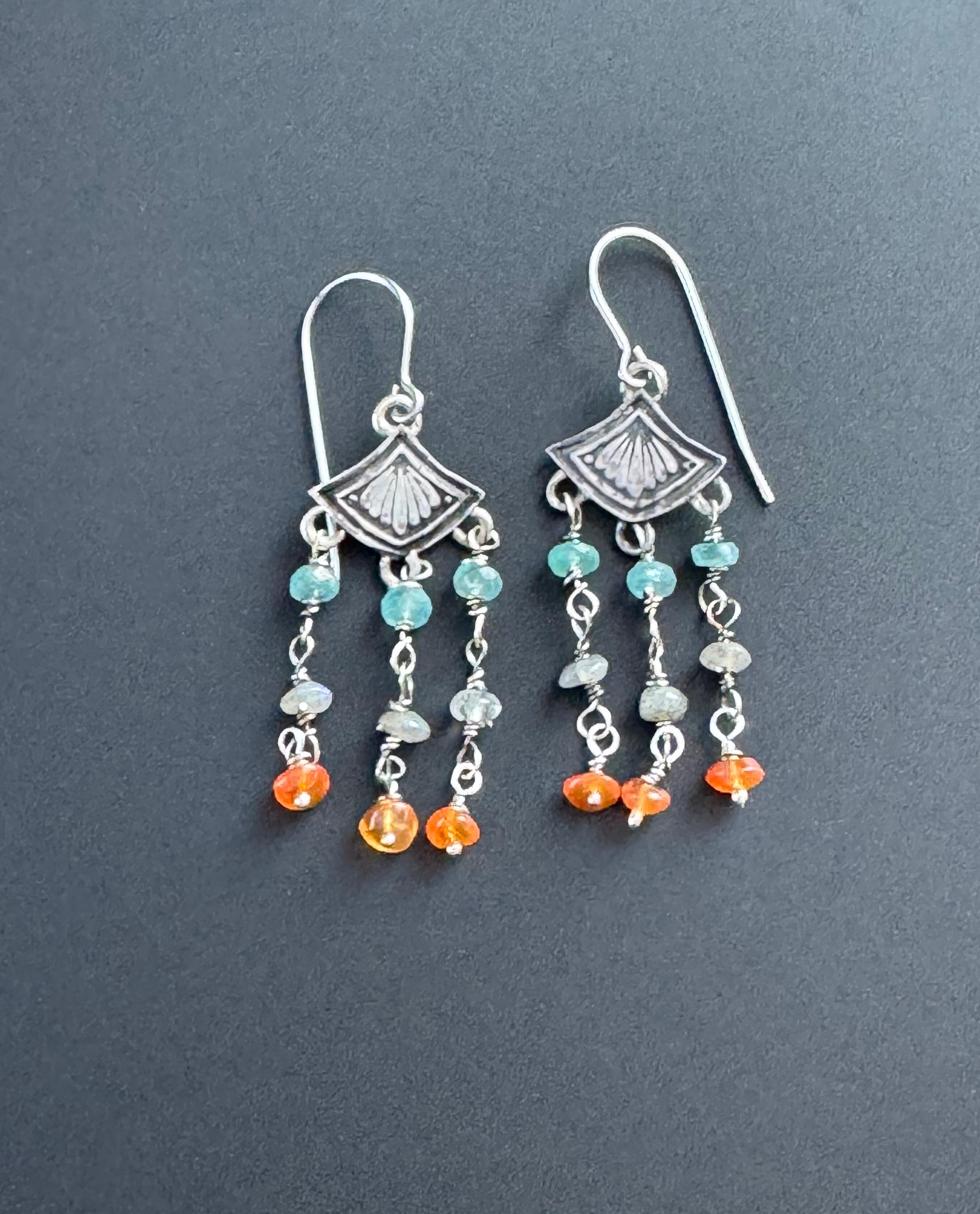 Made from sterling silver, these earrings are made from a cool art deco stamp at the top. Then I created colorful beaded dangles for them and hung 3 from each earring. The stones are blue apatite, labradorite and carnelian. They make a nice color combination and the earrings are very cute and lightweight. They move nicely and look great on. They can be worn with anything too! Handmade and one of a kind.