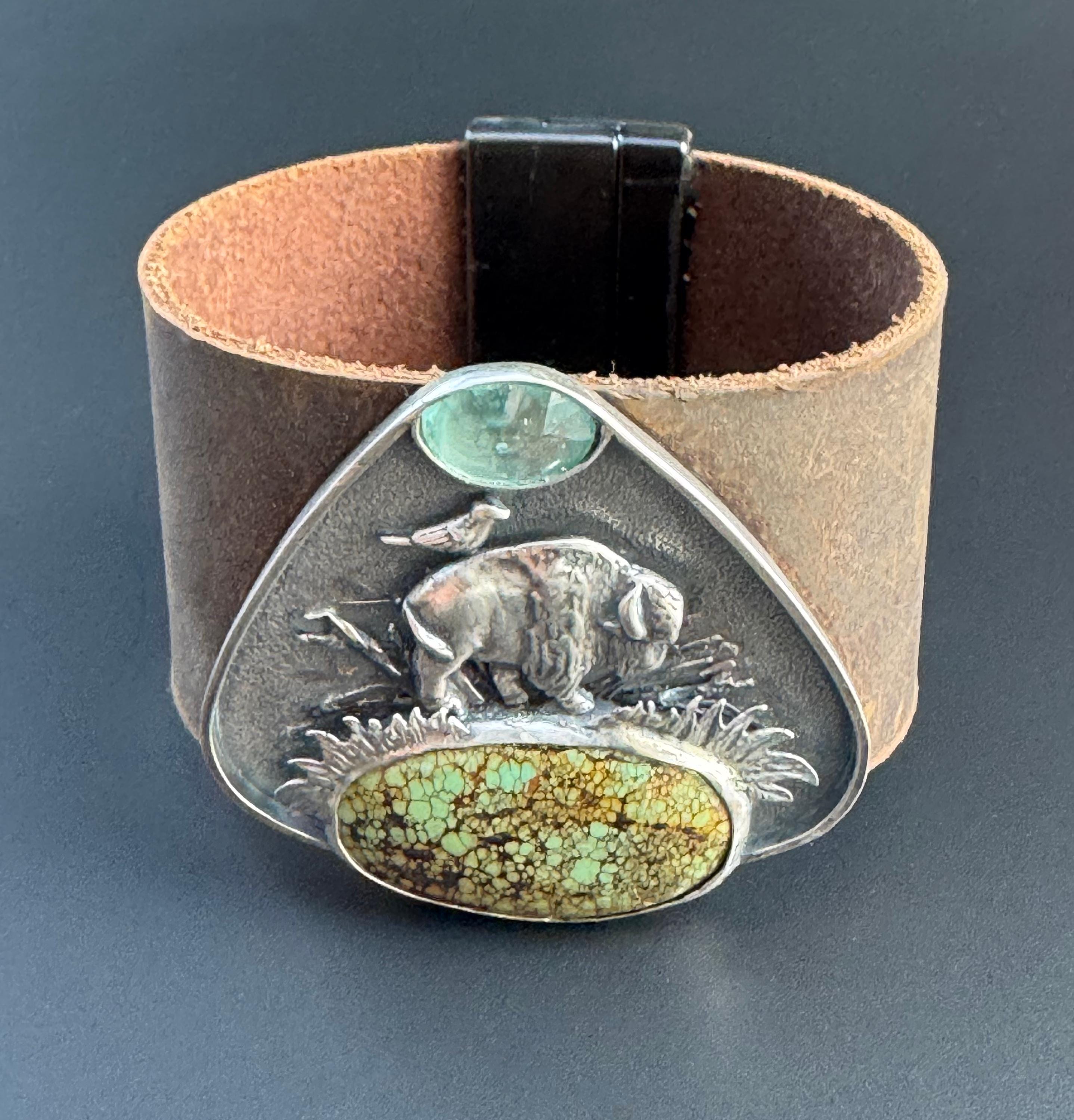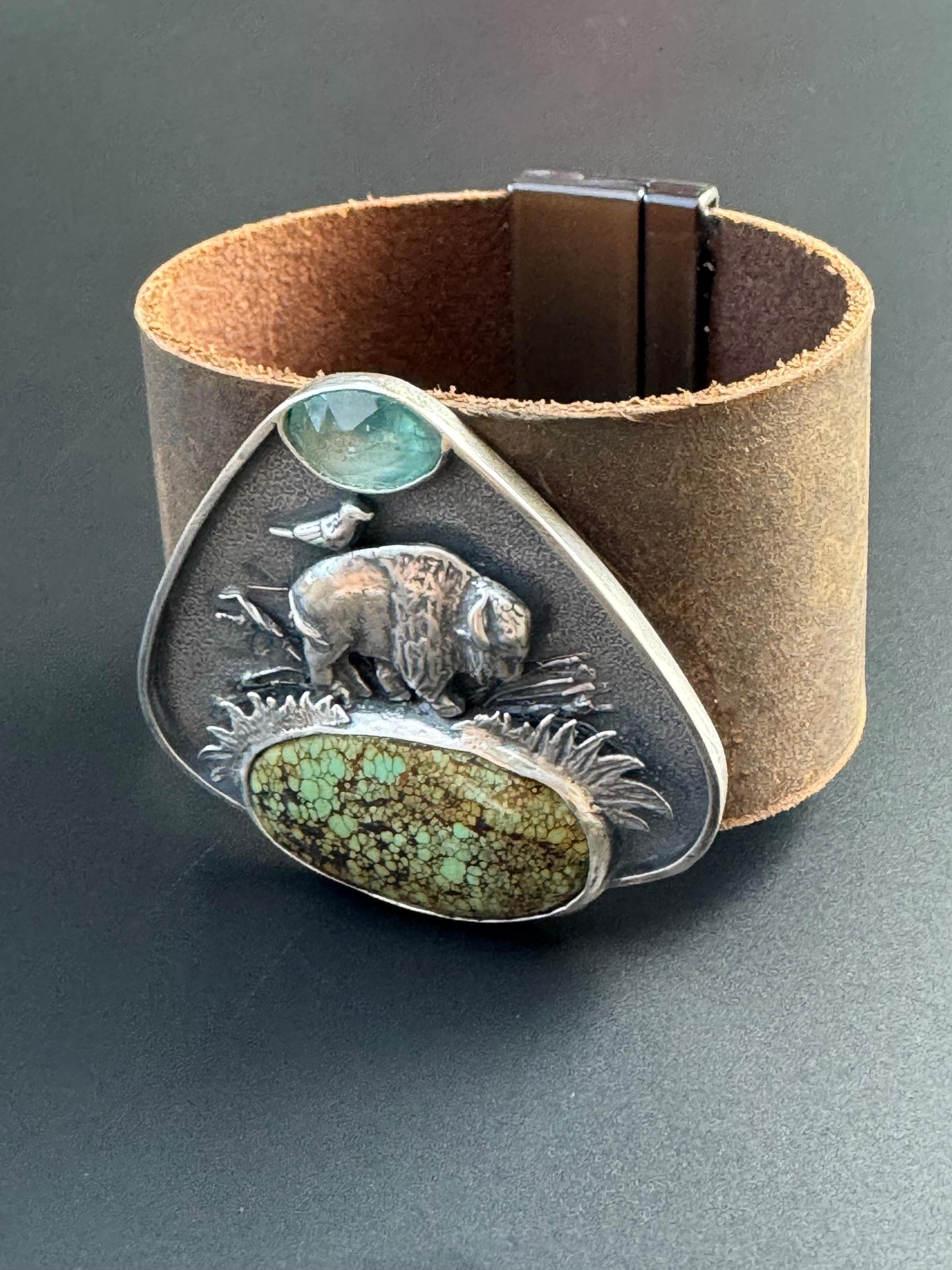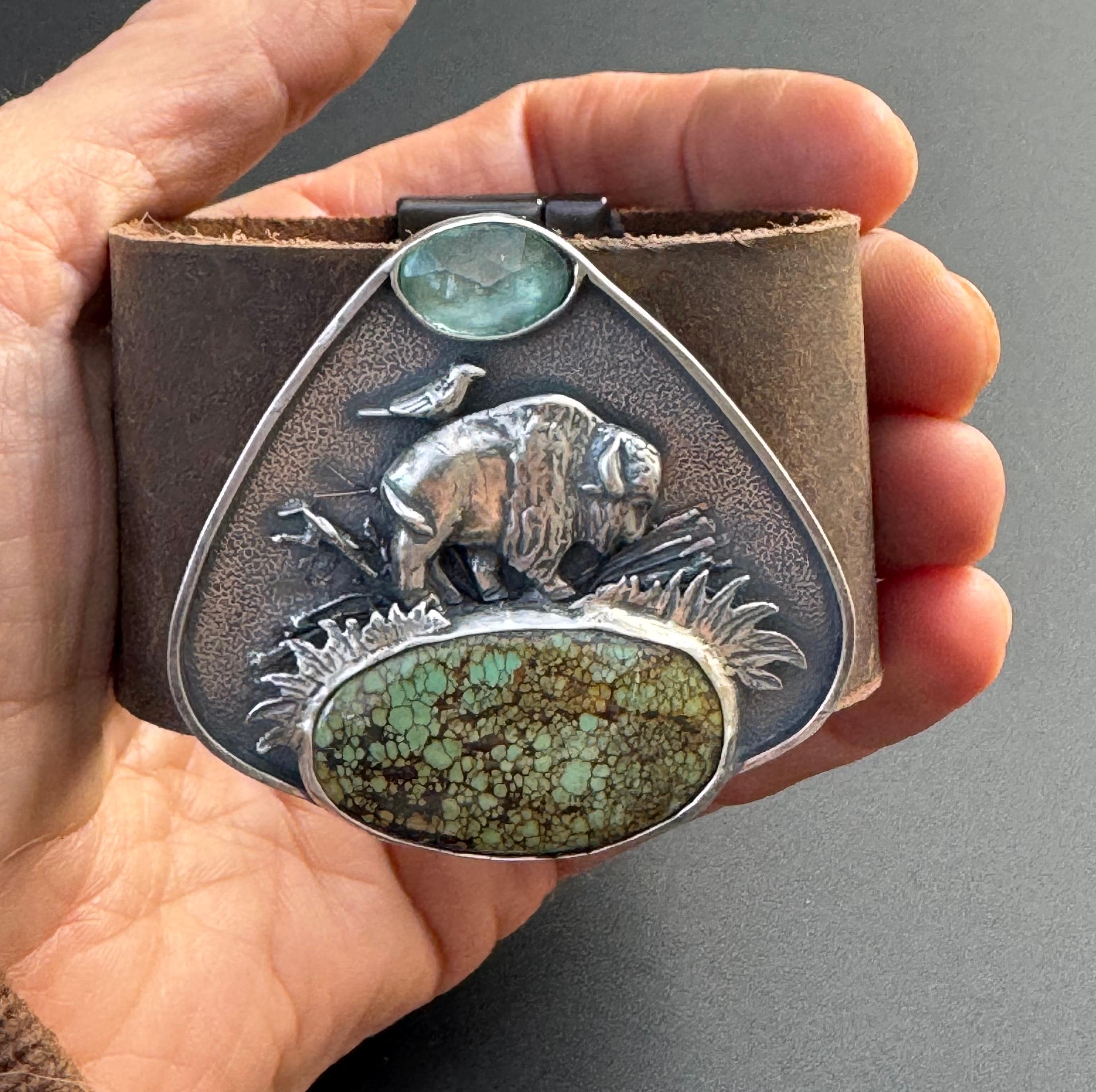 This leather cuff features a majestic buffalo roaming the plains. A friend - Bluebell is riding on her back. The piece is made from sterling silver and features a beautiful green piece of turquoise, acting as the ground beneath her. Above is a paraiba kyanite, being the sky. This piece has a really cool layered effect, the background has a texture that looks really beautiful, then some grasses, sticks behind the buffalo, then the grass in front of the buffalo, and then the stones. It makes for a very visually rich piece. The cuff has a very strong magnetic clasp that makes it easy to take on and off. It's comfortable too and this cuff is for those who love unique and special jewelry. It is completely handmade and is one of a kind.