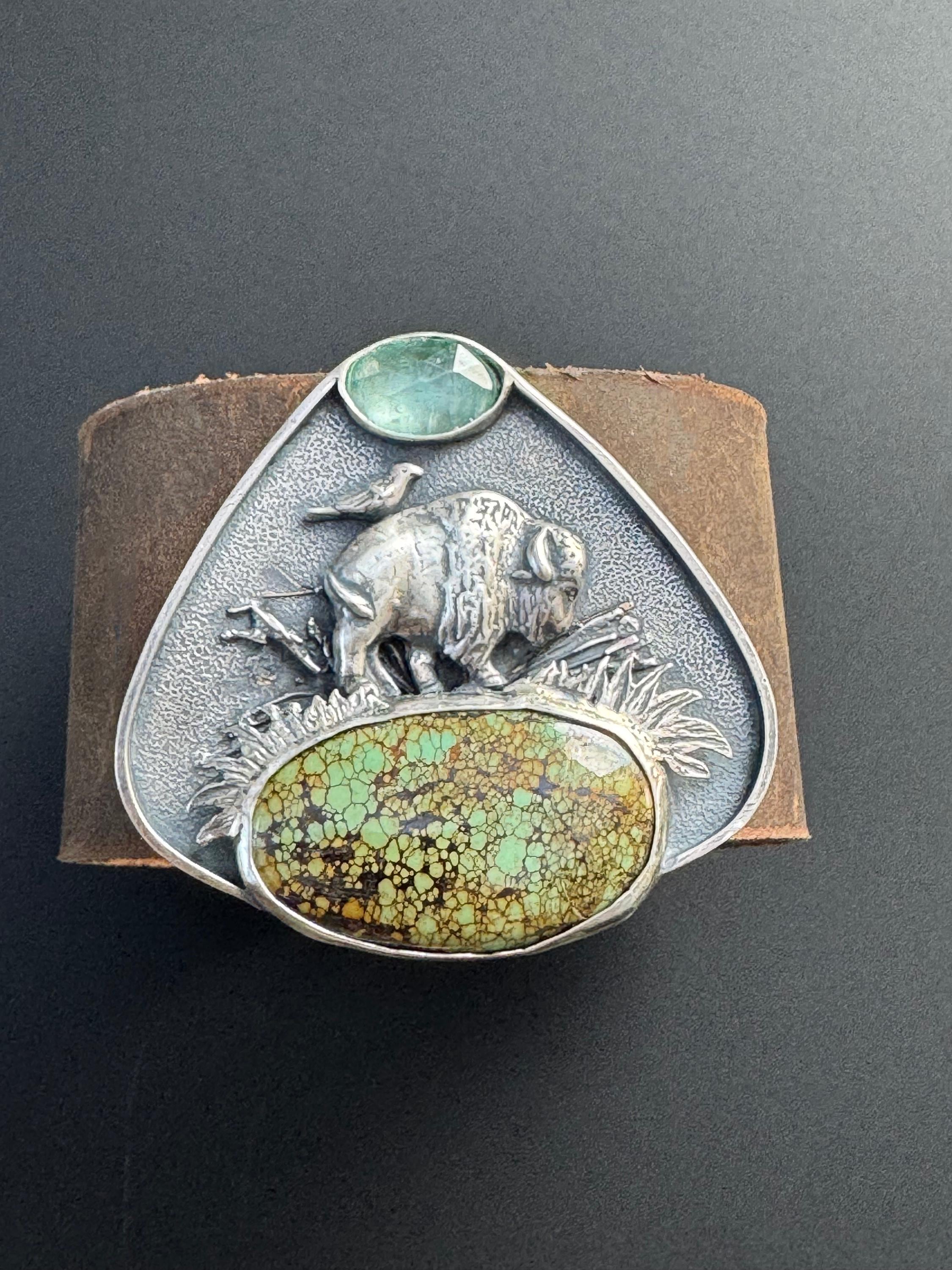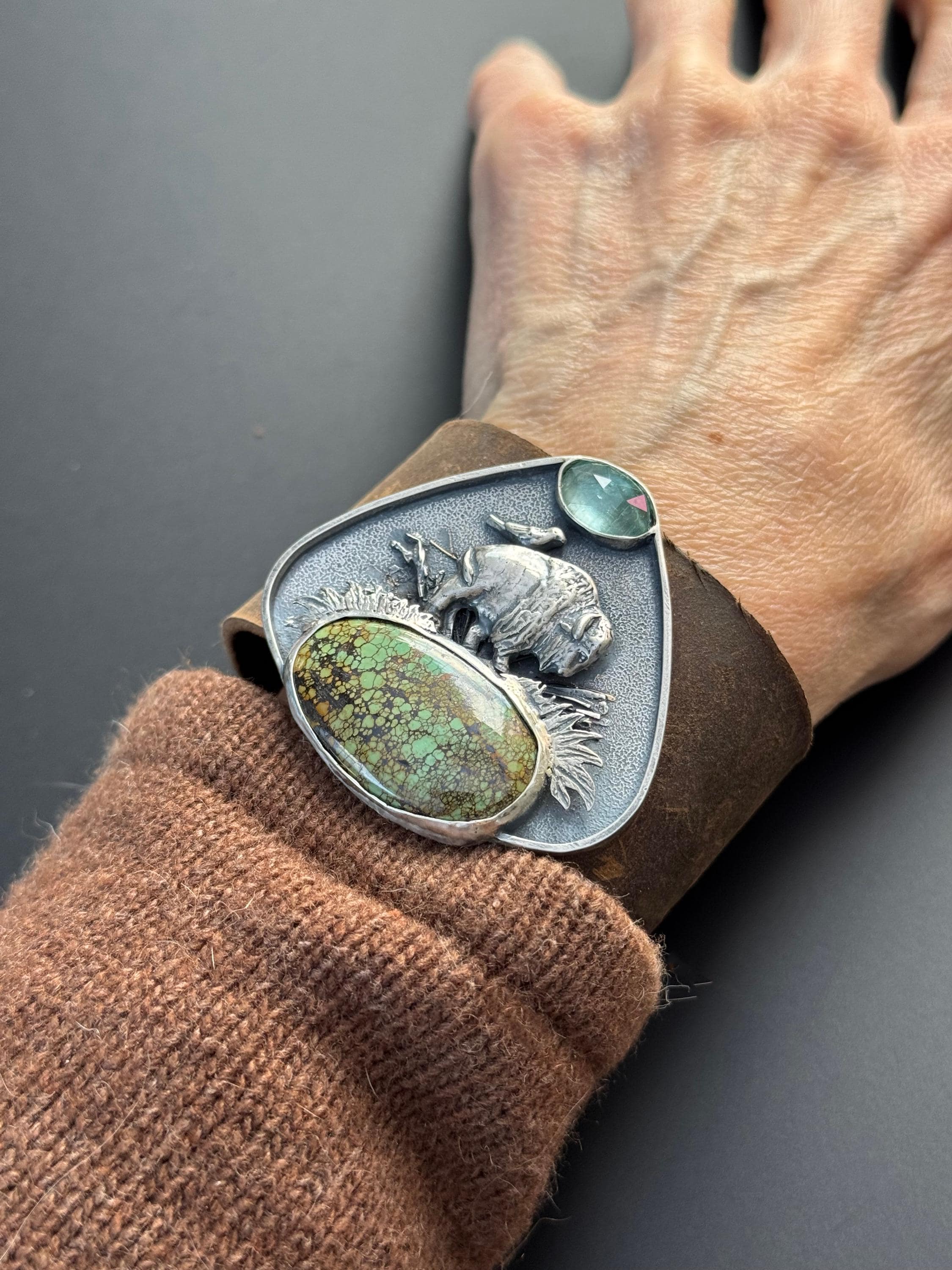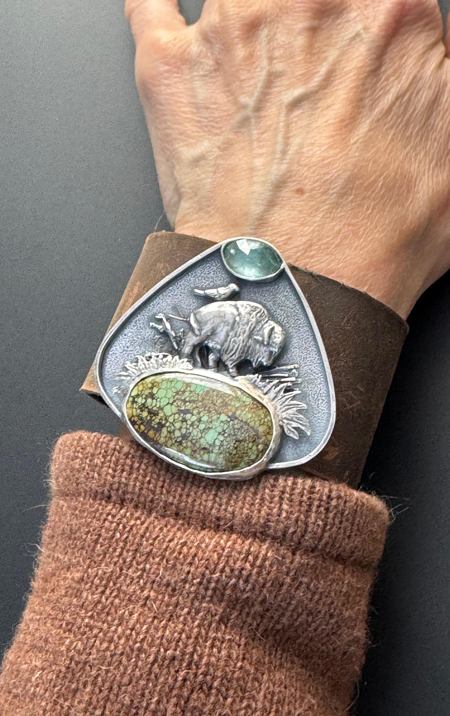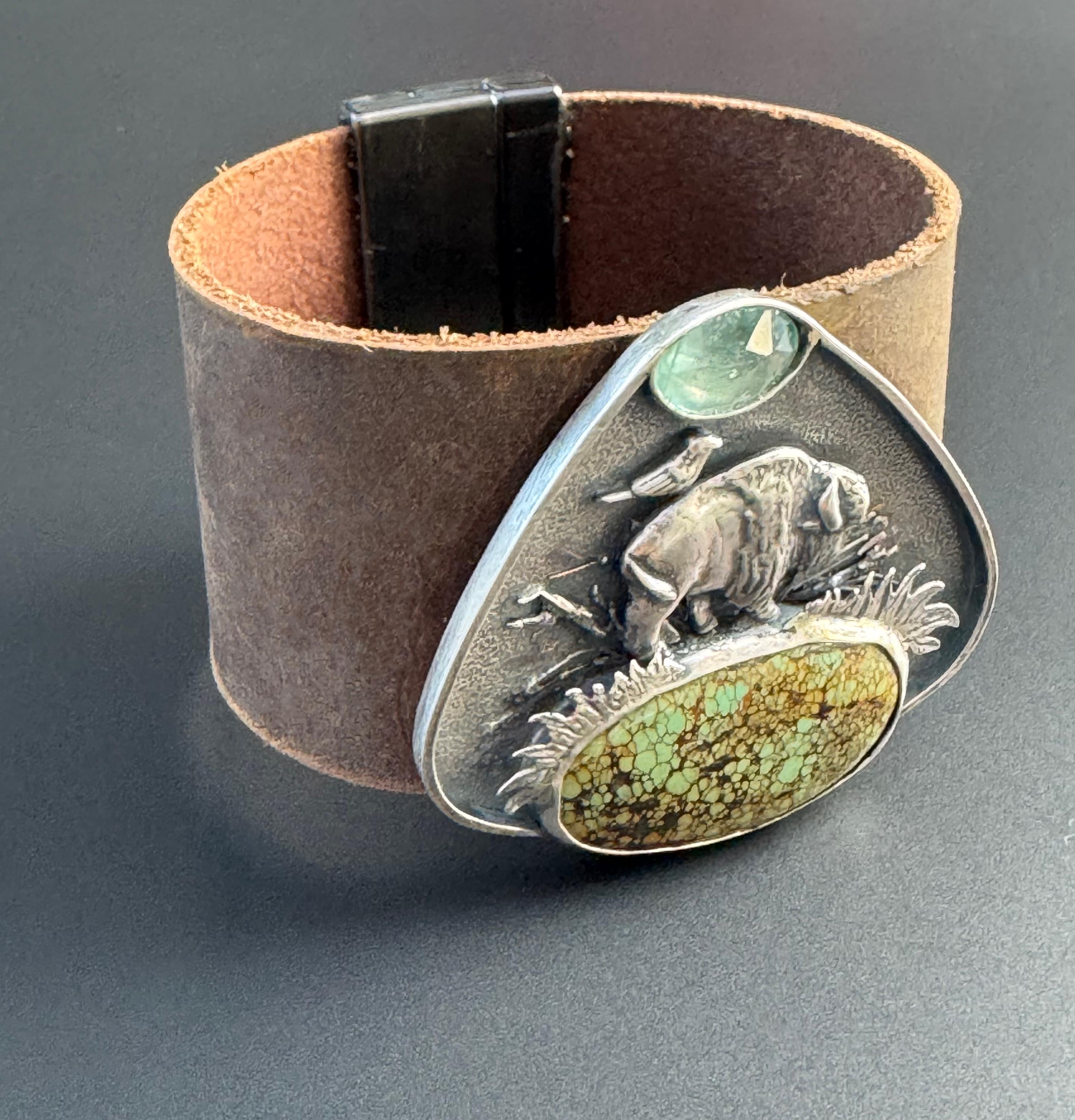 This leather cuff features a majestic buffalo roaming the plains. A friend - Bluebell is riding on her back. The piece is made from sterling silver and features a beautiful green piece of turquoise, acting as the ground beneath her. Above is a paraiba kyanite, being the sky. This piece has a really cool layered effect, the background has a texture that looks really beautiful, then some grasses, sticks behind the buffalo, then the grass in front of the buffalo, and then the stones. It makes for a very visually rich piece. The cuff has a very strong magnetic clasp that makes it easy to take on and off. It's comfortable too and this cuff is for those who love unique and special jewelry. It is completely handmade and is one of a kind.