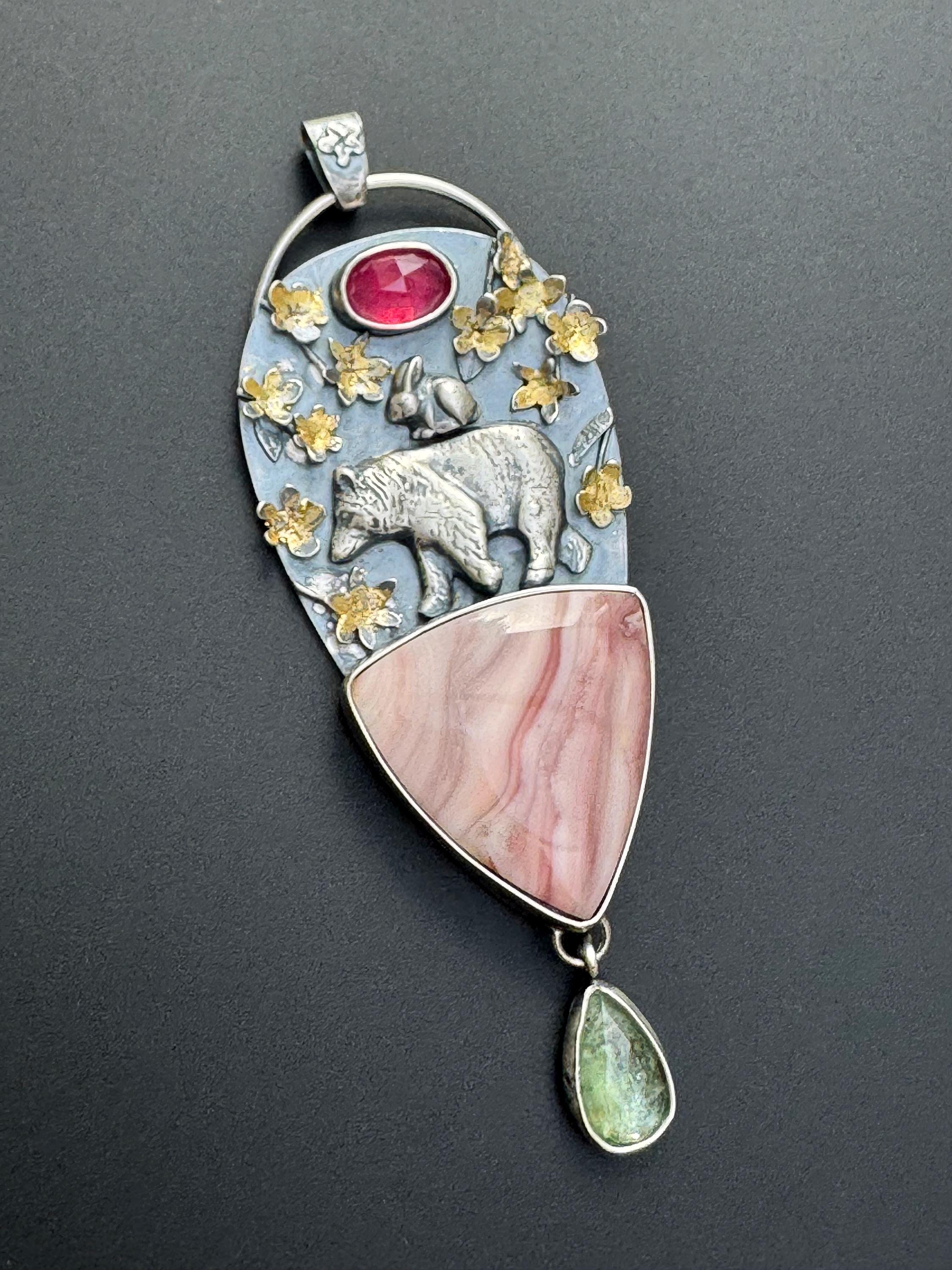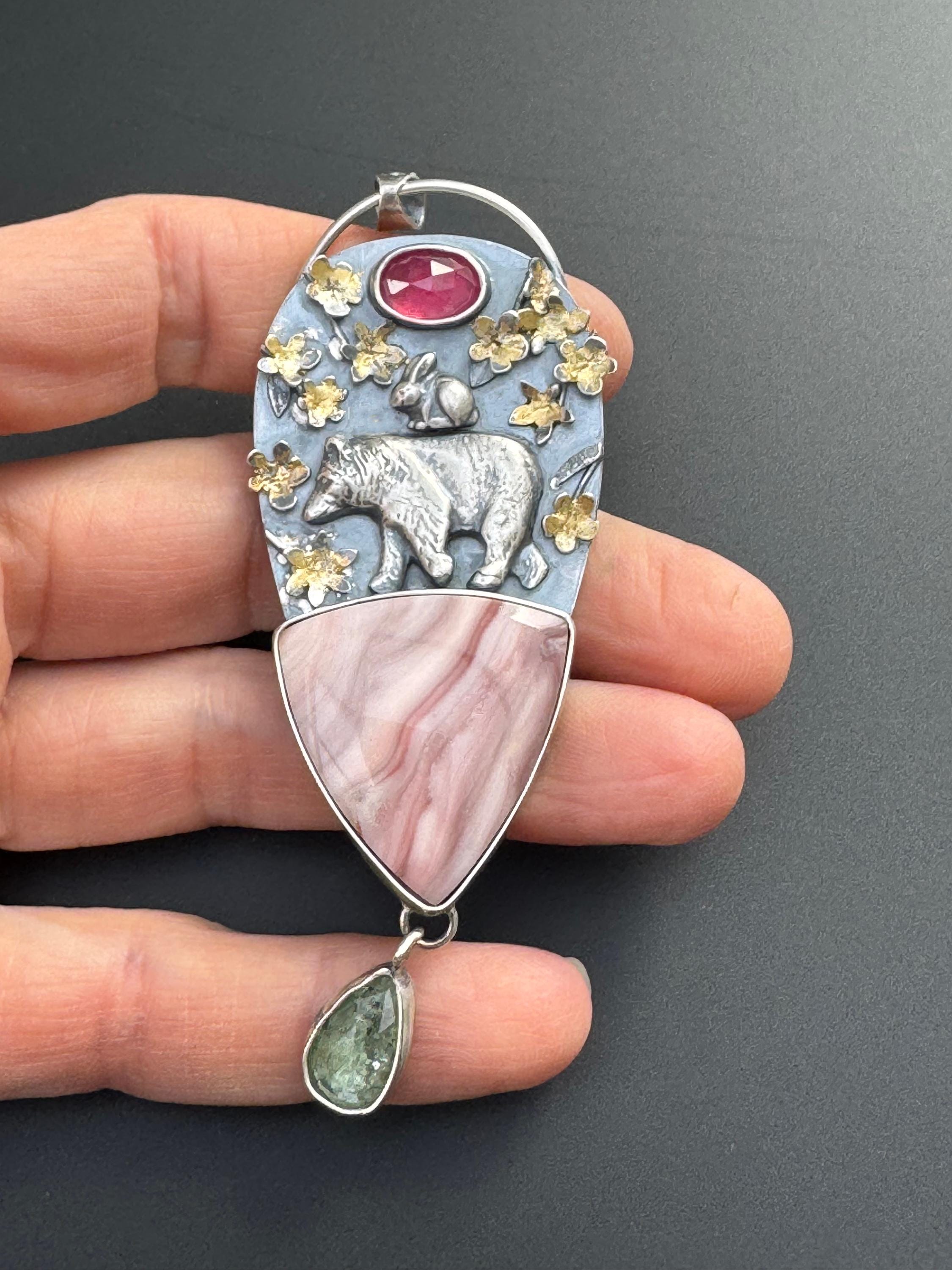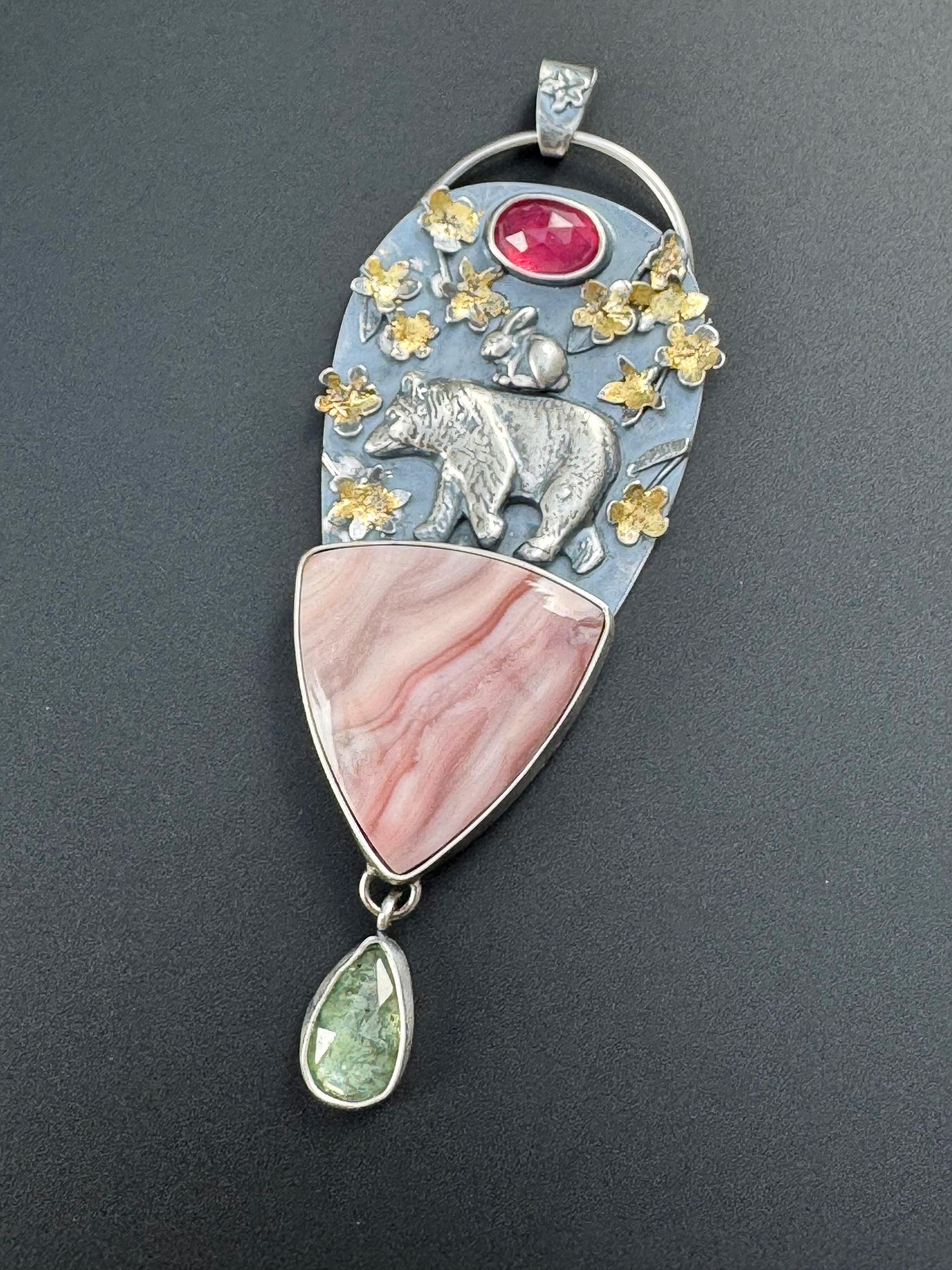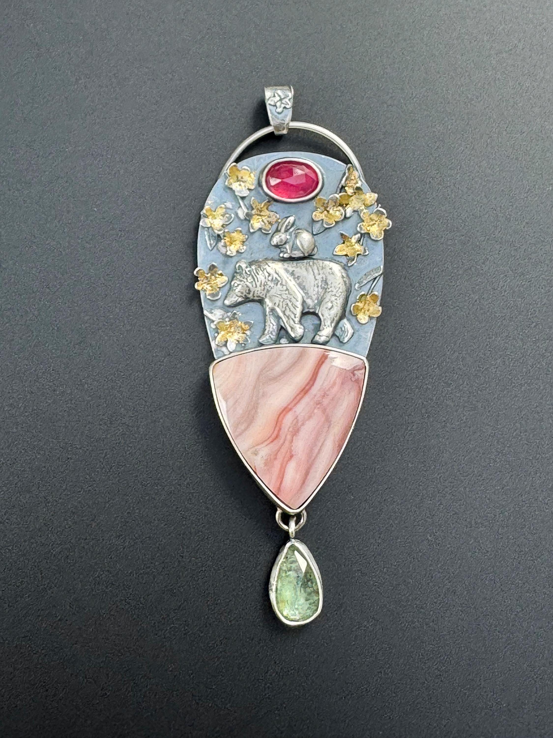 This pendant is made from sterling silver. The blossoms are handmade, each hand cut and textured, each cut out, shaped and soldered into place. Buttercup and the bear are solid silver and are walking a top a beautiful Windy mountain agate! Above them is a beautiful pink sapphire to echo the colors in the blossoms and the agate stone. Below hangs a green kyanite to round out the spring colors. The blossoms have also had 24k gold leaf applied to them with an ancient technique that bonds the gold to the silver. This whimsical and playful piece is handmade and one of a kind. It would make a wonderful gift and heirloom to hand down.
