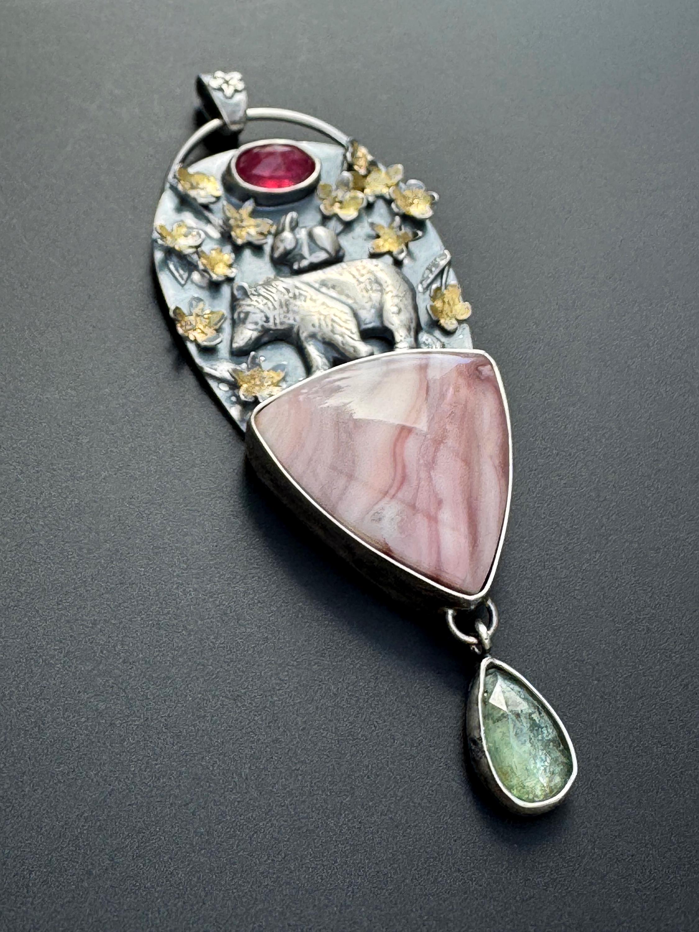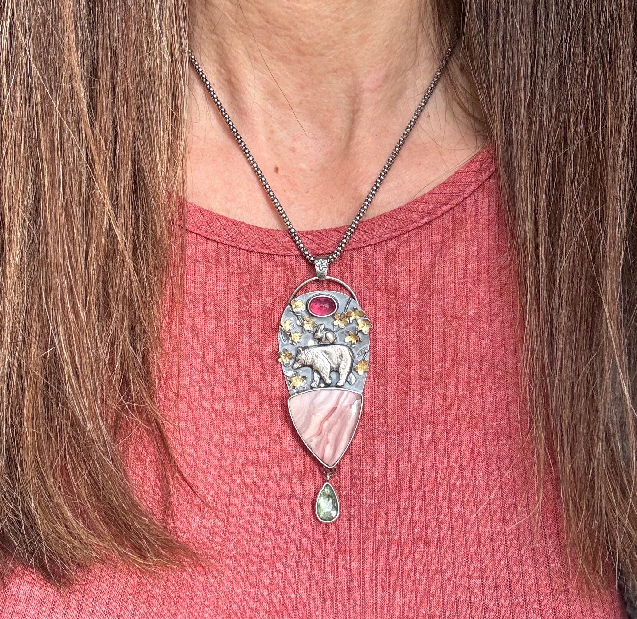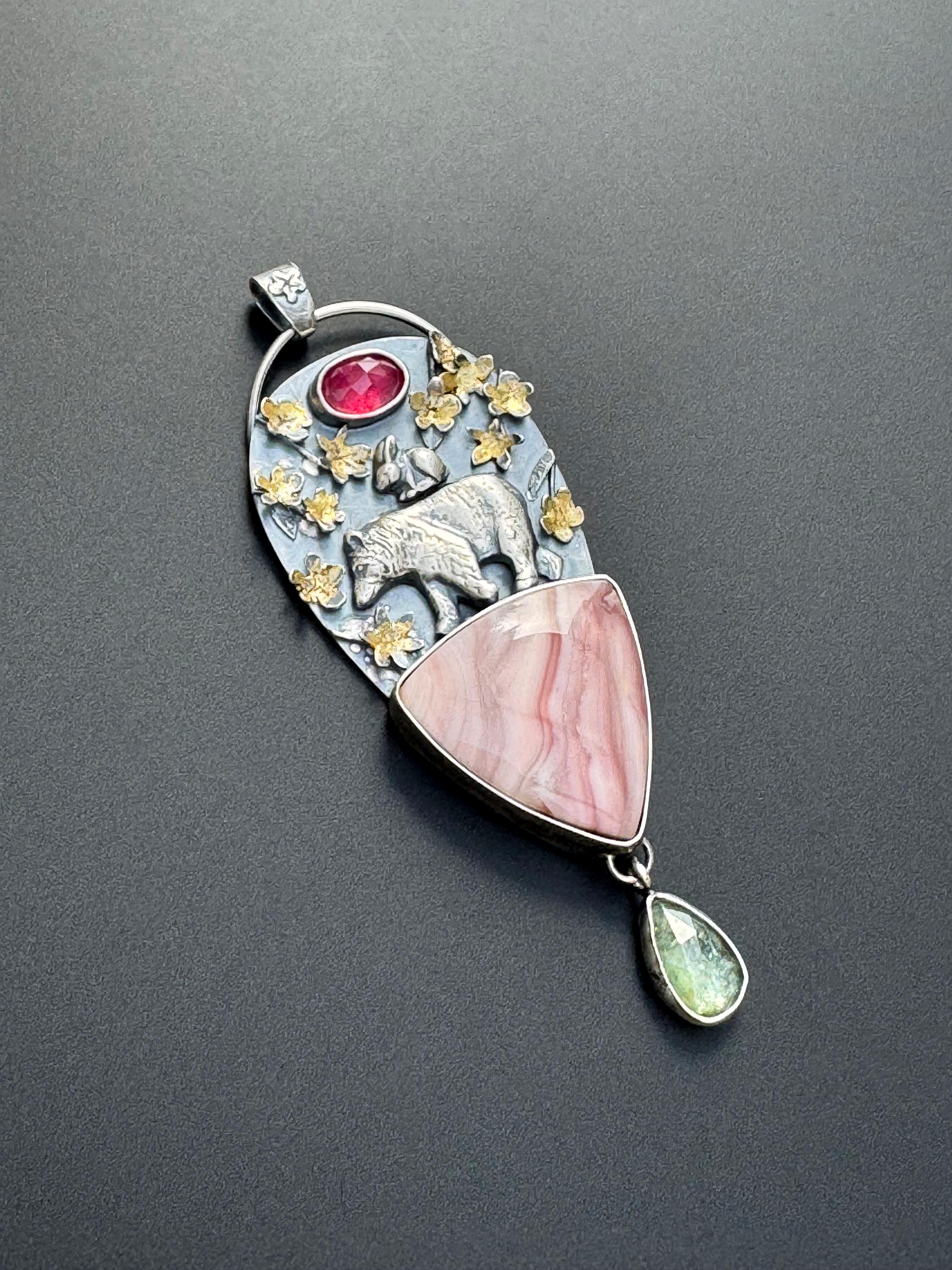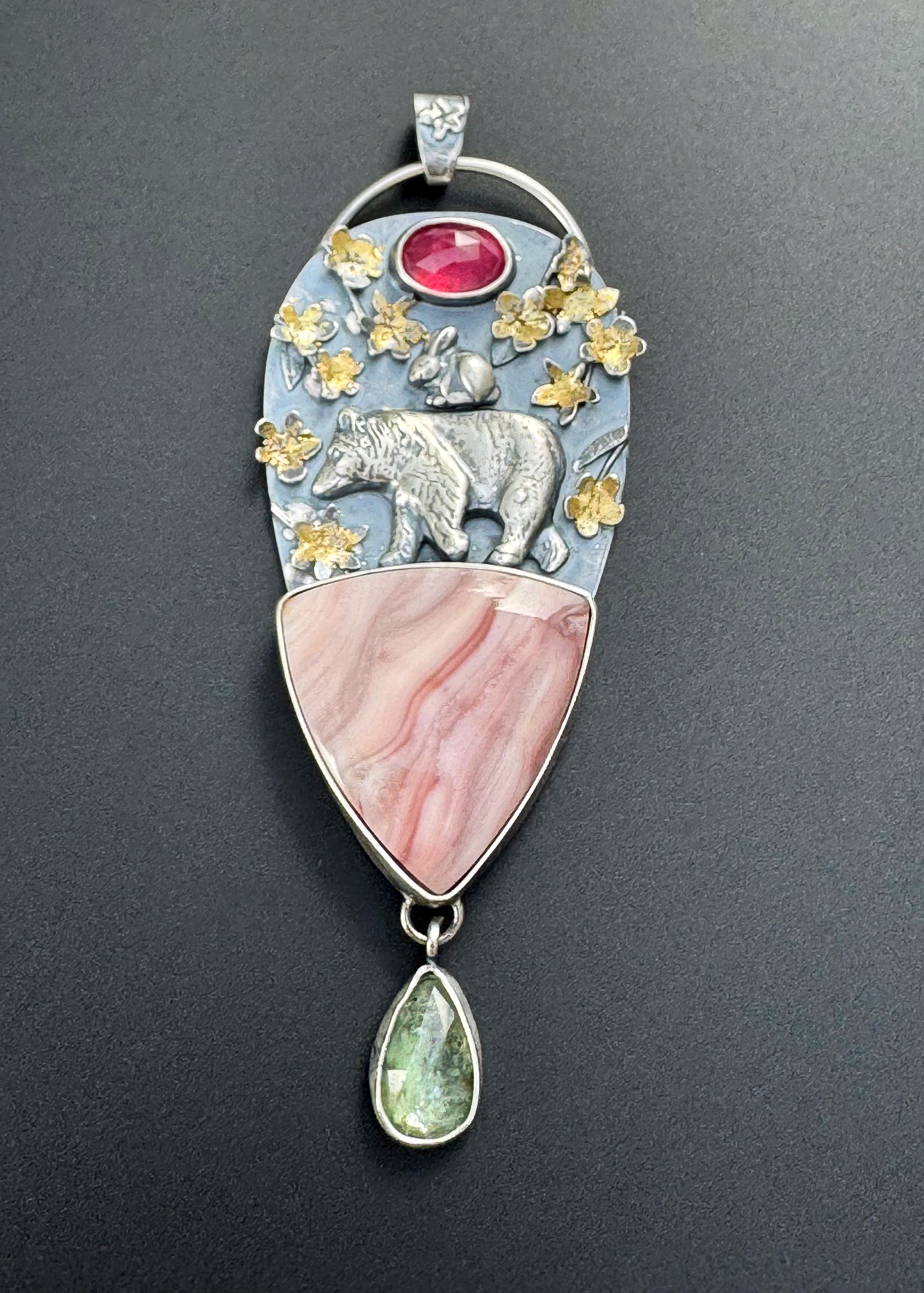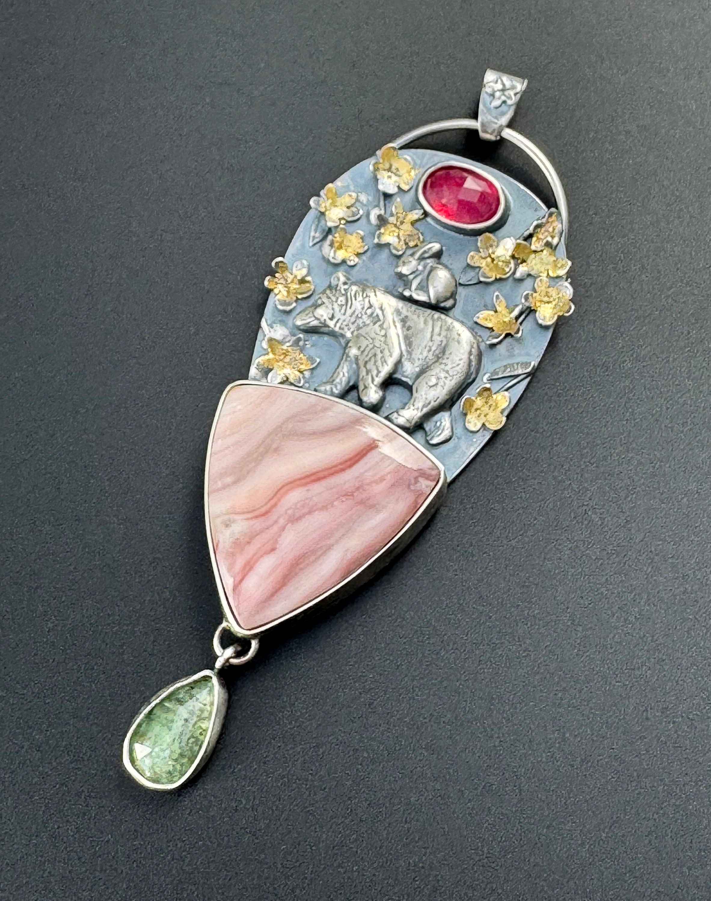 This pendant is made from sterling silver. The blossoms are handmade, each hand cut and textured, each cut out, shaped and soldered into place. Buttercup and the bear are solid silver and are walking a top a beautiful Windy mountain agate! Above them is a beautiful pink sapphire to echo the colors in the blossoms and the agate stone. Below hangs a green kyanite to round out the spring colors. The blossoms have also had 24k gold leaf applied to them with an ancient technique that bonds the gold to the silver. This whimsical and playful piece is handmade and one of a kind. It would make a wonderful gift and heirloom to hand down.