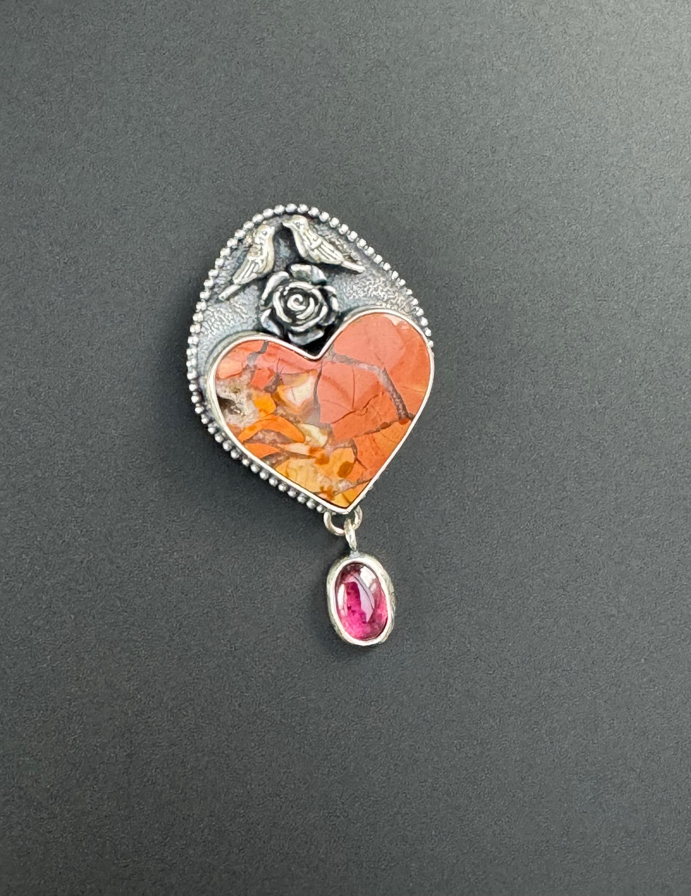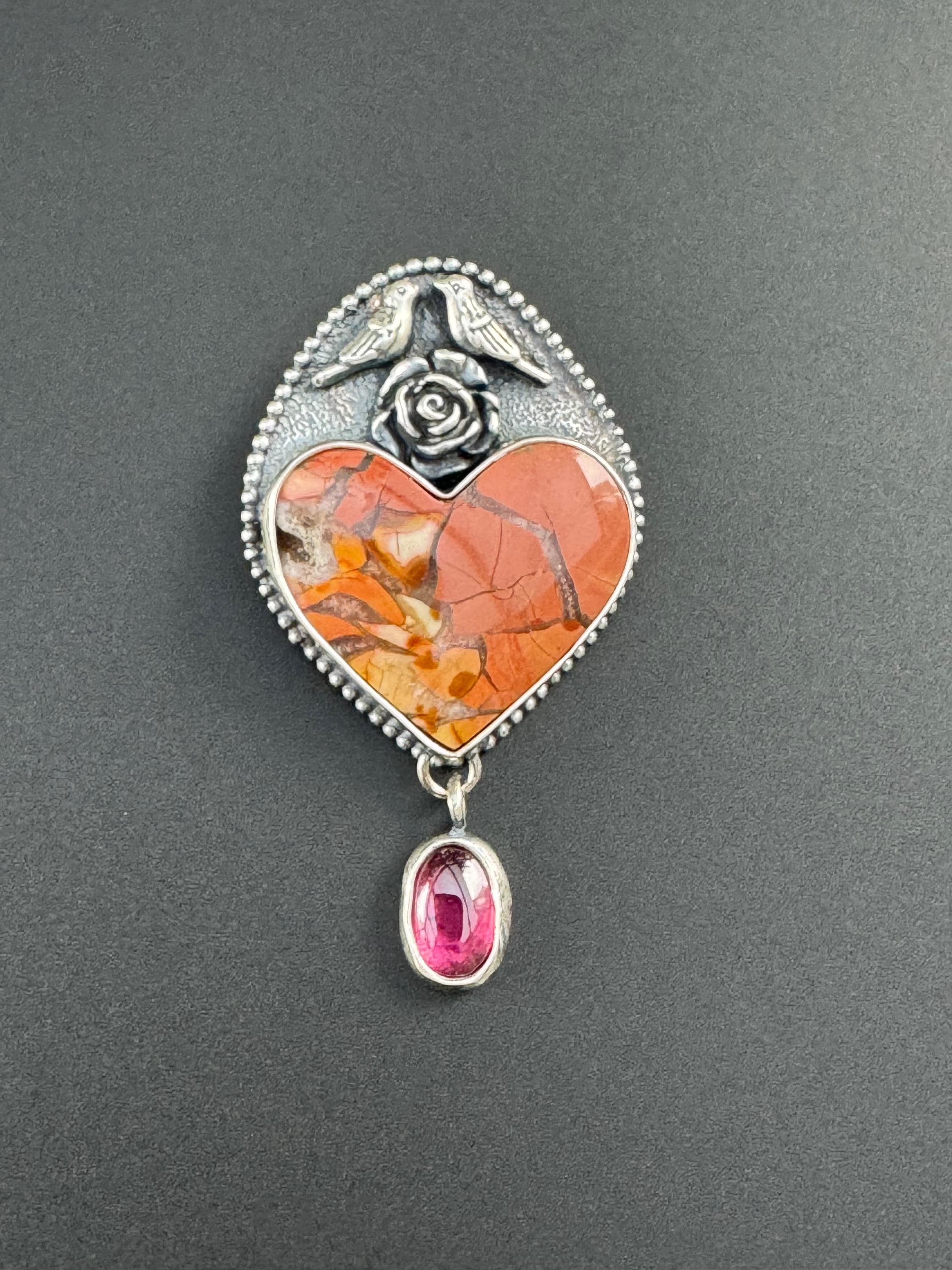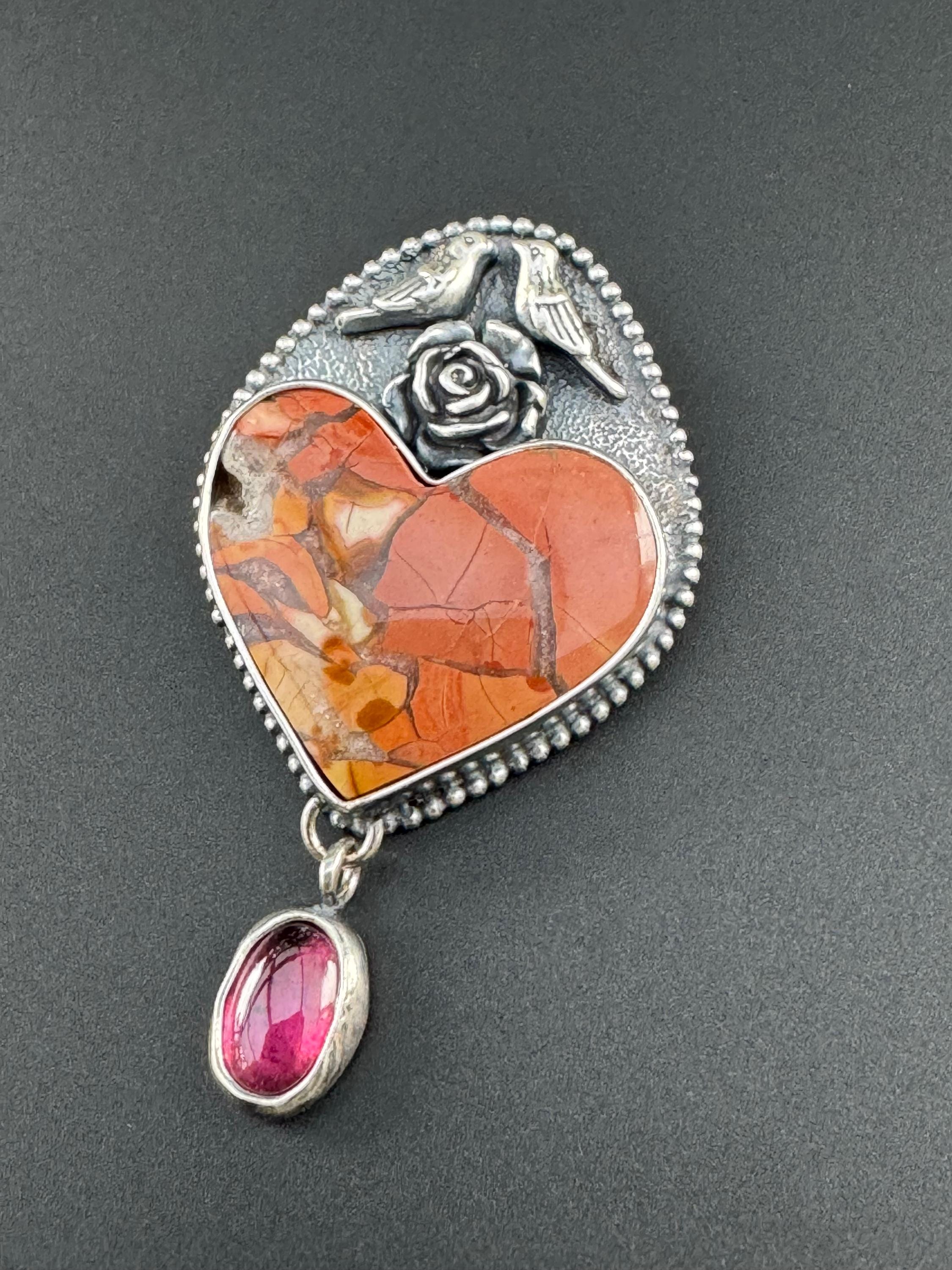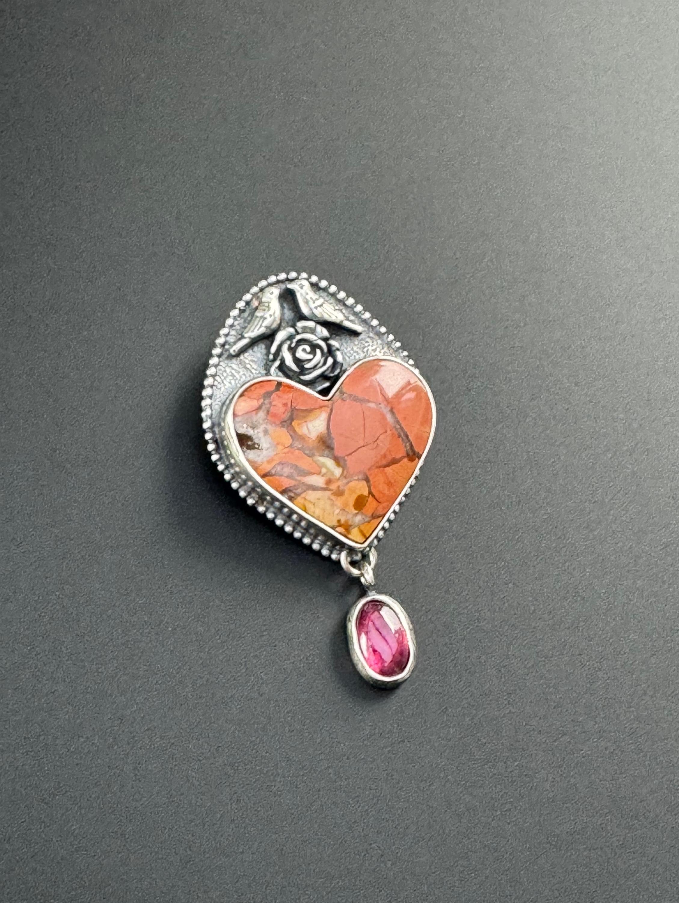 This unique heart stone is called brecciated jasper. It is so pretty! I paired it with a rhodolite garnet because I love that color combination. The bird couple sitting a top of this heart are also a reminder of spring and of the couple nesting on my back porch. They are sitting a top of a flower. It's a whimsical and lovely piece in honor of the start of spring. The background was given a texture to provide depth. Then it has beaded wire around it, giving it a sort of framing and more texture and visual interest. It would be a great gift for anyone who loves animals and spring :) This is completely handmade and a one of a kind piece.