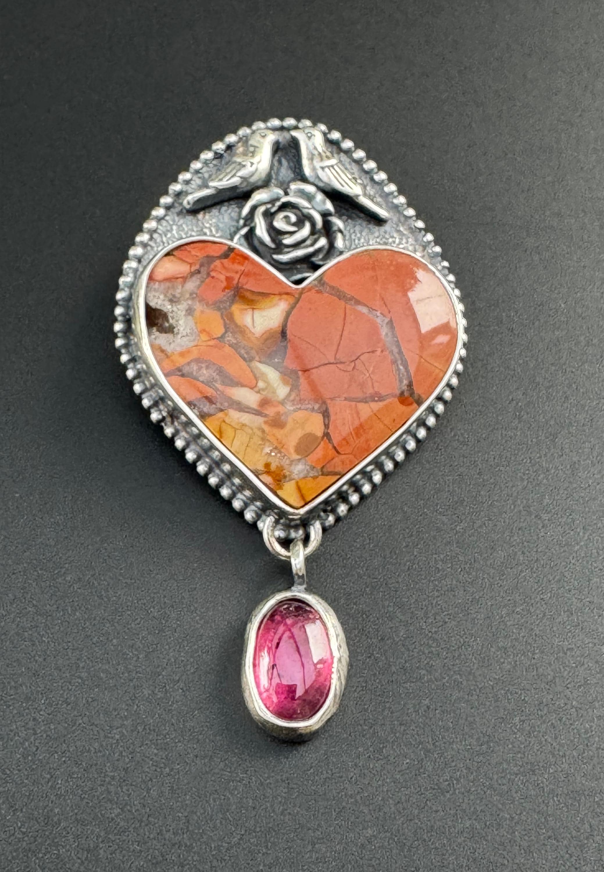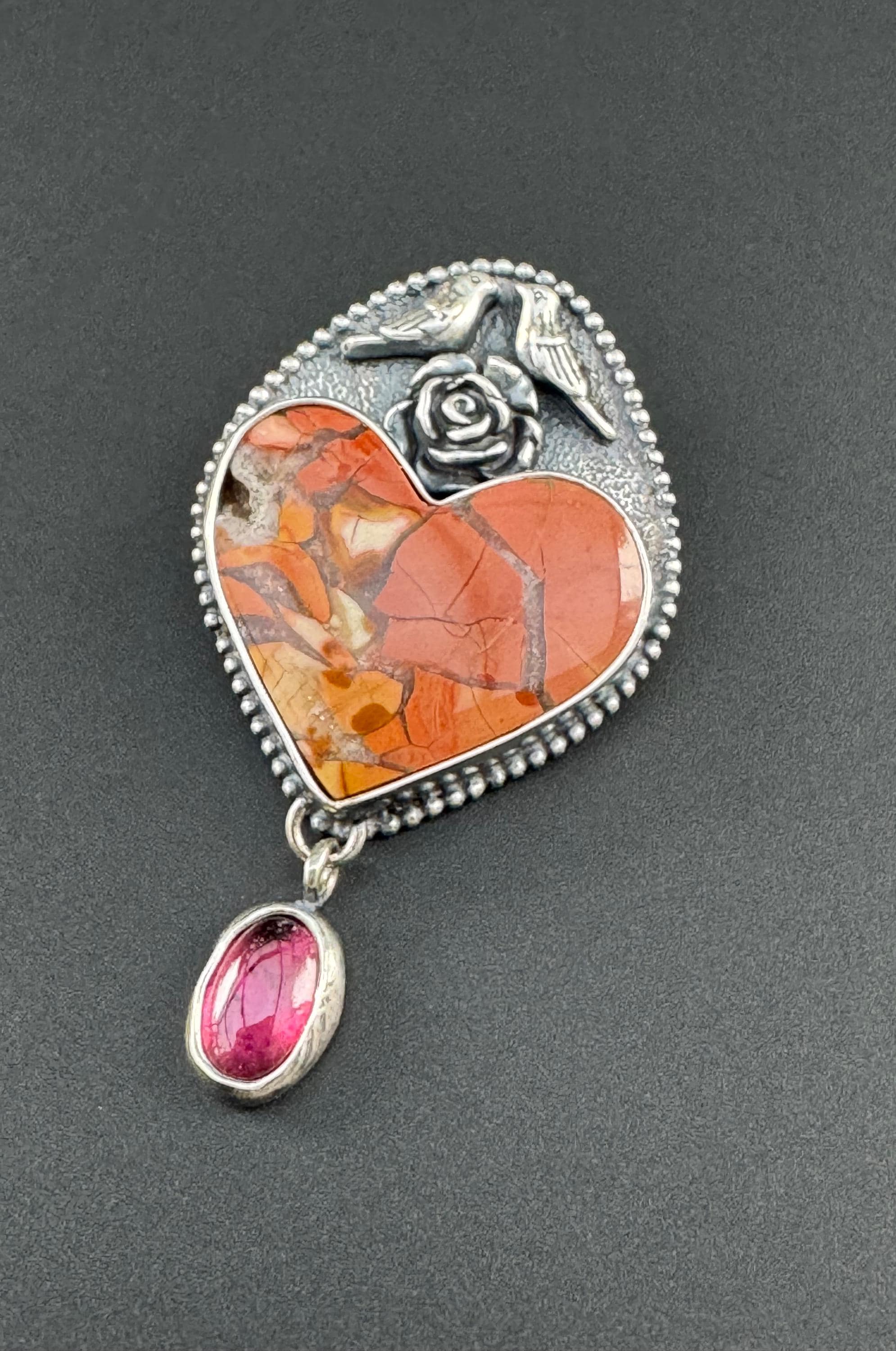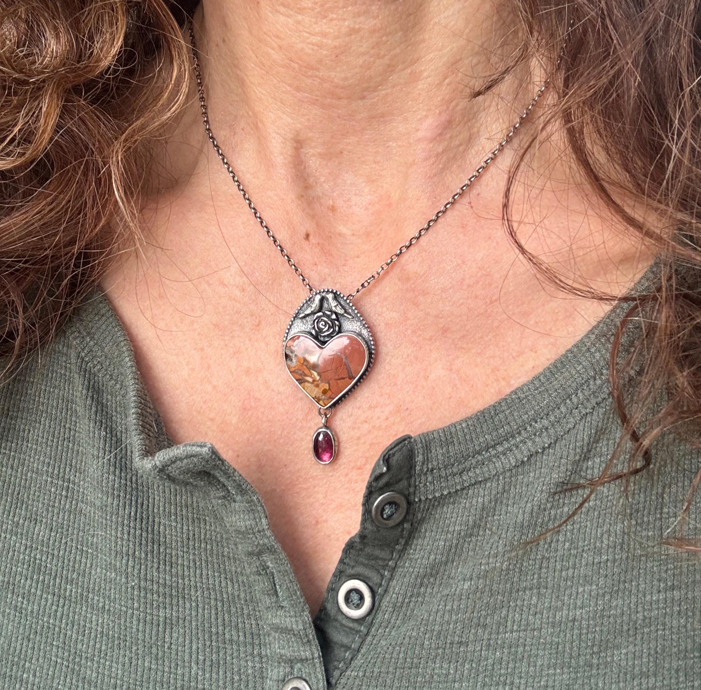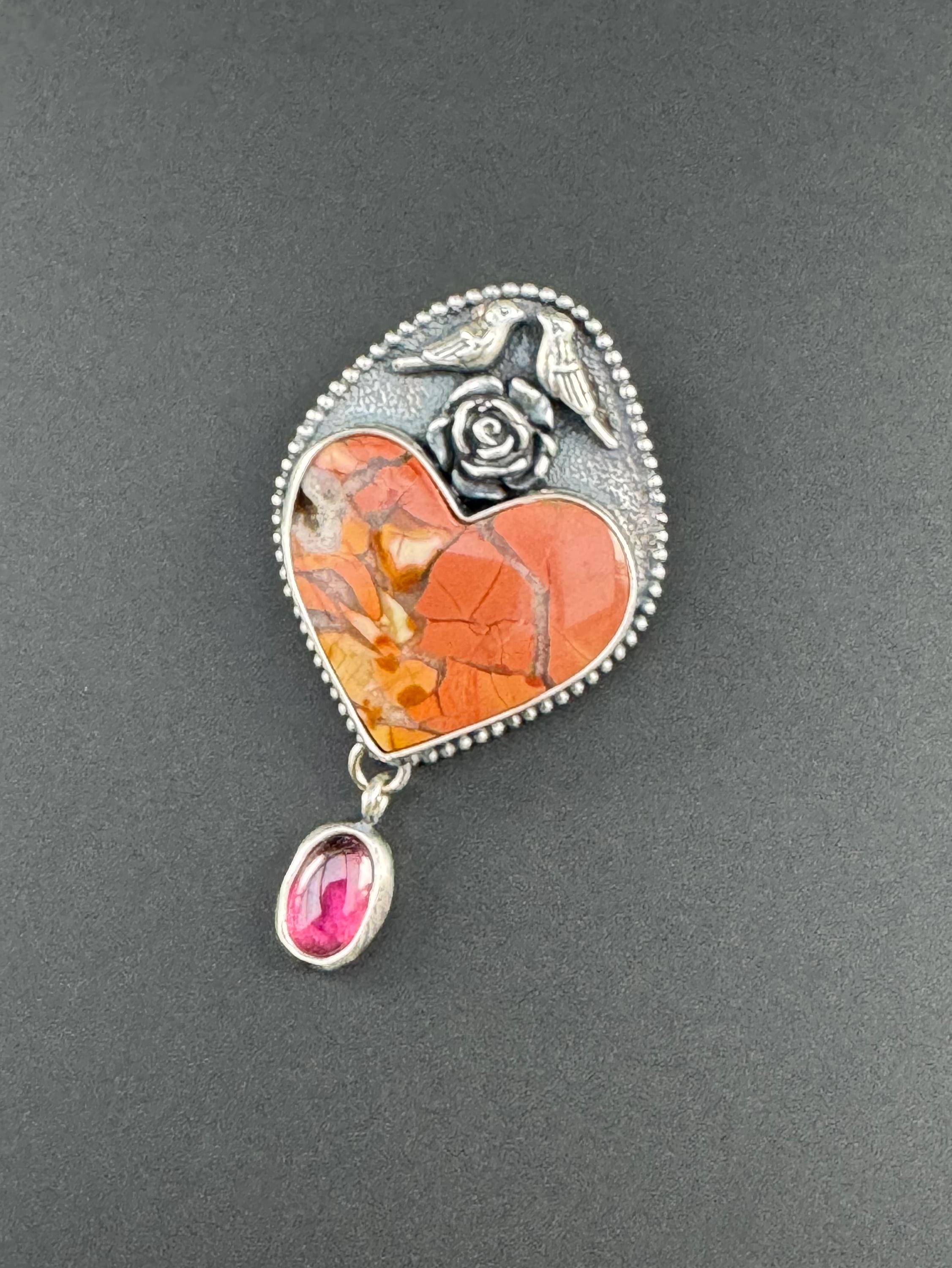 This unique heart stone is called brecciated jasper. It is so pretty! I paired it with a rhodolite garnet because I love that color combination. The bird couple sitting a top of this heart are also a reminder of spring and of the couple nesting on my back porch. They are sitting a top of a flower. It's a whimsical and lovely piece in honor of the start of spring. The background was given a texture to provide depth. Then it has beaded wire around it, giving it a sort of framing and more texture and visual interest. It would be a great gift for anyone who loves animals and spring :) This is completely handmade and a one of a kind piece.