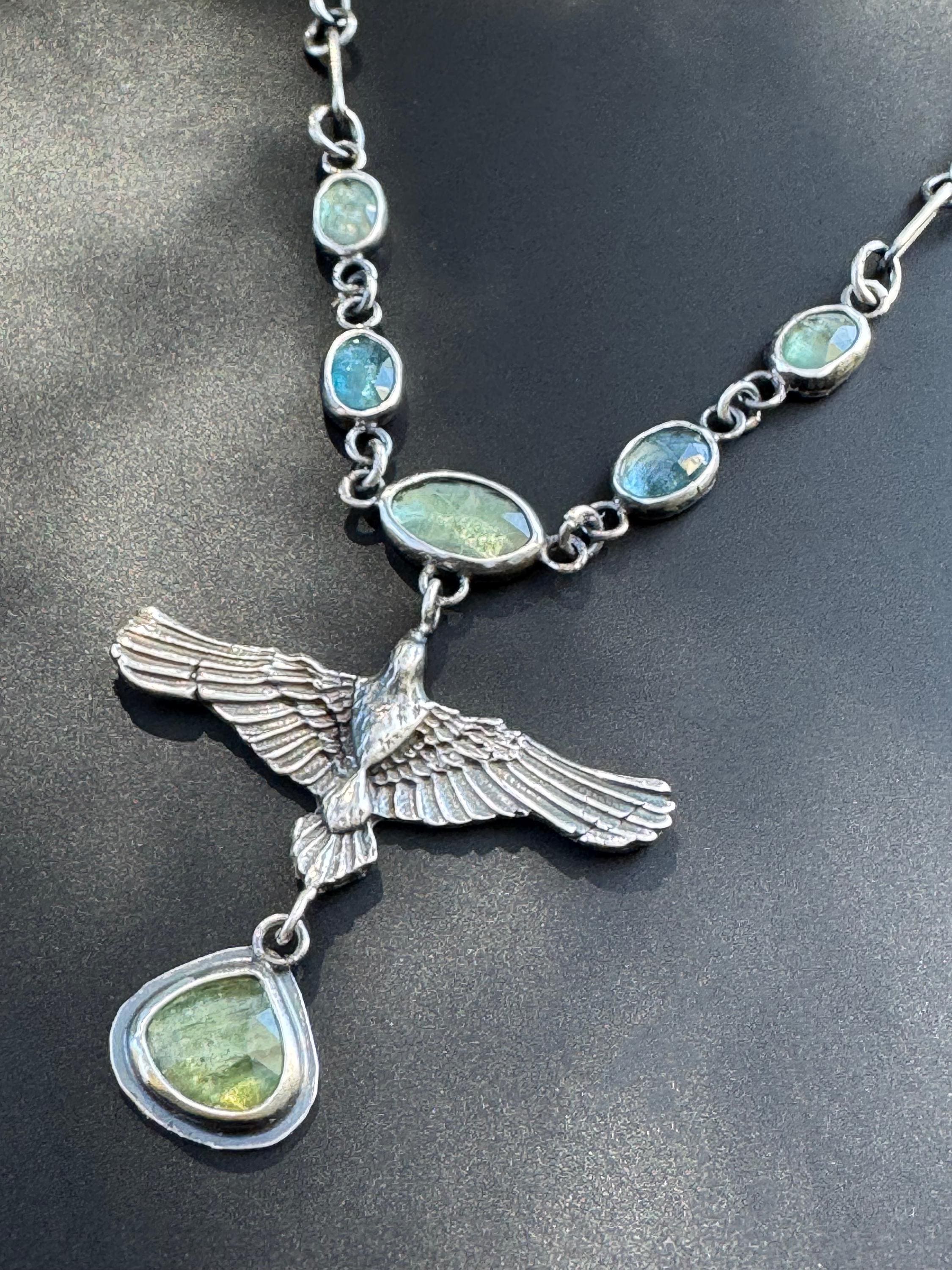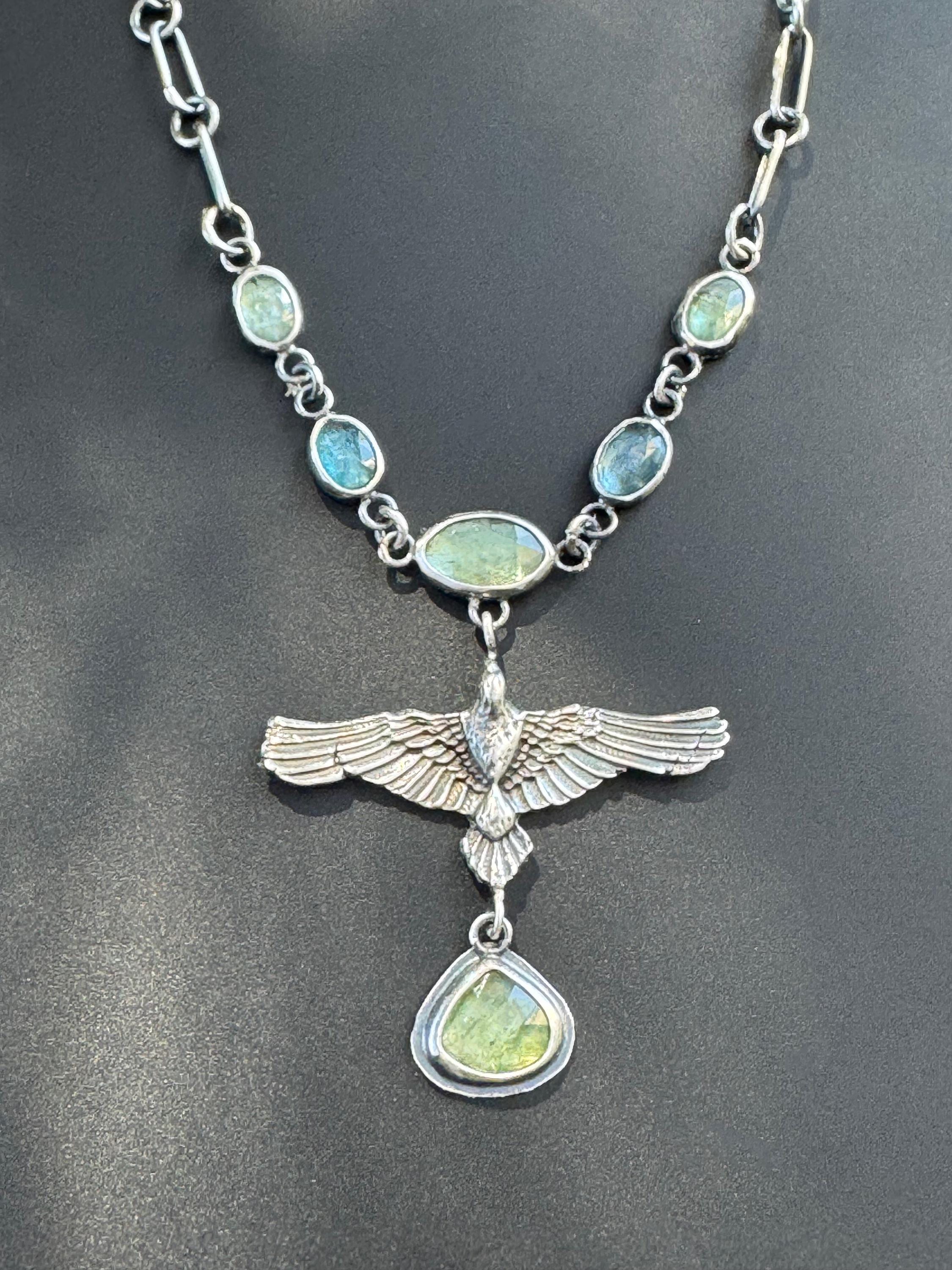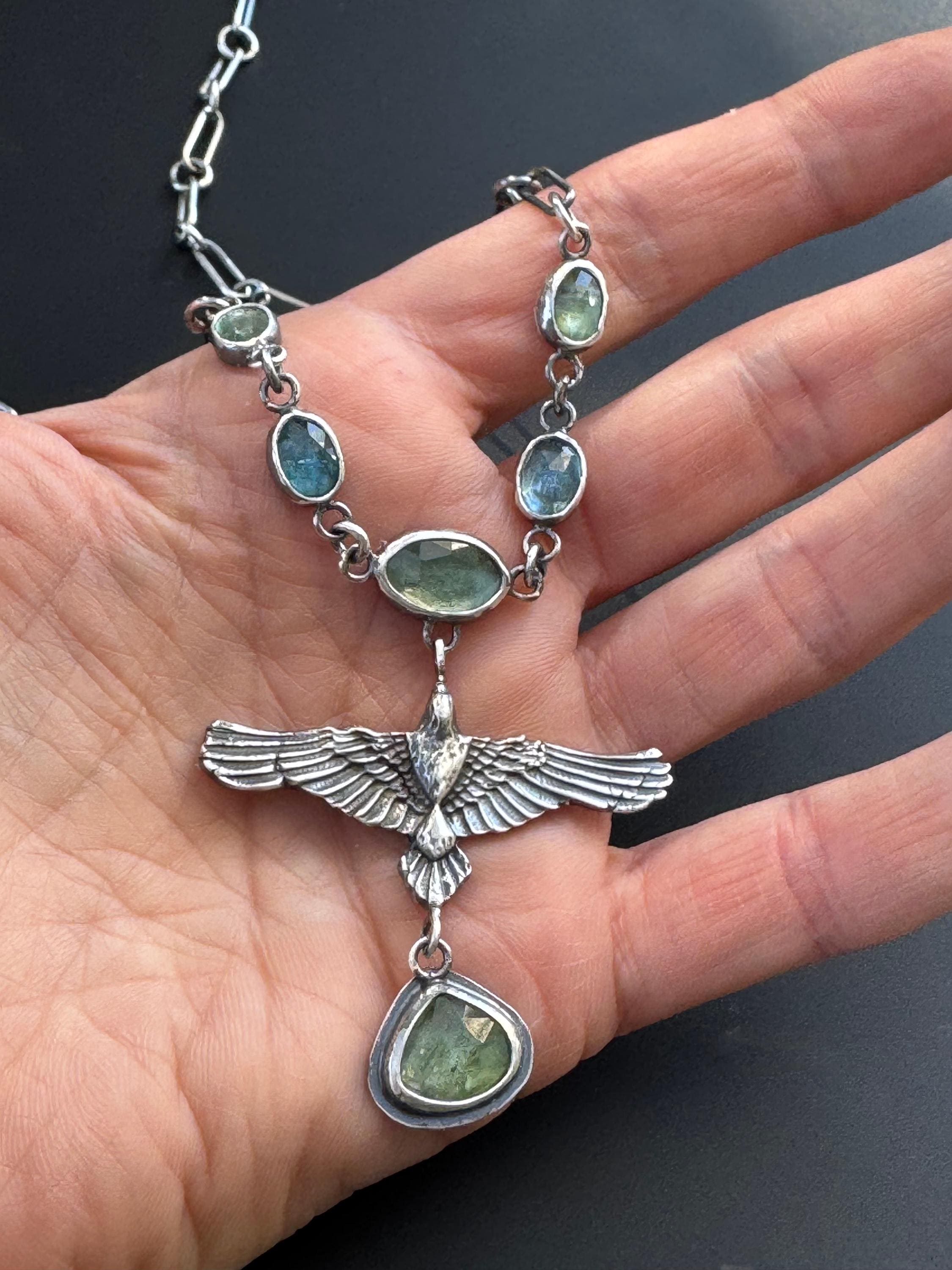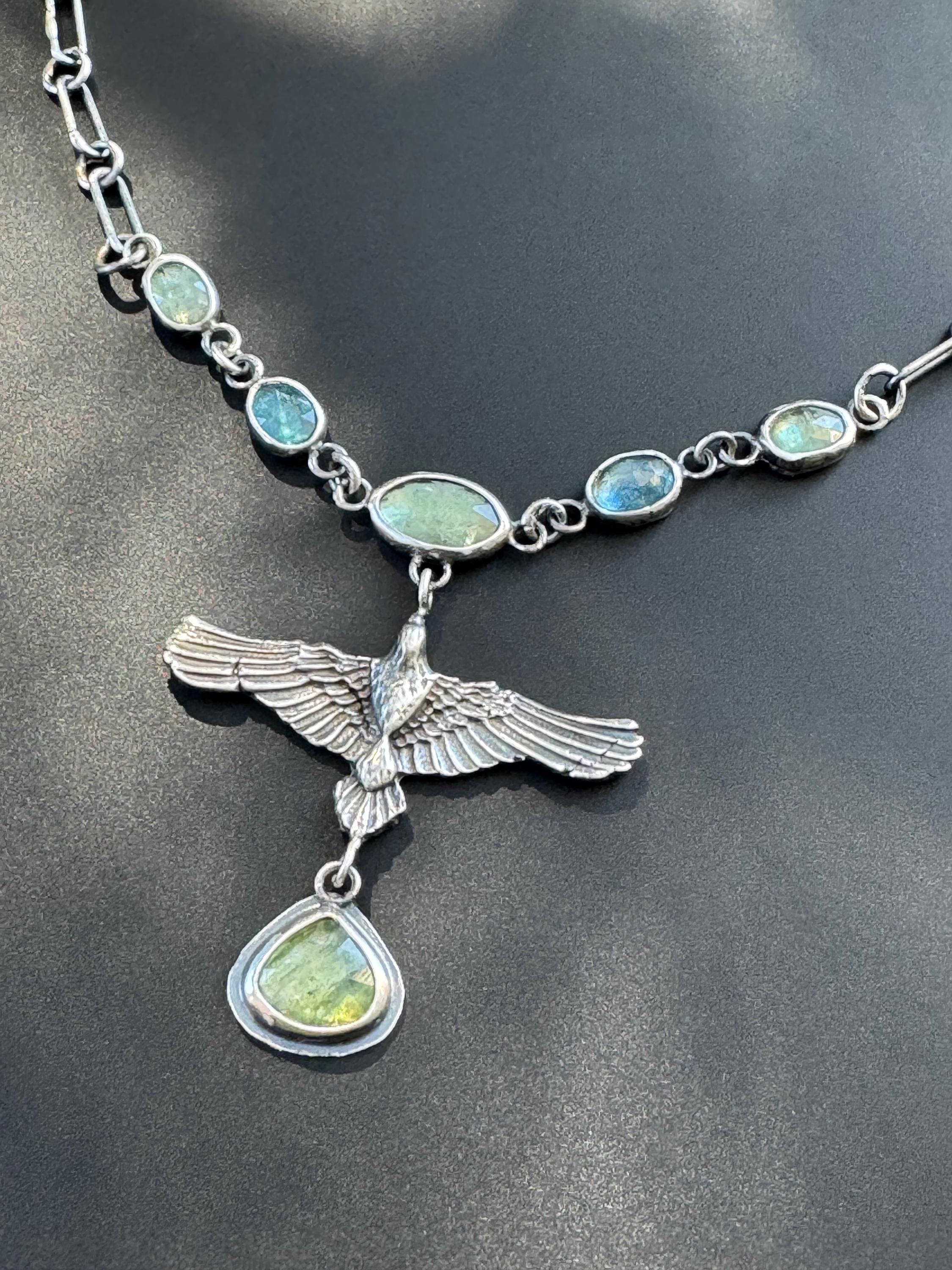 This raven amulet is made from sterling silver and features a solid silver raven flying high in the sky. The raven hangs below 5 stones; green kyanite and blue aquamarine. She carries a beautiful green kyanite below her. These are the colors of the spring sky and the spring sprouts all around us now. The chain is meticulously handmade and makes a beautiful accent to this unique piece. The chain is adjustable from between 16 - 20 inch or so. This is a lovely piece and would make a wonderful gift for any raven lover. This is a handmade pendant and one of a kind.