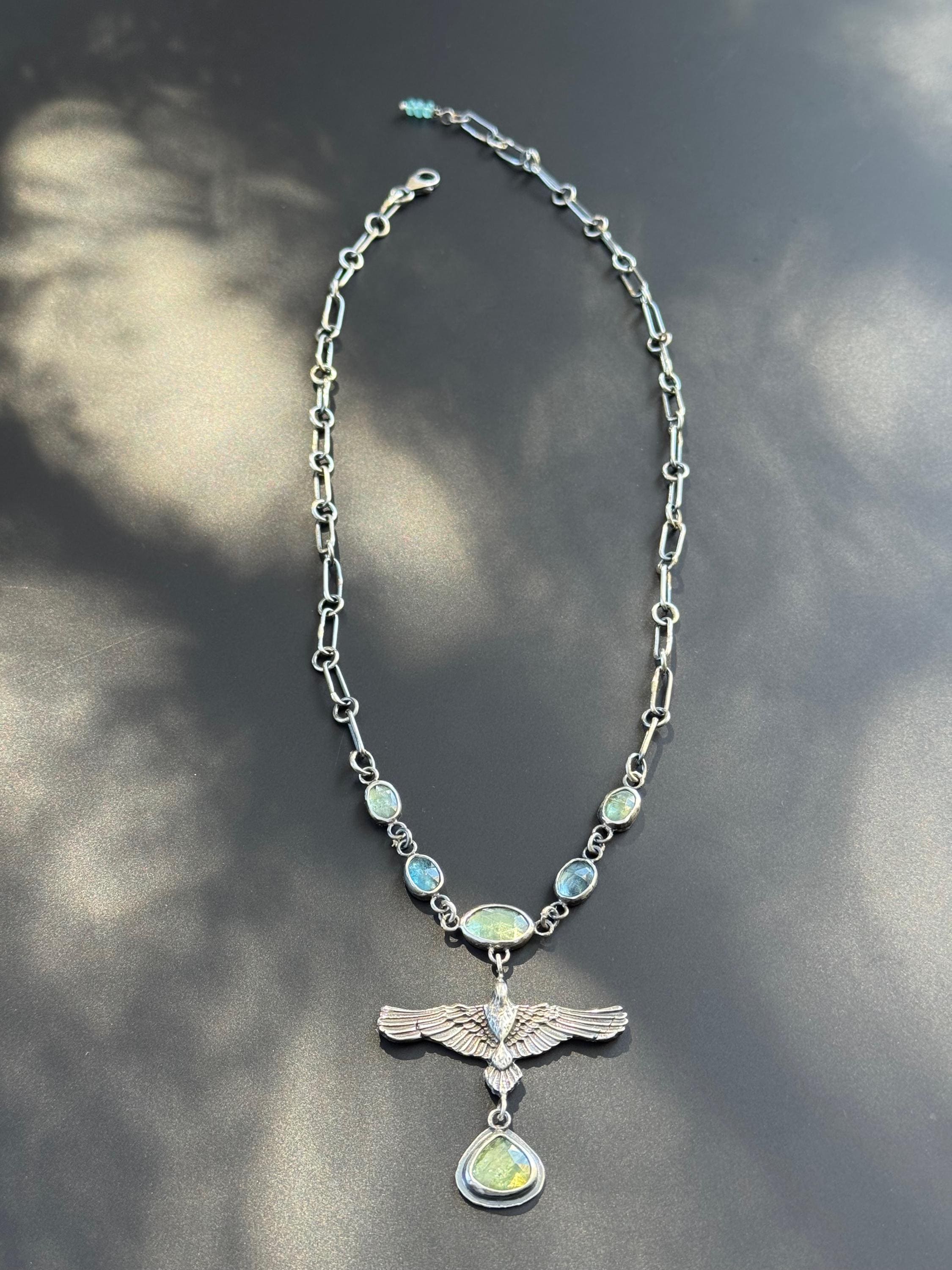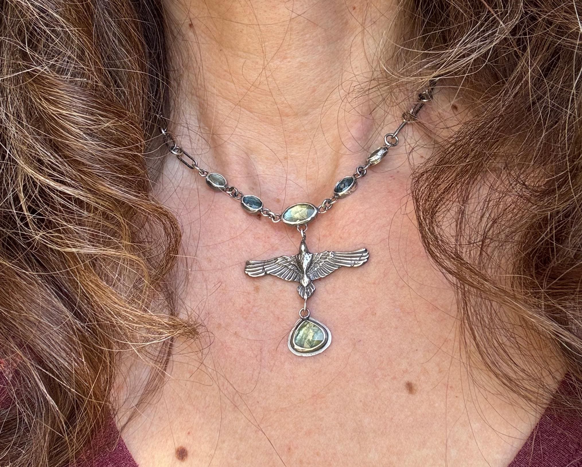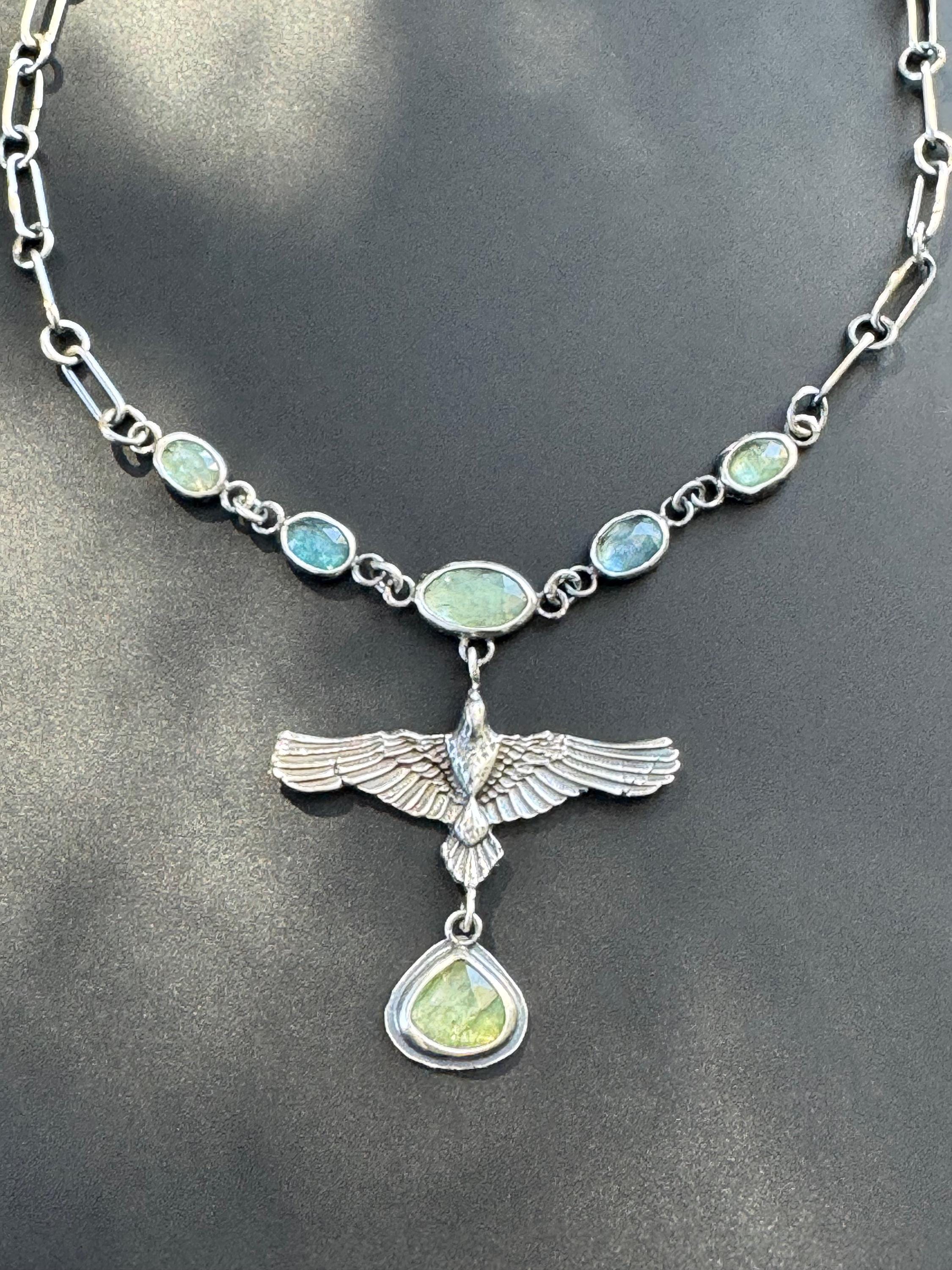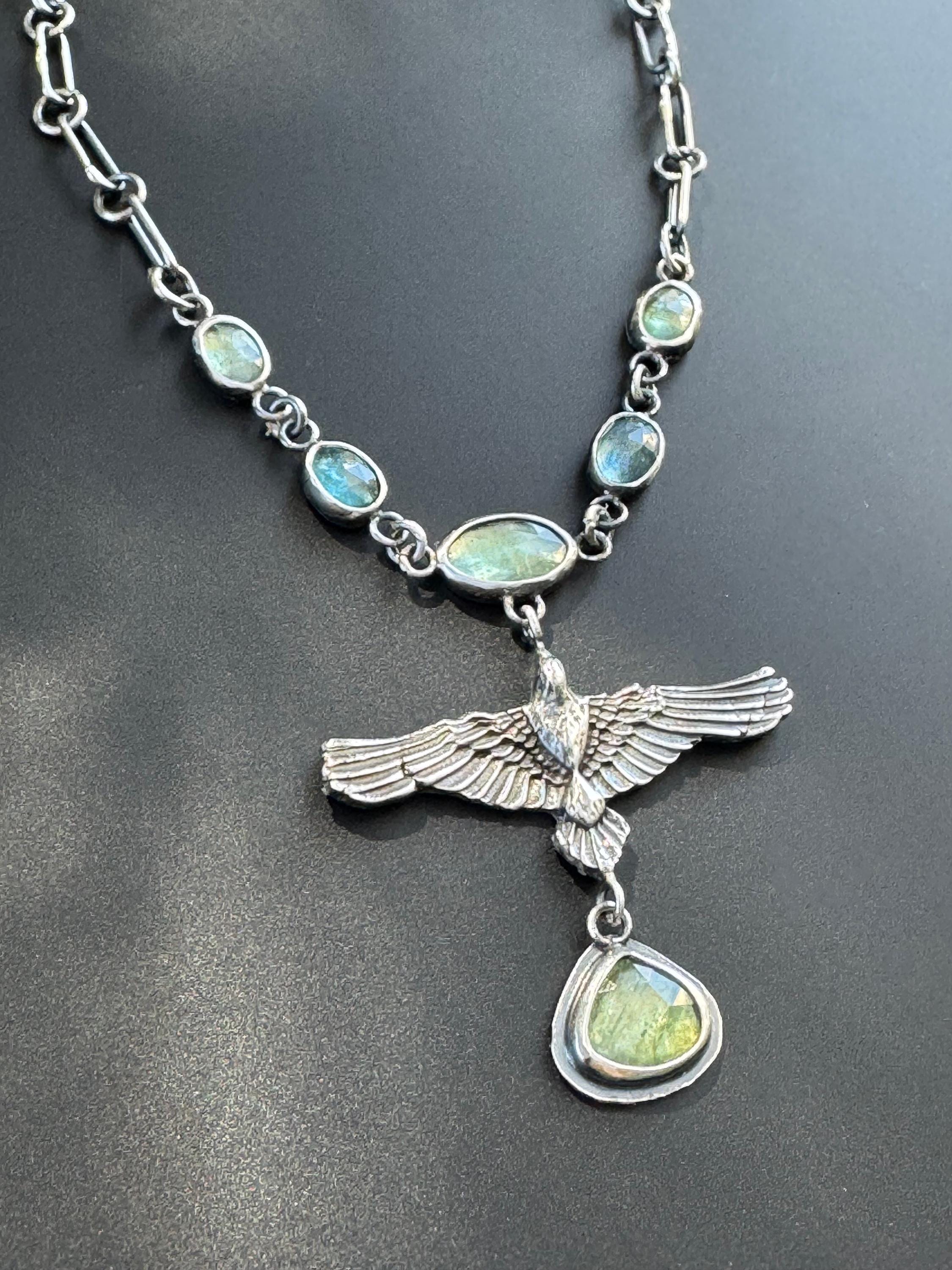 This raven amulet is made from sterling silver and features a solid silver raven flying high in the sky. The raven hangs below 5 stones; green kyanite and blue aquamarine. She carries a beautiful green kyanite below her. These are the colors of the spring sky and the spring sprouts all around us now. The chain is meticulously handmade and makes a beautiful accent to this unique piece. The chain is adjustable from between 16 - 20 inch or so. This is a lovely piece and would make a wonderful gift for any raven lover. This is a handmade pendant and one of a kind.