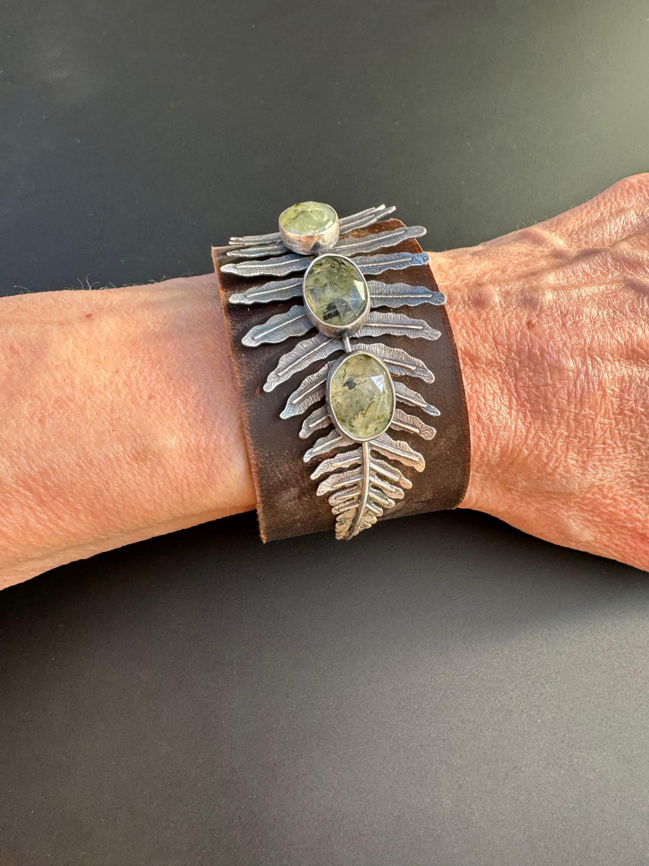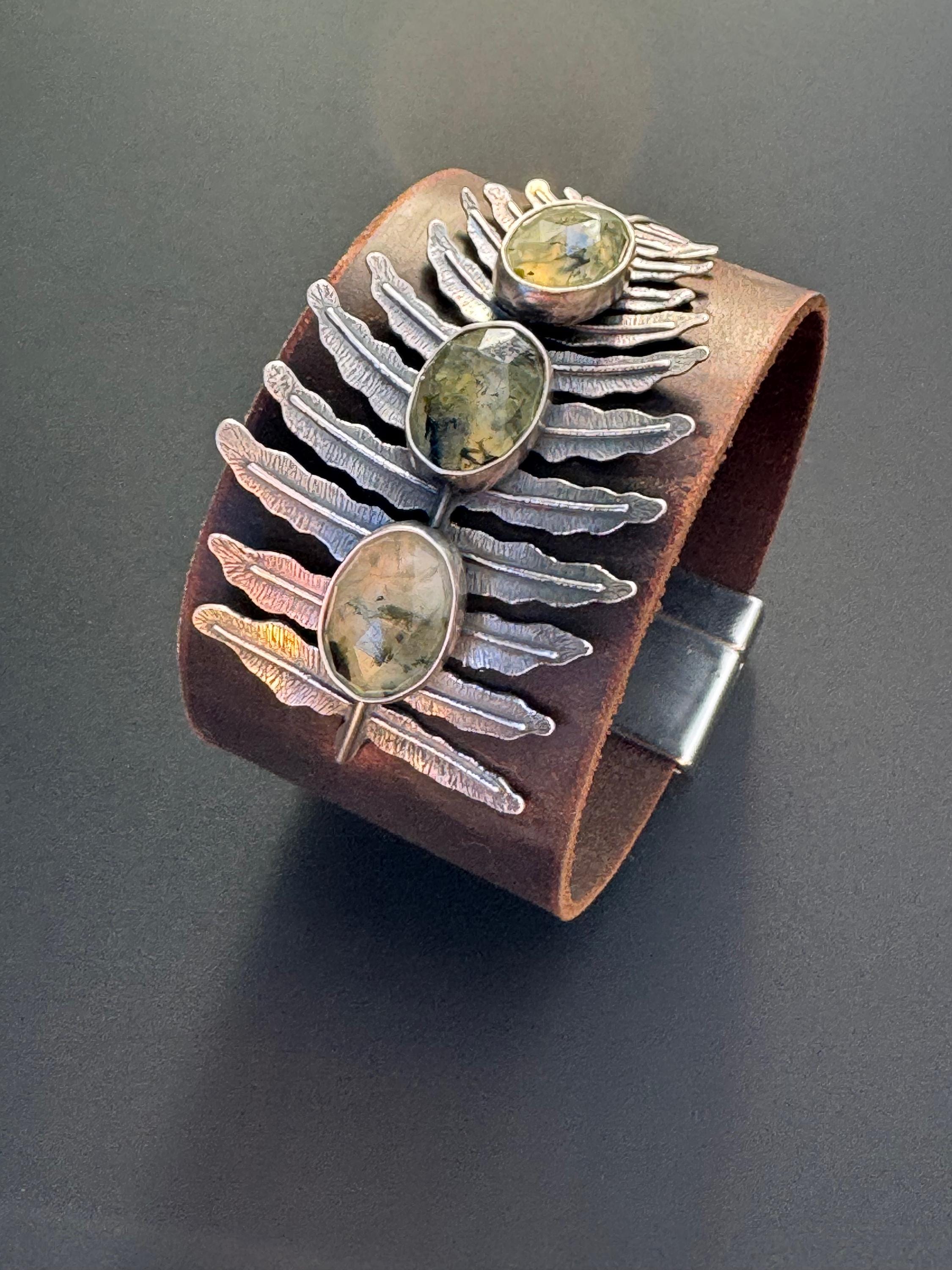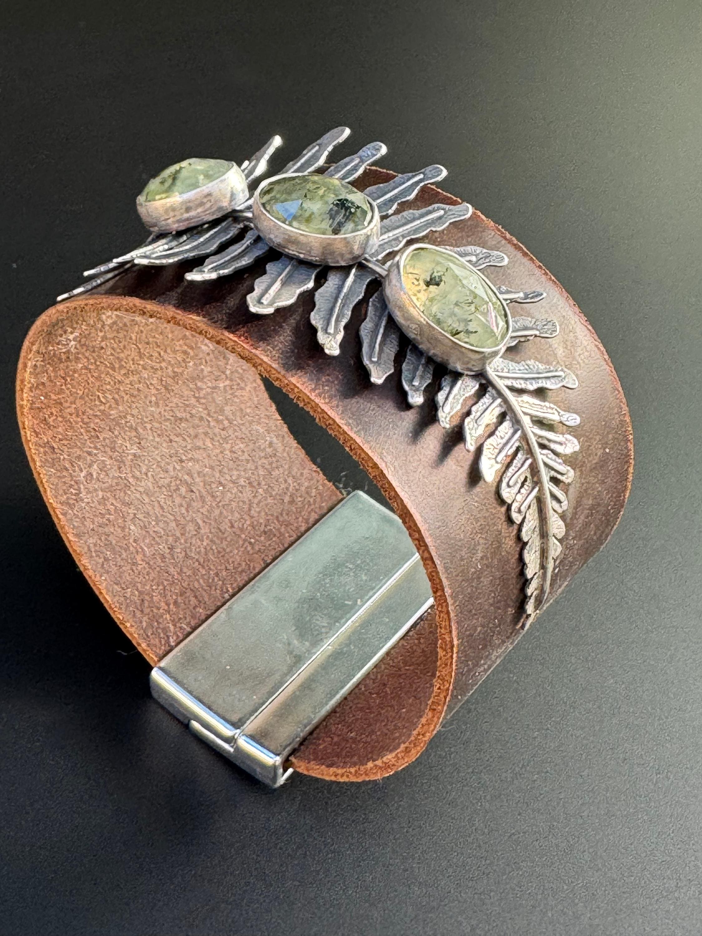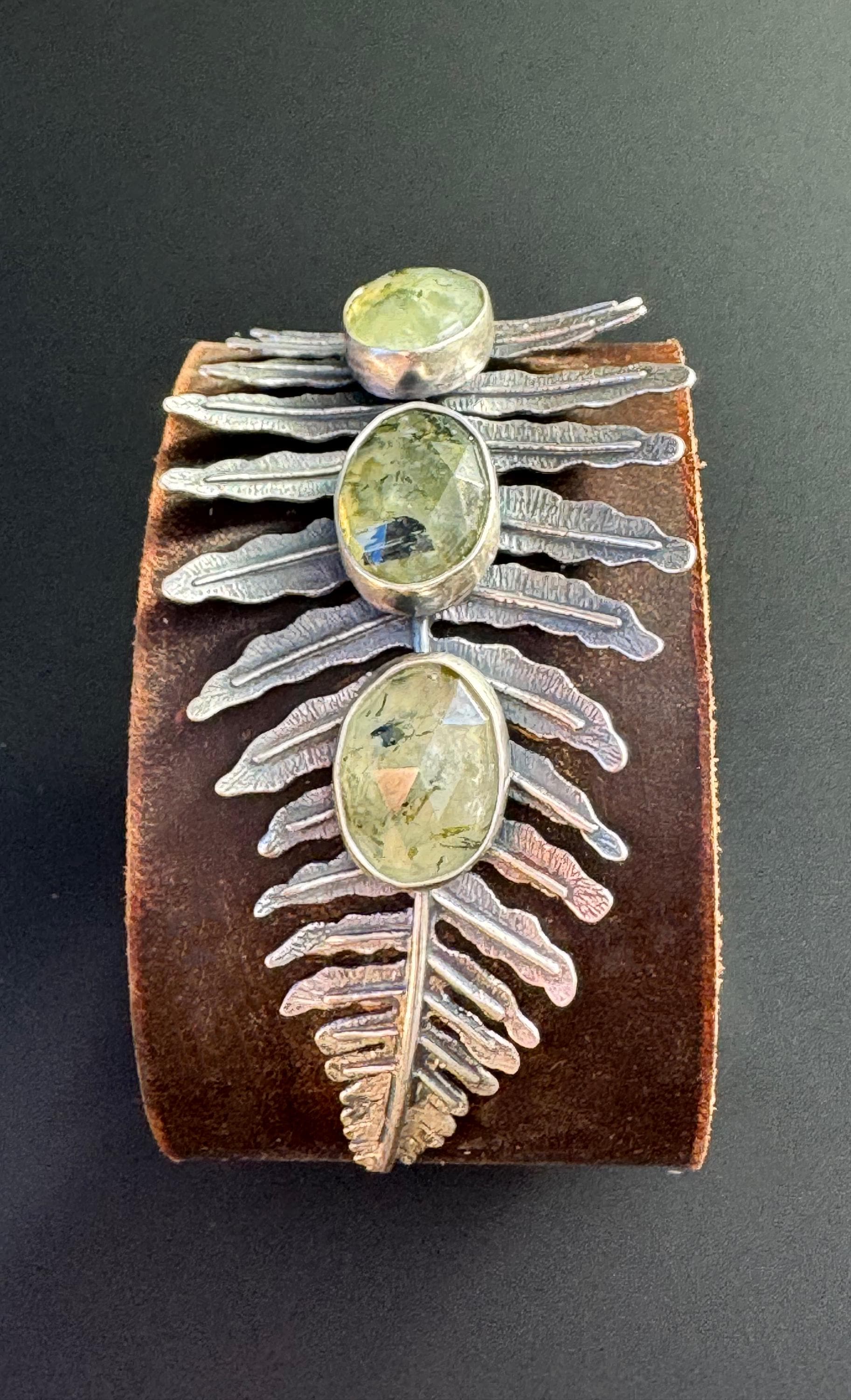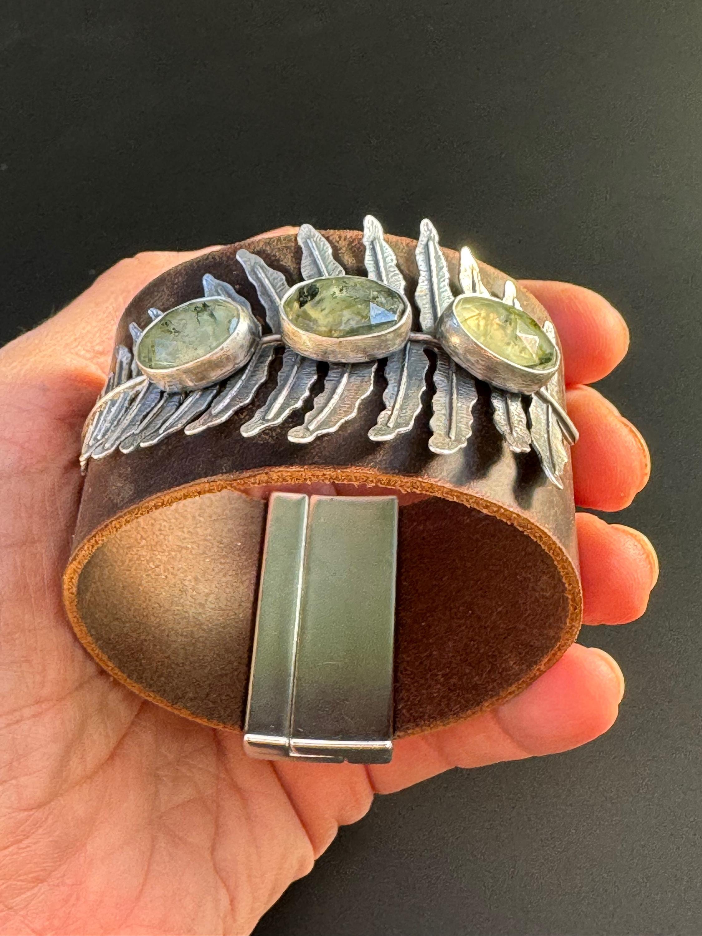 This cuff has a handmade sterling silver fern as it's focal point. The fern is a handcrafted fern made from sterling silver, cut, shaped and attached to make a very unique piece of jewelry. The fern is then given texture and shaped to resemble a real fern. This has three gorgeous Prehnite stones sitting a top of it, reflecting the colors and textures of the forest. The colors echoing that of ferns and this cuff feels like it came from the forest. It has a very strong magnetic clasp that helps it feel very secure while on. This is a handmade piece and is one of a kind.