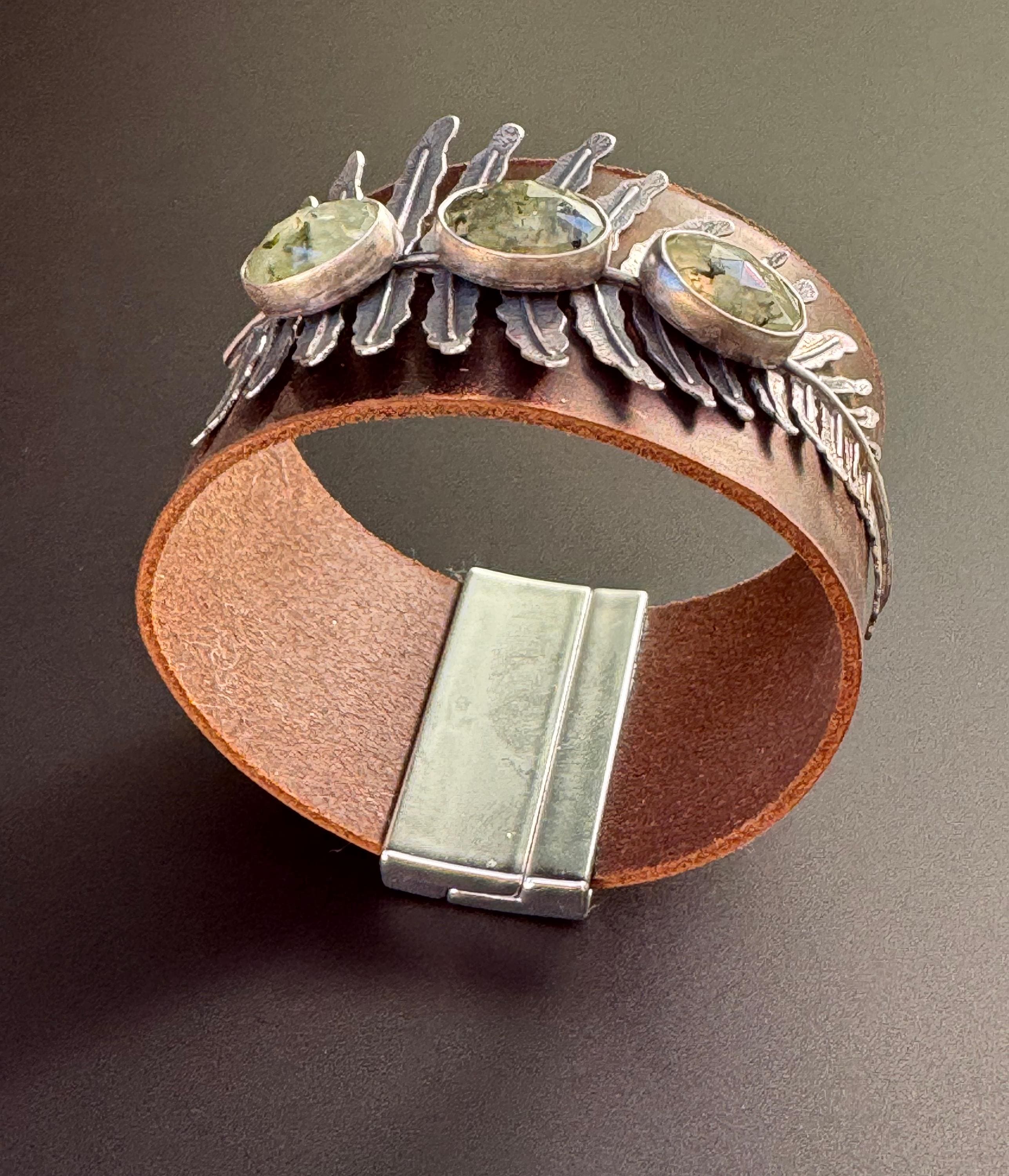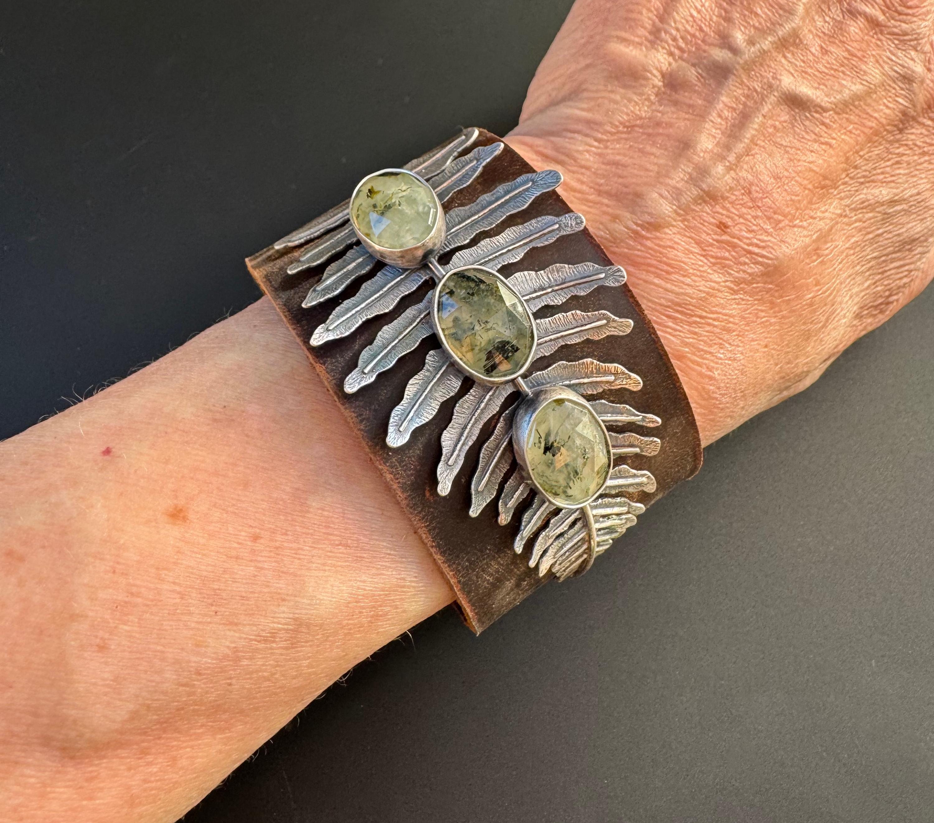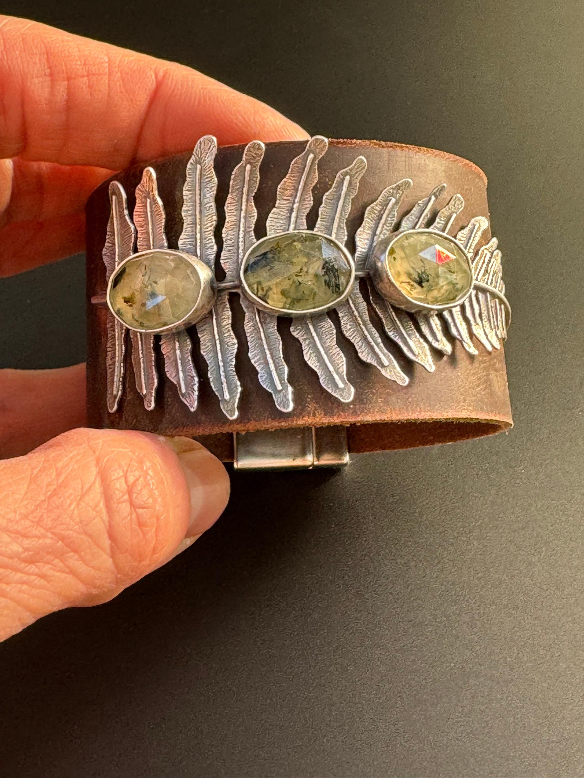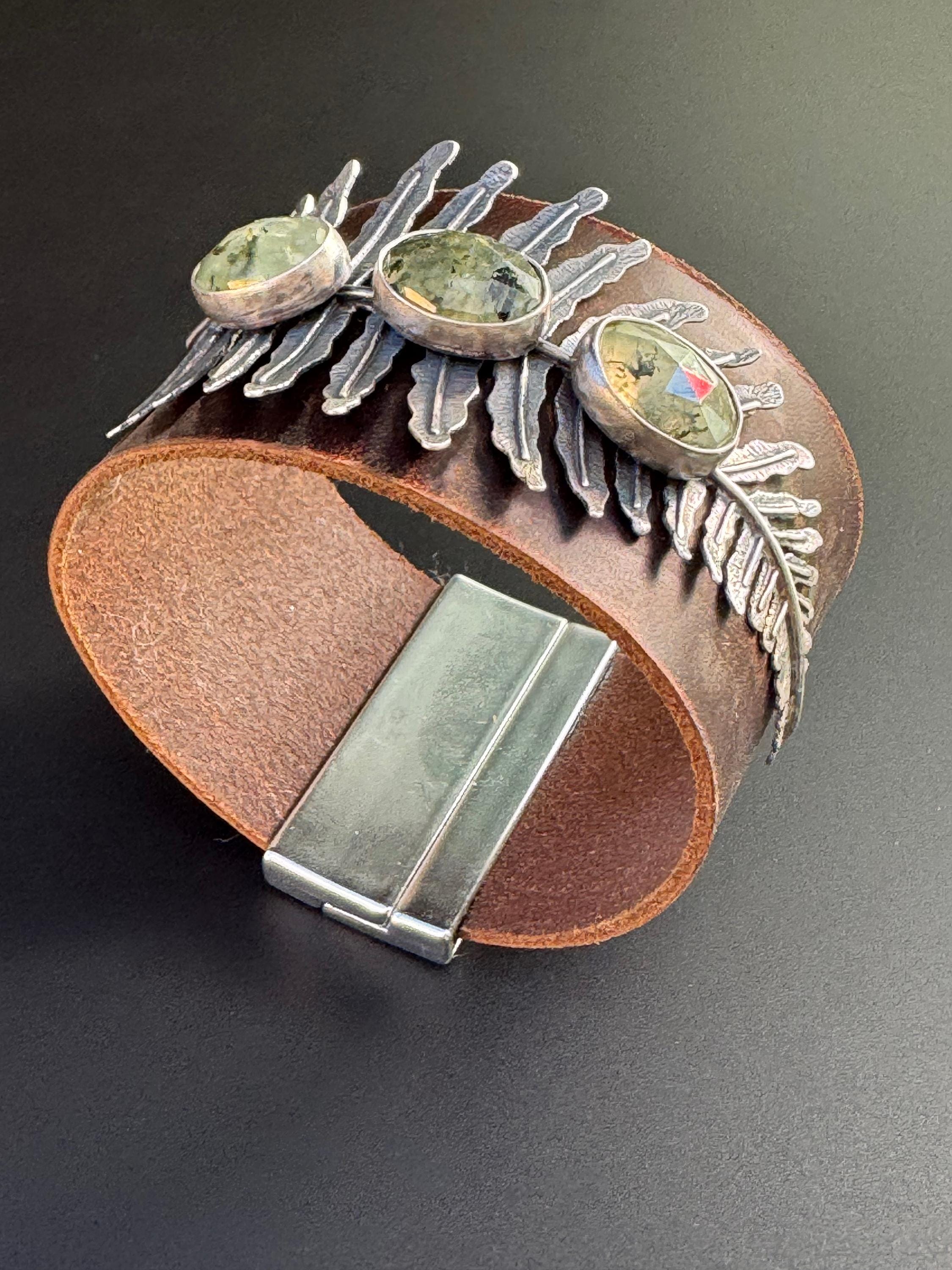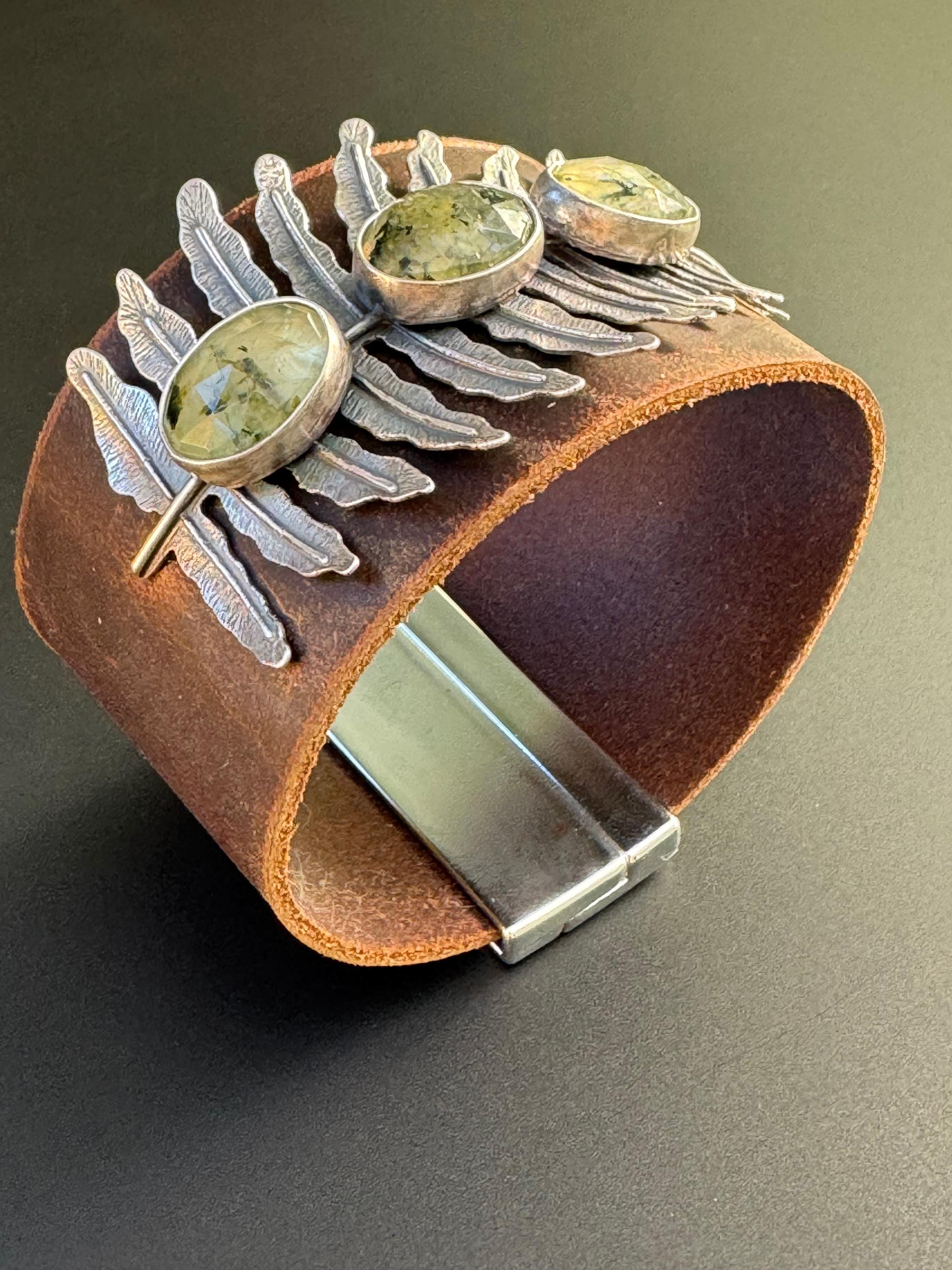 This cuff has a handmade sterling silver fern as it's focal point. The fern is a handcrafted fern made from sterling silver, cut, shaped and attached to make a very unique piece of jewelry. The fern is then given texture and shaped to resemble a real fern. This has three gorgeous Prehnite stones sitting a top of it, reflecting the colors and textures of the forest. The colors echoing that of ferns and this cuff feels like it came from the forest. It has a very strong magnetic clasp that helps it feel very secure while on. This is a handmade piece and is one of a kind.