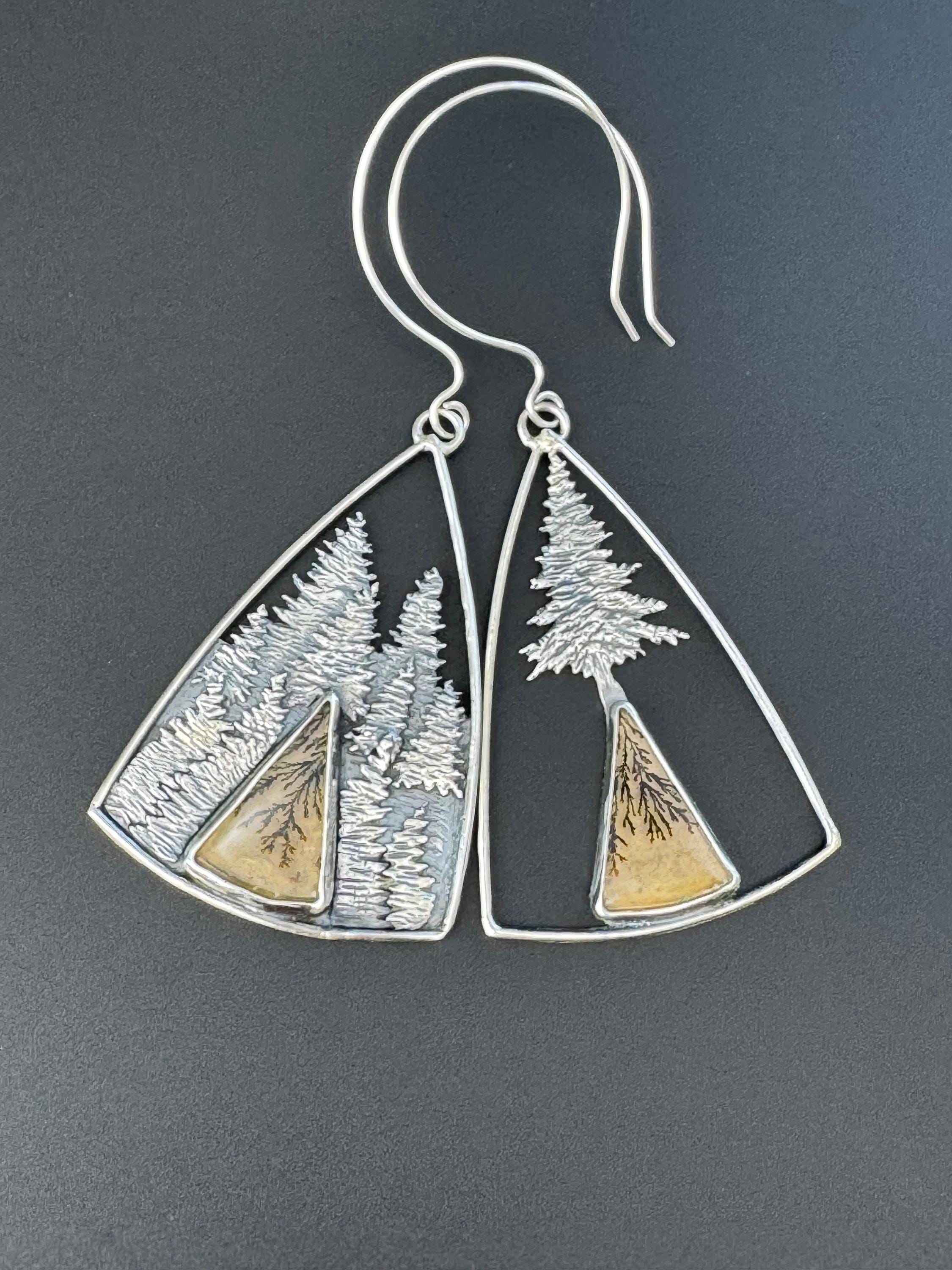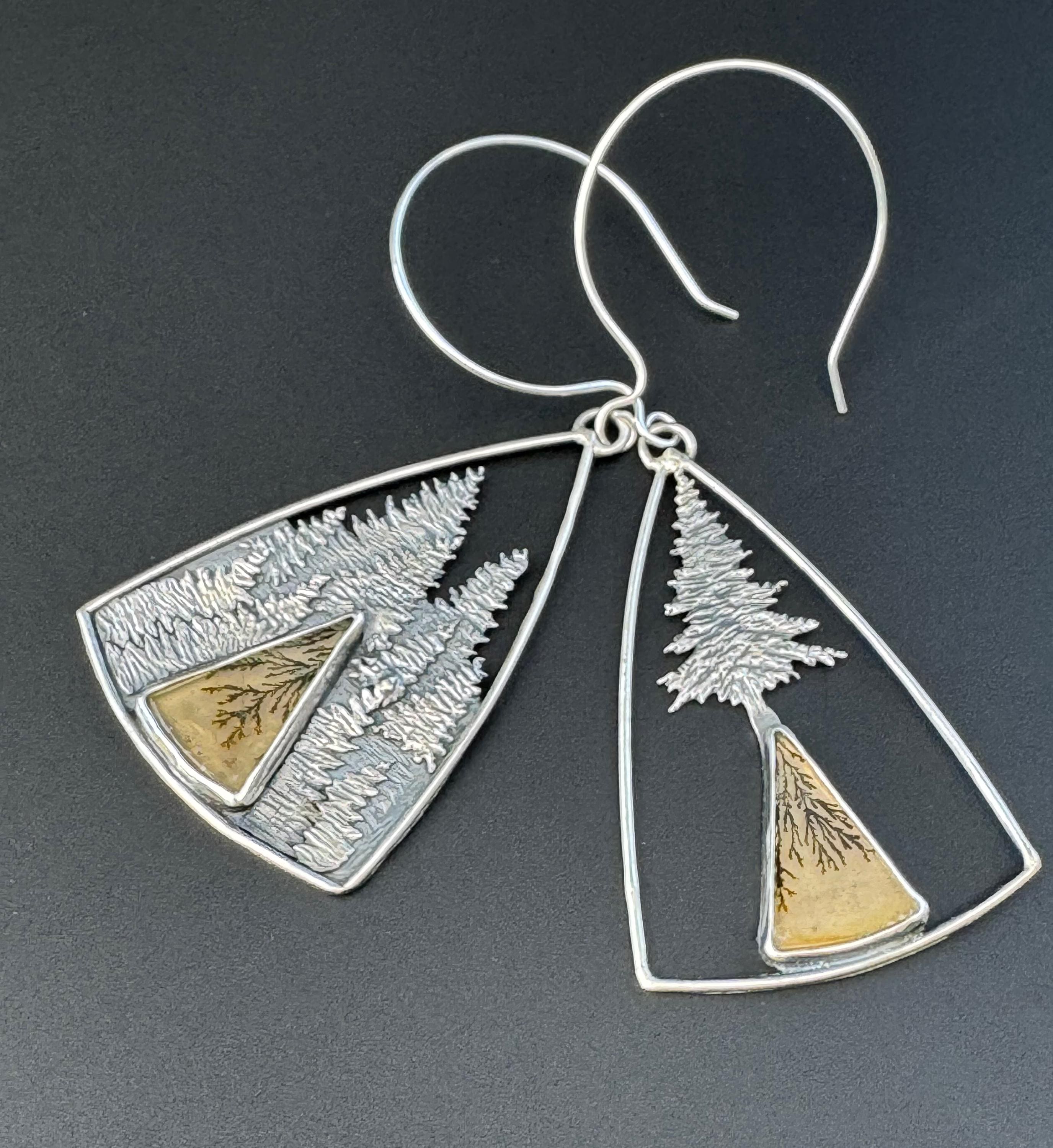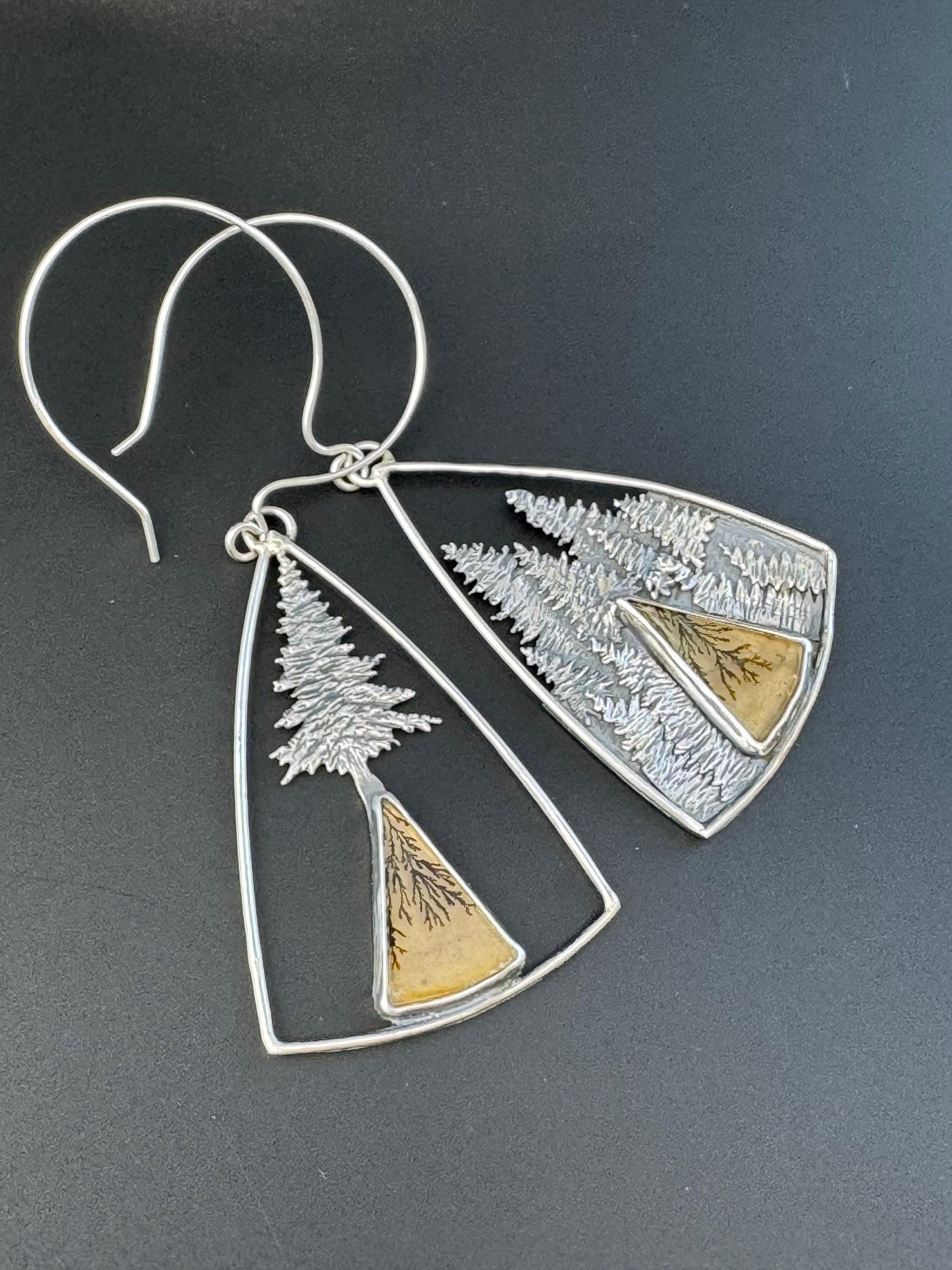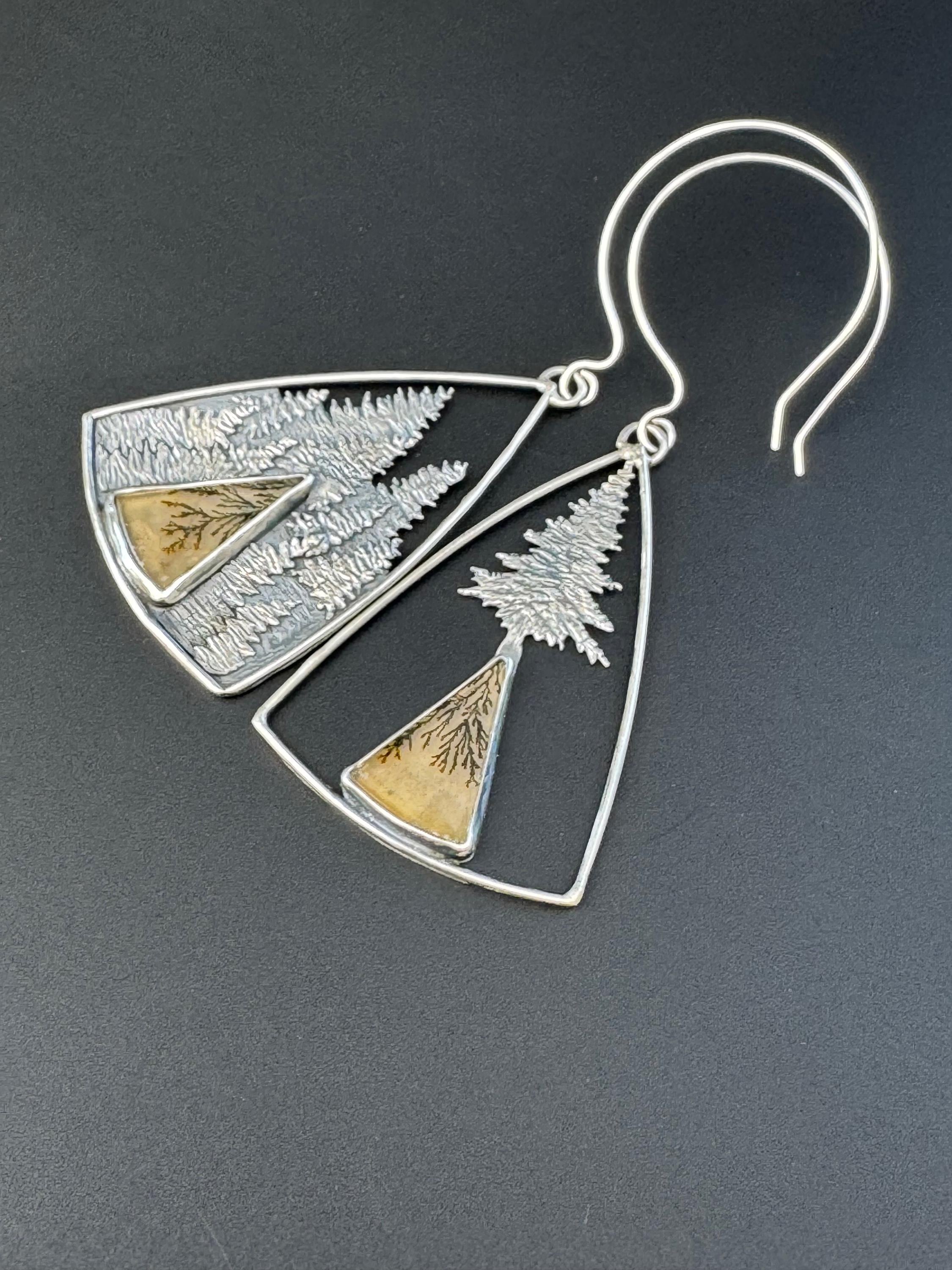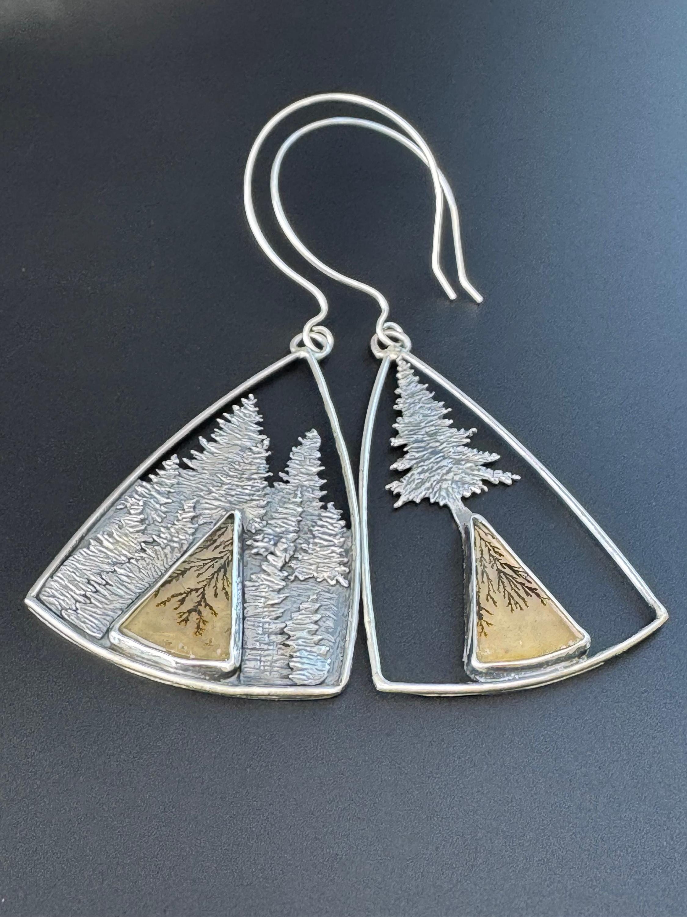 These earrings are made from sterling silver. One of these features a tree and dendritic agate below creating the root structure beneath. The other is a forest of trees with the dendritic agate representing the network between all the trees. These earrings capture the essence of the saying 'The forest for the tree', which is something that is important to remember with all facets of life. Each tree is hand made, cut out then given texture. These are lightweight and very nice feeling when worn. These are completely handmade and one of a kind earrings.