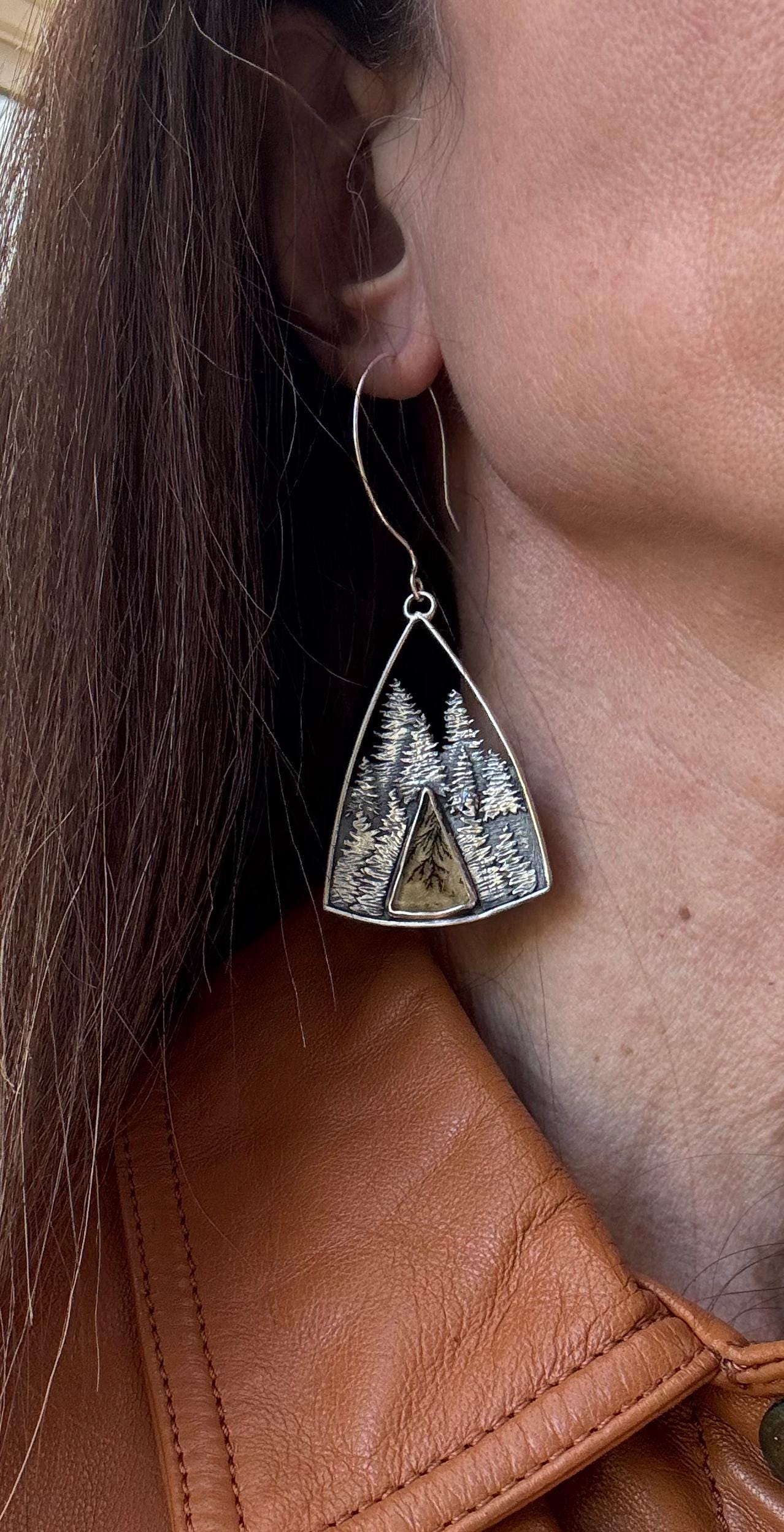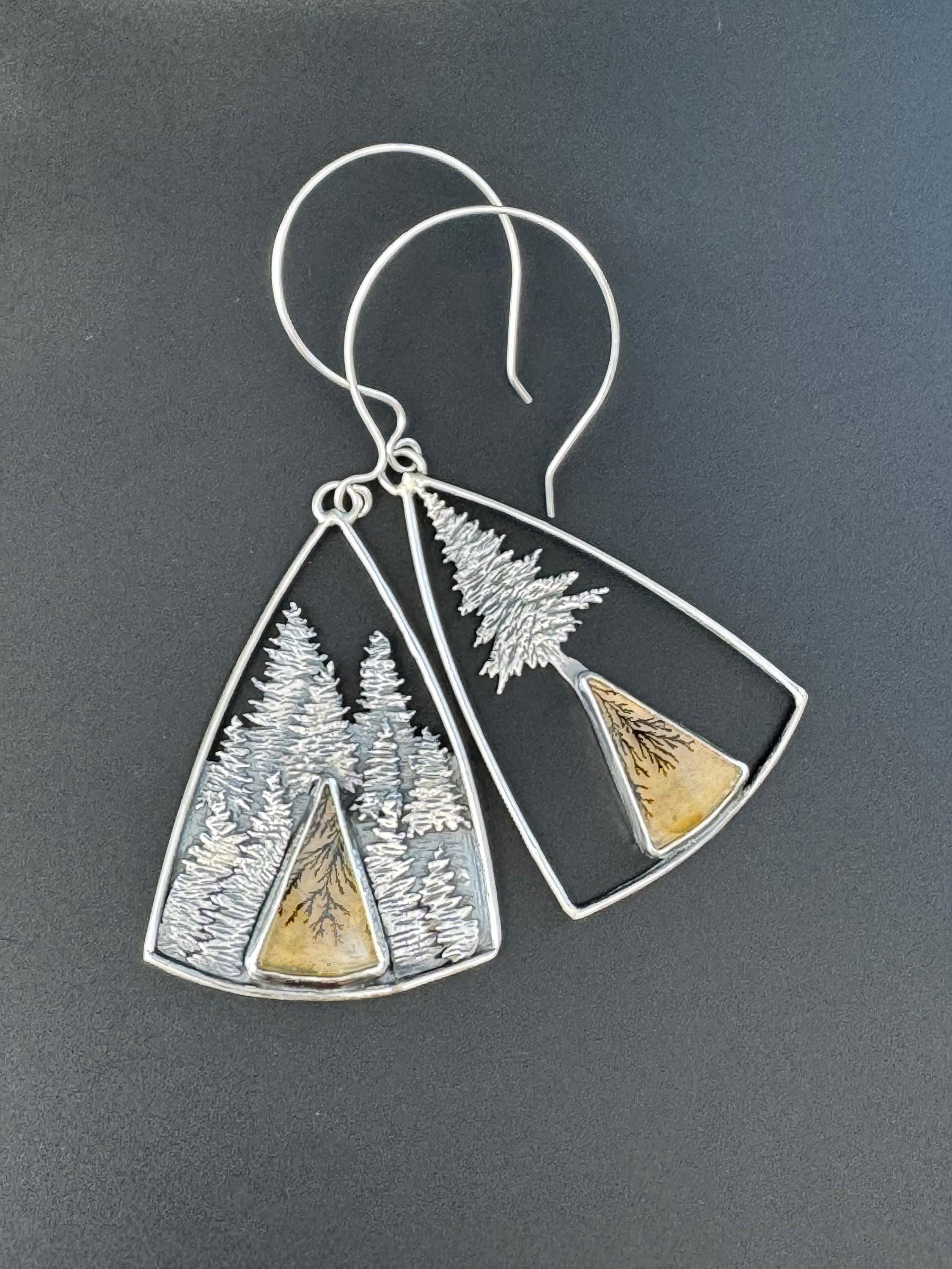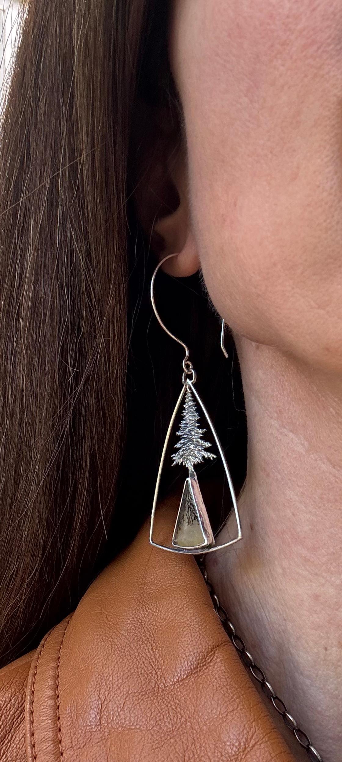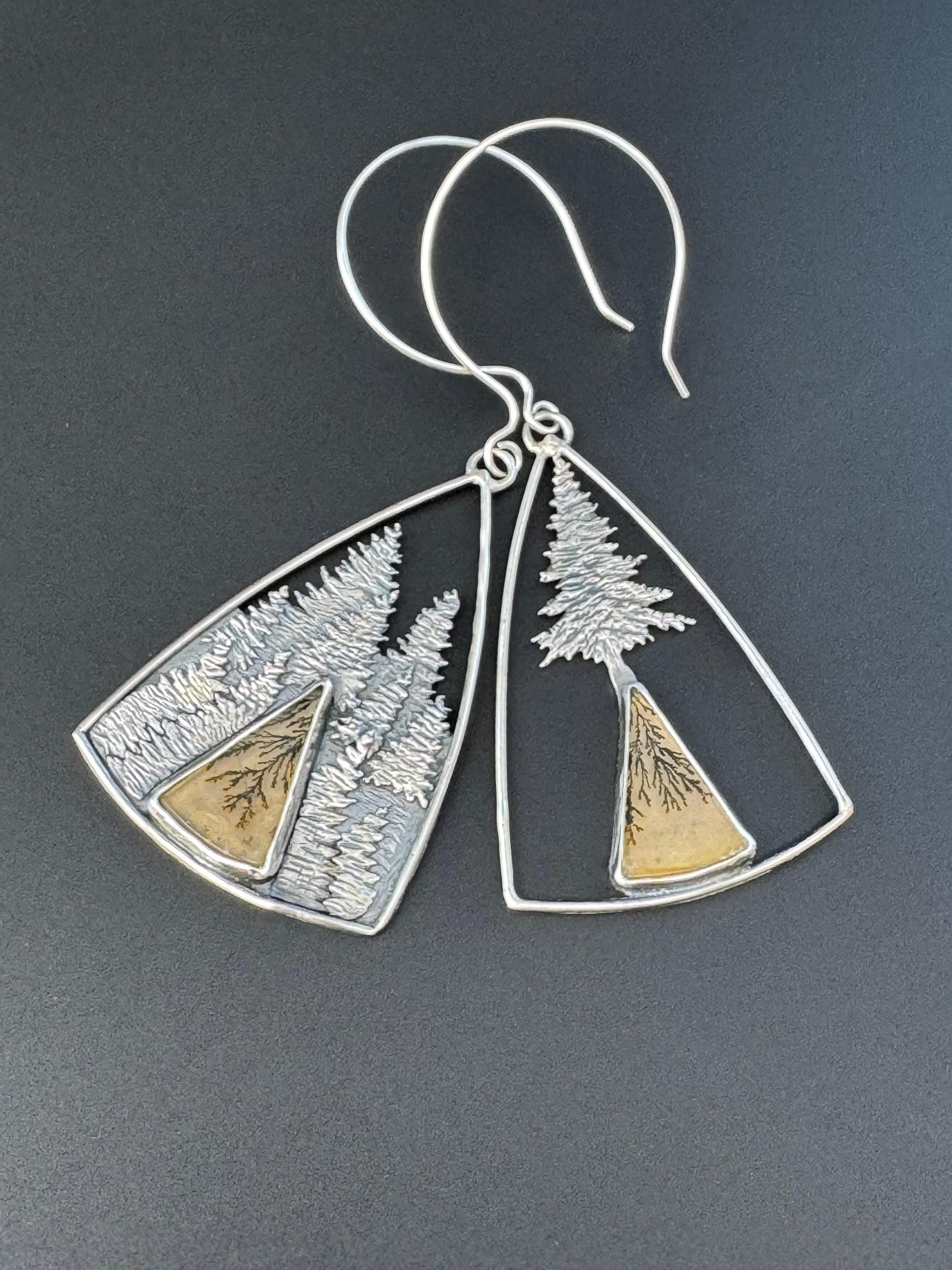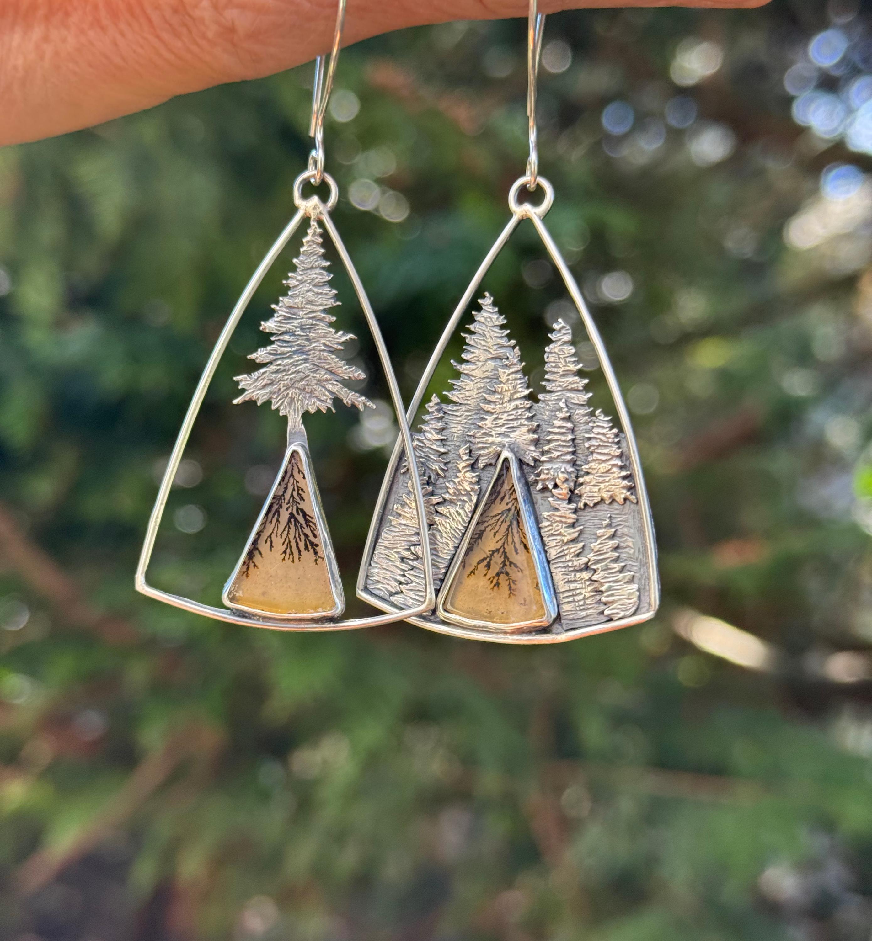 These earrings are made from sterling silver. One of these features a tree and dendritic agate below creating the root structure beneath. The other is a forest of trees with the dendritic agate representing the network between all the trees. These earrings capture the essence of the saying 'The forest for the tree', which is something that is important to remember with all facets of life. Each tree is hand made, cut out then given texture. These are lightweight and very nice feeling when worn. These are completely handmade and one of a kind earrings.
