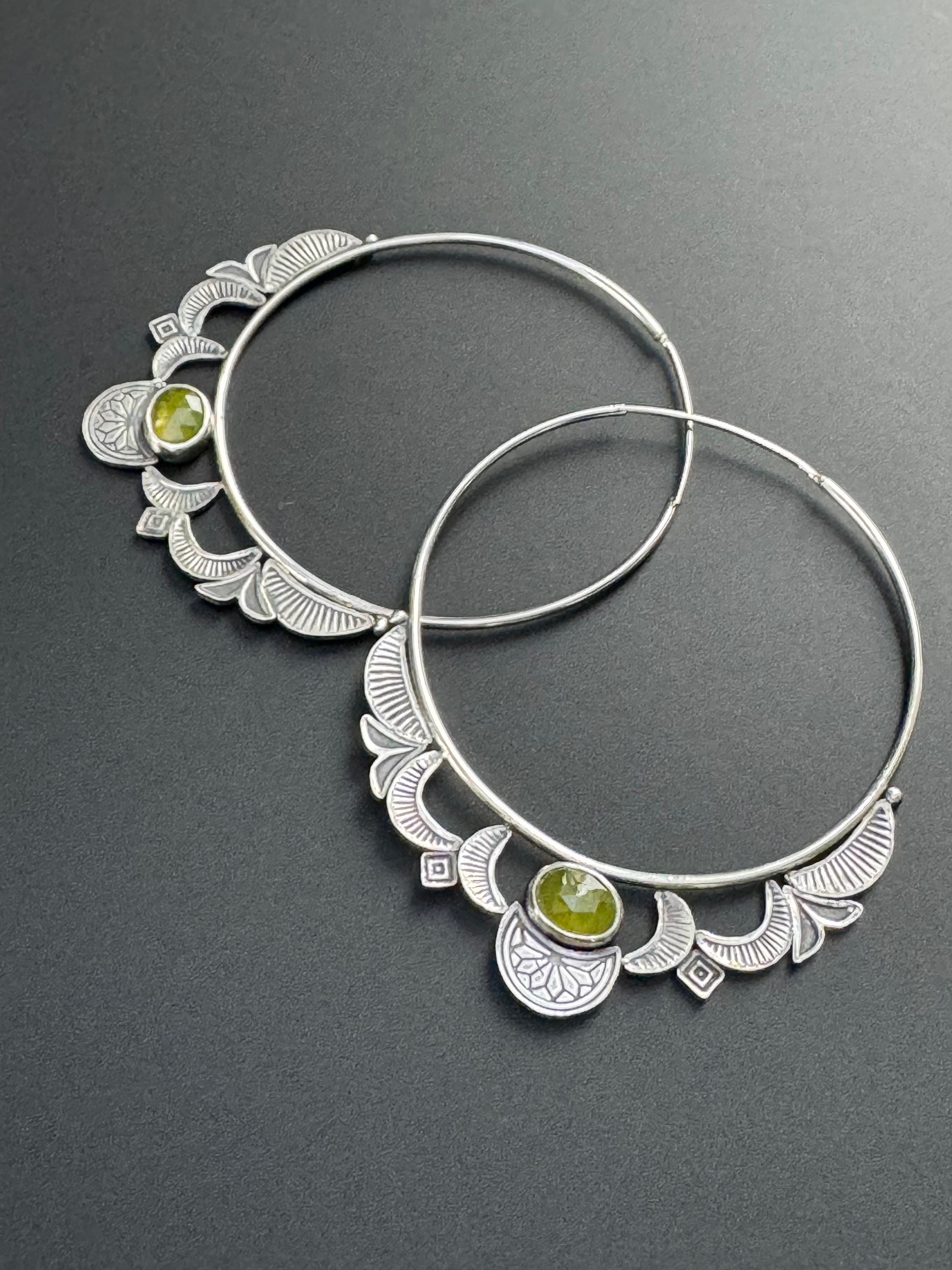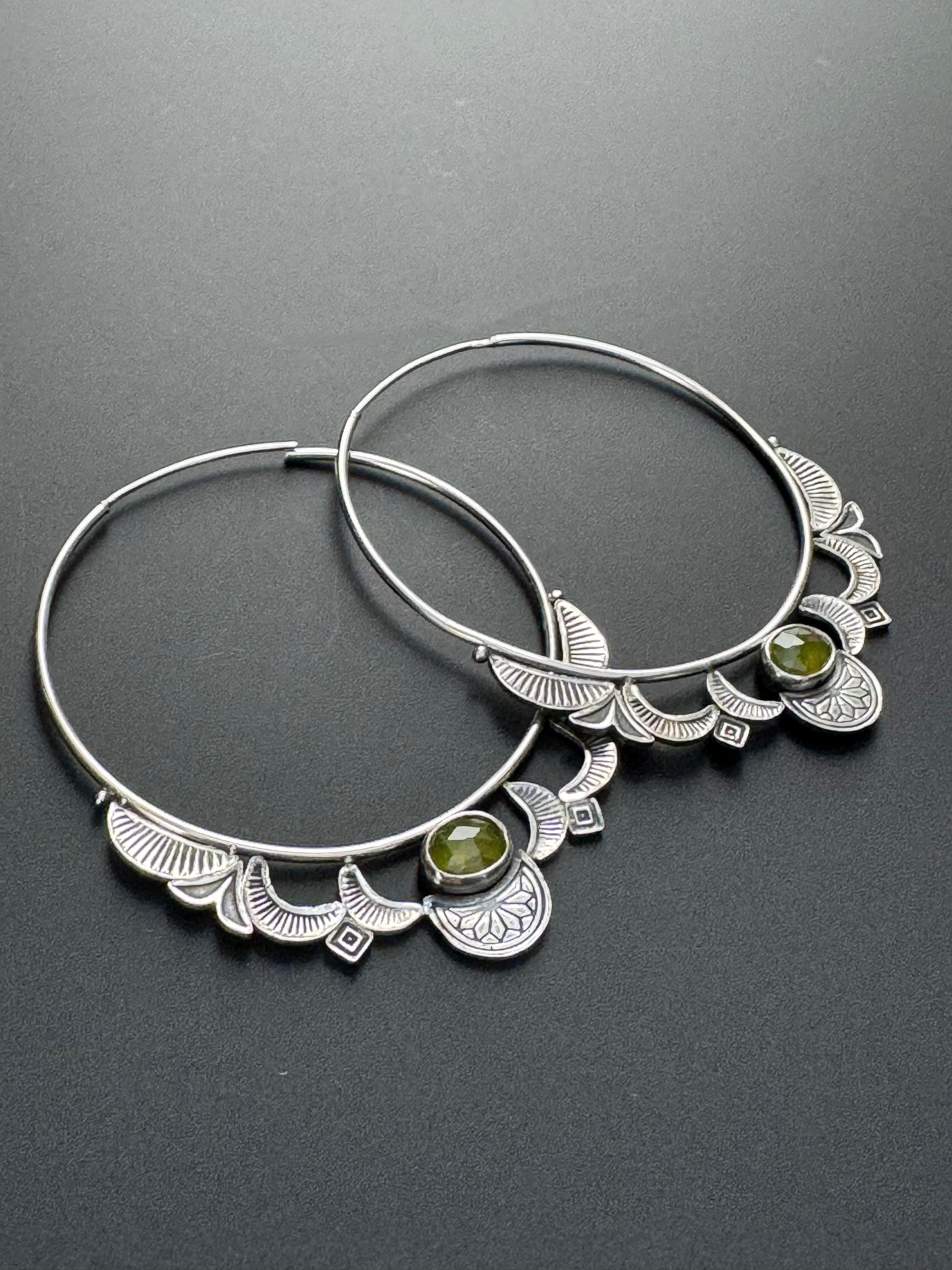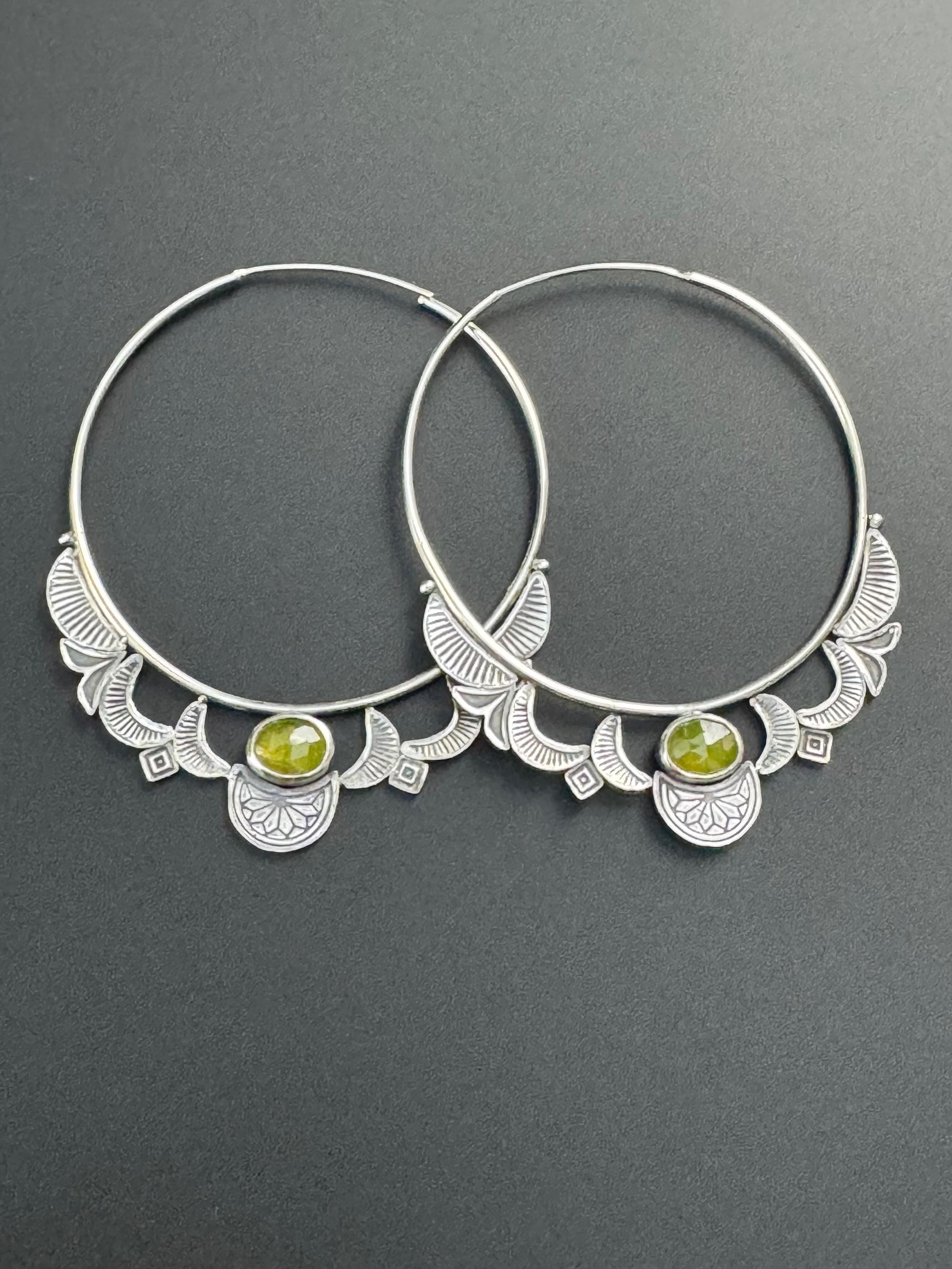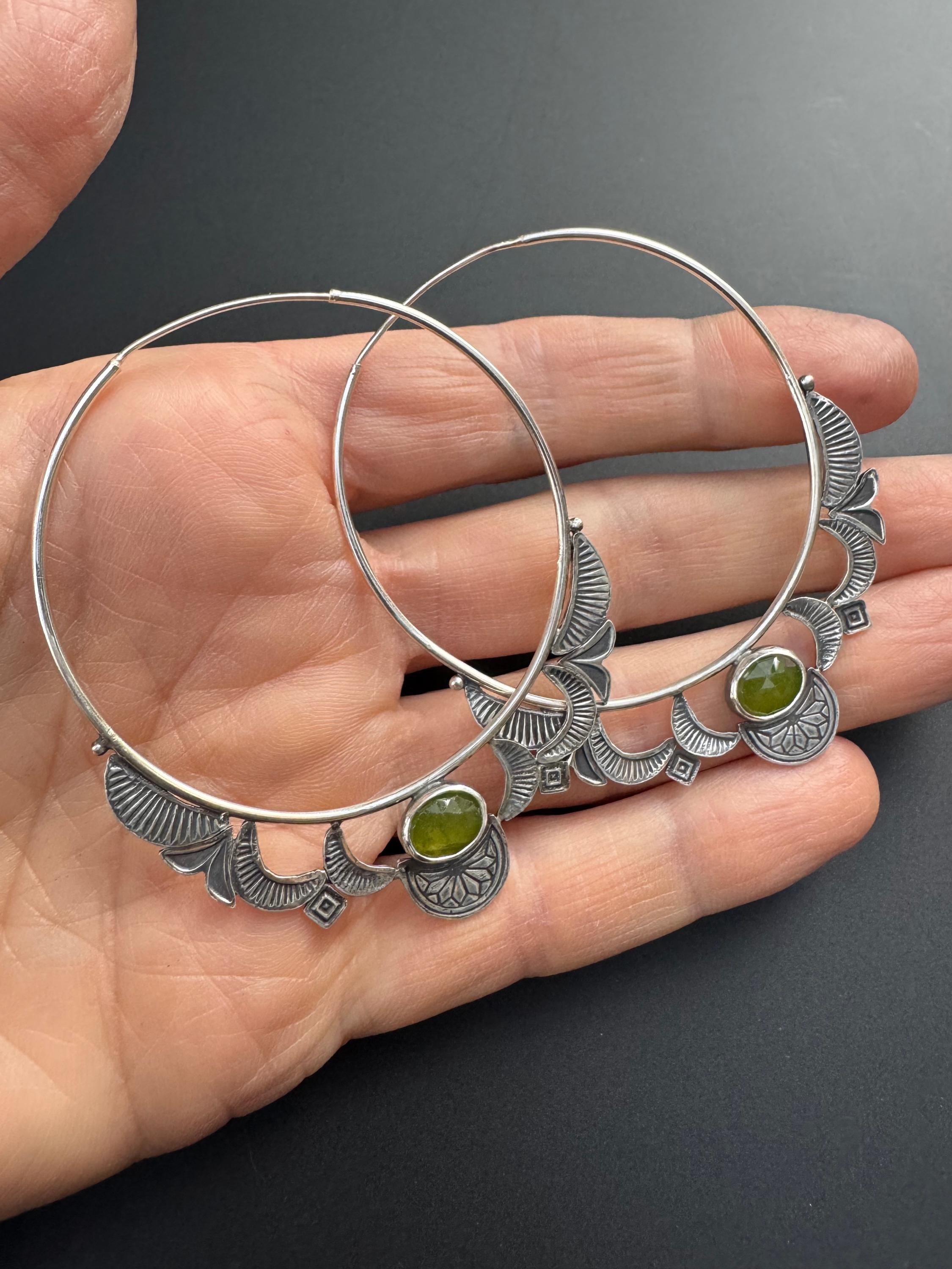 Hoops are the best! And these hoop earrings are made from sterling silver and each has a lovely green vesuvianite at the focal point. The hoops are 14 ga wire and feature a hand stamped design on each hoop. The design compliments the shape of the hoops really nicely. The ear wire portion is 20 ga. These are handmade and one of a kind earrings.