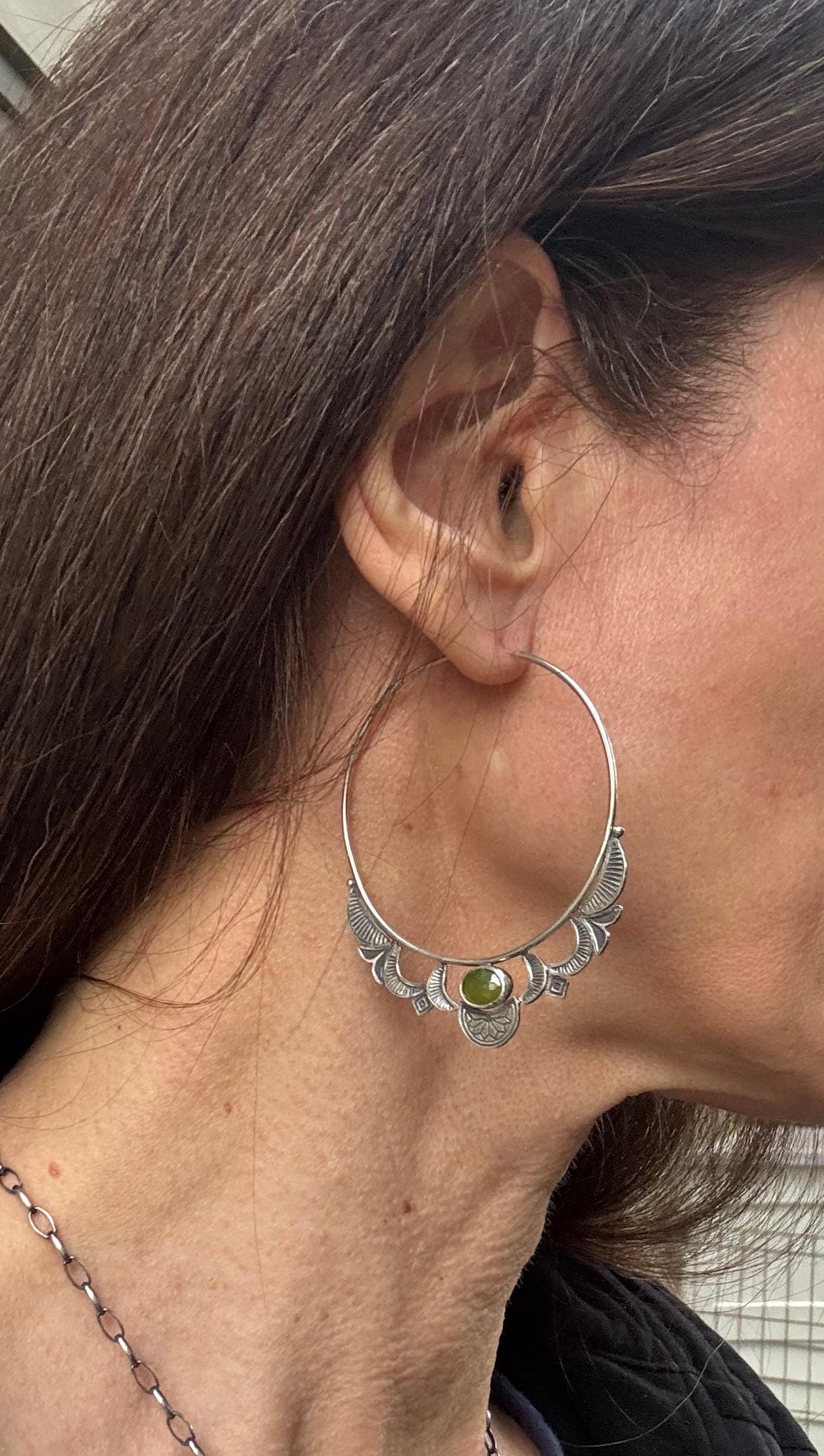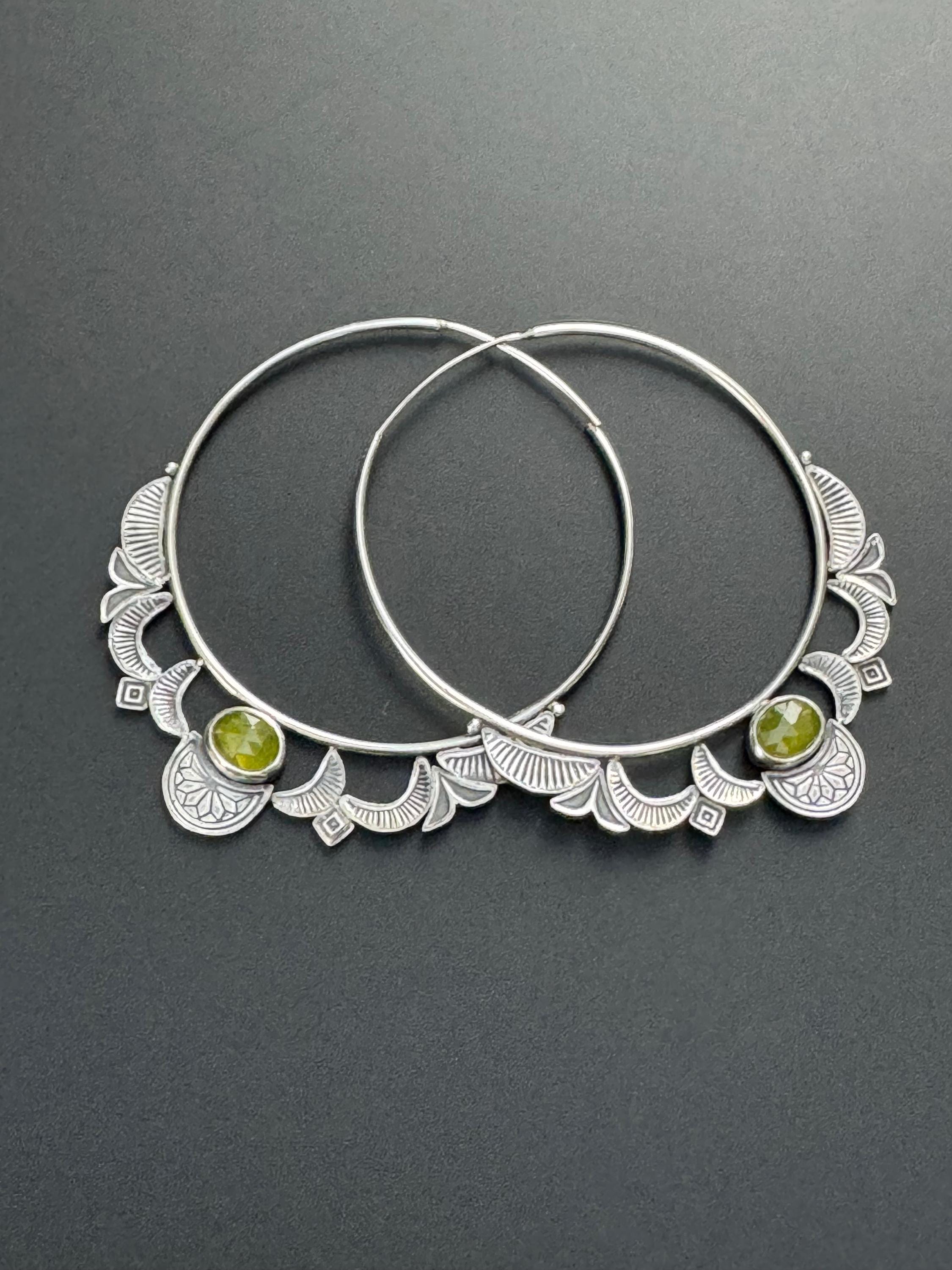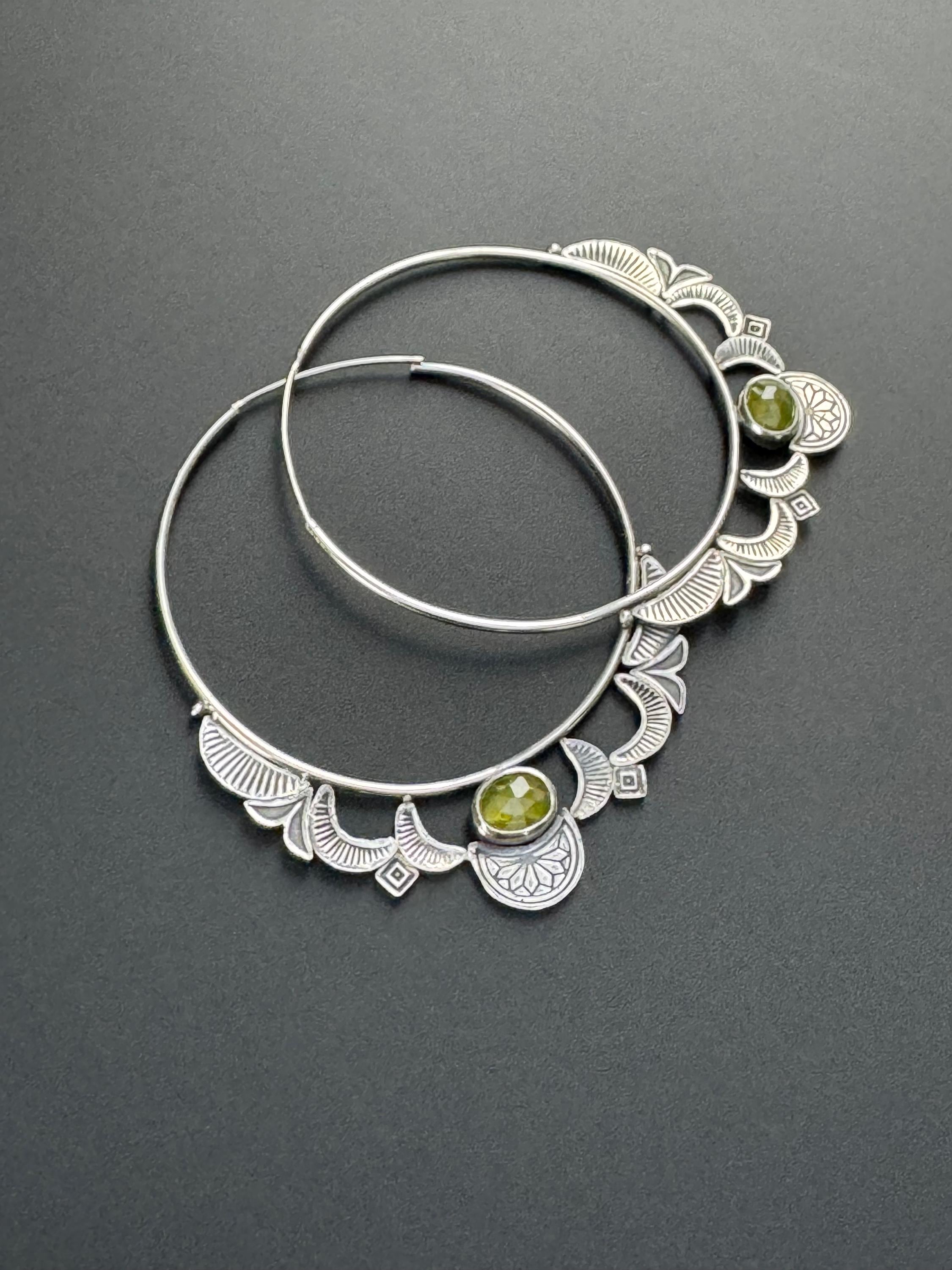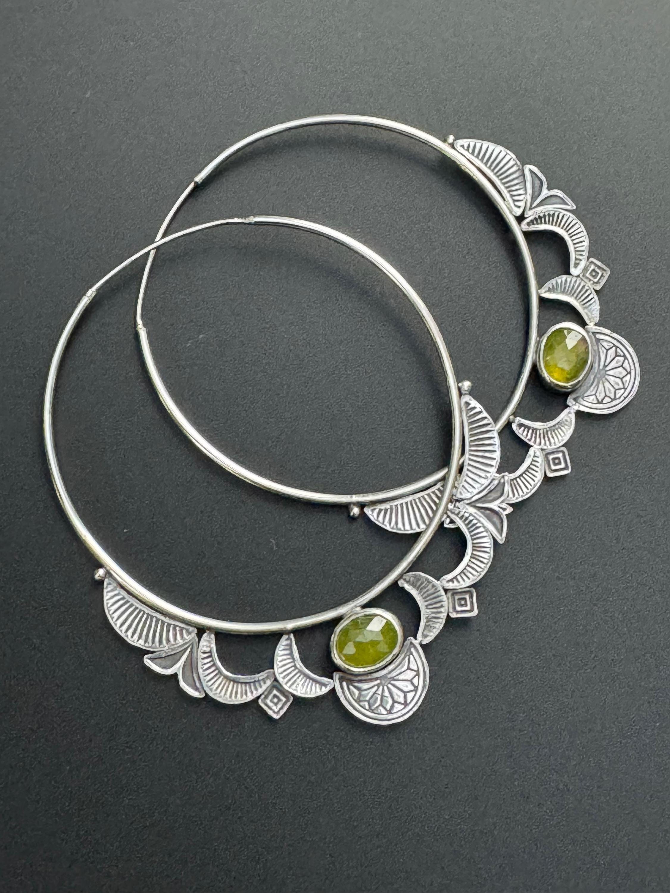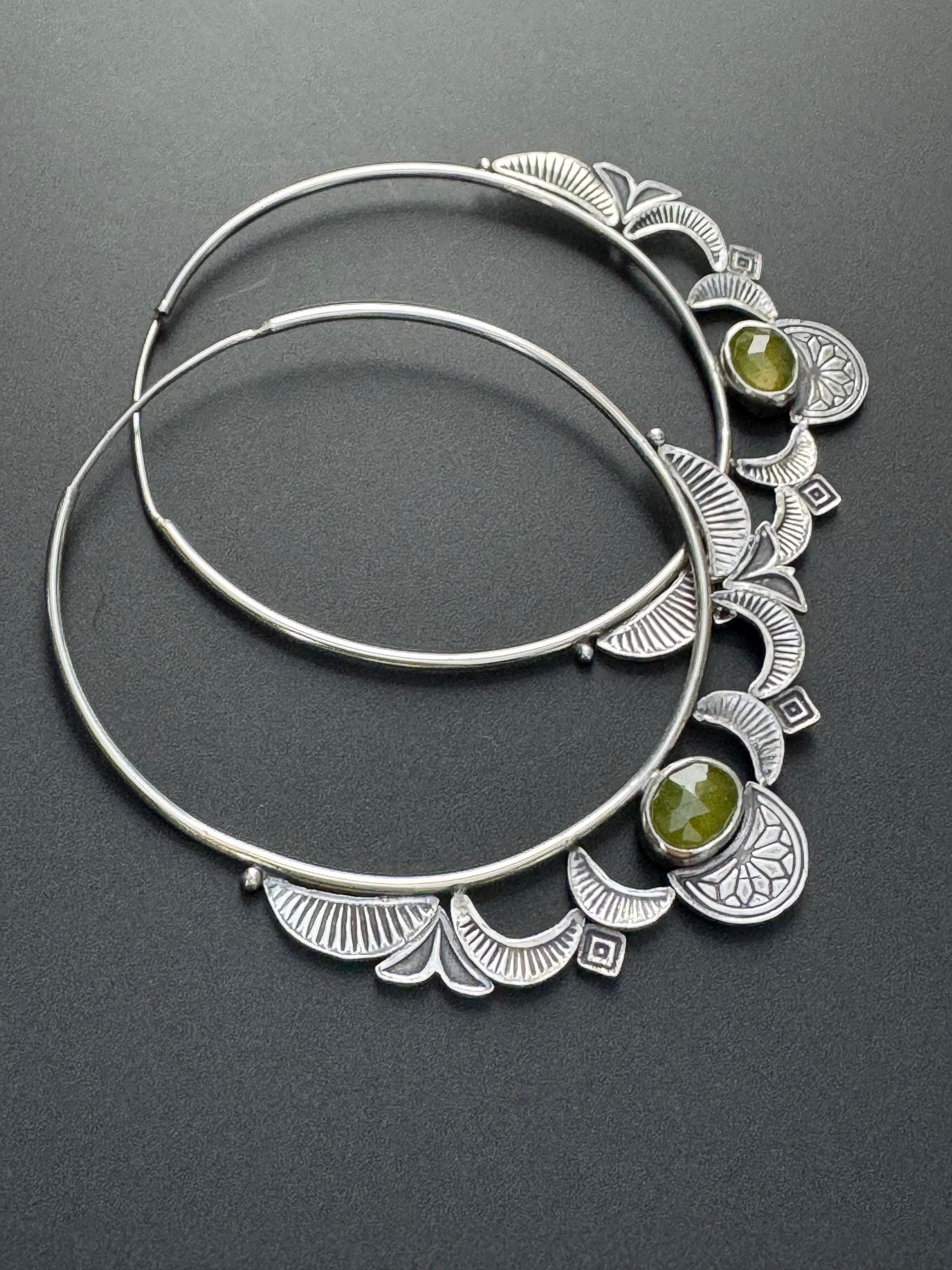 Hoops are the best! And these hoop earrings are made from sterling silver and each has a lovely green vesuvianite at the focal point. The hoops are 14 ga wire and feature a hand stamped design on each hoop. The design compliments the shape of the hoops really nicely. The ear wire portion is 20 ga. These are handmade and one of a kind earrings.
