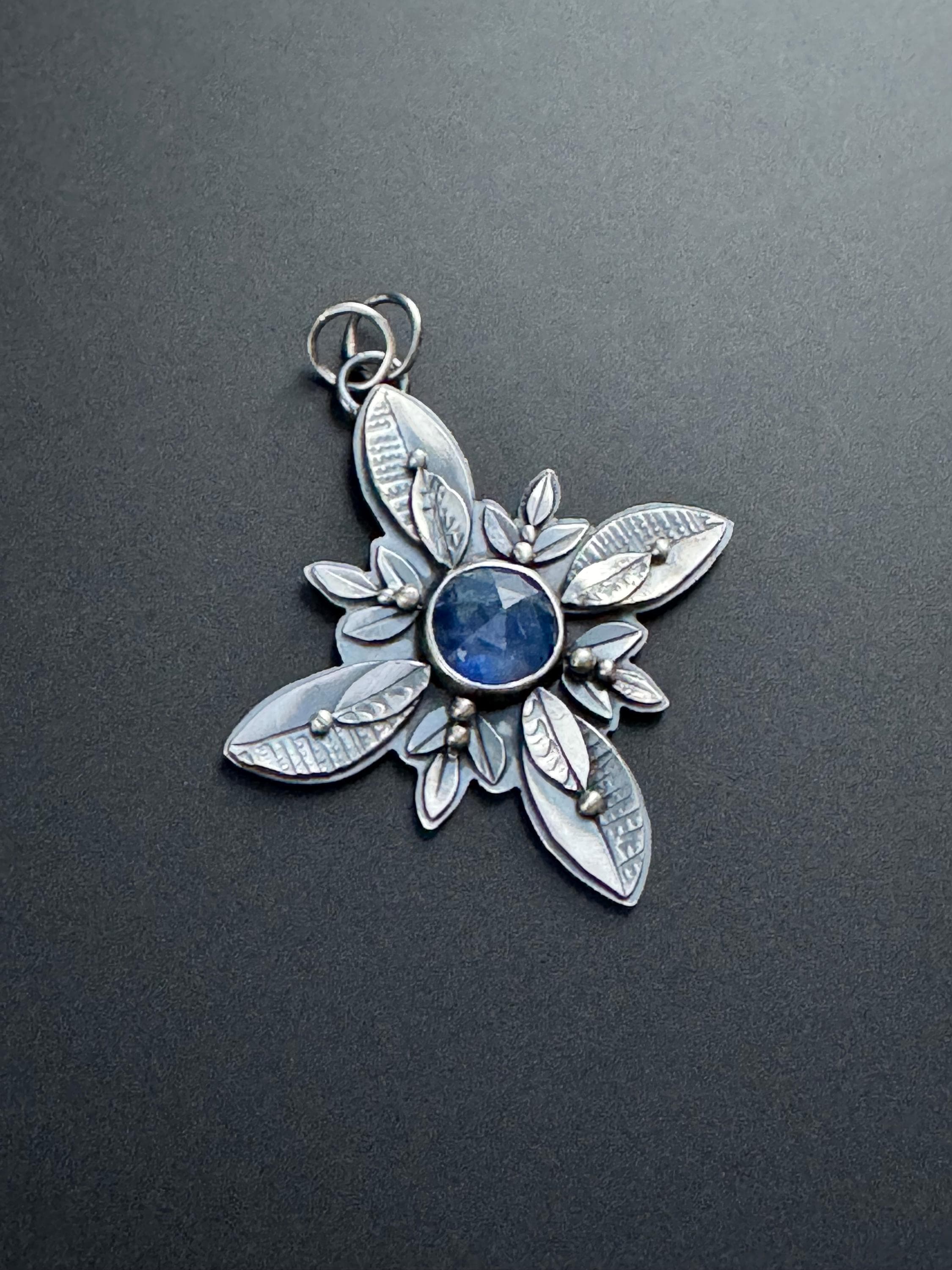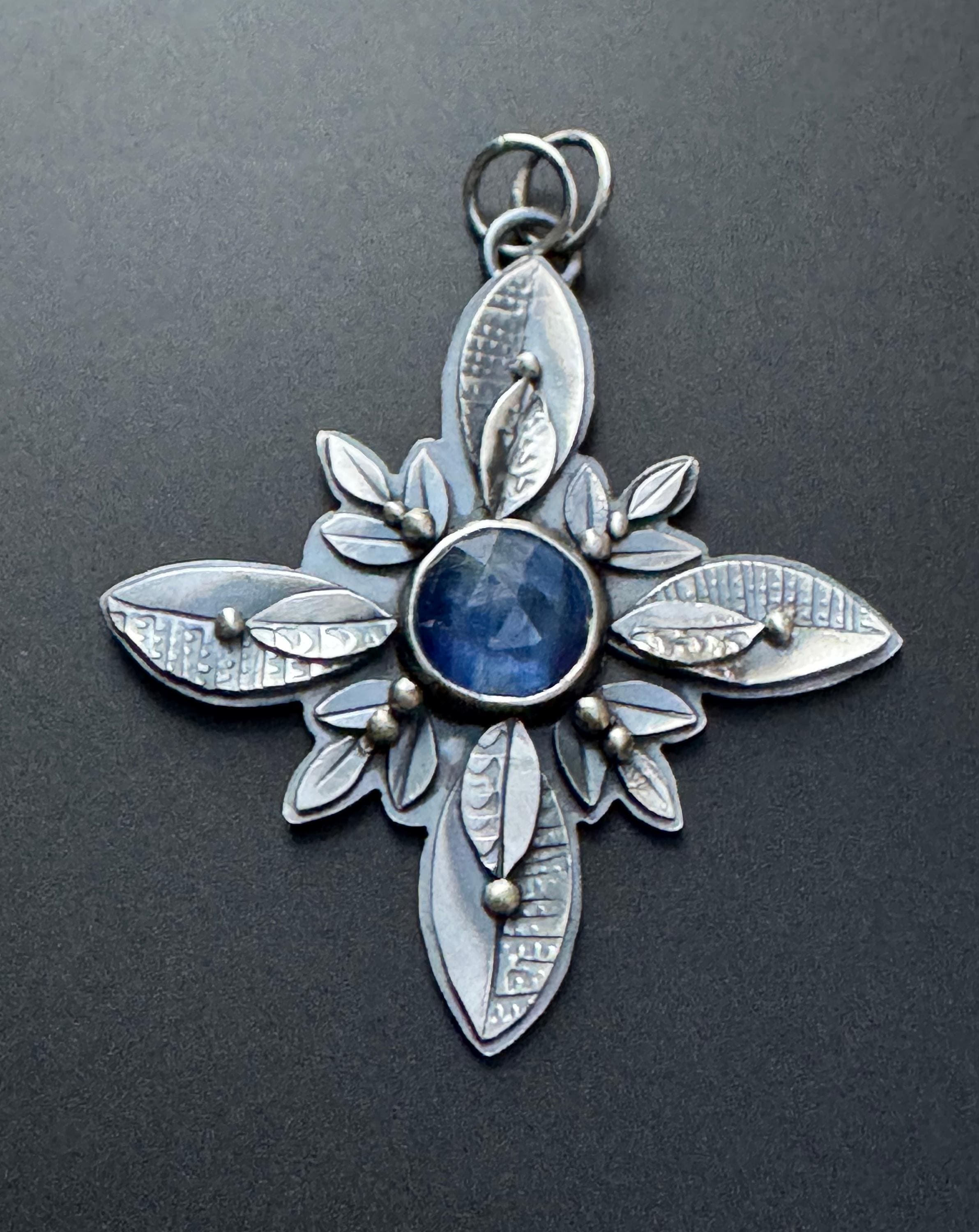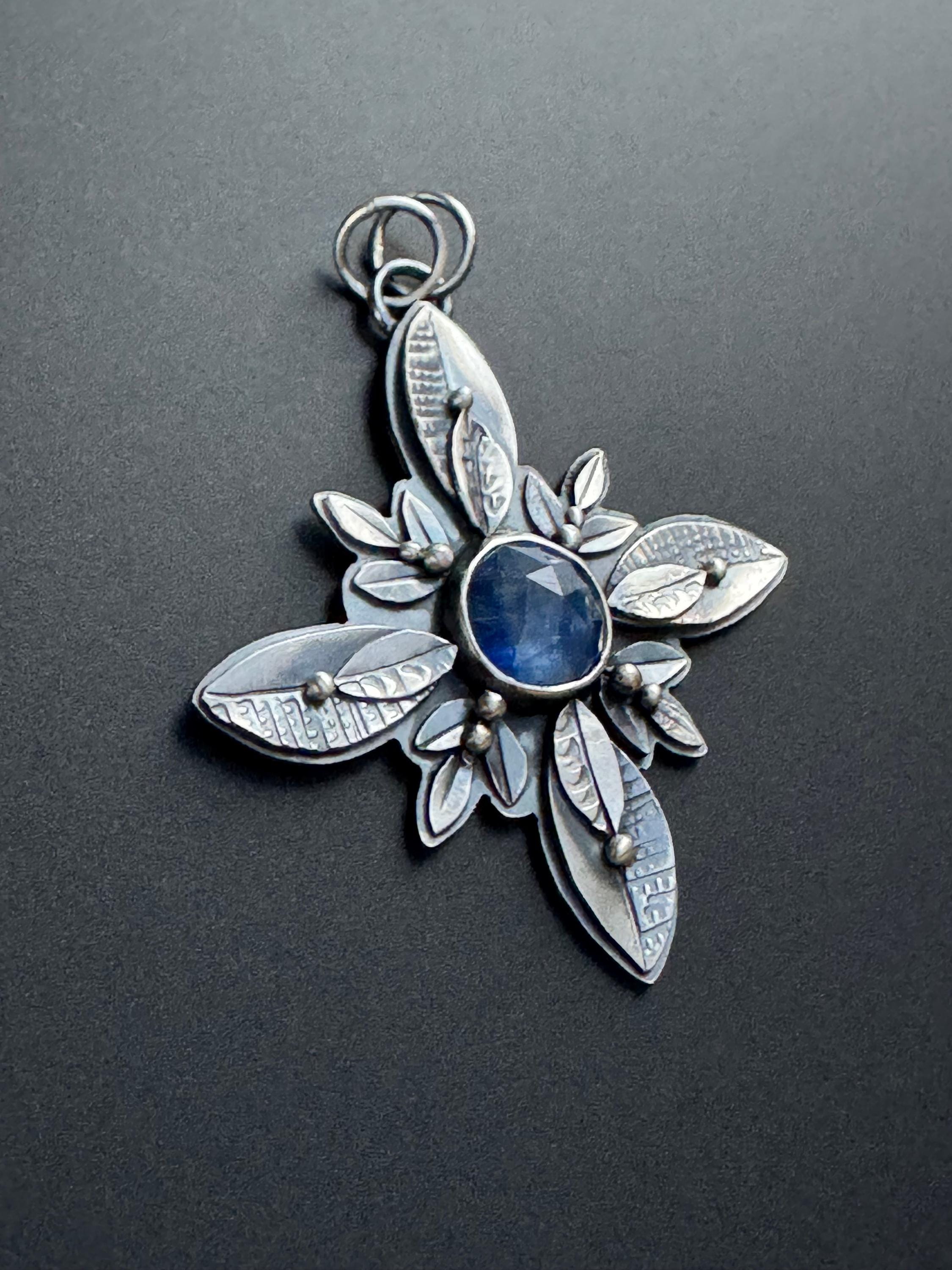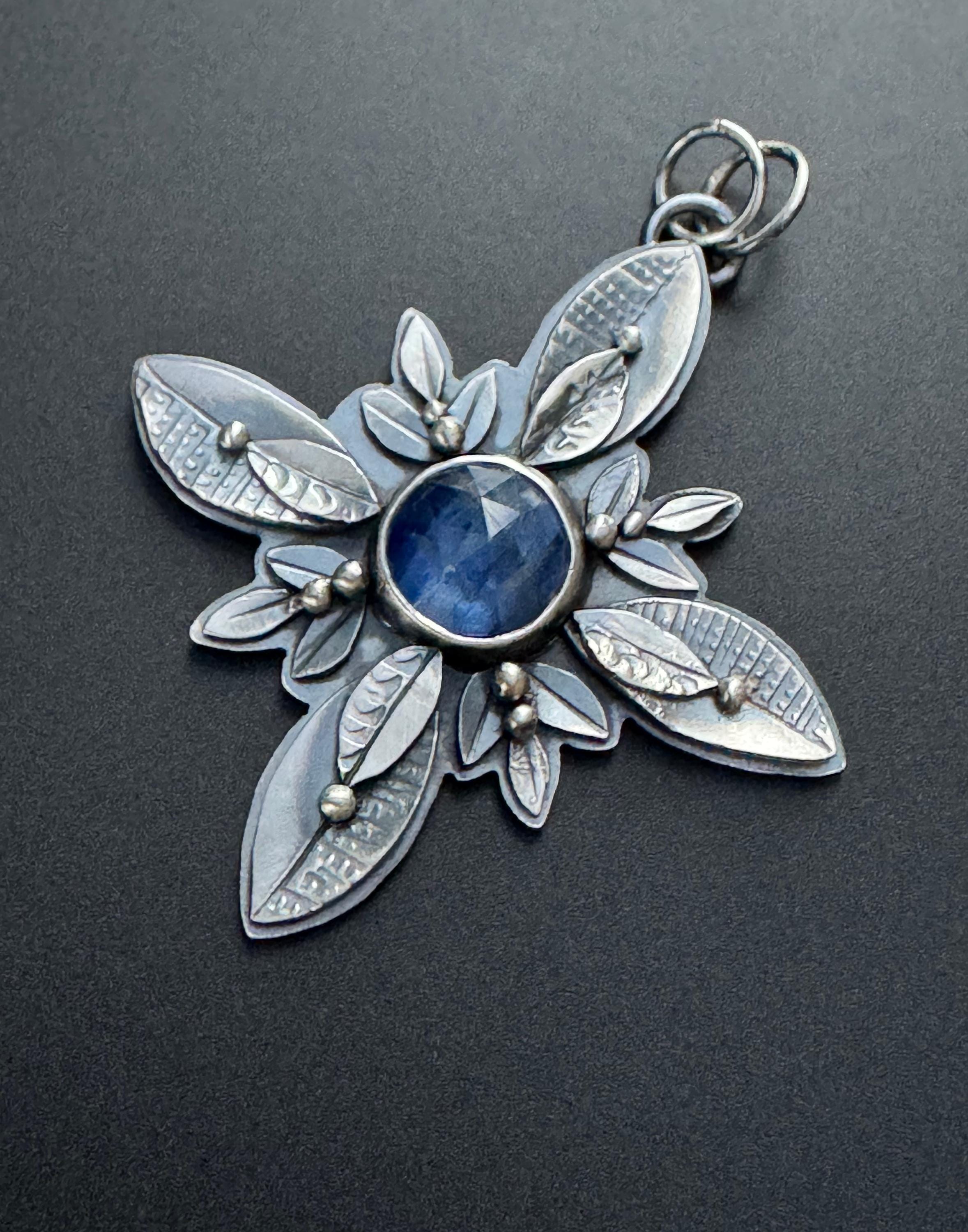 This unique piece is made from handmade leaves. Different sizes and textures come together with granules to create this lovely pattern. At the center is a blue kyanite - reminding me of a spring blossom. A patina is then applied and polished to bring out the details of the design. This is a handmade piece and one of a kind.