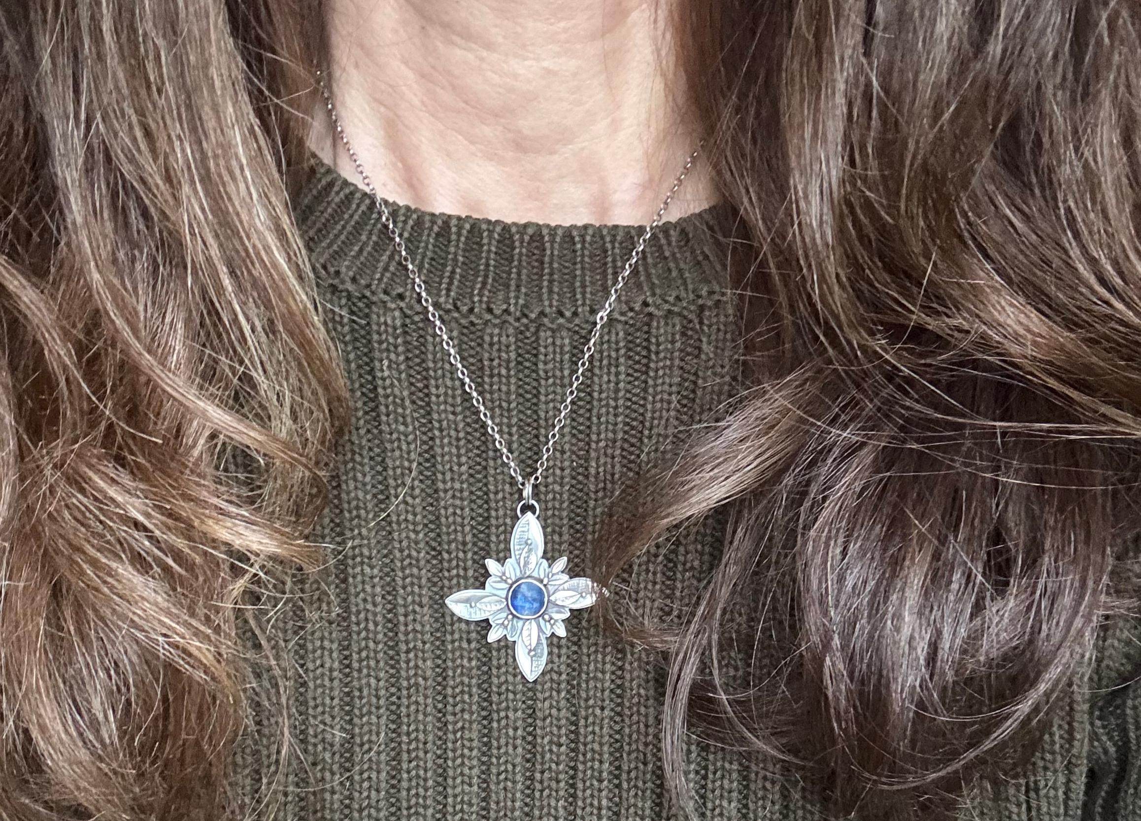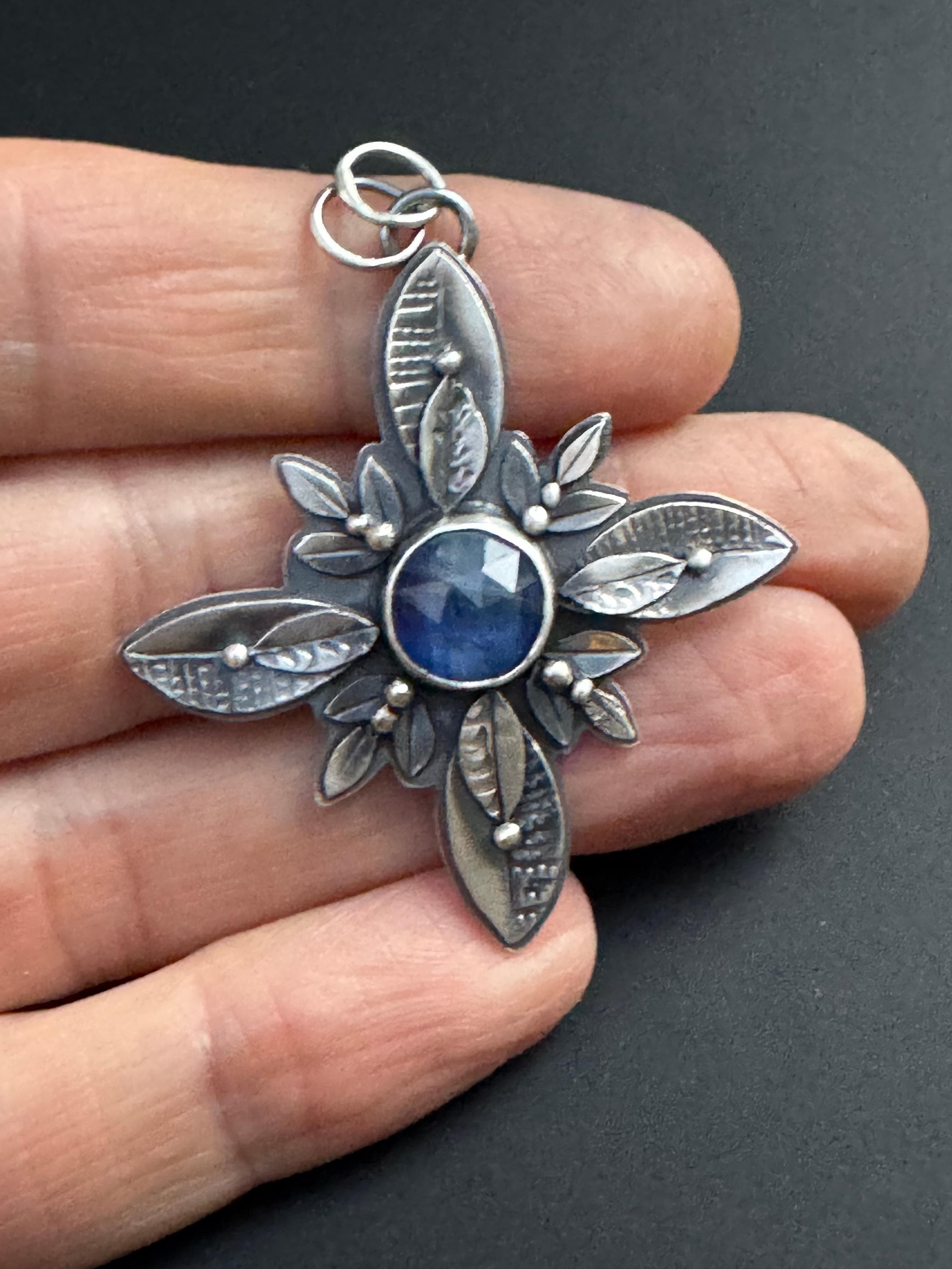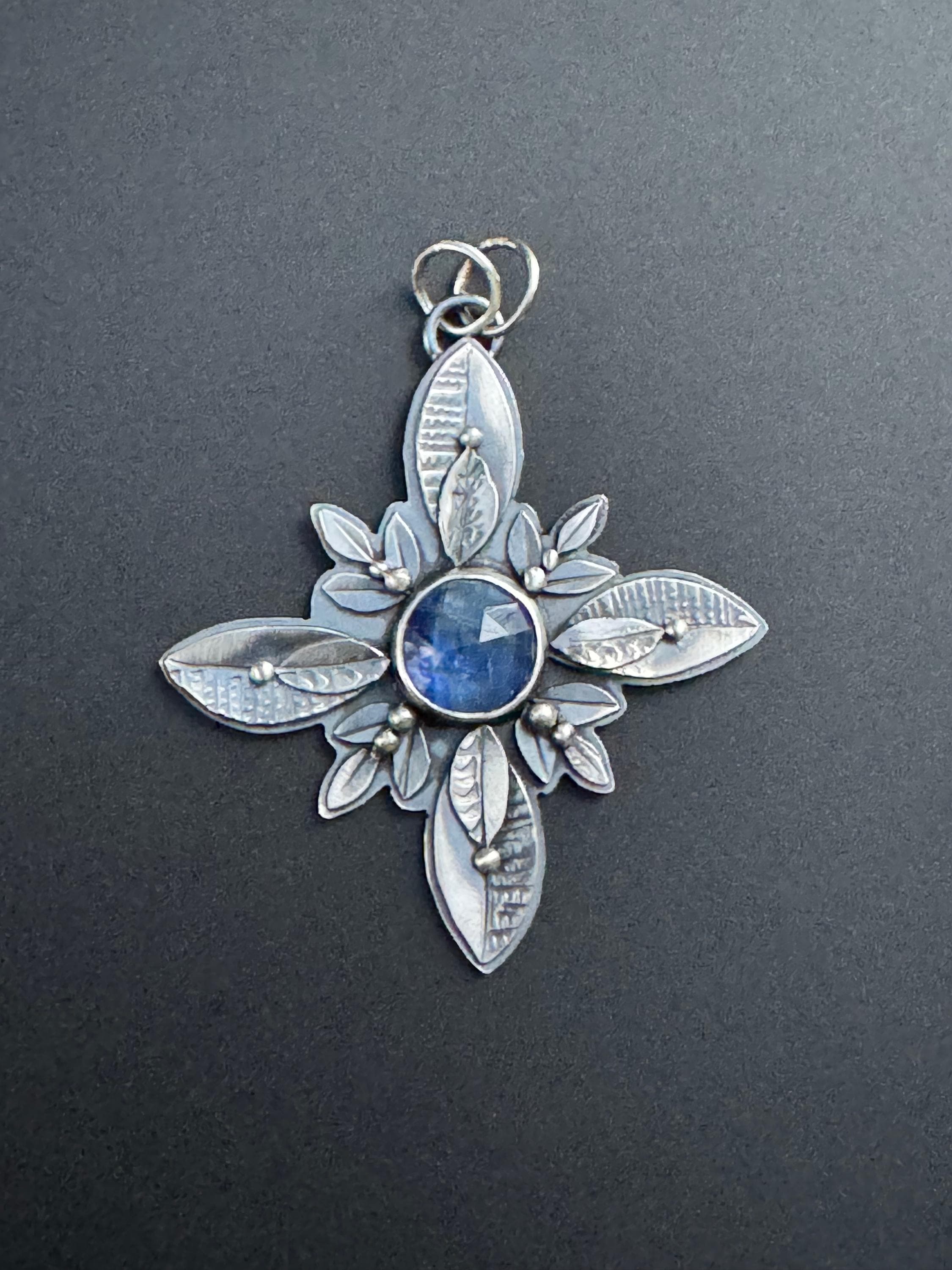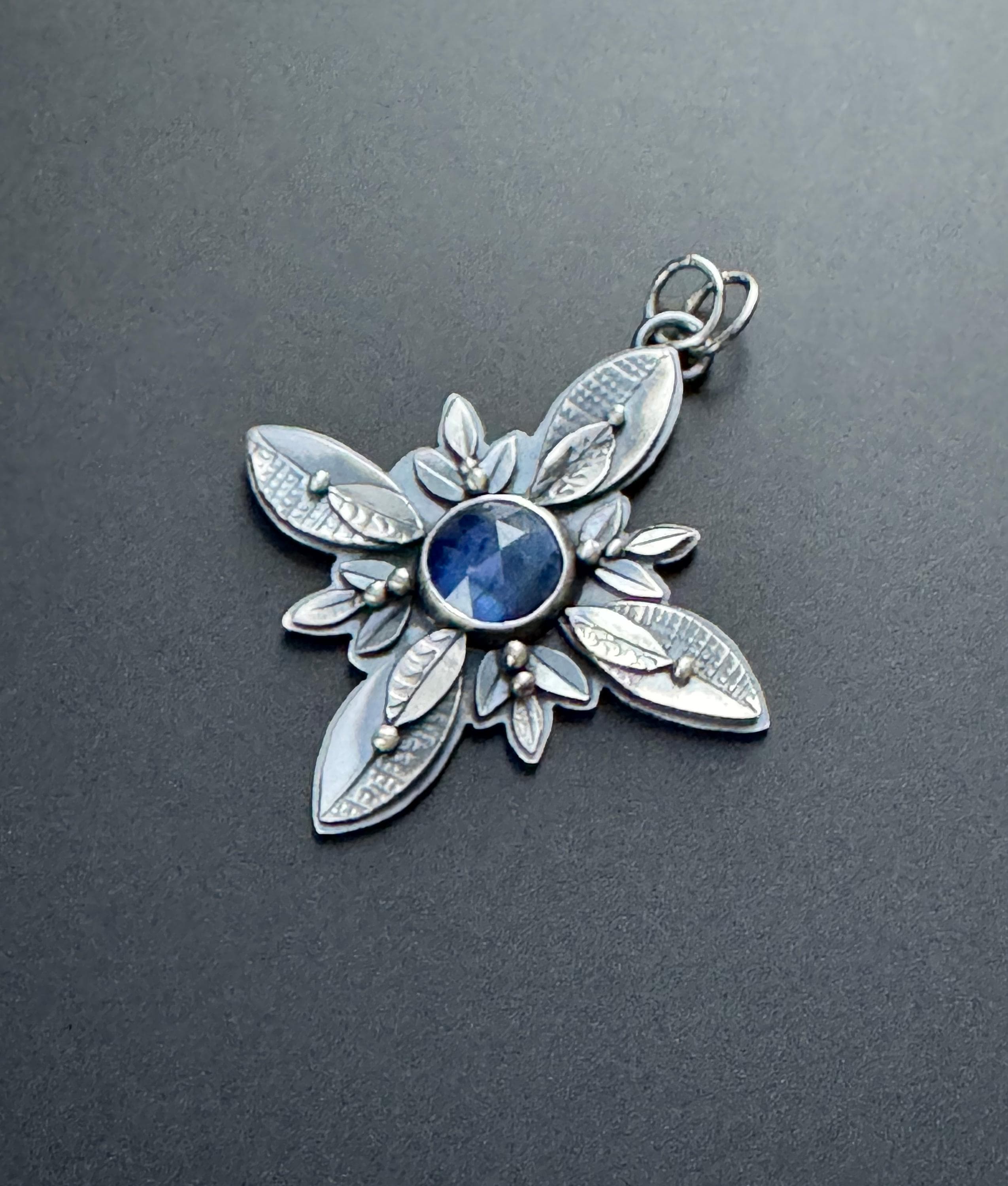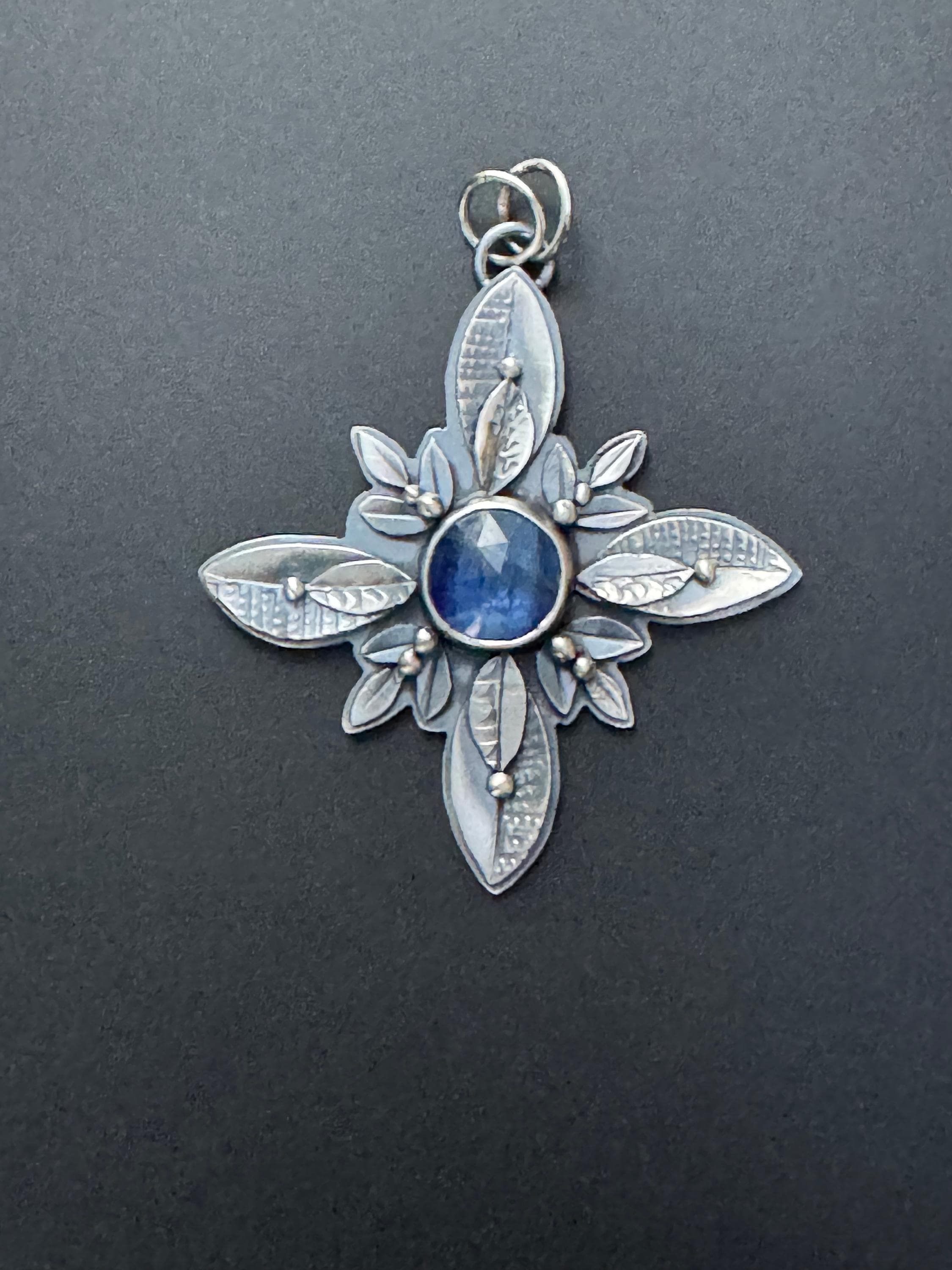 This unique piece is made from handmade leaves. Different sizes and textures come together with granules to create this lovely pattern. At the center is a blue kyanite - reminding me of a spring blossom. A patina is then applied and polished to bring out the details of the design. This is a handmade piece and one of a kind.