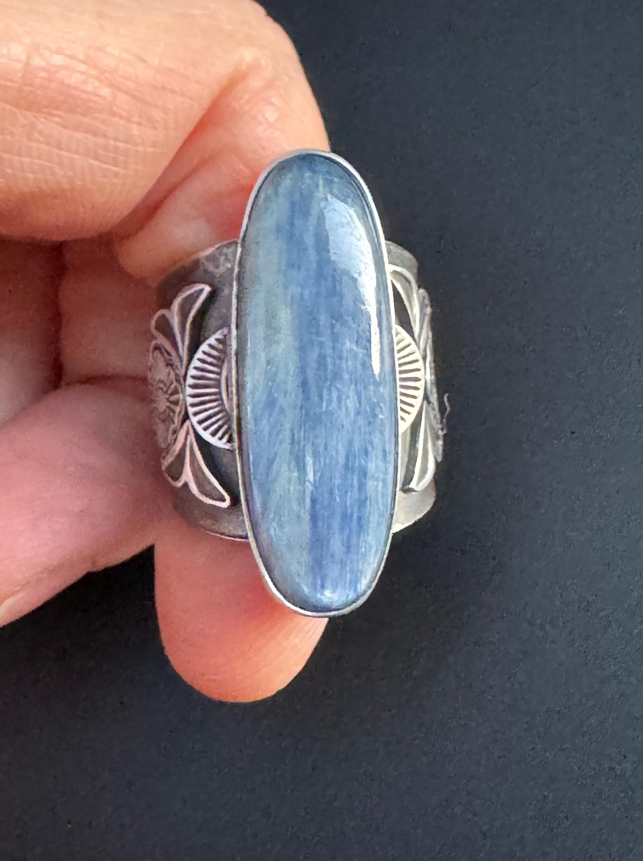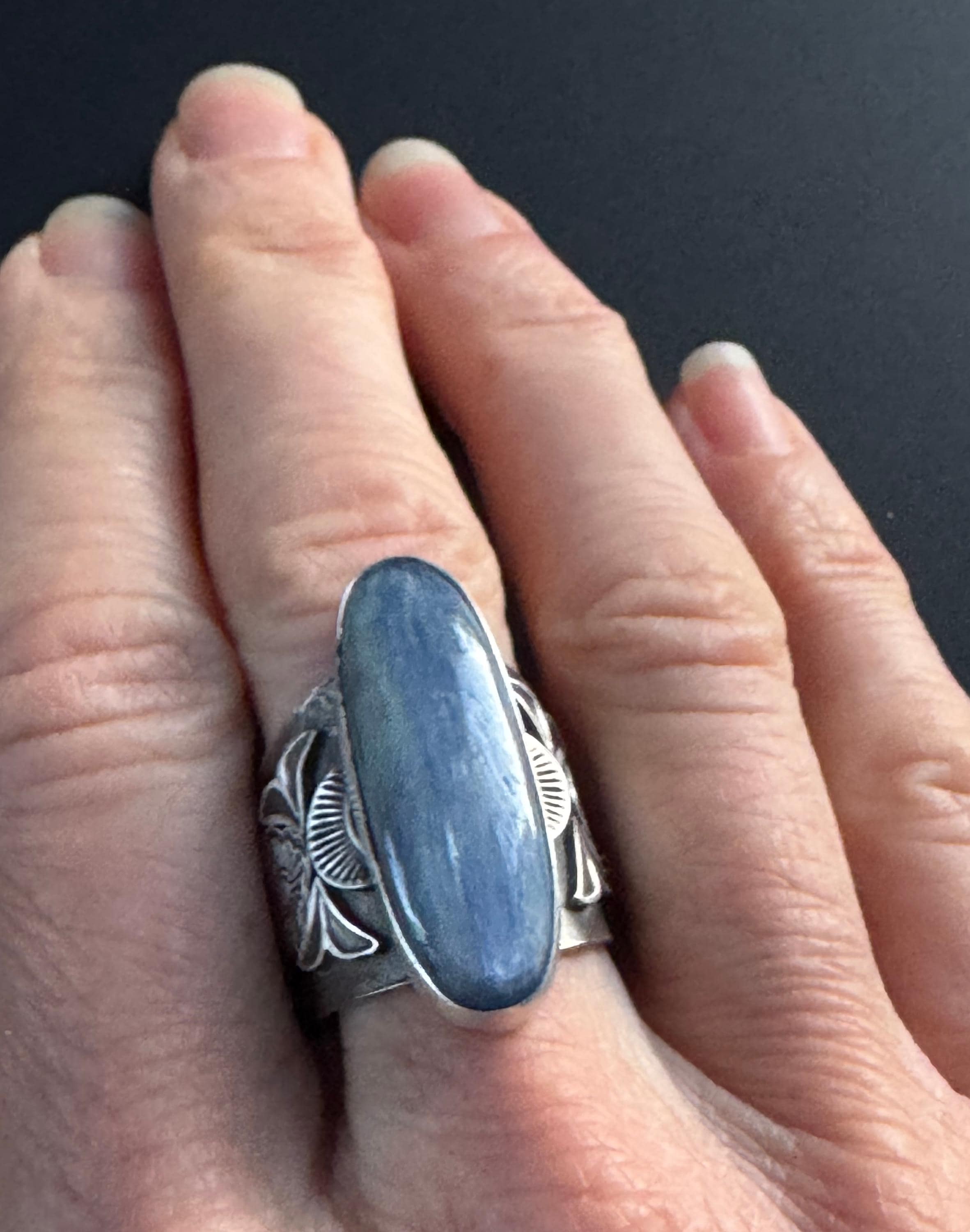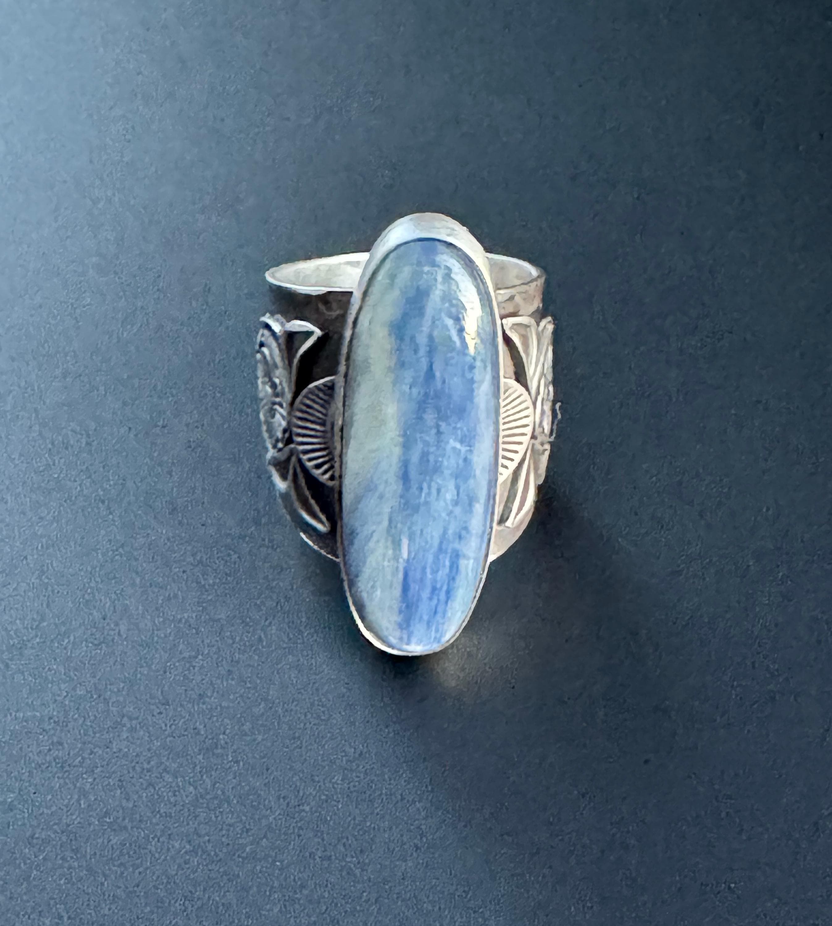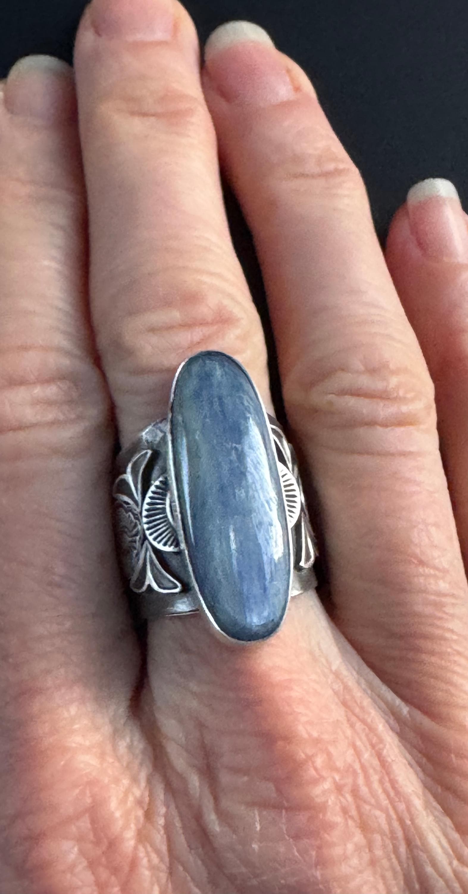 This is a lovely kyanite ring, made from sterling silver. It's handmade with a stamped design encircling the band to create a beautiful pattern and texture. The kyanite stone is quite beautiful and sits a top of the design. This ring is a tapered fit and feels really good on. It is a one of a kind piece.