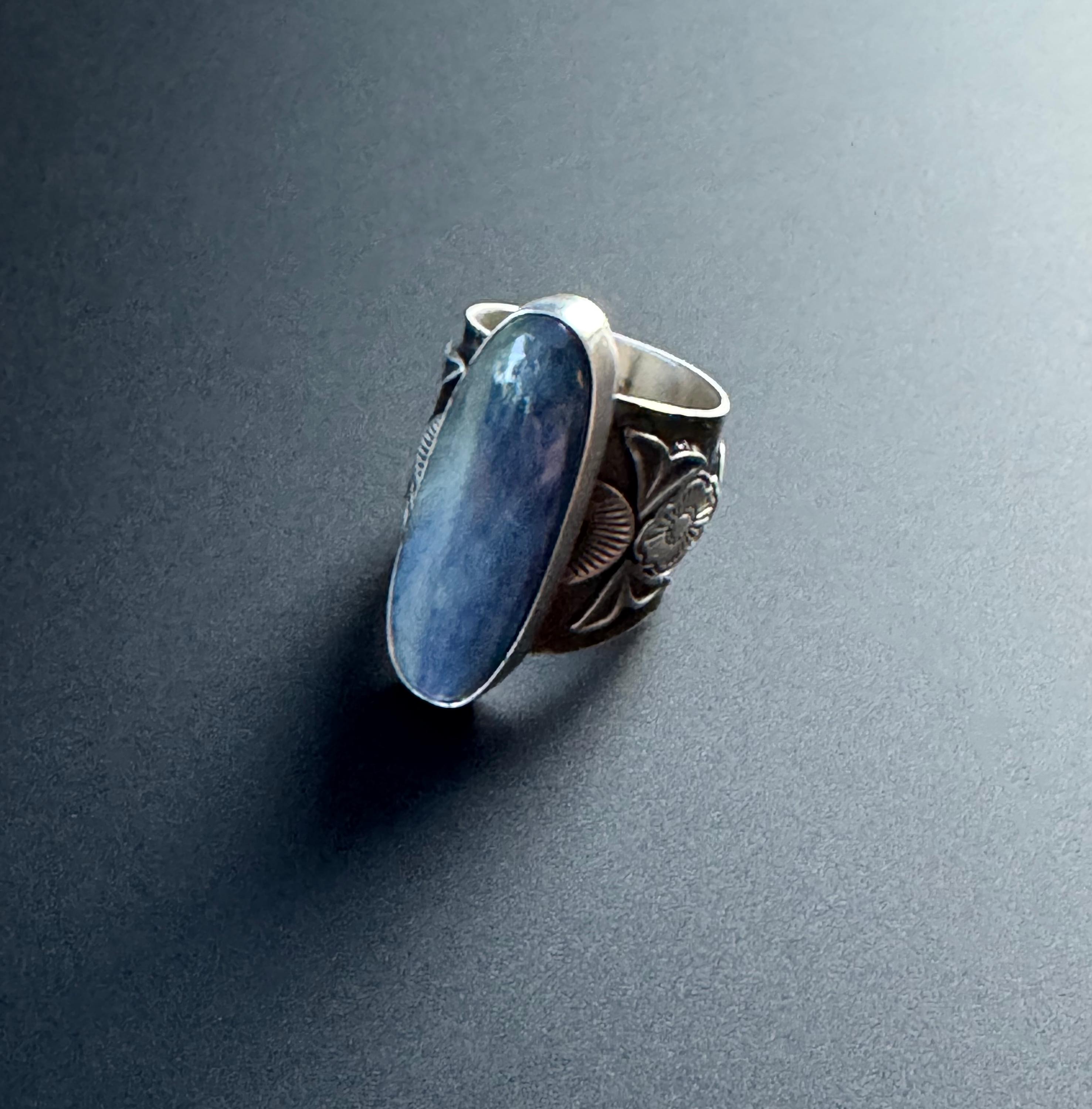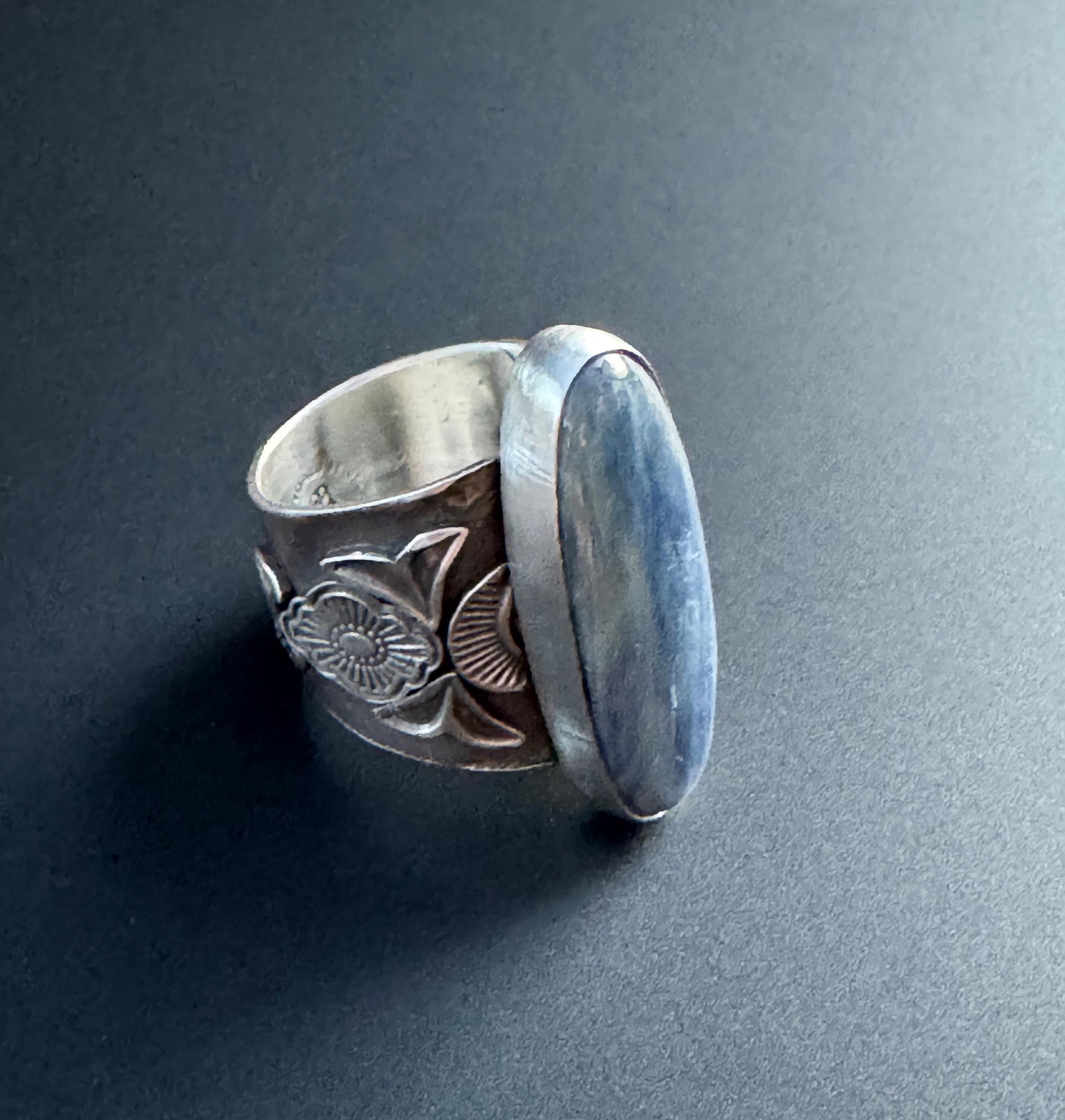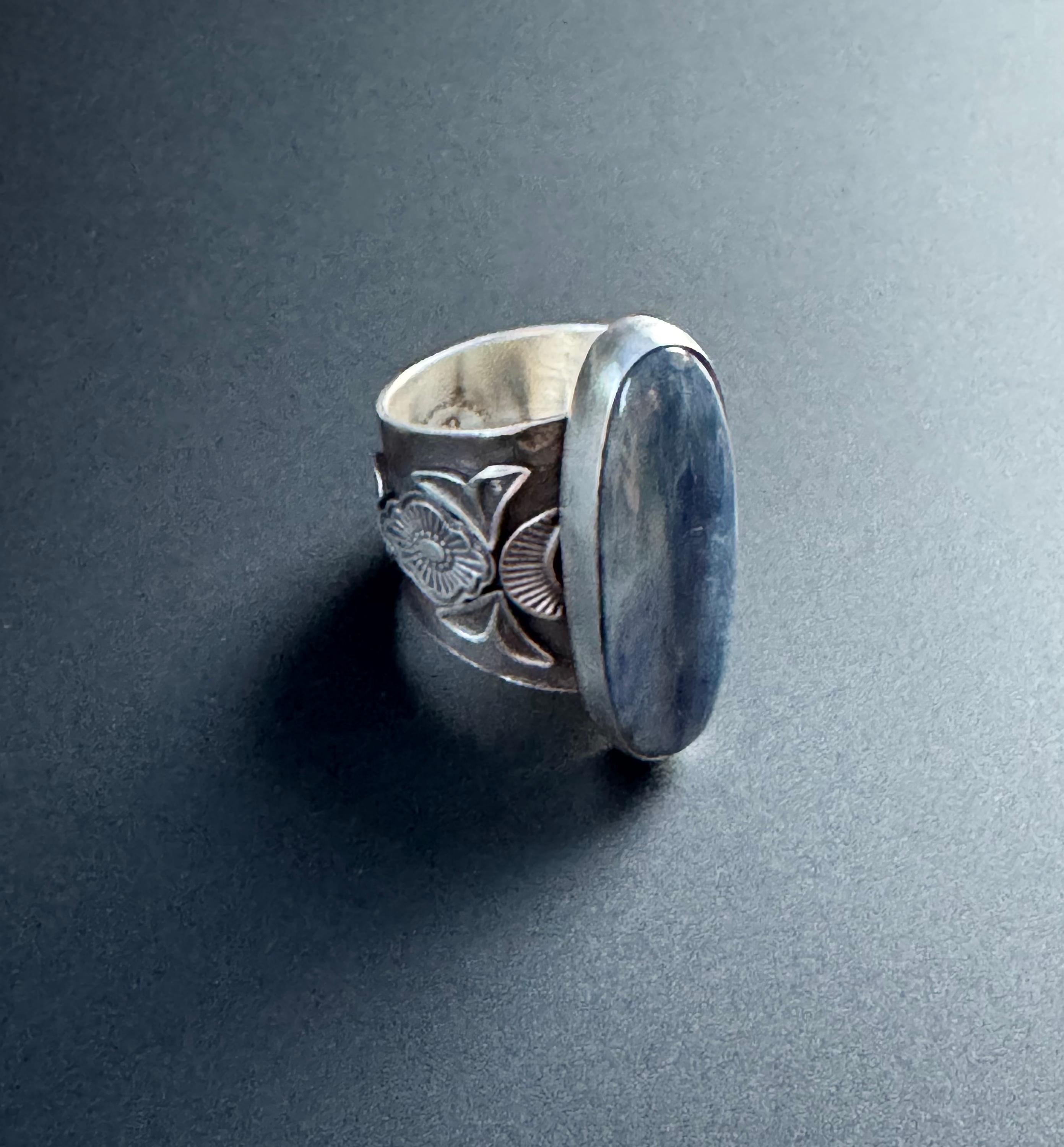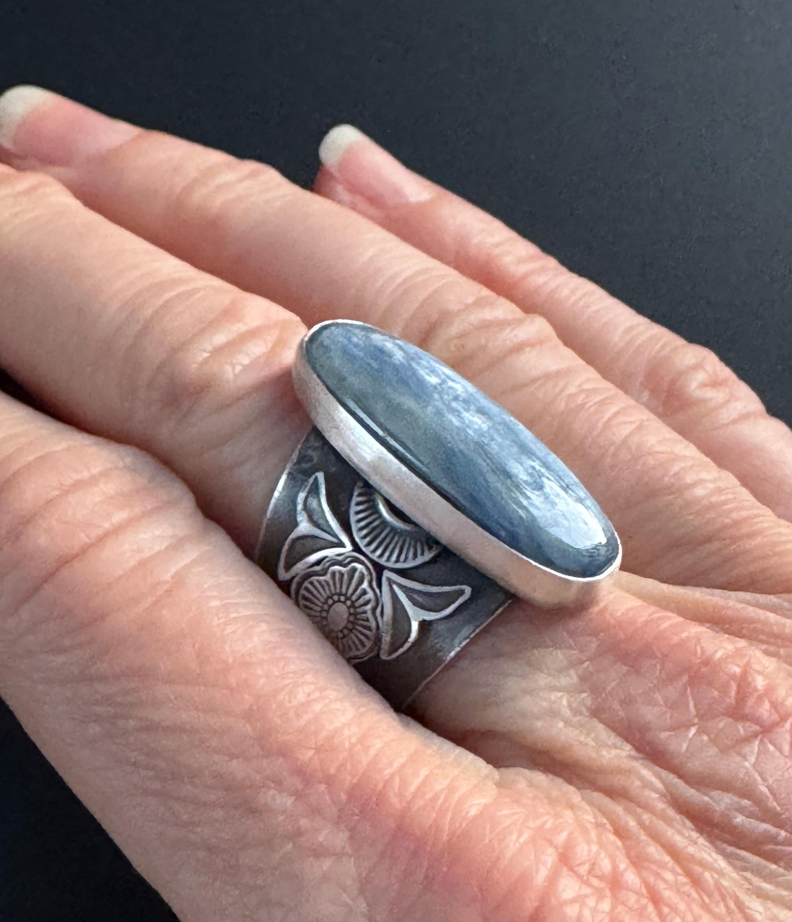 This is a lovely kyanite ring, made from sterling silver. It's handmade with a stamped design encircling the band to create a beautiful pattern and texture. The kyanite stone is quite beautiful and sits a top of the design. This ring is a tapered fit and feels really good on. It is a one of a kind piece.