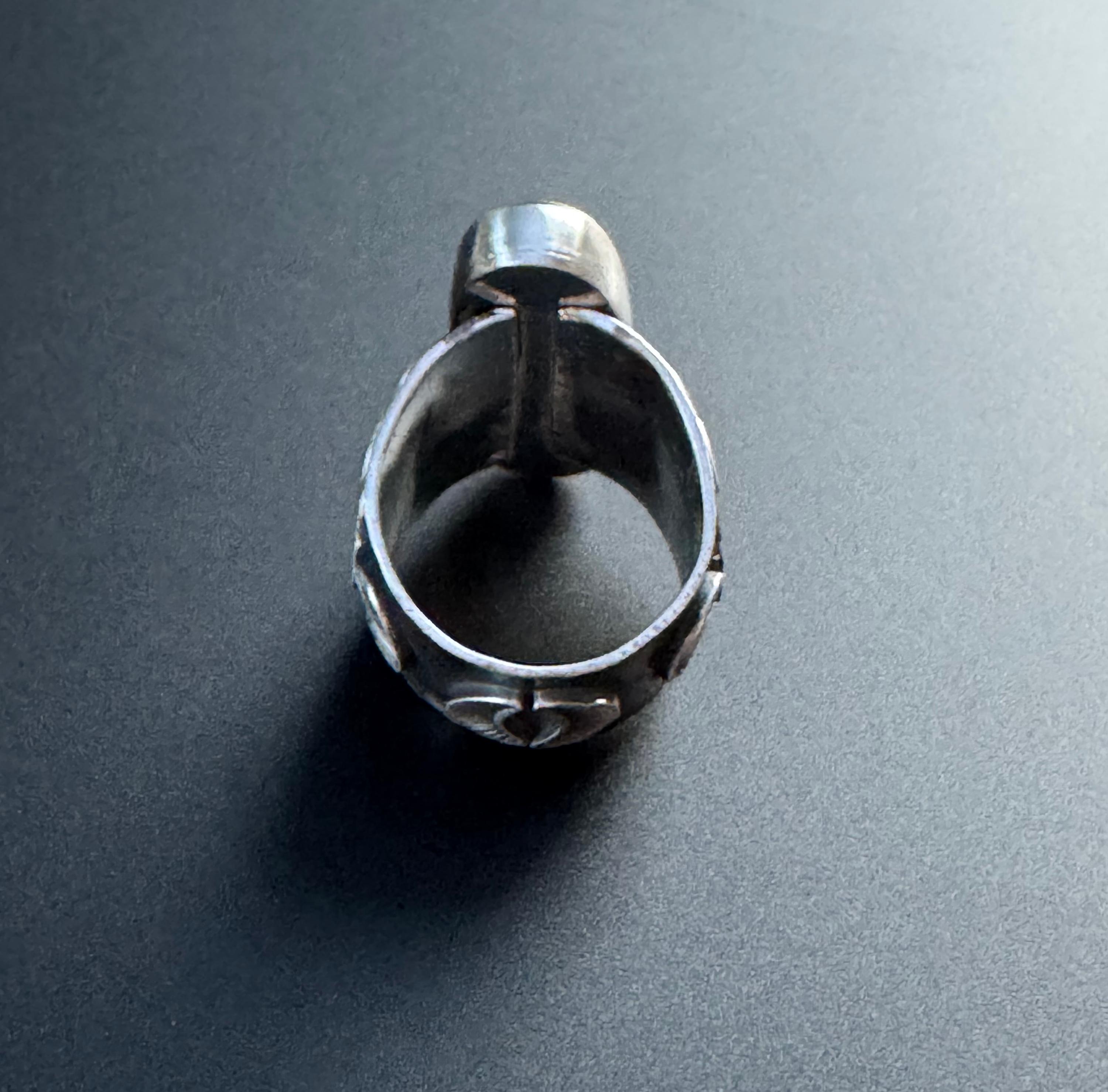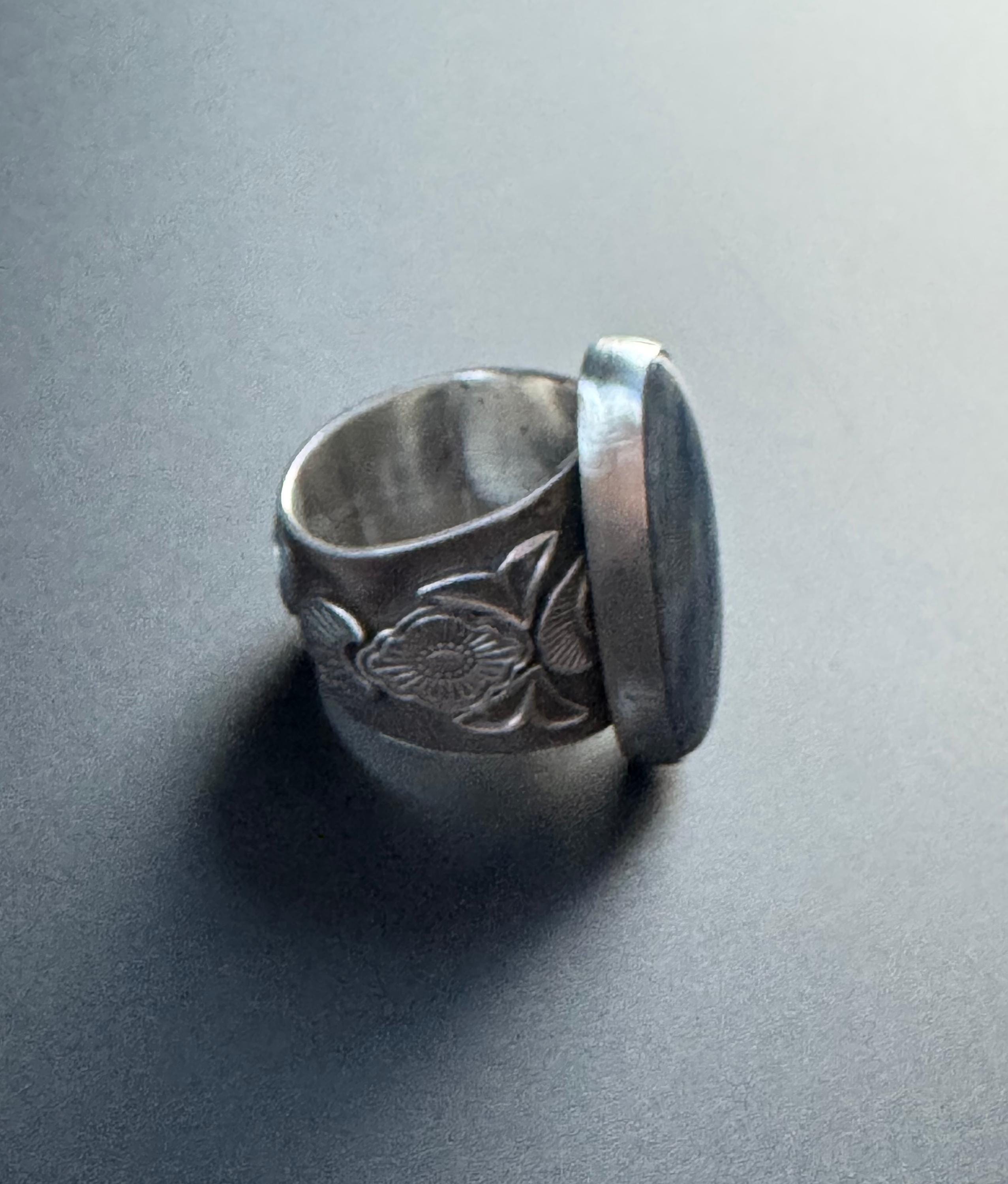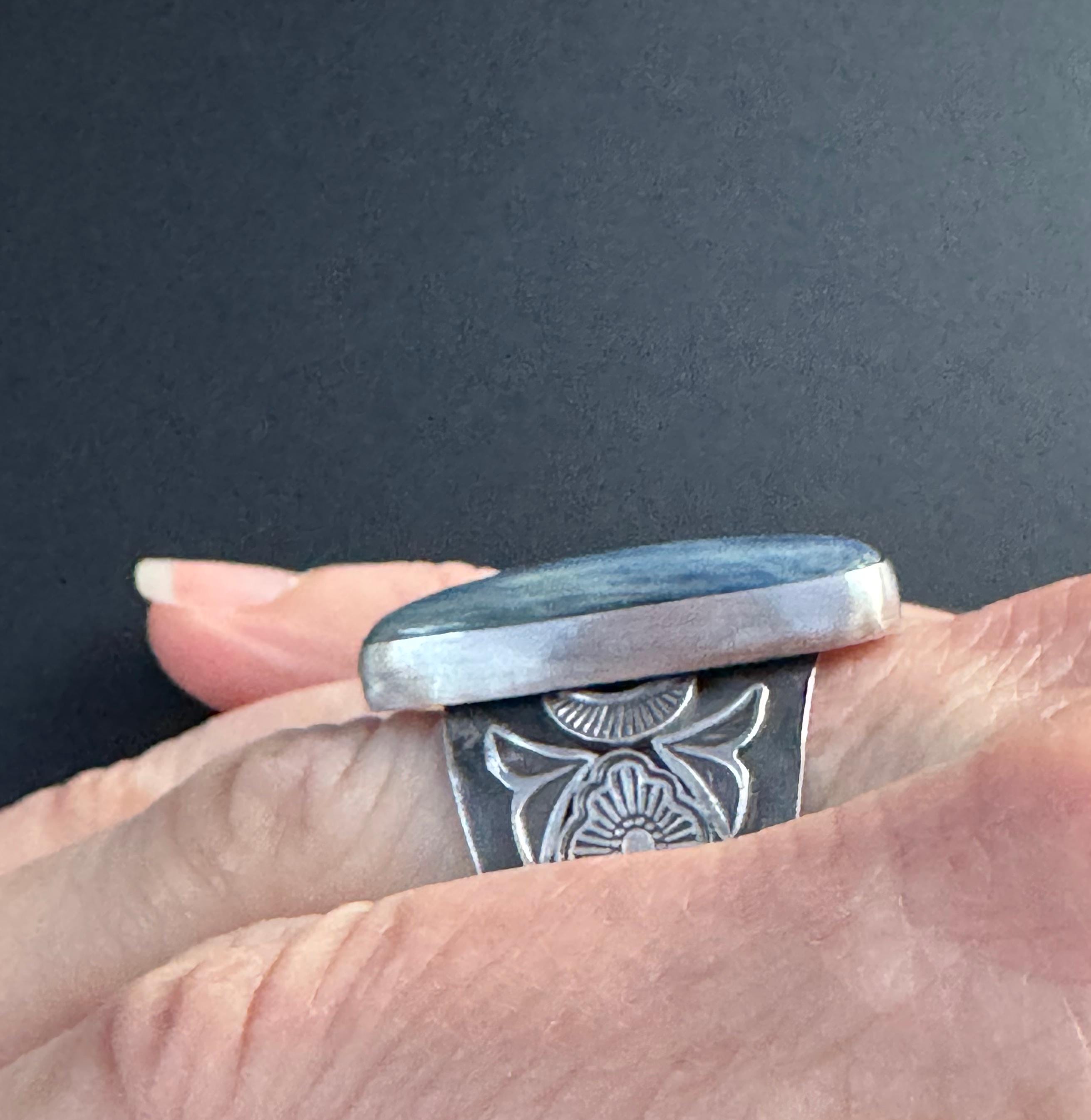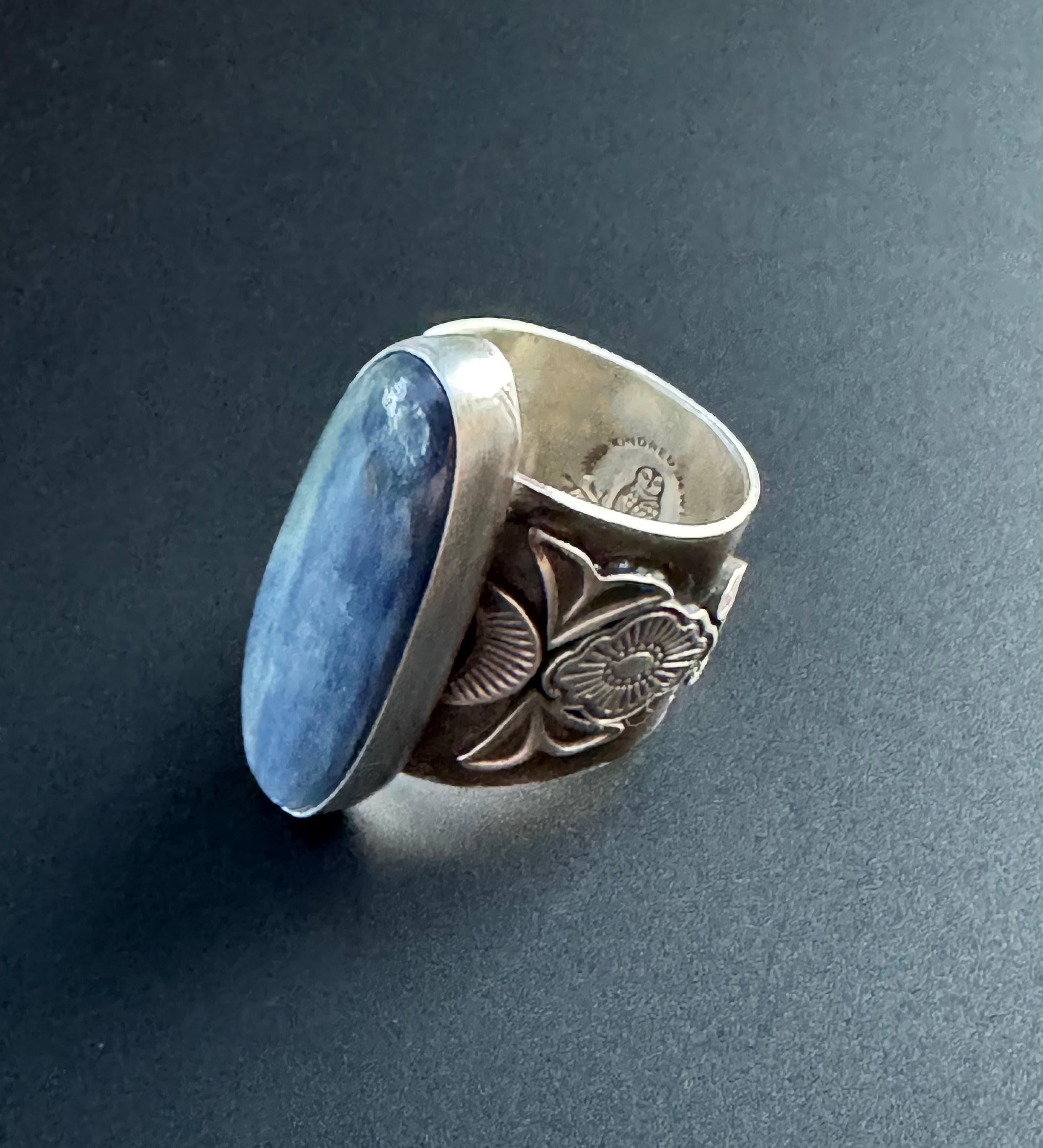 This is a lovely kyanite ring, made from sterling silver. It's handmade with a stamped design encircling the band to create a beautiful pattern and texture. The kyanite stone is quite beautiful and sits a top of the design. This ring is a tapered fit and feels really good on. It is a one of a kind piece.