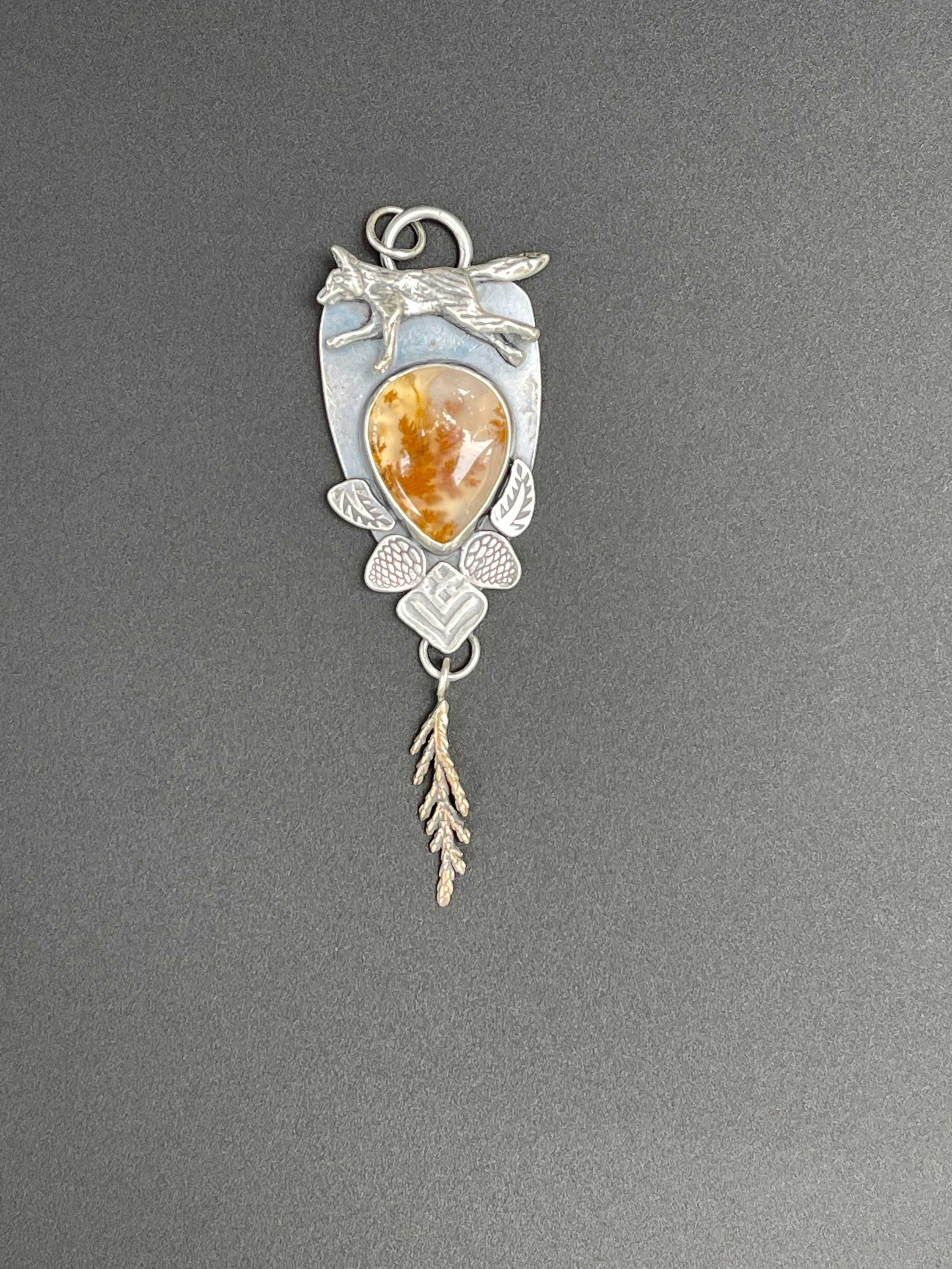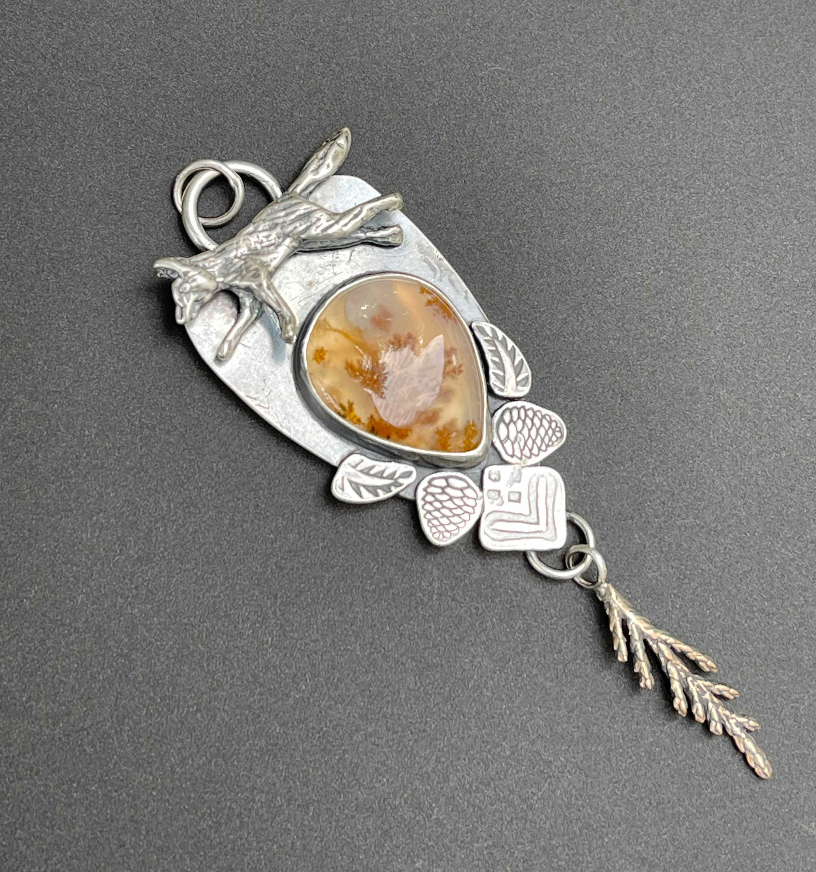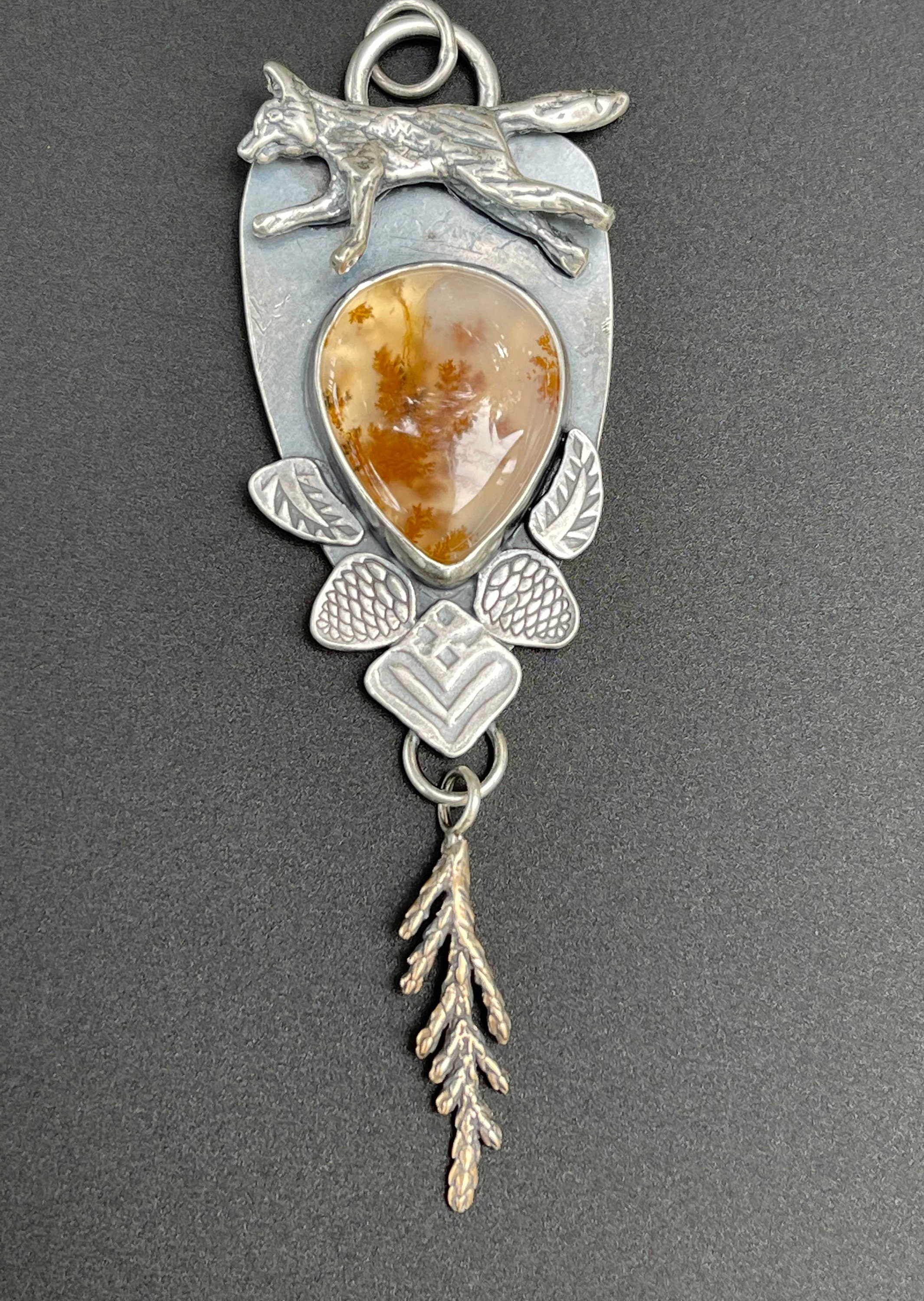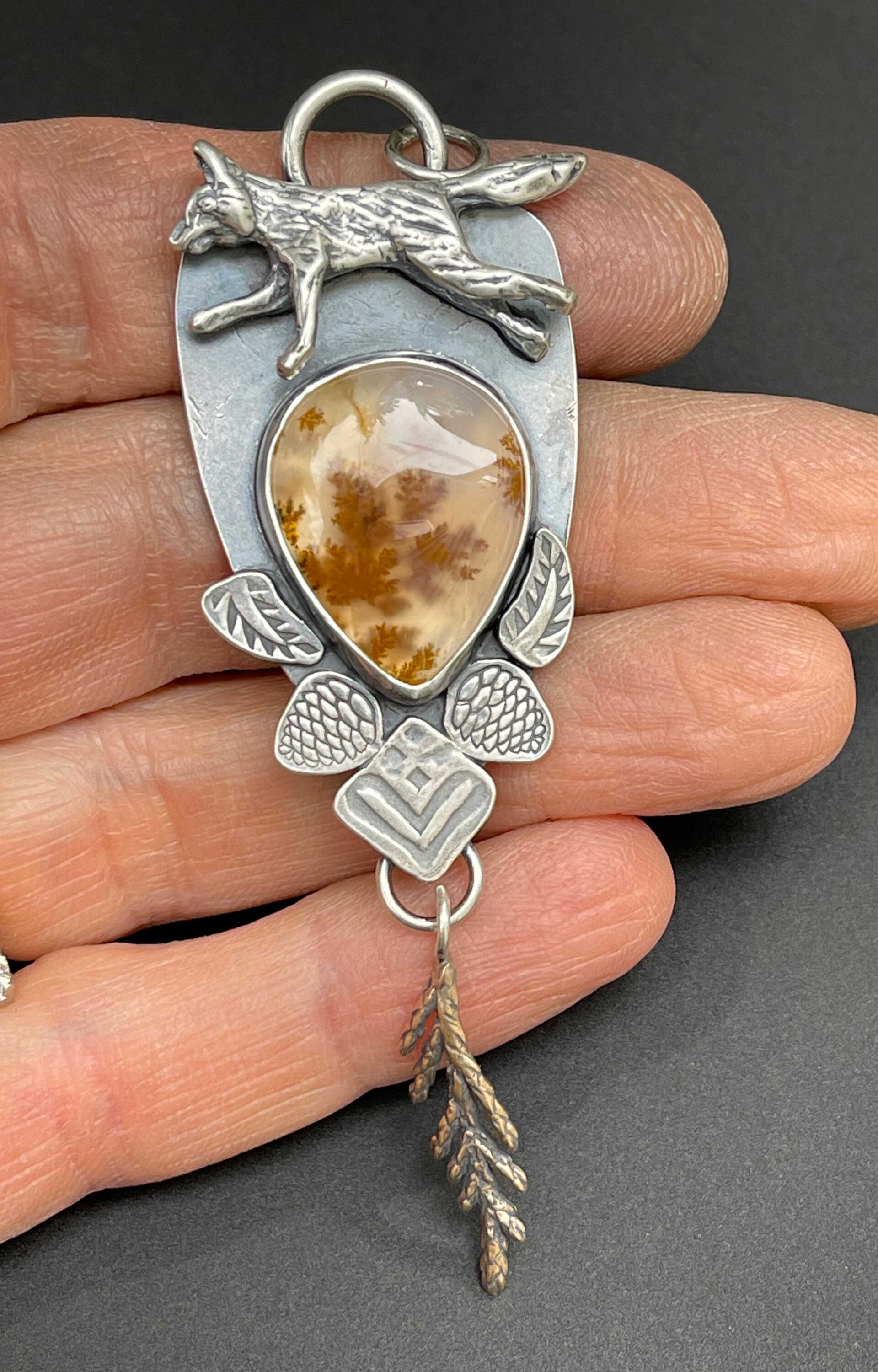 This is a solid sterling silver fox jumping over a beautiful dendritic agate cabochon. The pendant has hand stamped accents that are reminiscent of the forest, which is the home of the fox. Hanging from the pendant is a brass cedar leaf complementing the piece nicely.
