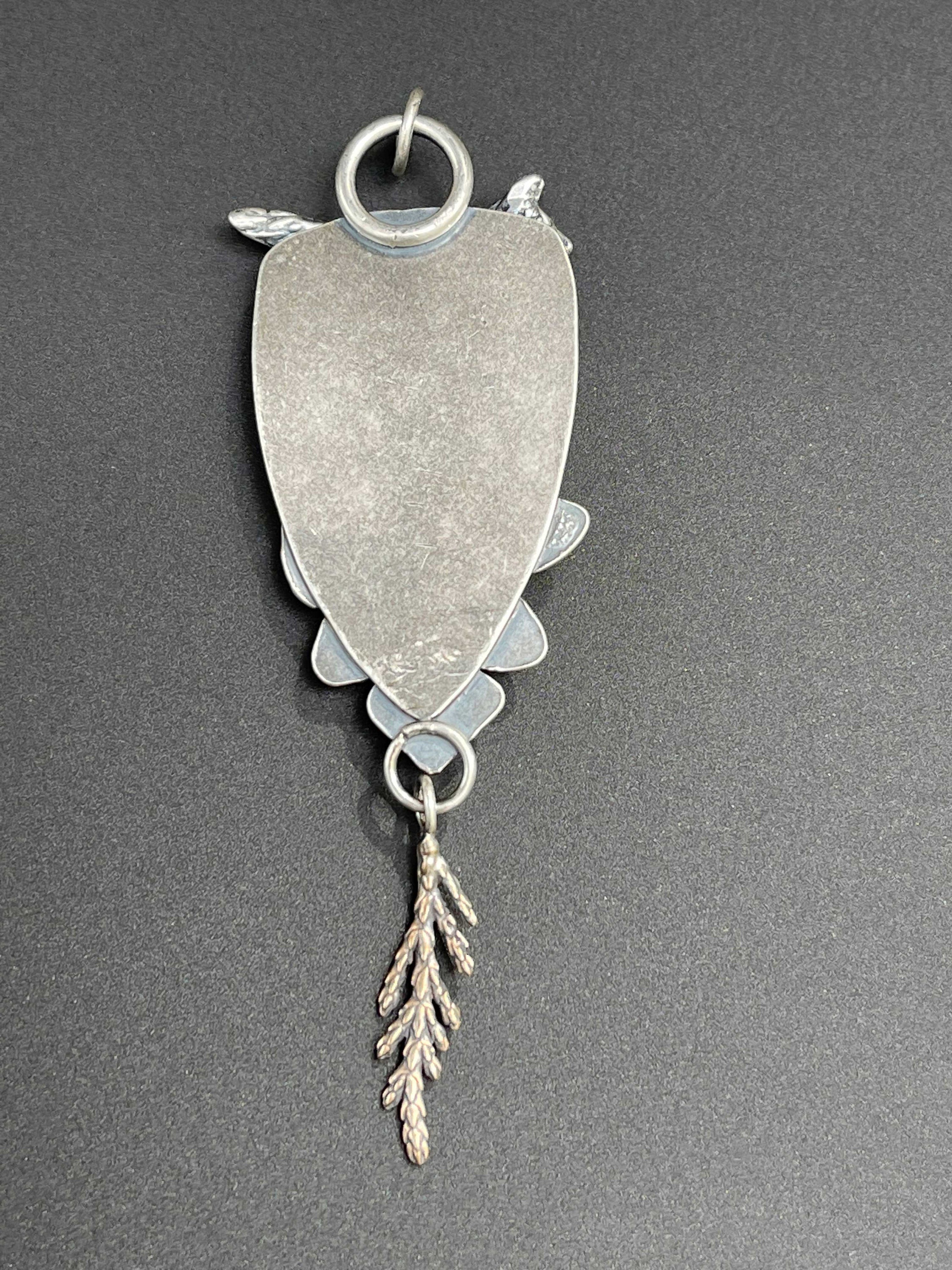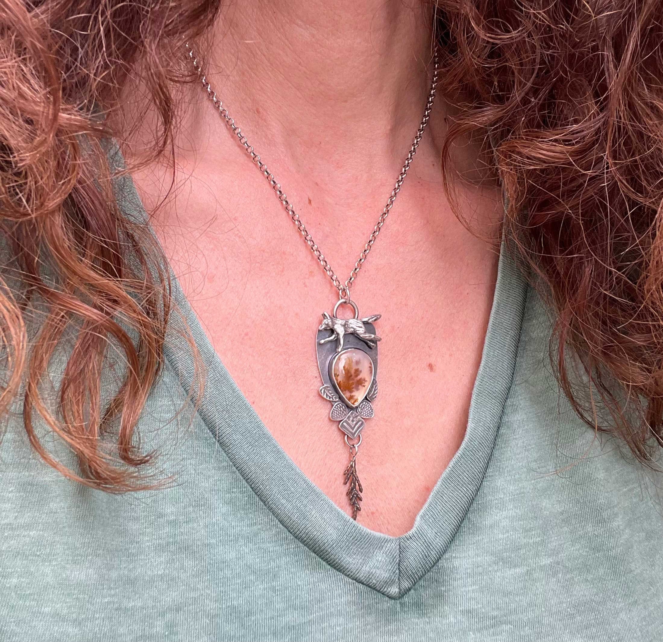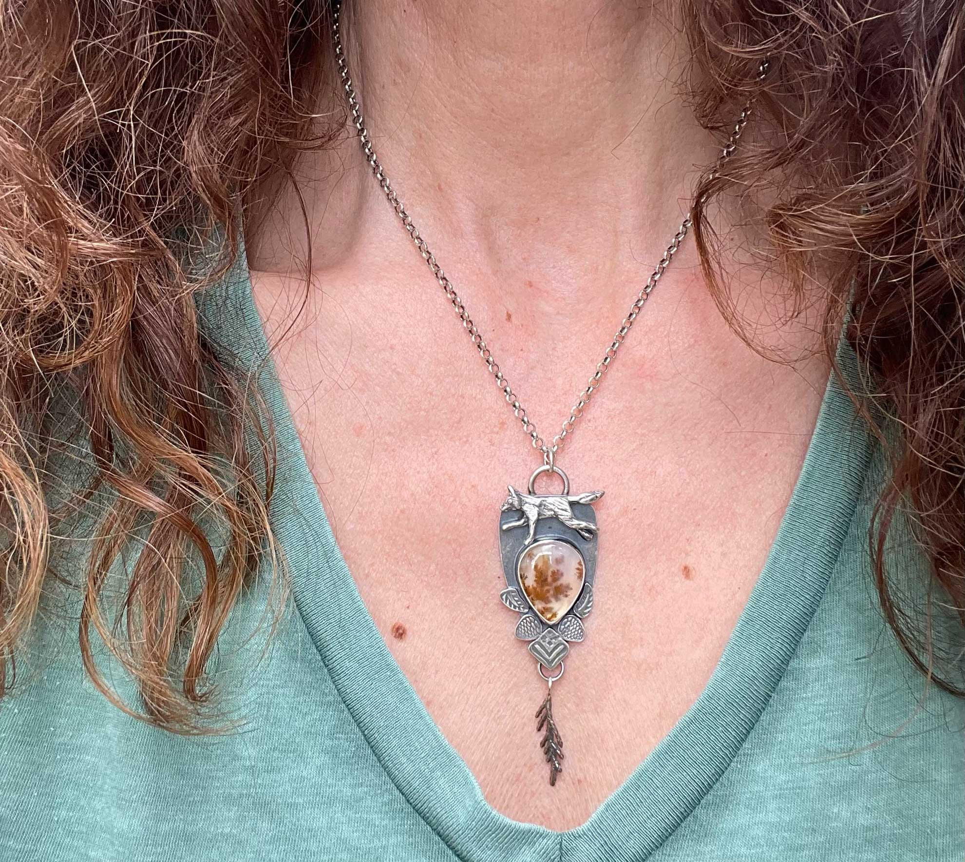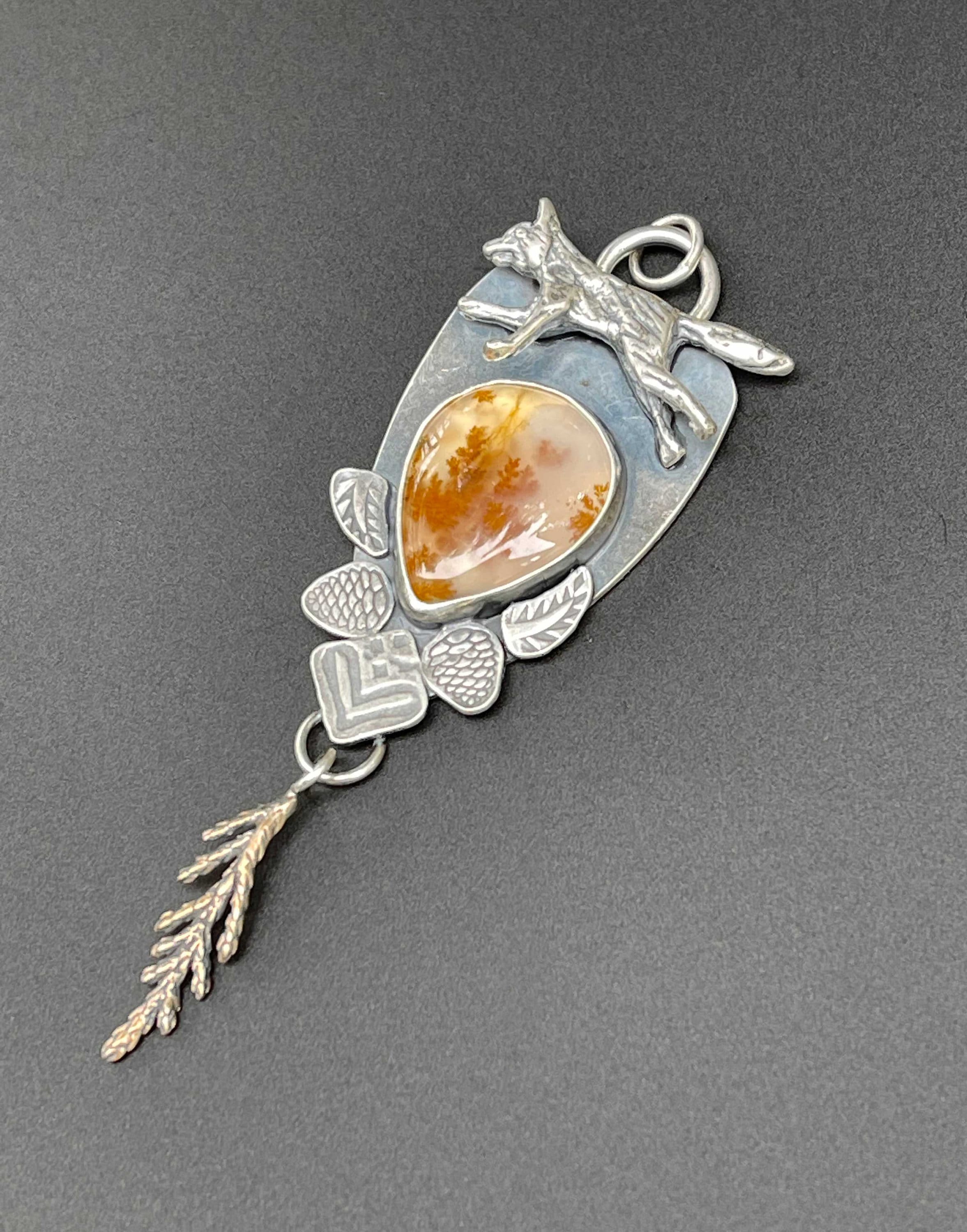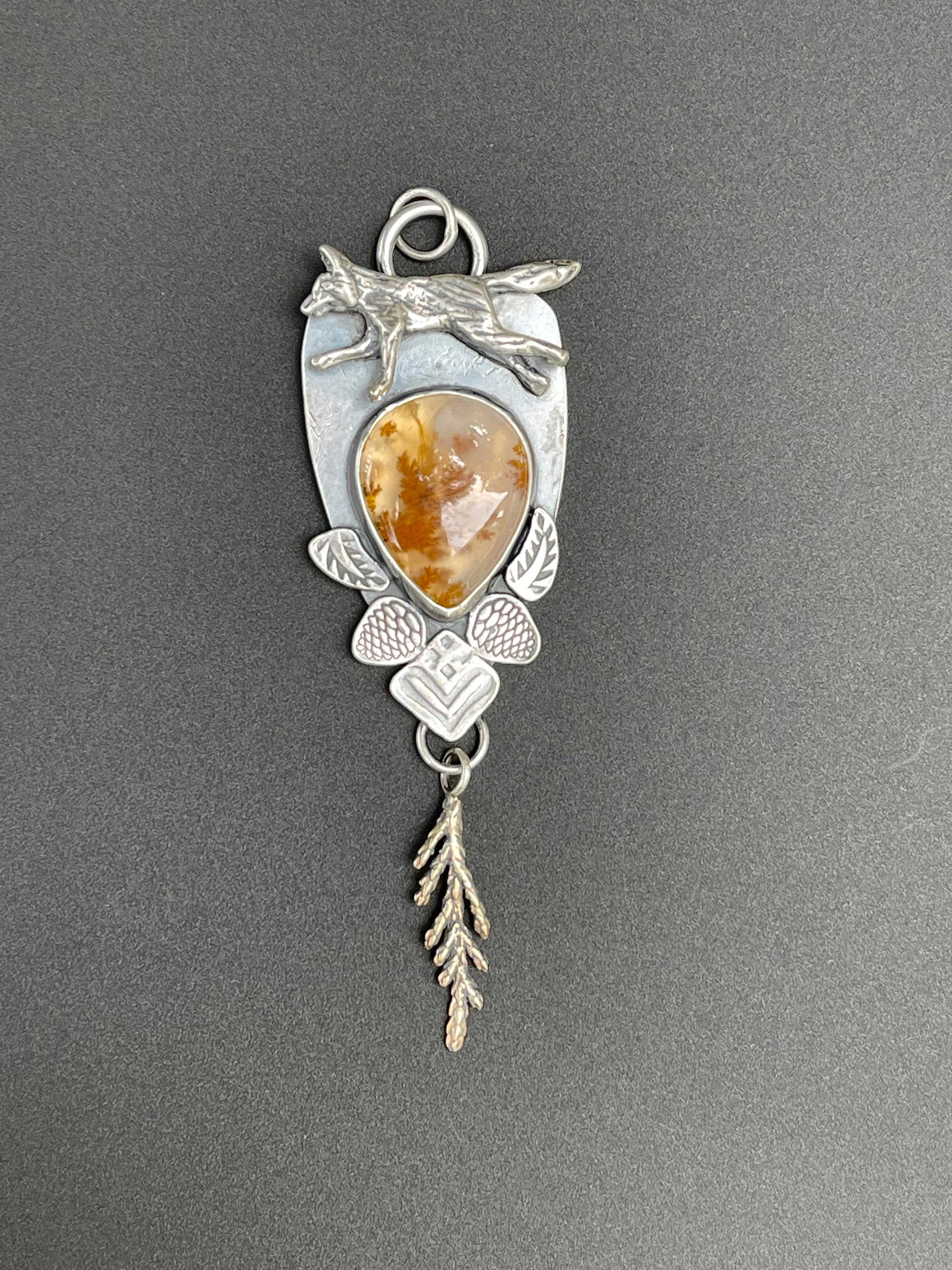 This is a solid sterling silver fox jumping over a beautiful dendritic agate cabochon. The pendant has hand stamped accents that are reminiscent of the forest, which is the home of the fox. Hanging from the pendant is a brass cedar leaf complementing the piece nicely.